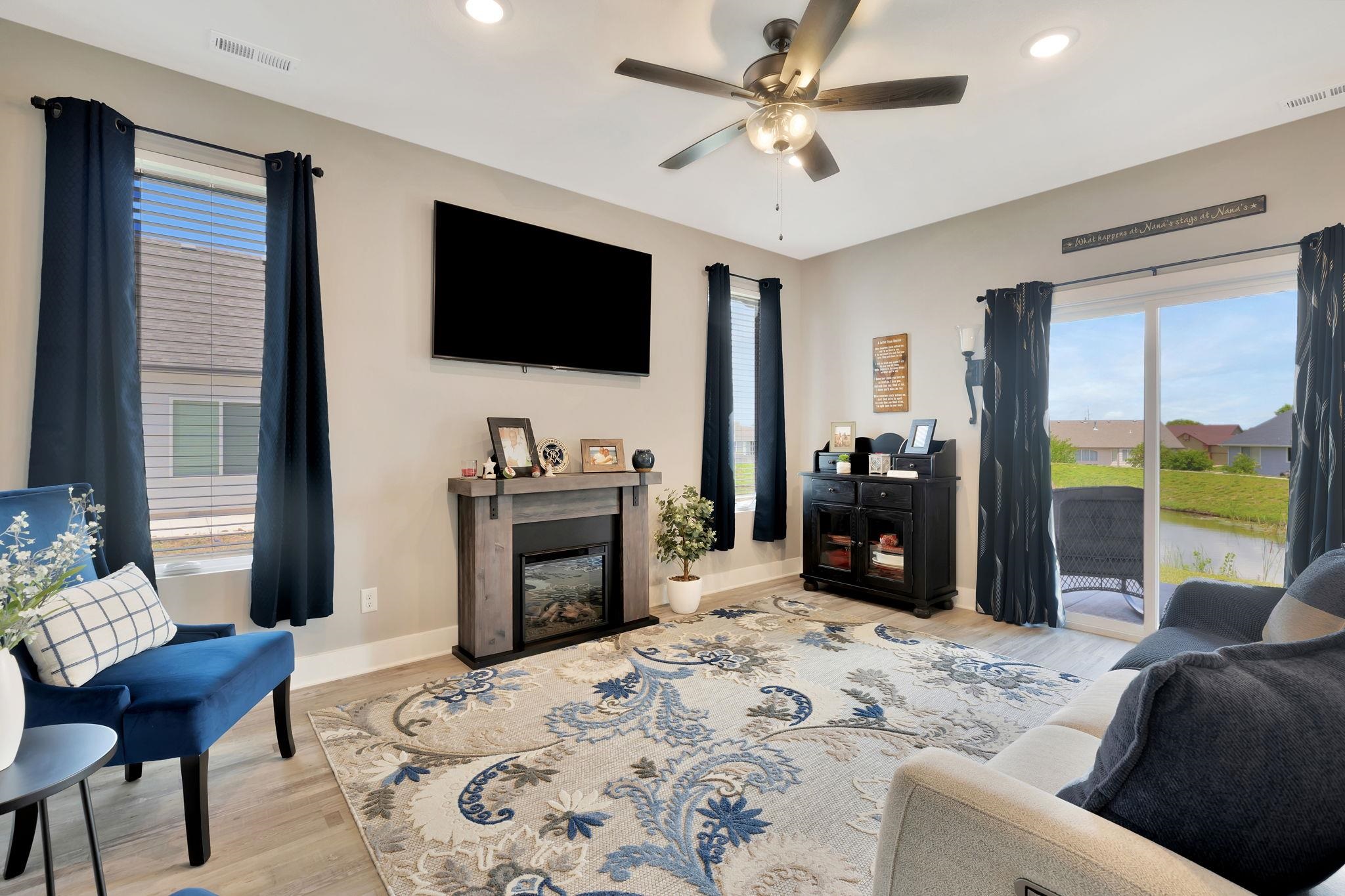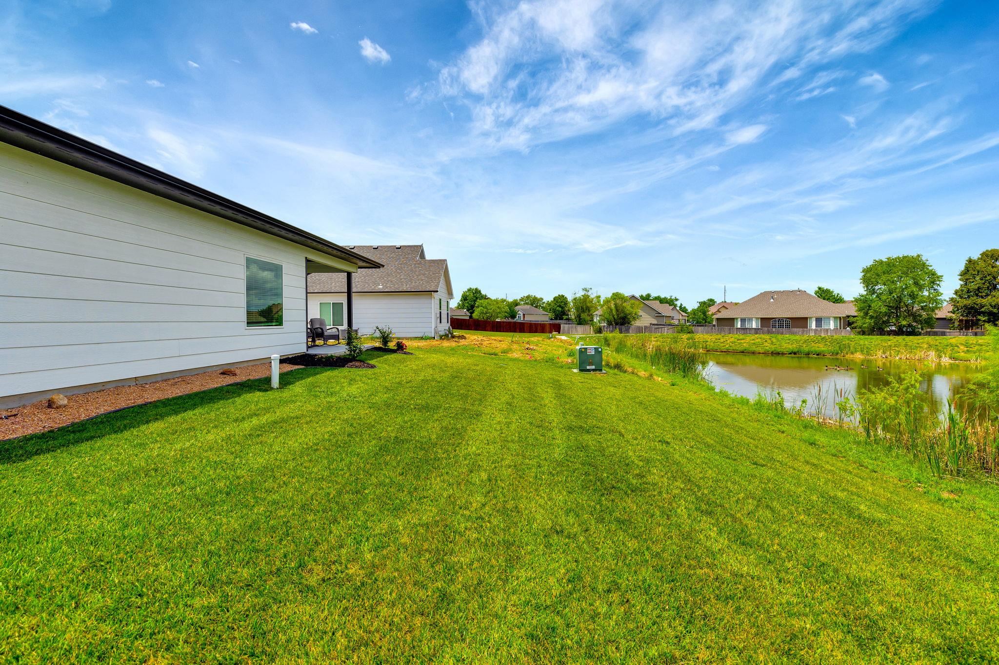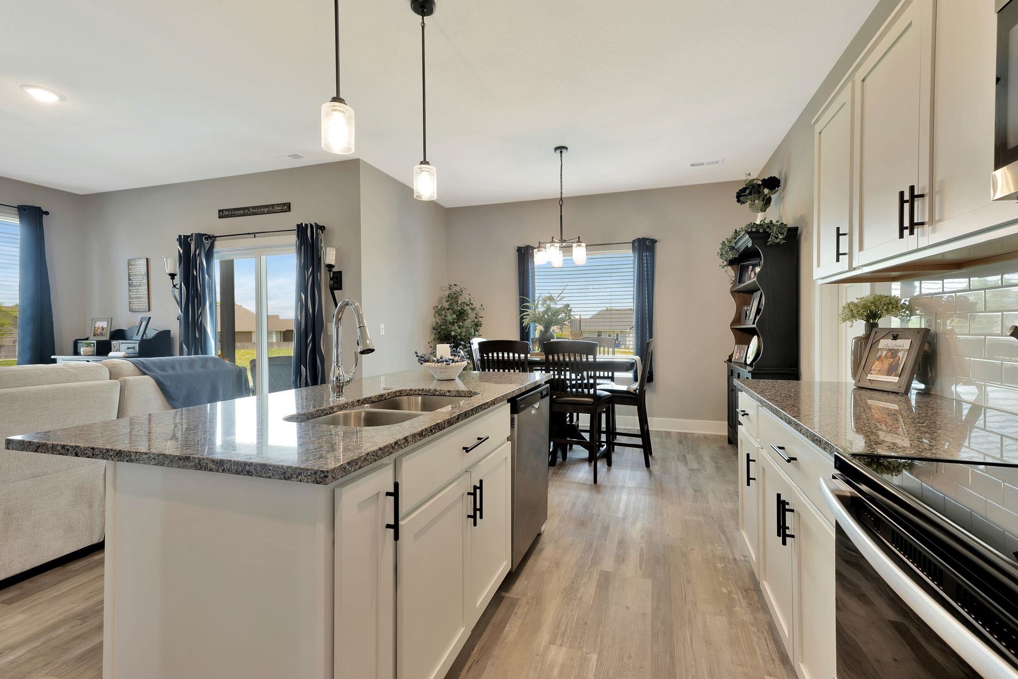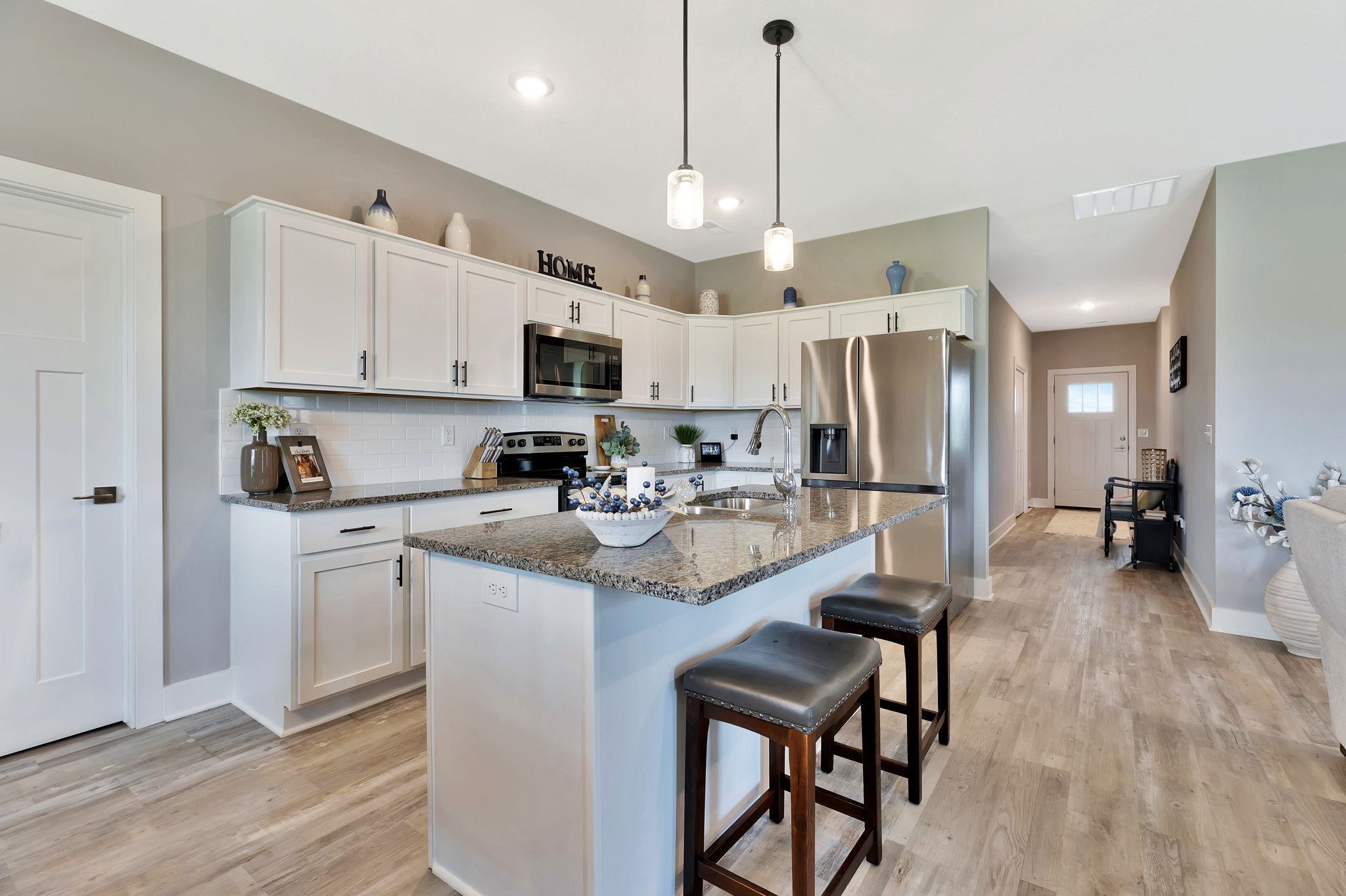 - Description: Experience effortless elegance in this stunning zero-entry 3-bedroom, 2-bath home tucked away on a quiet cul-de-sac with serene lake views. Designed with upscale living in mind, this residence features an open-concept layout with a chef-inspired island kitchen, walk-in pantry, and spacious dining area flowing seamlessly into a covered patio—ideal for indoor-outdoor entertaining. High-end finishes include granite countertops throughout and luxury vinyl flooring in the main living spaces. The oversized 3-car garage offers ample room for a workshop or premium storage. Move-in ready with professional landscaping and window blinds already in place. HOA amenities elevate your lifestyle with a resort-style pool, pickleball courts, scenic walking trails, fishing ponds, and lawn maintenance. Show all description