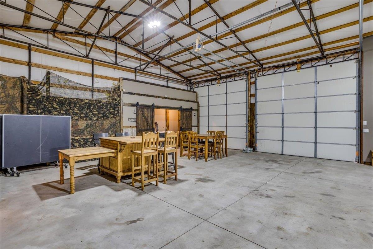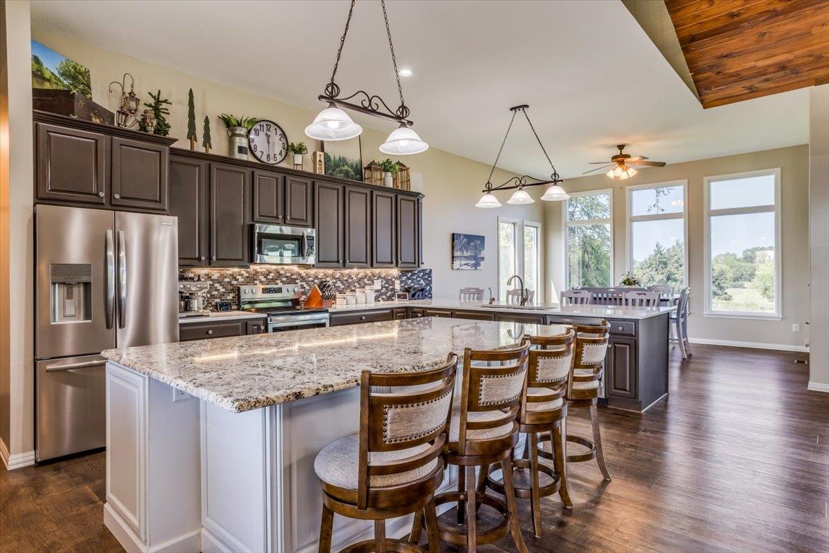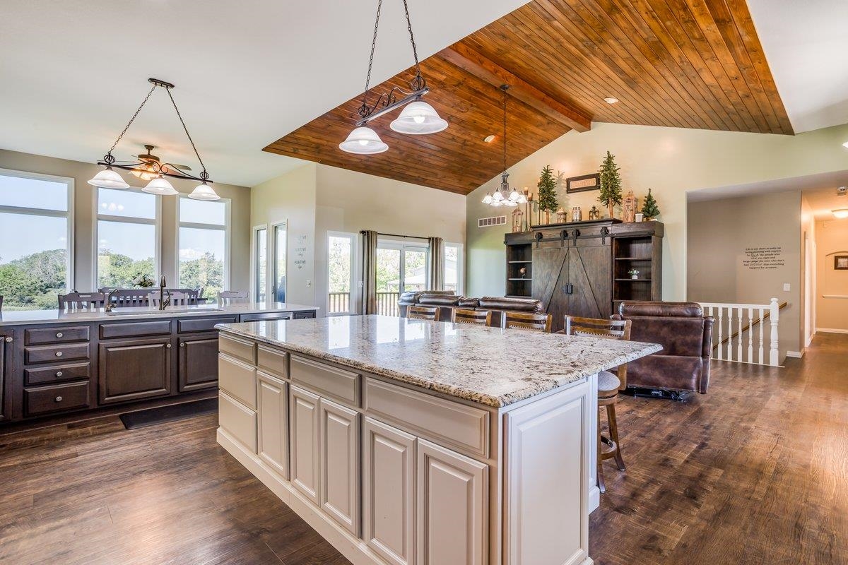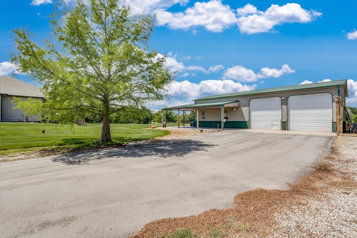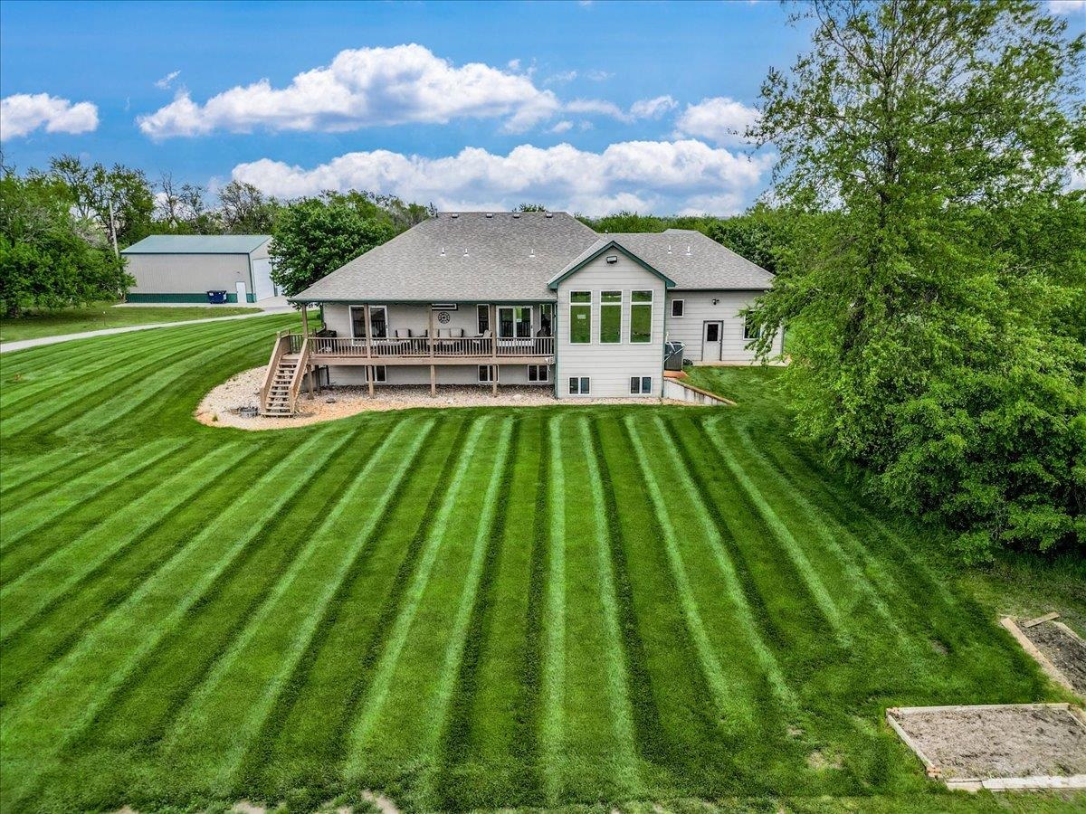 - Description: This one-of-a-kind property has so much to offer. You will search for years to find another home that can give you the lifestyle that this property has to offer. To start with a spacious, stunning quality-built home, a perfect guest house with an attached 35’ x 41’ heated (by a pellet stove), finished space that has the capability to be a fun party space with kitchen area. There is also an additional 40’ x 40’ outbuilding that has a concrete floor and front pad for all your equipment and toys. All of this is incredible but wait until you get a look at the 28 acres that has never been in production that consists of native grasses, trees, 2 ponds, a creek, and is home to deer, pheasant, quail, turkey, and dove. The land is a paradise for hunters and nature lovers. A little more about the 5 bedroom, 3 bath home. You will instantly fall in love with the chef’s kitchen with an enormous island plus a peninsula. There is an abundance of storage with a wall of pantry cabinets. The open floorplan offers a wonderful area for the family and friends to gather when they are not outside enjoying nature. The master bedroom offers a beautiful on suite and 2 closets. There are 2 additional bedrooms a full bathroom, and a large laundry room on the main floor. The view out basement offers a family room with wet bar, 2 finished bedrooms full bathroom, and a bonus room that the family uses currently as a workout room. As you walk out onto the back deck you will instantly fall in love with the serene view and incredible sunsets. Just off the back yard is the guest house that the family calls “the bunkhouse” It is a wonderful retreat with a sleeping area for 6, a living room, full bath, and a kitchen area. The bunkhouse is cooled and heated for year around comfort. It would make a perfect mother- in-law home or a living area for a college kid. The property has so much opportunity for fun including a volleyball court, basketball court, walking paths, 4-wheeler trails, walking paths, wildlife and bird watching. The home was built by a top-rated builder and has been meticulously maintained. Please review the seller’s property condition report for the endless list of upgrades and continued care that has went into this property as there is not room to list it all here. I will just say that this home has been loved and maintained since day one. Make this your forever home, your hunting cabin or weekend getaway. You do not want to miss out. Only wonderful memories will be made in your little piece of paradise. Show all description