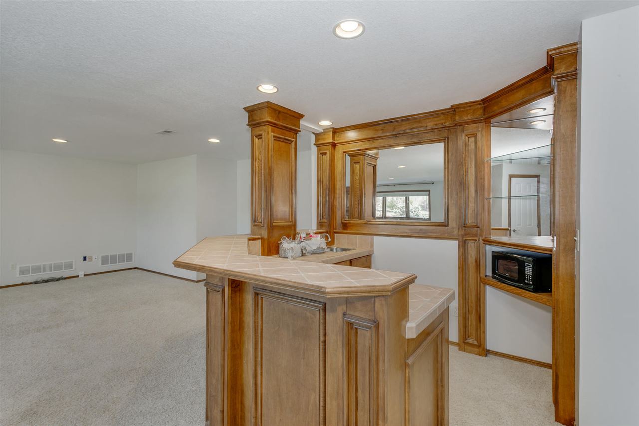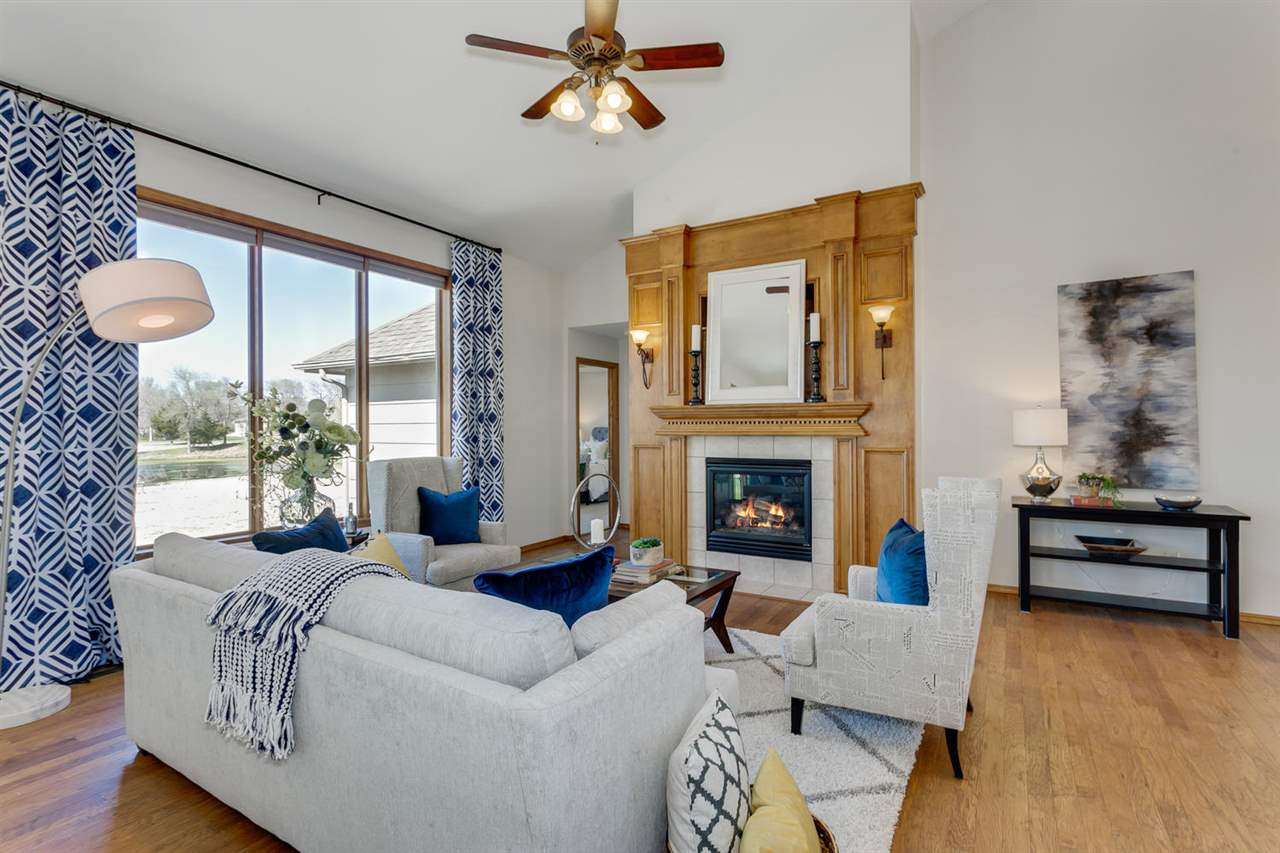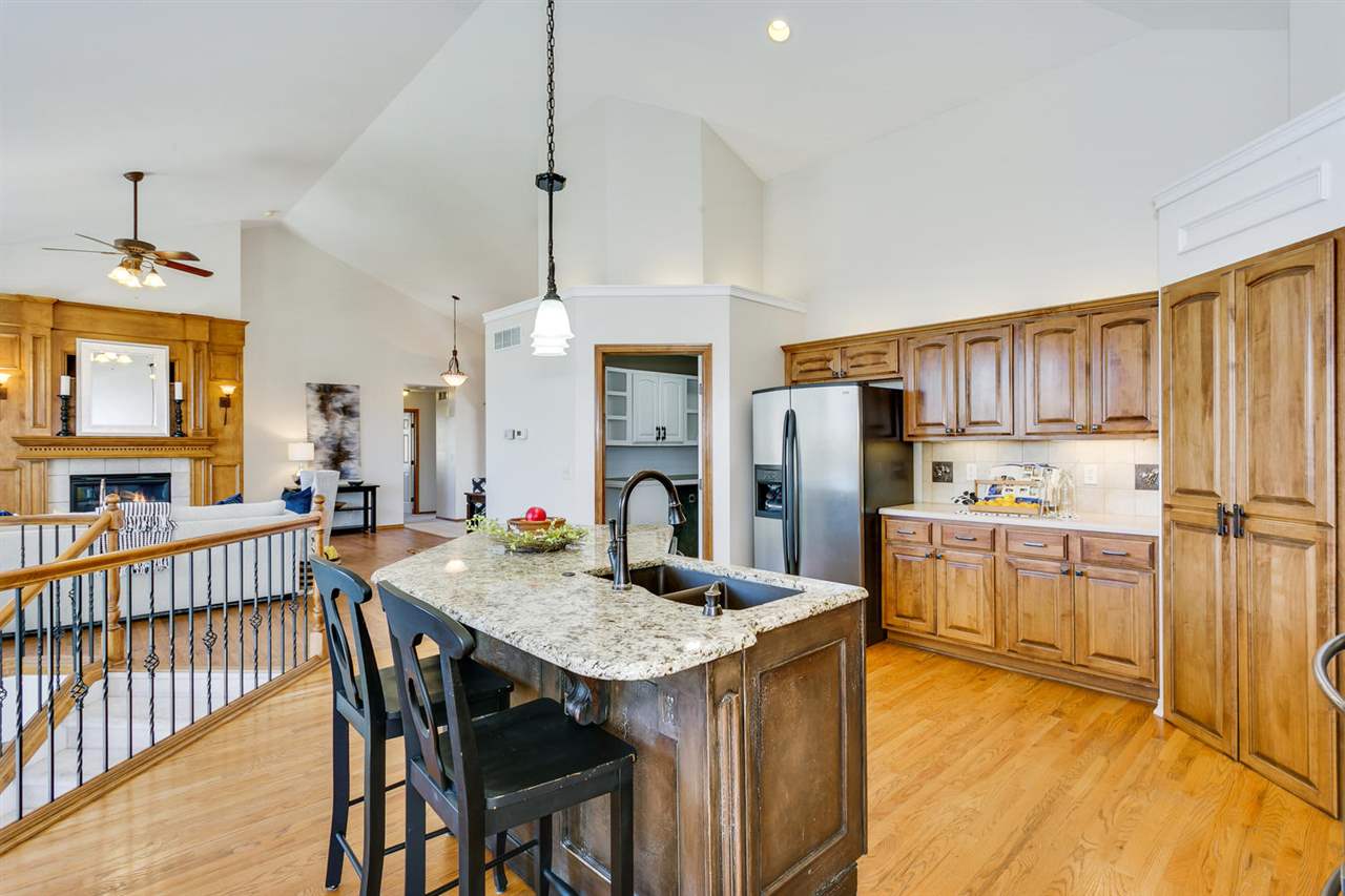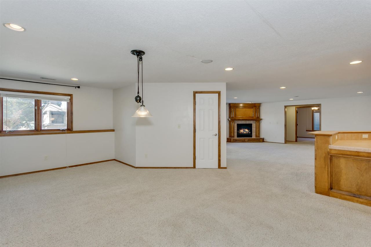 - Description: Here's a home to get excited about. Located in the Andover Central school district, this home is beautifully situated, backing up to the Andover Golf Course and lake. This ranch home has everything you could want. Open concept living with a mid level walk out, everything here is freshly painted in neutral colors. Kitchen has a large eating island, walk in pantry and breakfast nook with a view! Living room has a gas fireplace and stunning vistas of the golf course and lake. Formal dining room features a brick accent wall. The large main floor master bedroom has a bay window to enjoy the beautiful view. Rustic barn door opens into spacious master suite with large vanity with double sinks, corner soaker tub, separate shower and walk-in closet. Two additional bedrooms, a full bath and main floor laundry/mud room with built in folding table over the laundry equipment and storage above round out the main floor living space. The basement is an entertainer's dream with a gas fireplace and full wet bar, complete with a refrigerator. There is plenty of room for a comfortable family room and game room. View out windows provide ample light and views of the golf course such that it doesn't feel like a basement! Two bedrooms, a full bath and a storage area complete the basement living area. All freshly painted with new flooring in much of the house as well in April, 2019. This home is move in ready! Outside enjoy evenings on your north facing, stamped concrete patio with built-in fireplace. The beautifully landscaped yard provides a pleasant environment to enjoy summer sunsets and outdoor entertaining. Community pool and playground is less than a block away! Show all description