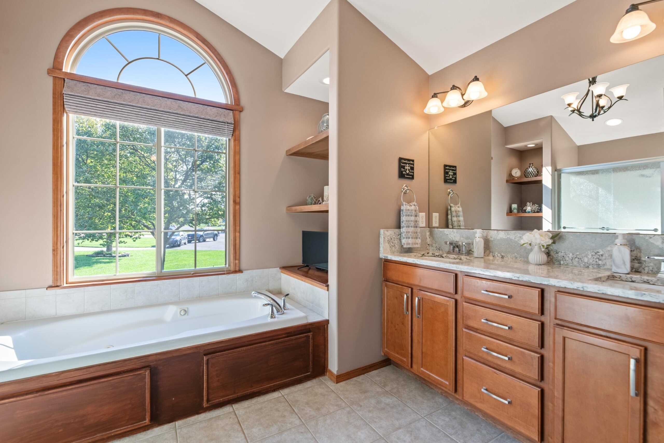 - Master Bedroom: Master Bdrm on Main Level, Split Bedroom Plan, Master Bedroom Bath, Tub/Shower/Master Bdrm, Two Sinks, Granite Counters, Jetted Tub