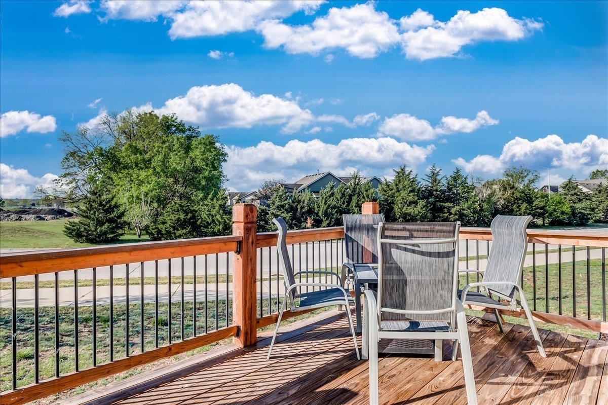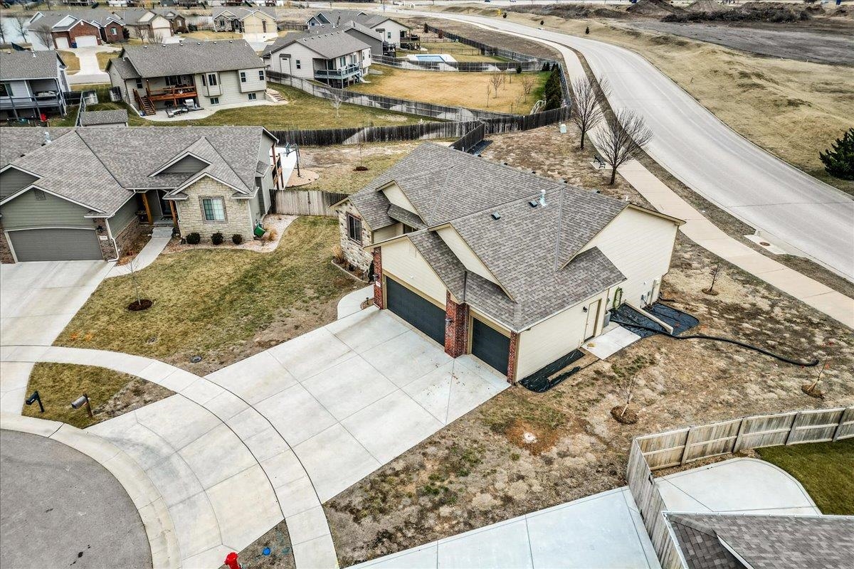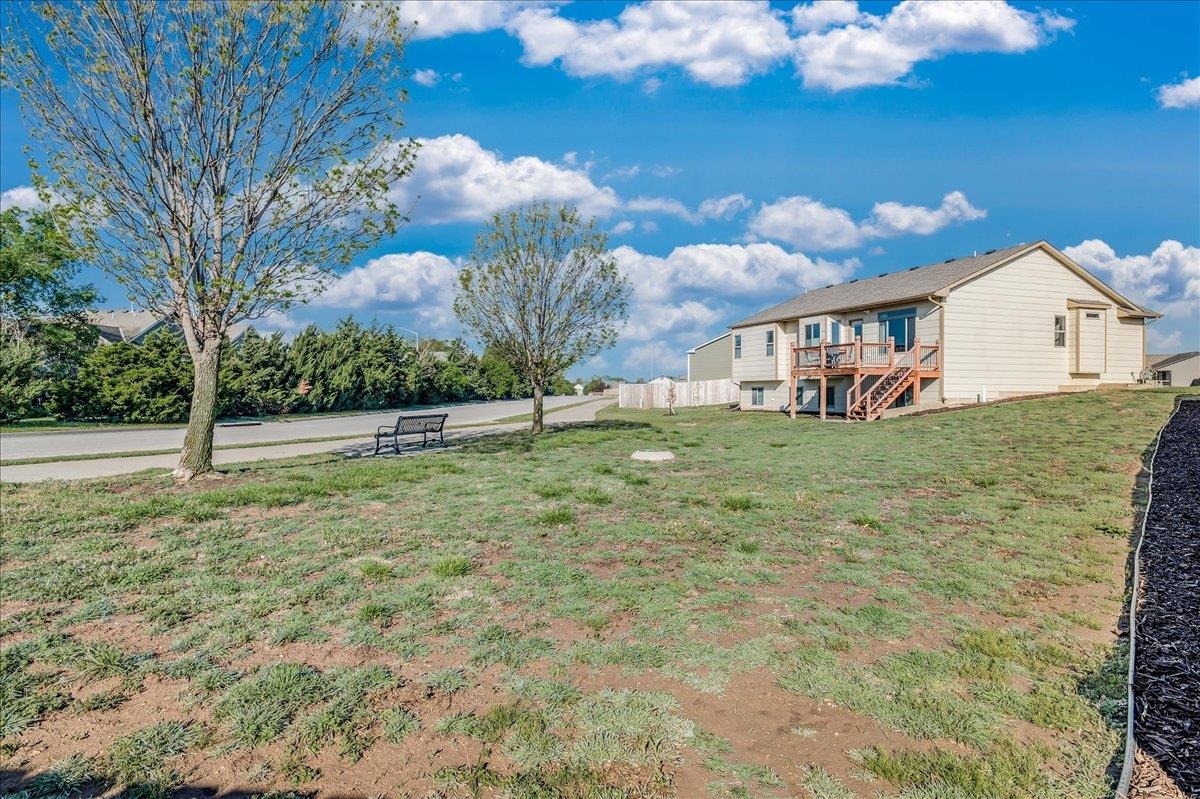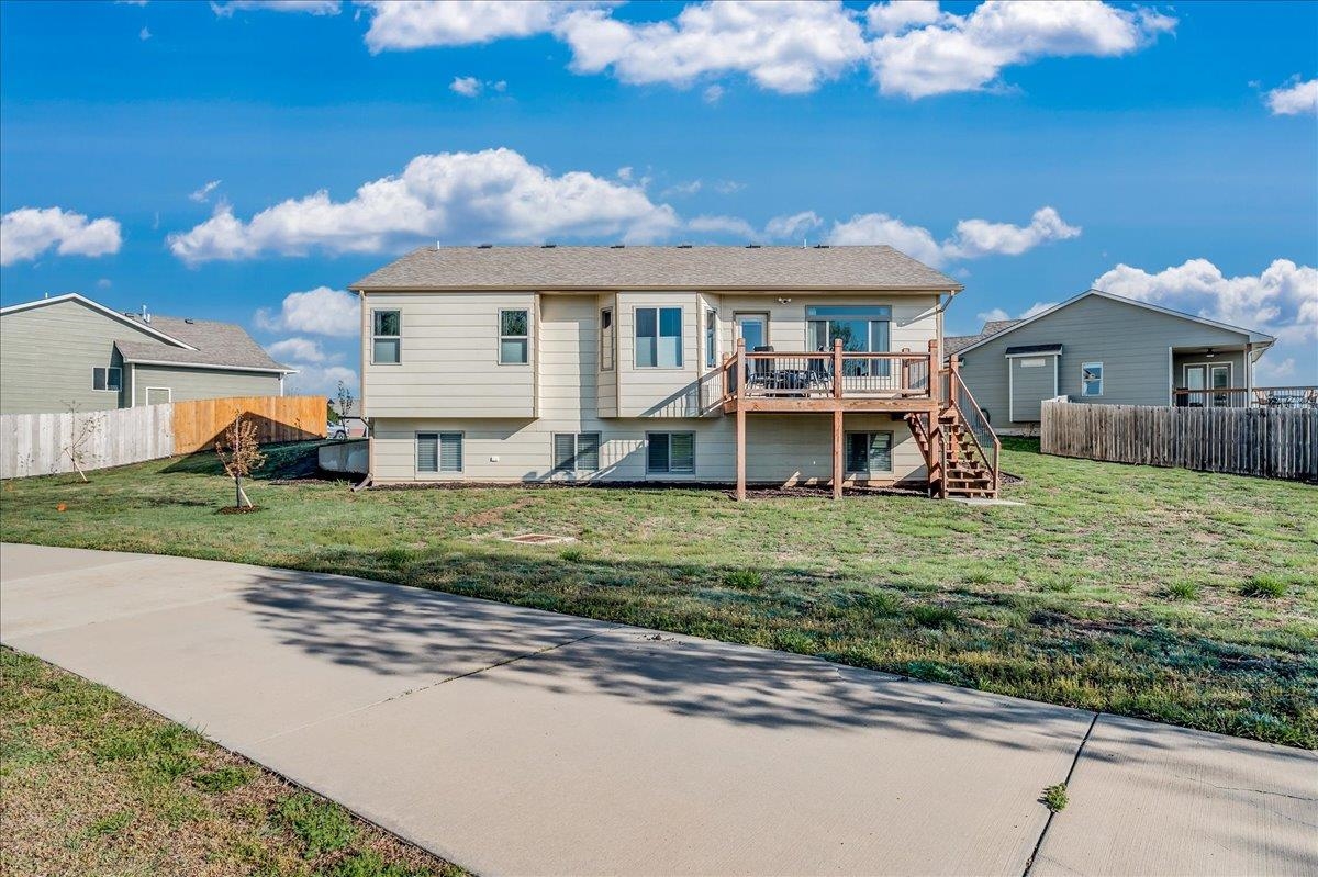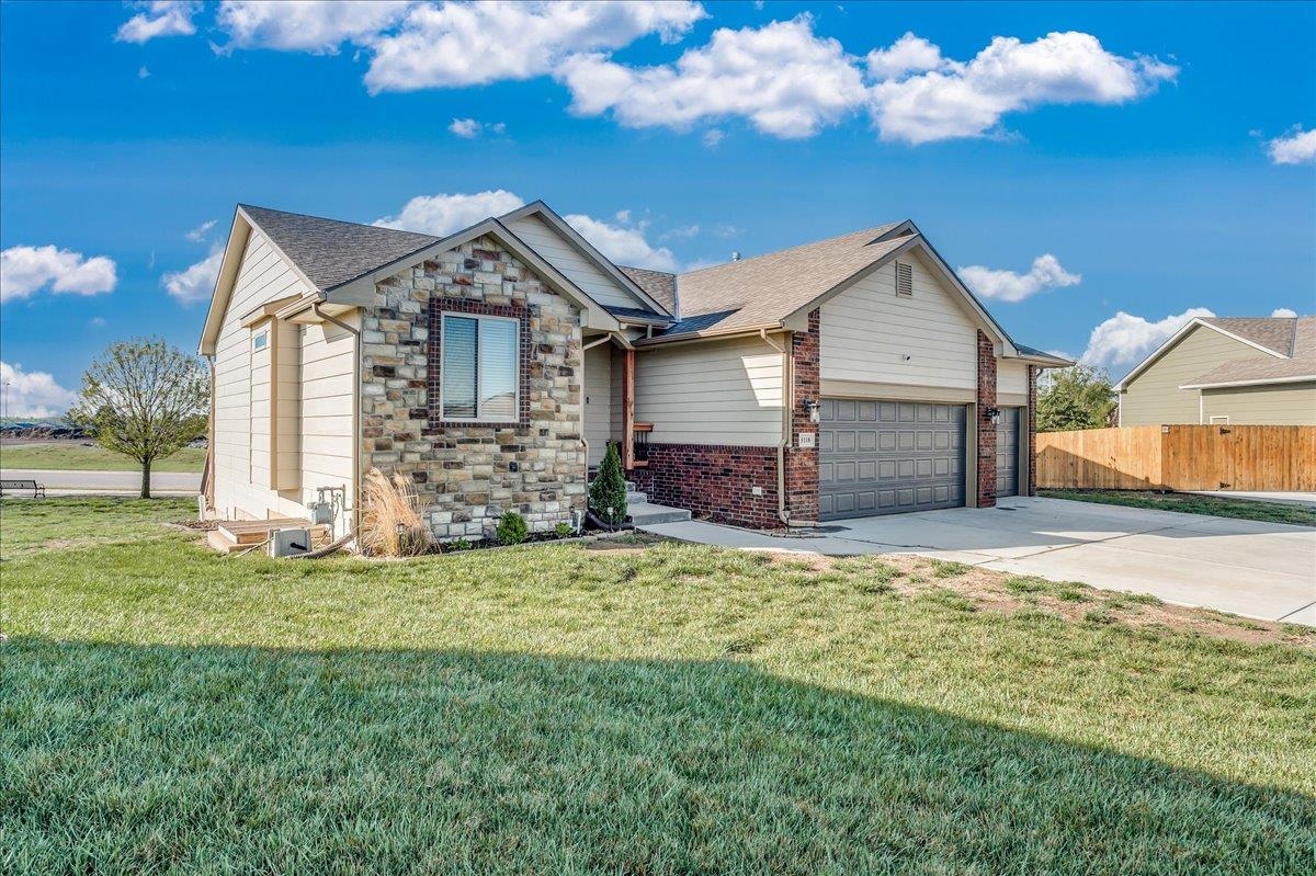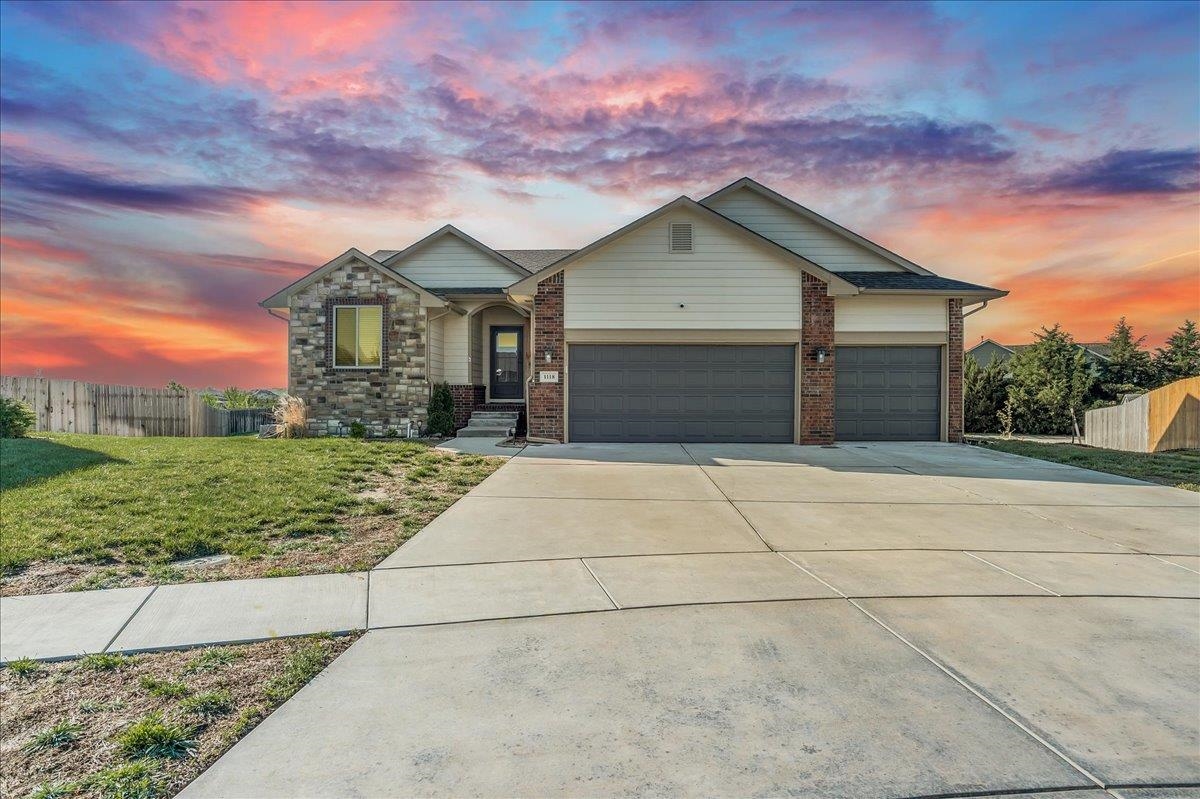 - Description: Backing to the beautiful High Park in Derby, Kansas, with breathtaking sunrise views, this 5 bedroom (6th roughed-in), 3 full bath, 3 car home is within walking distance to the sought-after Derby schools and water park. This home has everything you need to live comfortably and make lasting memories. As you enter the main level, you will notice vaulted ceilings with lots of natural light through large windows and glass door to the deck that frame sweeping views of sky and nature, and cool evenings, as the hot sun sets on the garage side of the house. The kitchen features stunning granite countertops, kitchen island, and a coffee bar. Matching granite countertops are throughout the house in all 3 full bathrooms. Kitchen has a walk-in pantry. BONUS ... all appliances stay! The Master Suite includes vaulted ceilings, a full bath with jetted 2-person soaker tub, a separate shower, and a walk-in closet. Also on the main floor are 2 more bedrooms with a full bath between. It has an over-the-shower clerestory window which allows plenty of natural light in, to get your day started. Head downstairs where you'll find an expansive rec room/family room with lots of egress "daylight" windows, full bath, two spacious bedrooms, and a "ready to be finished" potential 6th bedroom! The large lower level is perfect for sports-night parties, hobbies, games, or an in-law space. The attached 3-car garage has a newly constructed locking storage wall, perfect for housing up to 35 totes for your organizational needs. Plus, you'll love the convenient location near restaurants, shopping, quick access to Rock Road, and High Park practically in your backyard for walking, jogging, bike riding, fishing ponds, dog walking, baseball, and soccer fields. The yard has multiple new young fruit trees with 5 year guarantee, and long flower or veggie gardens that have been rototilled, planting dirt added, and covered. Yes, the new sprinkler system can be used to water them too! This is truly a unique find." Show all description