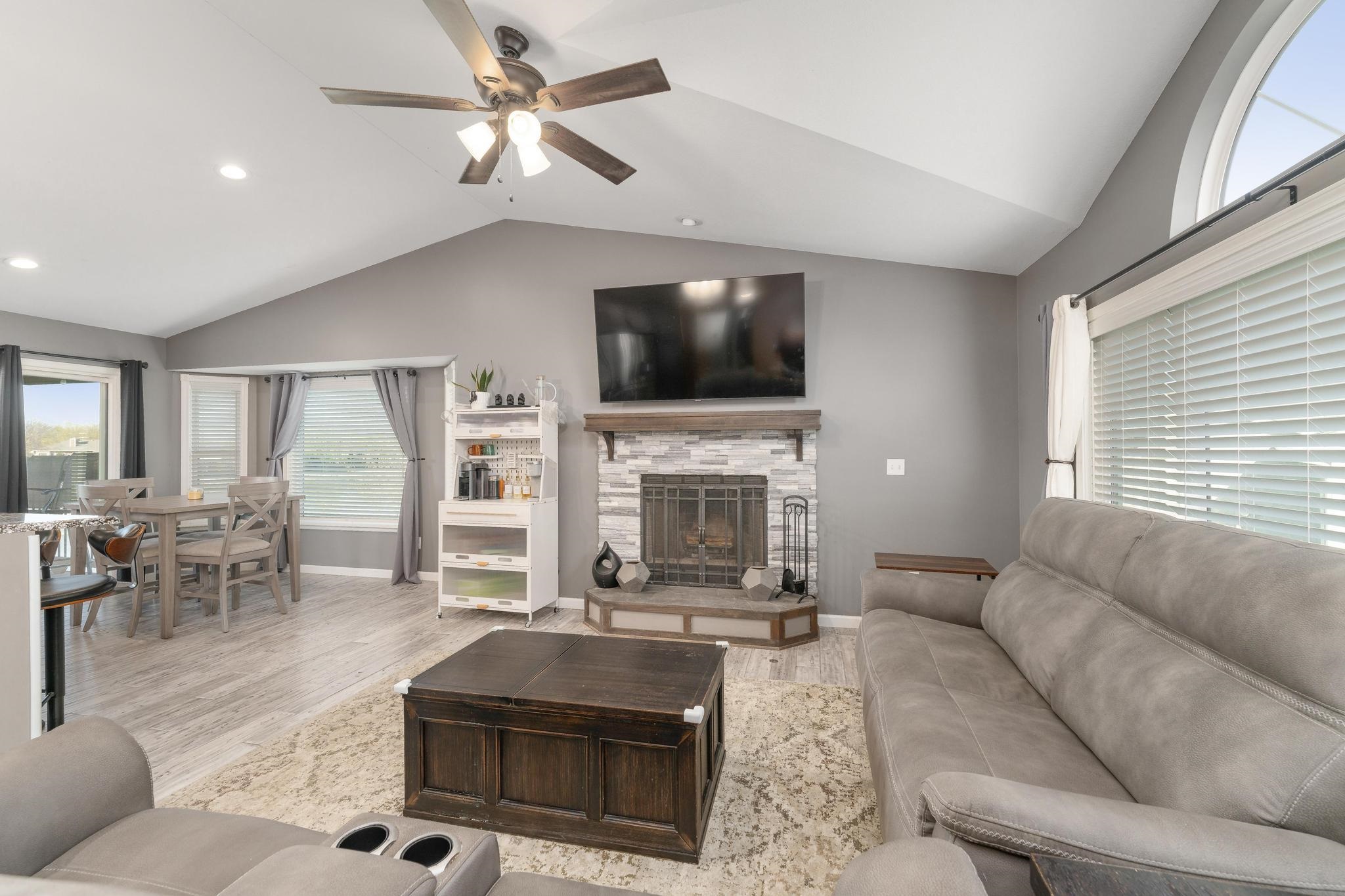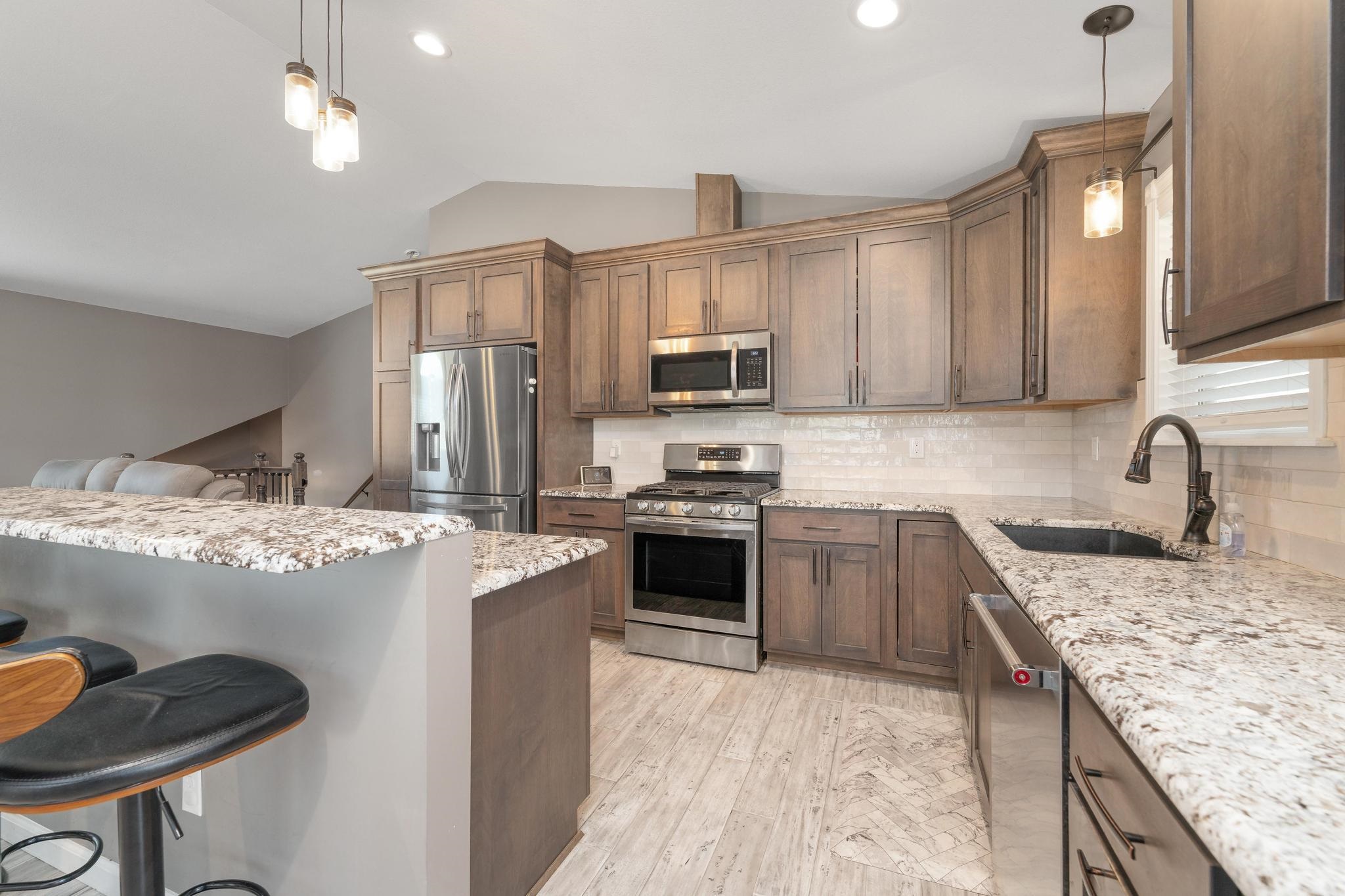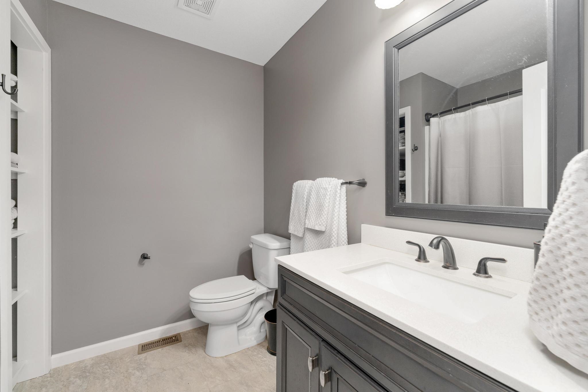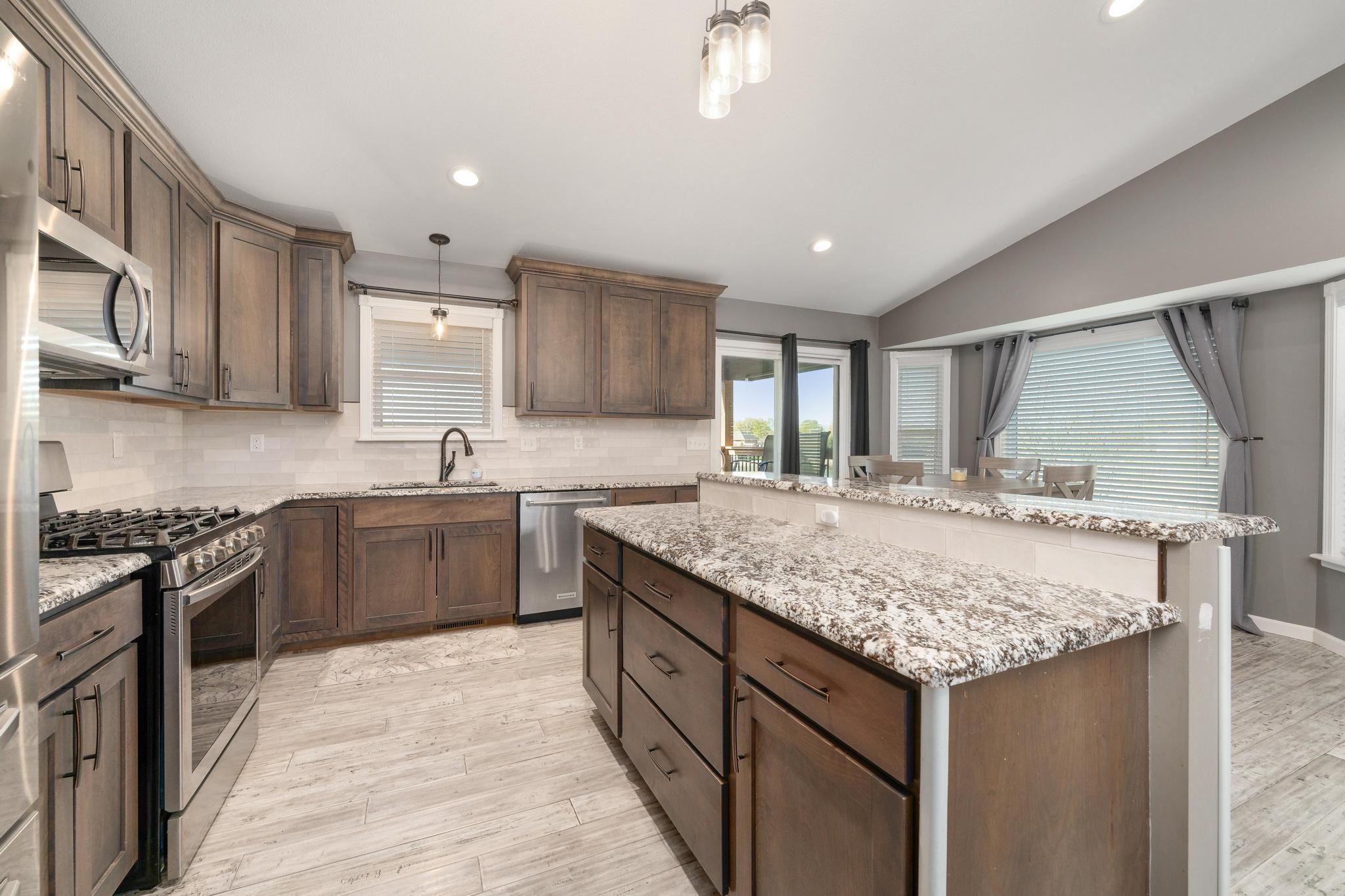- Description: This beautifully updated 4 bedroom, 3 bath house is nearly as good as new. With engineered hardwood floors, gas range & granite countertops, and luxe primary suite, this one is a stunner! From the heart of the home, enjoy the gas start fireplace and cook's kitchen in the winter, or the lake views from your extended deck in the summer. The huge primary bedroom is accompanied by a walk-in closet with hidden built in safe, and an en suite with double vanity & a gorgeous walk-in shower with multiple shower heads. A second bedroom and full bath complete the main floor. Downstairs you'll find a walk out basement with tons of natural light, a second fireplace and full wet bar - an entertainer's dream! Two more bedrooms and another full bath round out the basement. Well and sprinkler system ensure your home is beautiful inside and out. Roof, siding, deck, HVAC, appliances, and flooring all only 4 years old! Show all description