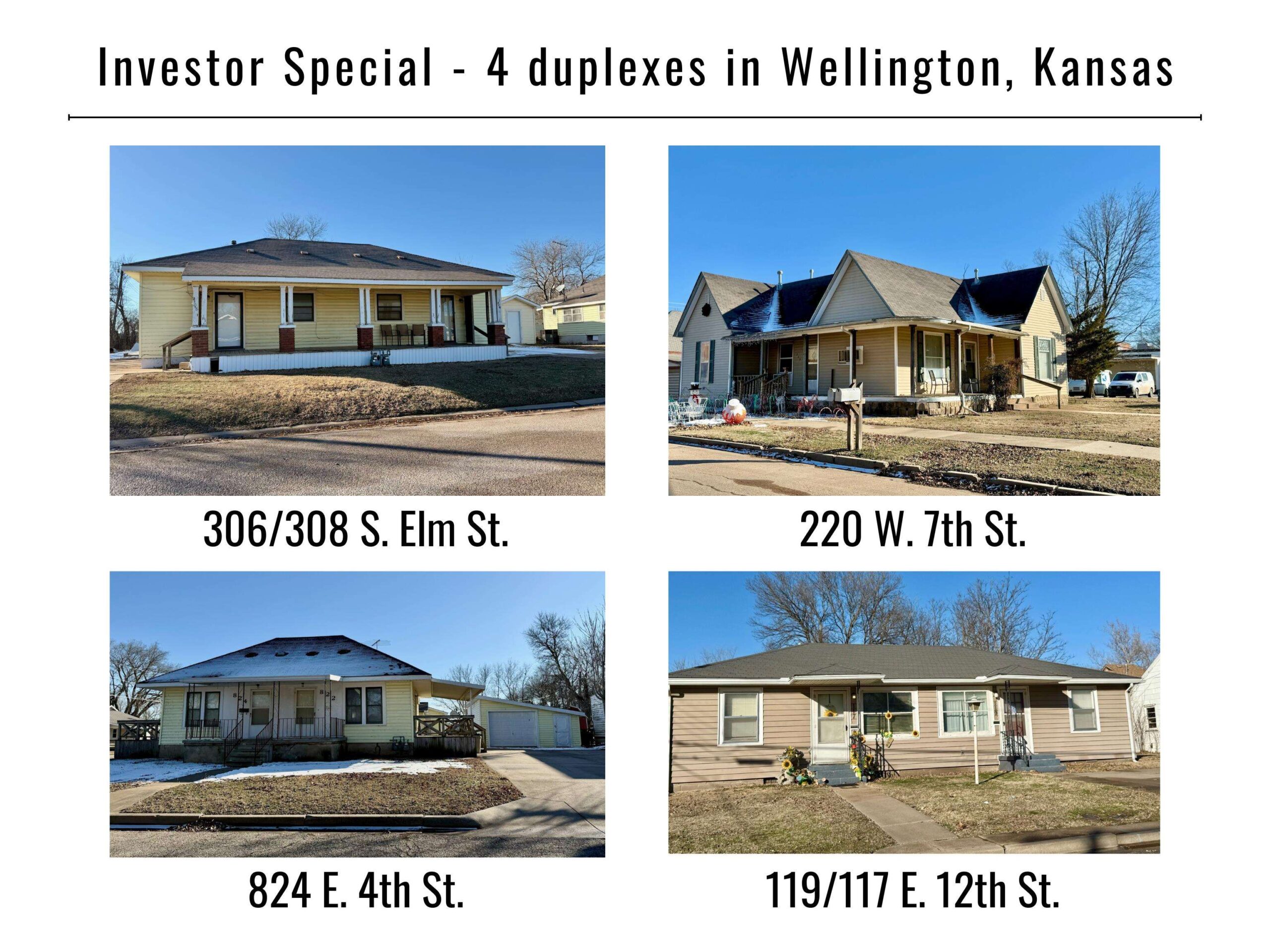 - Description: INVESTMENT OPPORTUNITY: 4 Duplexes, 8 Units – Great Rental Income Potential! This prime real estate listing includes 4 well-maintained duplexes, offering a total of 8 rental units across four highly visable locations. With a mix of 1-bedroom and 2-bedroom units, these properties are perfectly suited for long-term investment, providing steady cash flow in a steady market. KEY FEATURES: * 119/117 E 12th St – 1-bedroom duplex, 1,344 sq ft, $750/month (both) * 220 W 7th St/121 N F St – Roomy 1-bedroom duplex, 1,384 sq ft, $700/month (both) * 306/308 S Elm – Large 2-bedroom duplex, 1,728 sq ft, $825/month (both) * 824/822 E 4th St – Spacious 1-bedroom duplex, 1,174 sq ft, $1,050/month (both) * Total Units: 8 Total Rent Potential: $3,325/month * This duplex bundle features three 1-bedroom units (6 units) and one 2-bedroom unit (2 units), each with generous square footage and room for potential appreciation. The diverse unit mix offers flexibility for different types of tenants, increasing the attractiveness and demand. These duplexes are strategically located in highly rentable areas, ensuring minimal vacancy rates and strong tenant retention. Whether you're a seasoned investor or just starting to build your portfolio, this property presents a reliable income stream and long-term growth potential. Don't miss out on this exceptional investment opportunity! Contact us today to learn more or to schedule a showing. NOTE: units are occupied so allow a minimum of 48 hours notice for coordinating showings with tenants. Show all description