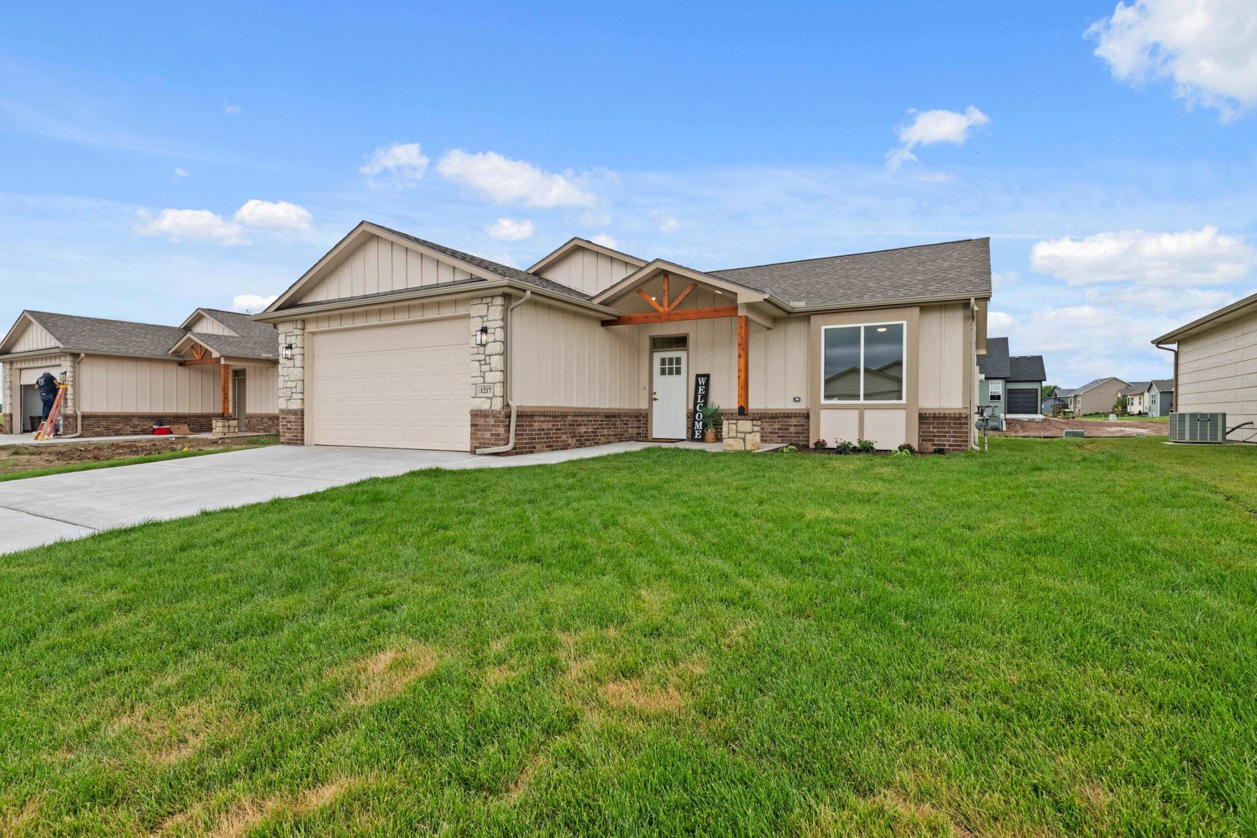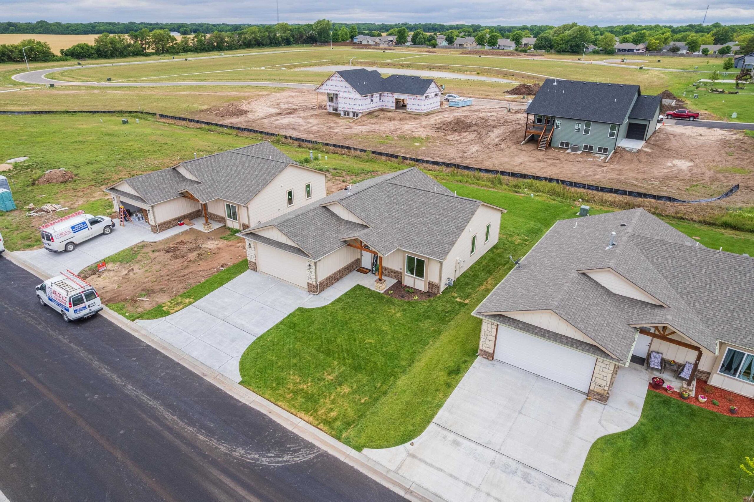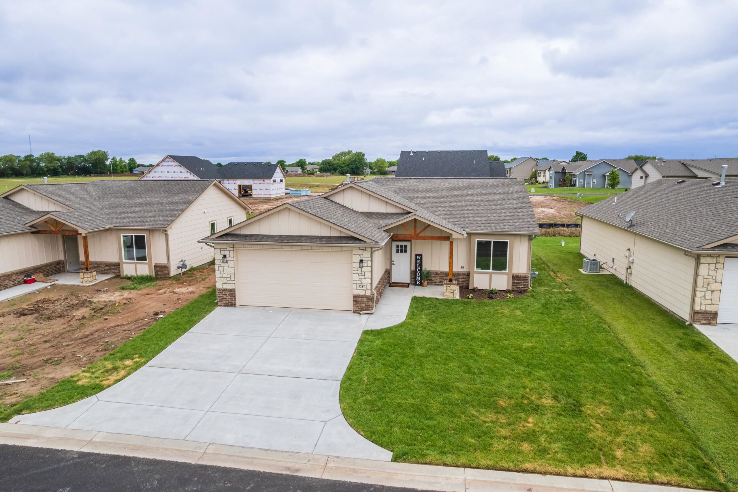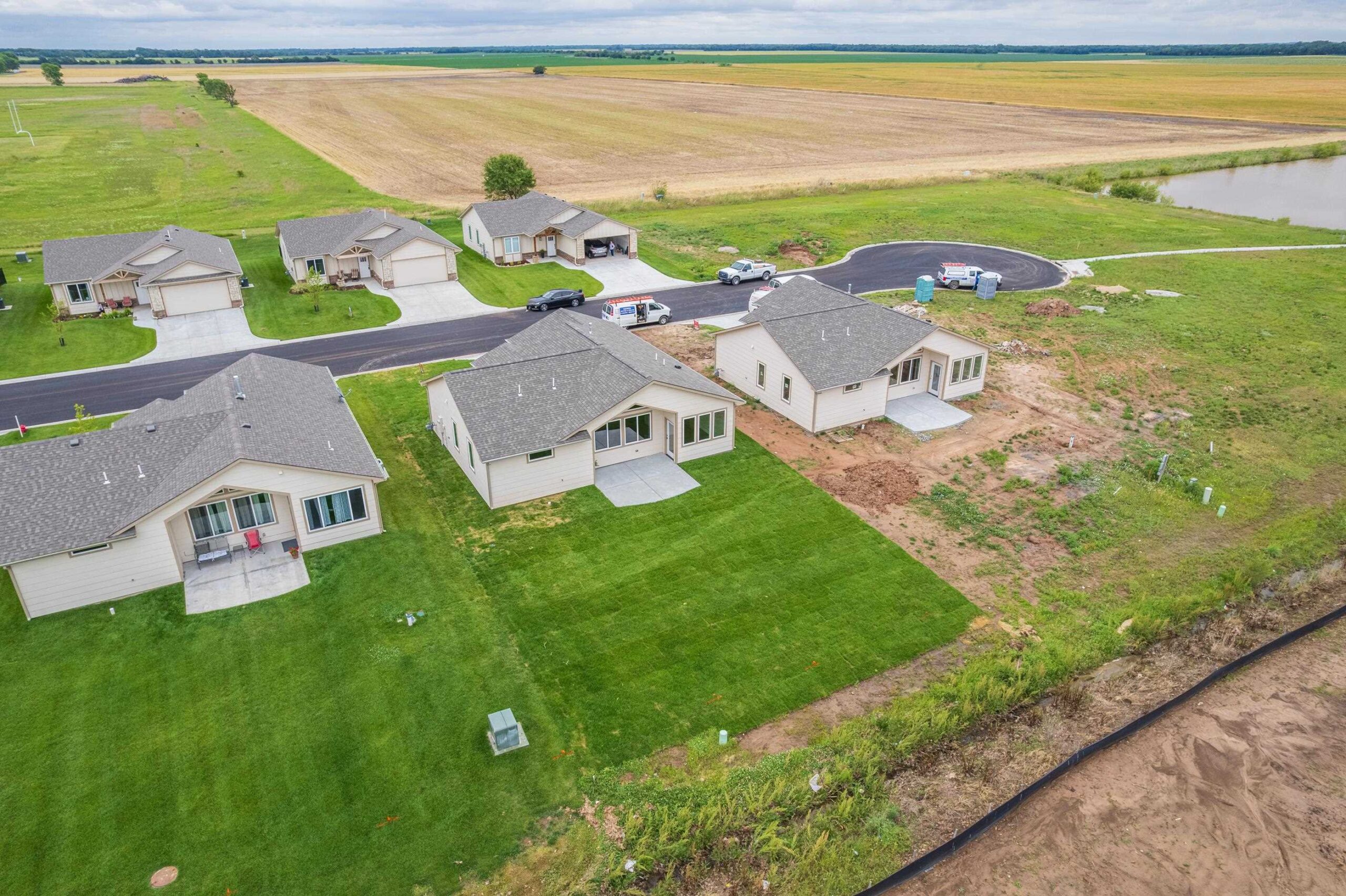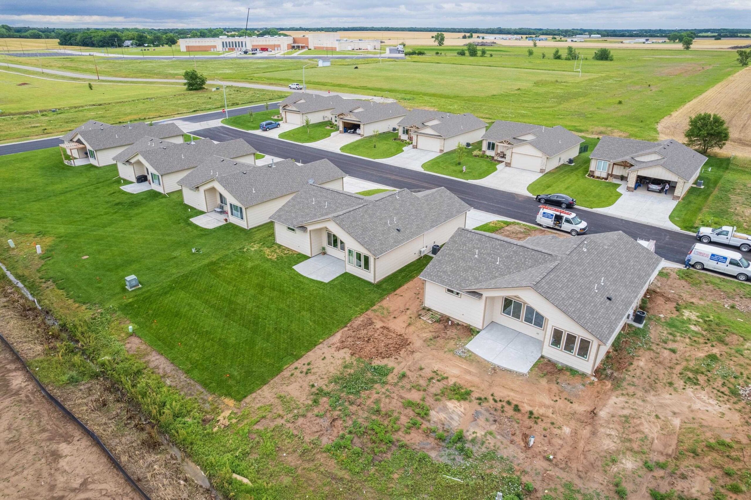 - Description: Step into effortless living with this brand-new 2-bedroom, 2-bath home that pairs clean, modern design with true Kansas practicality. The bright, open kitchen features stunning quartz countertops and plenty of prep space — ideal for weekday meals or hosting friends — while durable luxury vinyl plank runs throughout for beautiful, low-maintenance floors. Unwind in the spacious primary suite with a private ensuite that feels quietly luxurious. Need extra room for projects or seasonal storage? The climate-controlled garage gives you year-round workshop space and comfortable entertaining options. And because this is Kansas, a concrete storm shelter off the garage adds a critical layer of safety and peace of mind. Outside, maintenance-free exterior means more weekends relaxing and less yardwork. Nestled in a peaceful small town, you’ll enjoy the calm and community while still being only a short drive from big-city shopping, dining, and services. Perfect for anyone seeking comfort, style, and ease of living — this home checks all the boxes. Show all description