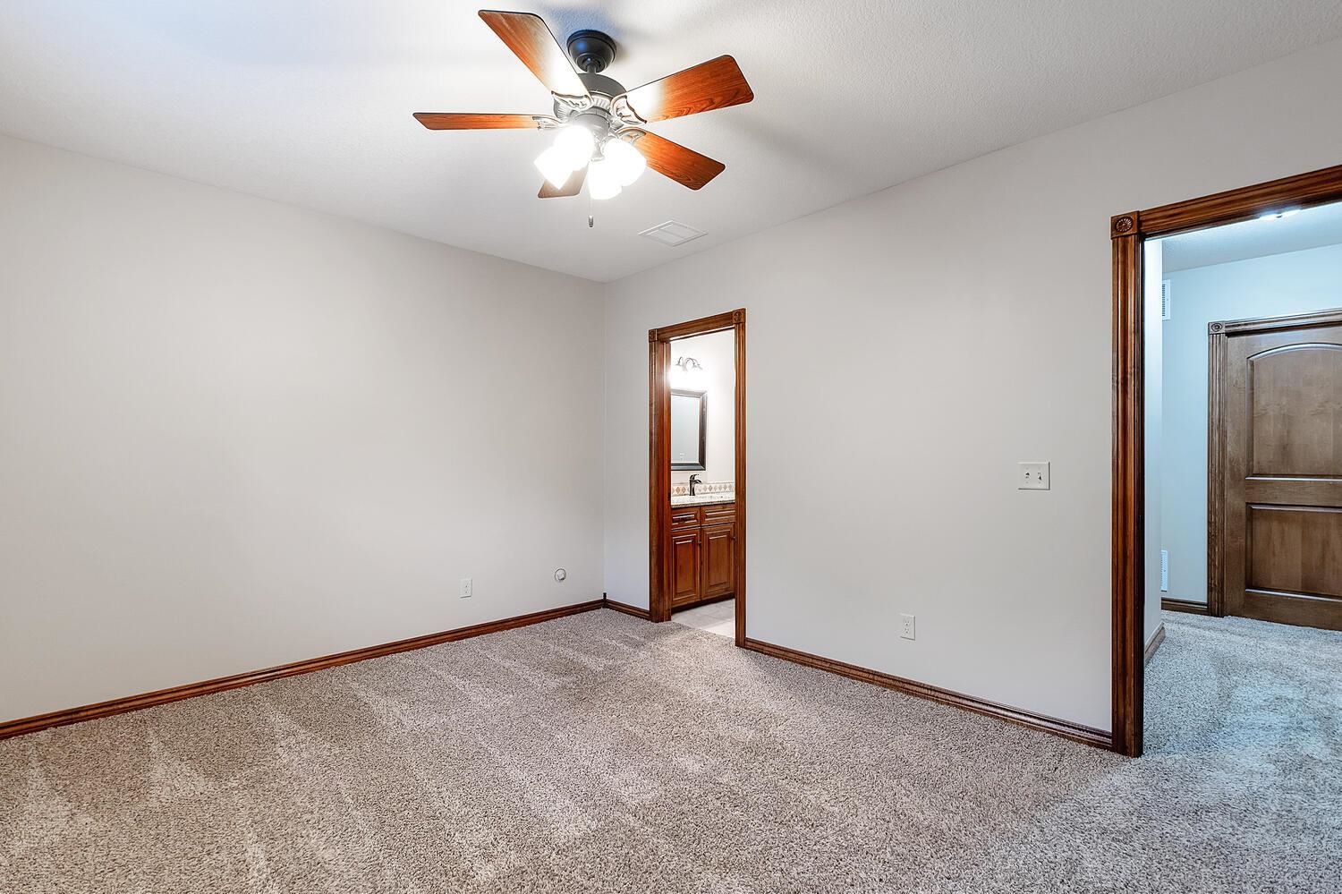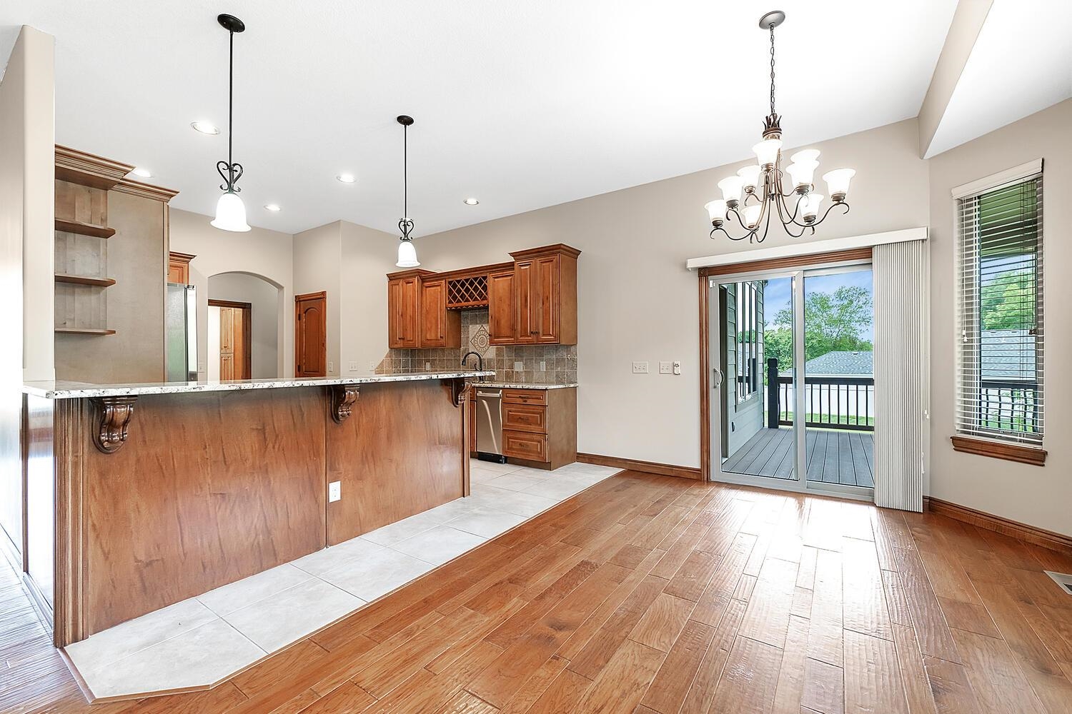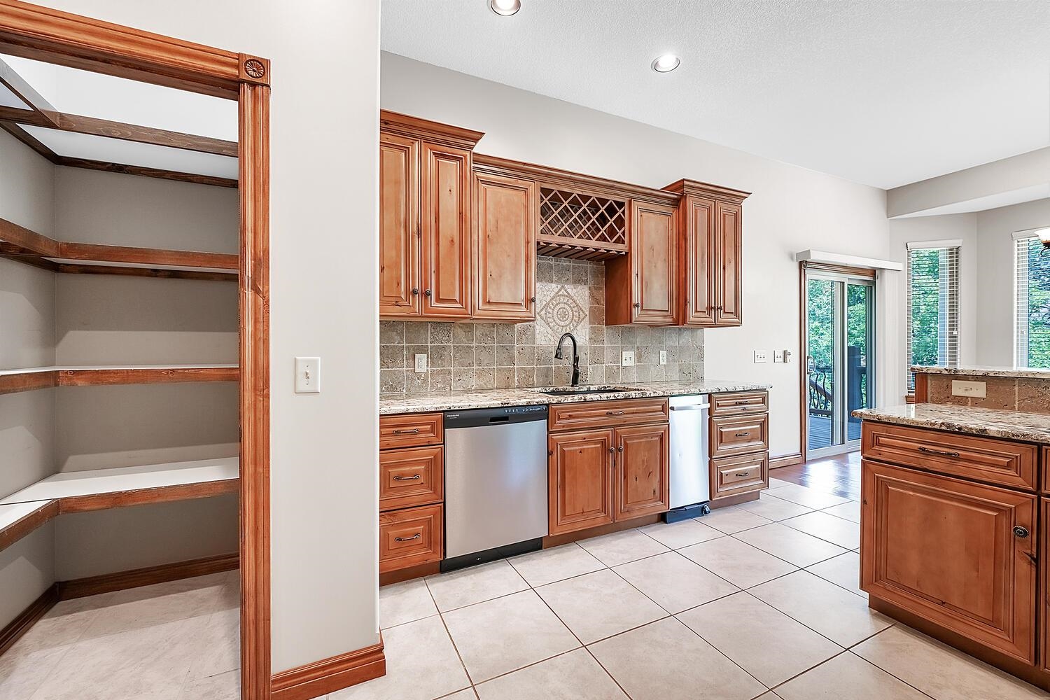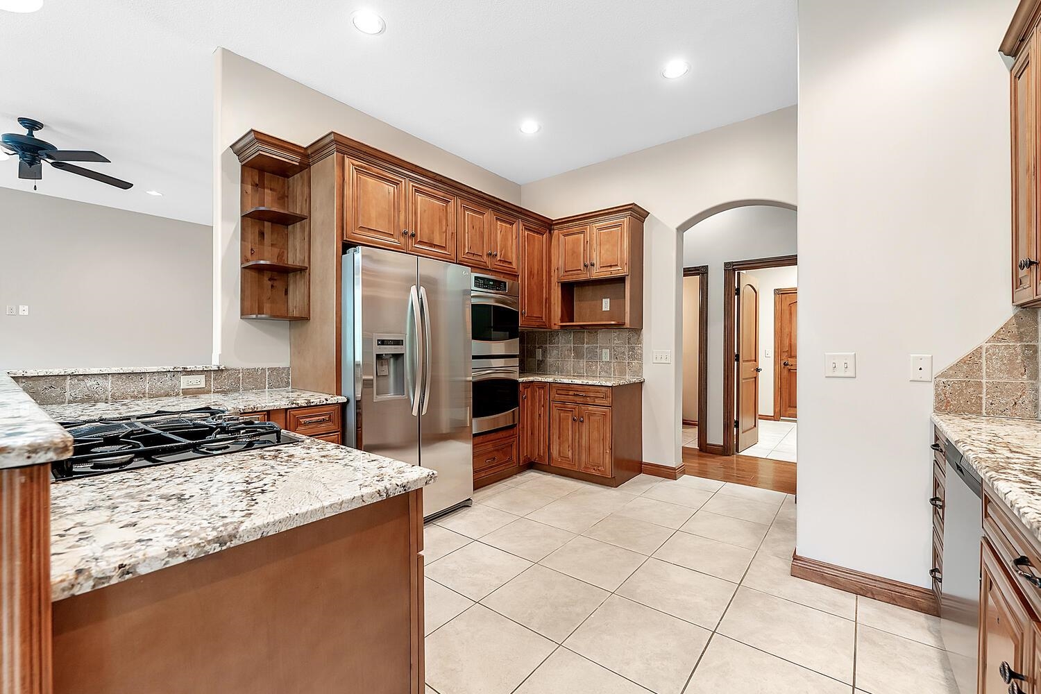 - Description: Custom built home just down the street from the Crestview Country Club in the desirable Andover school district. This home has amenities typically seen in much higher priced homes including 2 full kitchens (one on main level and one in basement), 2 master suites complete with tiled showers, both have access doors to outside, and both are oversized at approx 18x14. The home as you enter the front door has hardwood floors running throughout the main living/dining/kitchen areas. High end quality cabinets in kitchen with granite countertops and stainless appliances, including pantry and garbage disposal. The main level has laundry, 1/2 bath, 3 bedrooms, and 2 full baths, 10 ft ceilings, and large covered deck that looks out over the treed lot for privacy. In the walk out basement there are 2 access doors leading to the outside (one from rec room and one from 2nd primary suite in basement), 2 bedrooms with 2 attached baths, 2 storage rooms, and full size kitchen complete with dishwasher, range, oven, full size fridge and more. Home is being sold at this price without additional lot included to the West. Seller is offering home with additional lot for separate price on separate MLS number. Buyers to be aware that flowerbed on West side of home is on the separate lot and would have to be removed if lot is not purchased with home. Call agent for more details. Show all description
