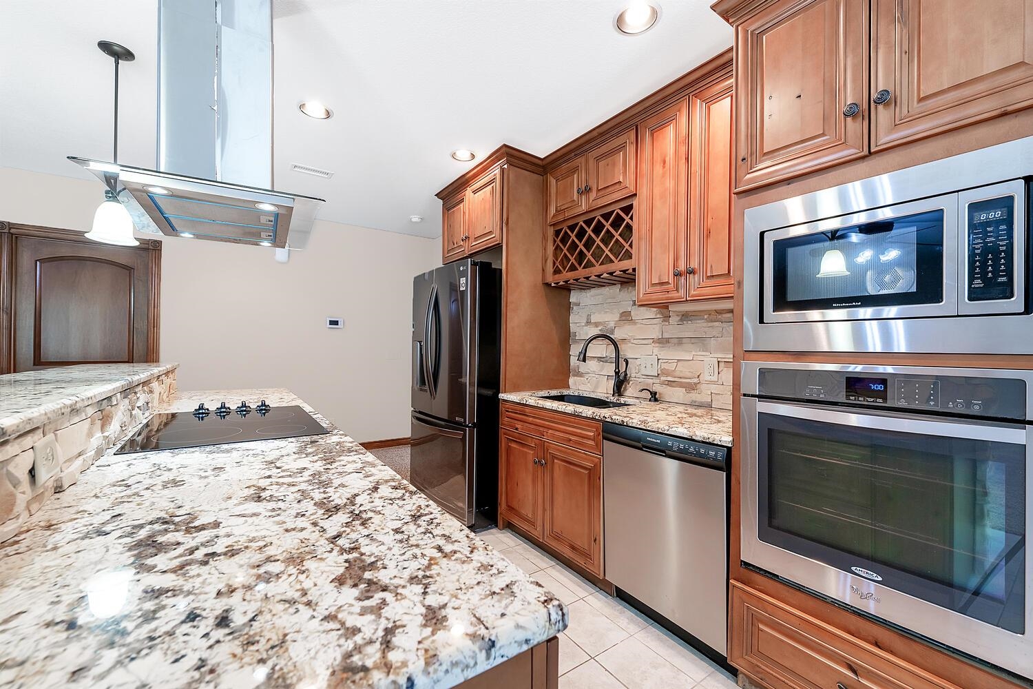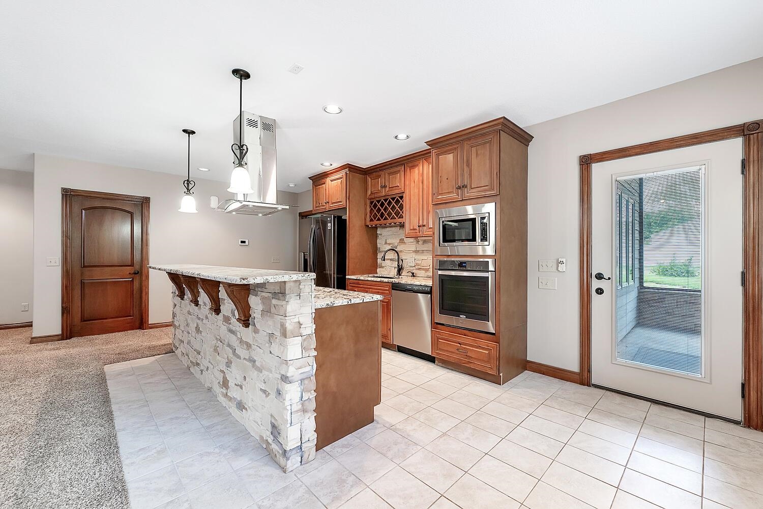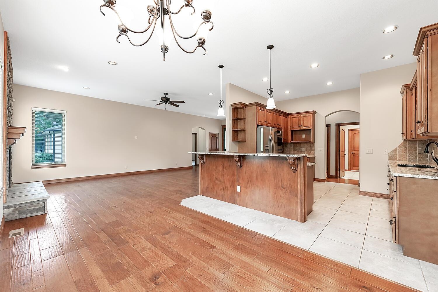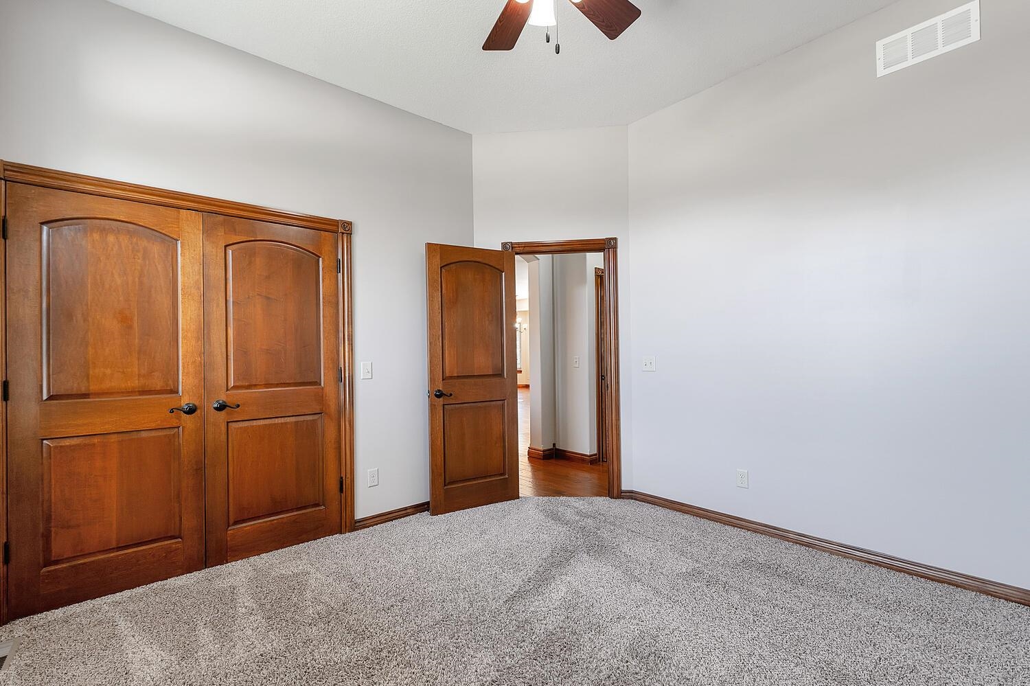 - Description: Custom built home just down the street from the Crestview Country Club in the desirable Andover school district. This home has amenities typically seen in much higher priced homes including 2 full kitchens (one on main level and one in basement), 2 master suites complete with tiled showers, both have access doors to outside, and both are oversized at approx 18x14. The home as you enter the front door has hardwood floors running throughout the main living/dining/kitchen areas. High end quality cabinets in kitchen with granite countertops and stainless appliances, including pantry and garbage disposal. The main level has laundry, 1/2 bath, 3 bedrooms, and 2 full baths, 10 ft ceilings, and large covered deck that looks out over the treed lot for privacy. In the walk out basement there are 2 access doors leading to the outside (one from rec room and one from 2nd primary suite in basement), 2 bedrooms with 2 attached baths, 2 storage rooms, and full size kitchen complete with dishwasher, range, oven, full size fridge and more. Home is being sold at this price without additional lot included to the West. Seller is offering home with additional lot for separate price on separate MLS number. Buyers to be aware that flowerbed on West side of home is on the separate lot and would have to be removed if lot is not purchased with home. Call agent for more details. Show all description