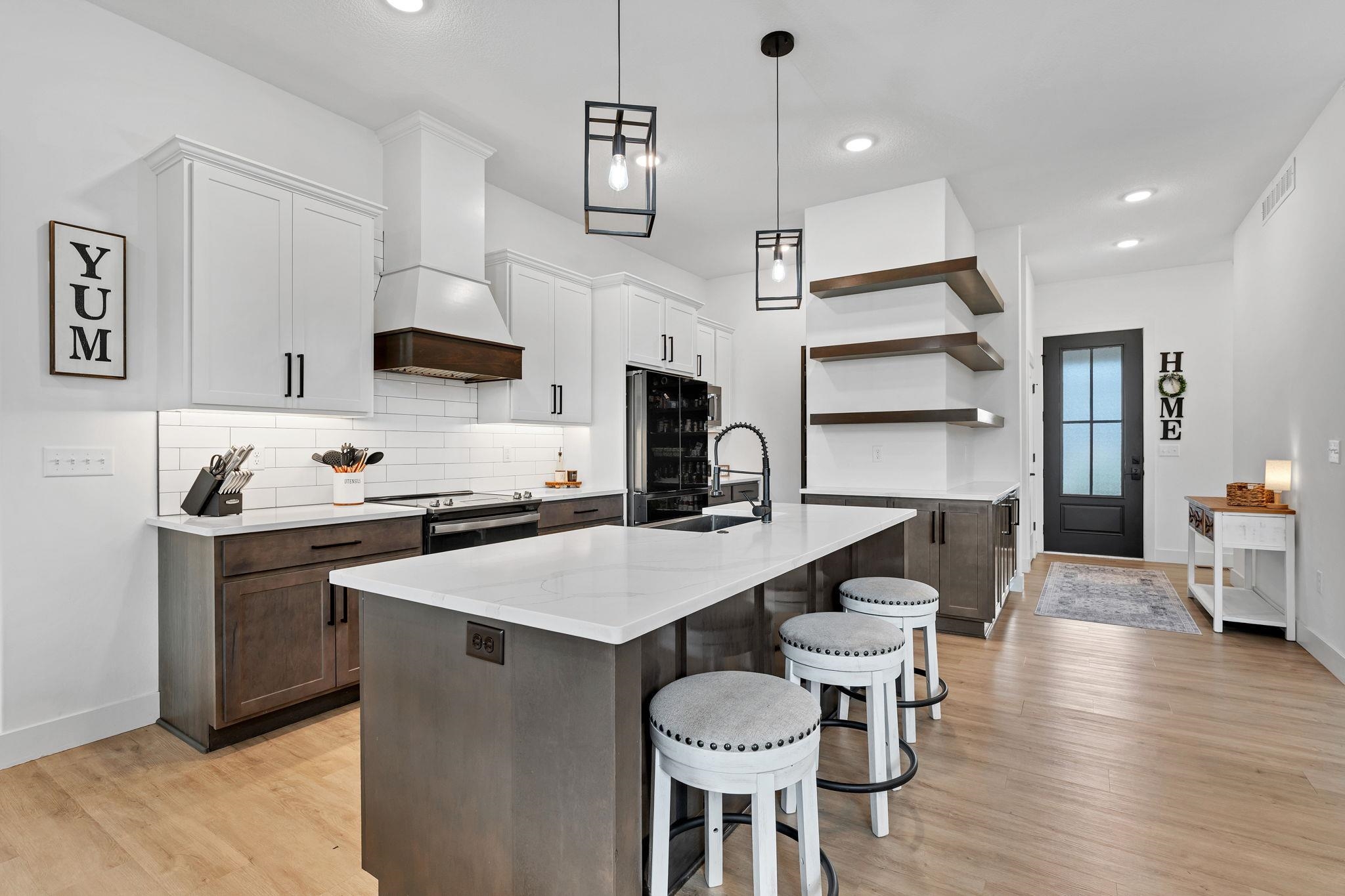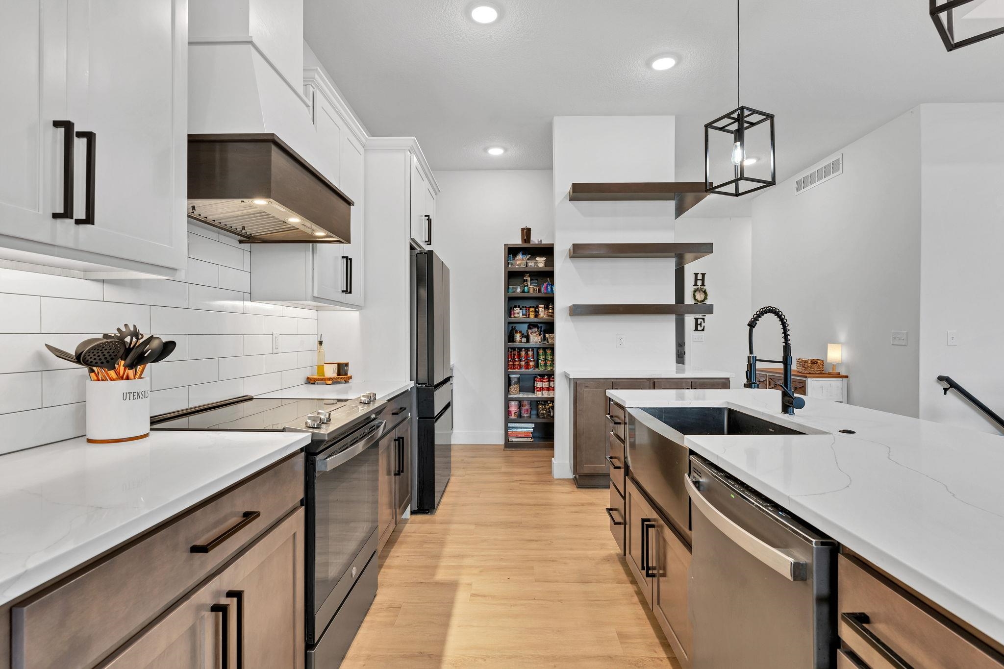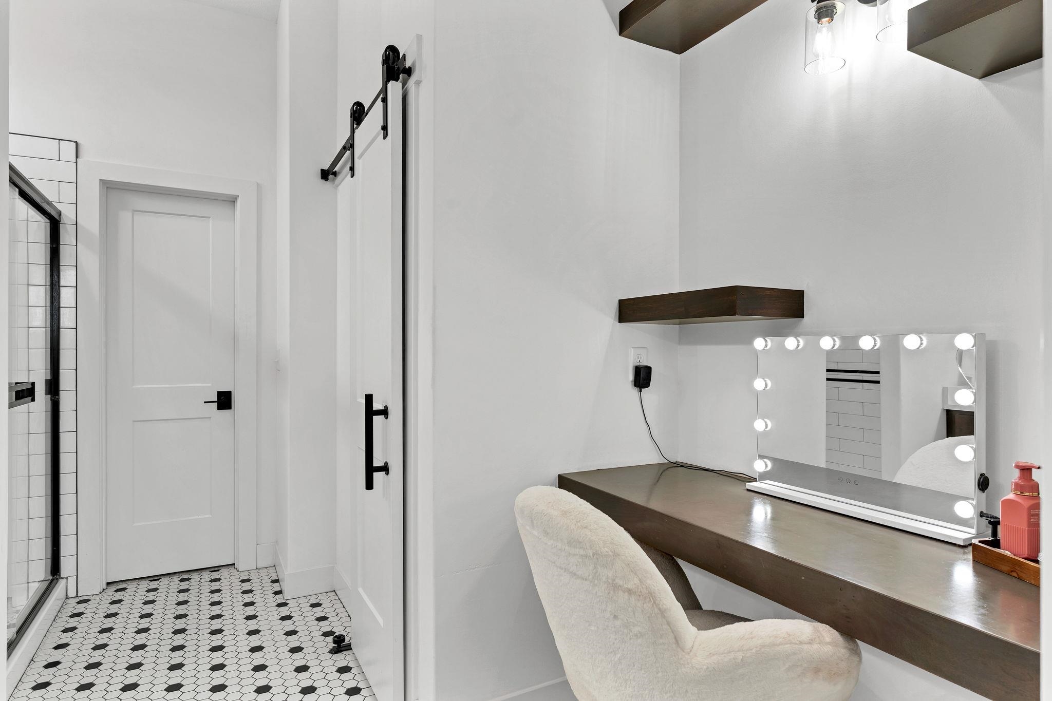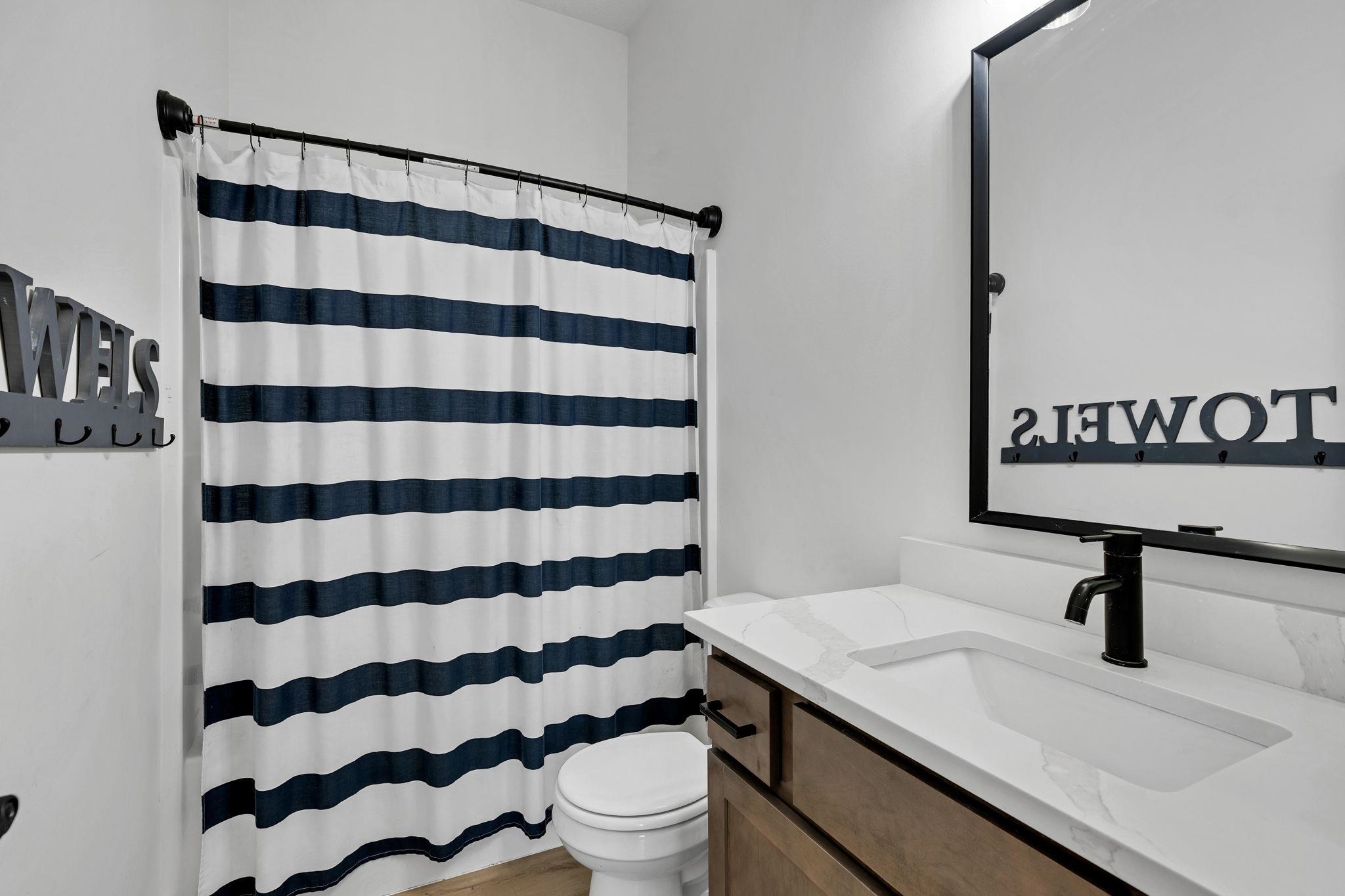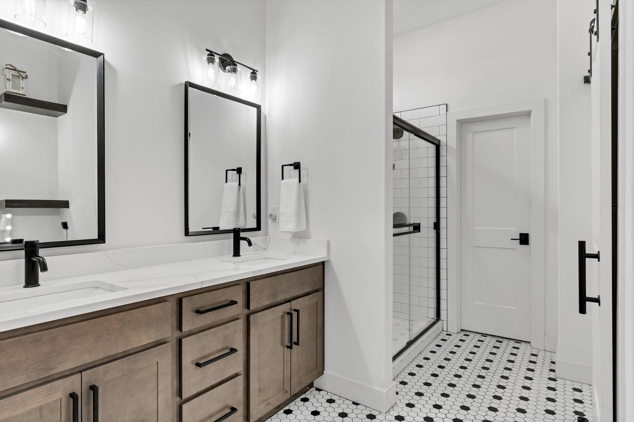 - Master Bedroom: Master Bdrm on Main Level, Split Bedroom Plan, Shower/Master Bedroom, Two Sinks, Quartz Counters