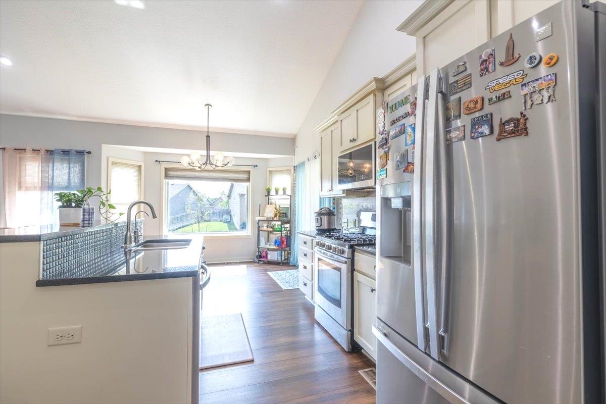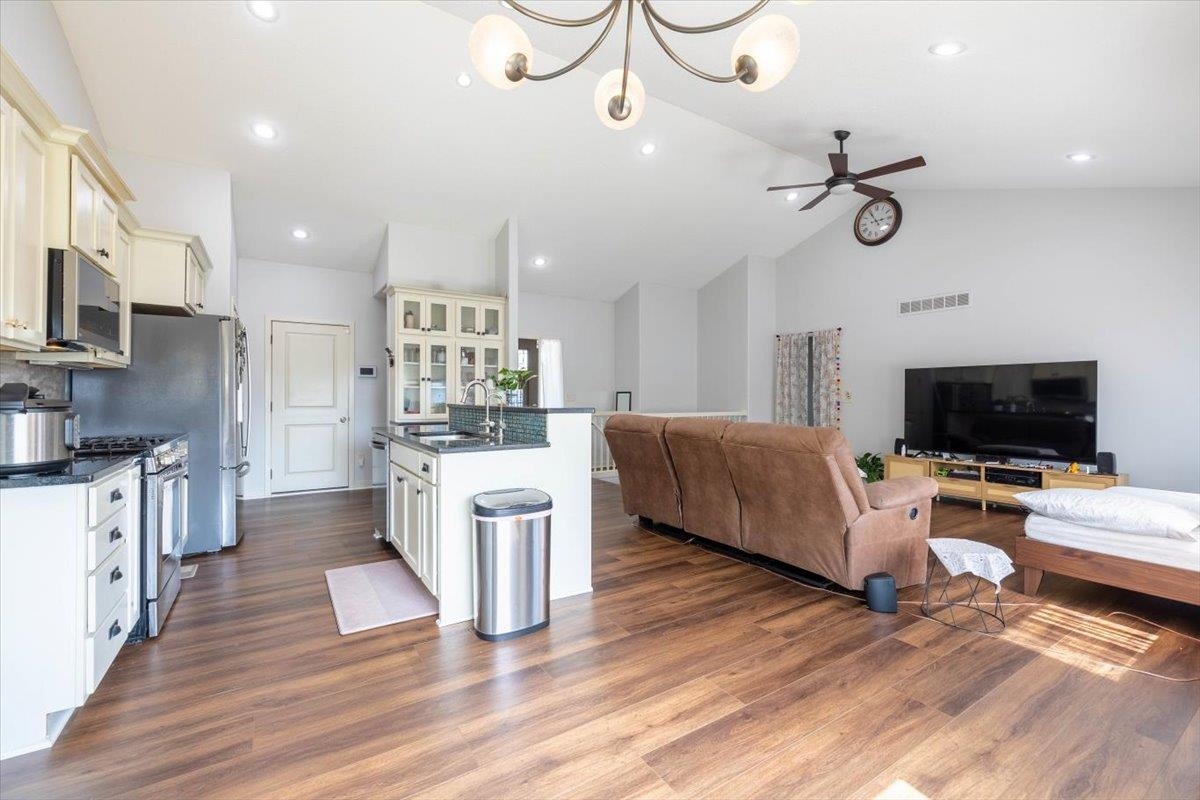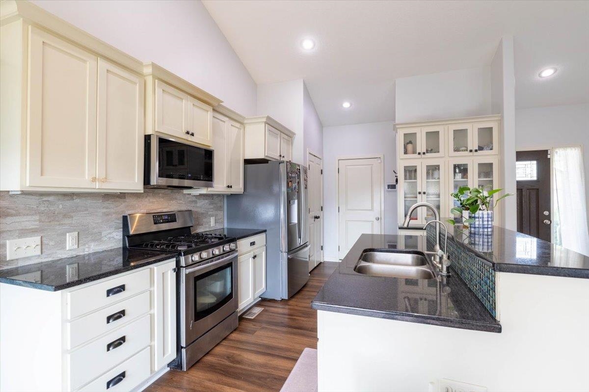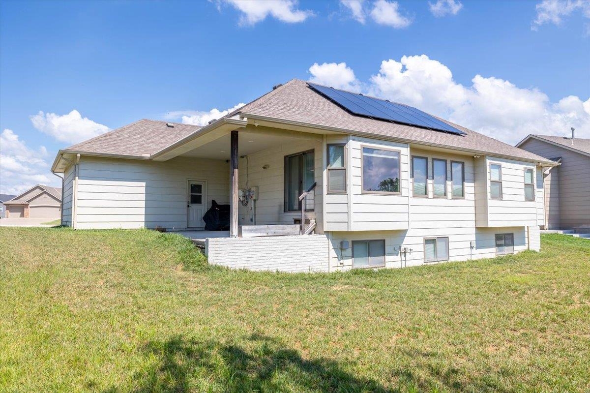 - Description: Wonderfully updated 4 bedroom home with 3 car garage and ideal location! This beautifully updated 4 bedroom, 3 bath home features an open concept floor plan with soaring vaulted ceilings and large windows that flood the space with natural light. The kitchen is a chef's dream - complete with a gas stove, built-in microwave, upgraded cabinetry with soft-close drawers and pull-outs, granite countertops throughout, a pantry, and a bar-height island perfect for casual dining. Enjoy convenient features like a drop zone off the garage, Levolor blinds, and a spacious main-floor laundry room with a folding area. The finished view-out basement includes a walk-up wet bar with space for a microwave and refrigerator, a wall of built-ins for your entertainment center, and a massive walk-in closet in both the master and one of the basement bedrooms. A 10 x 6 storm shelter adds peace of mind. Outside, you'll find a covered patio, sprinkler system with a well, and a fenced yard (two sides - one wood, one composite.) Easy access to HWY 96, East Kellogg, the Turnpike, and all the dining and shopping options at Kellogg and Greenwich make this location unbeatable. Show all description