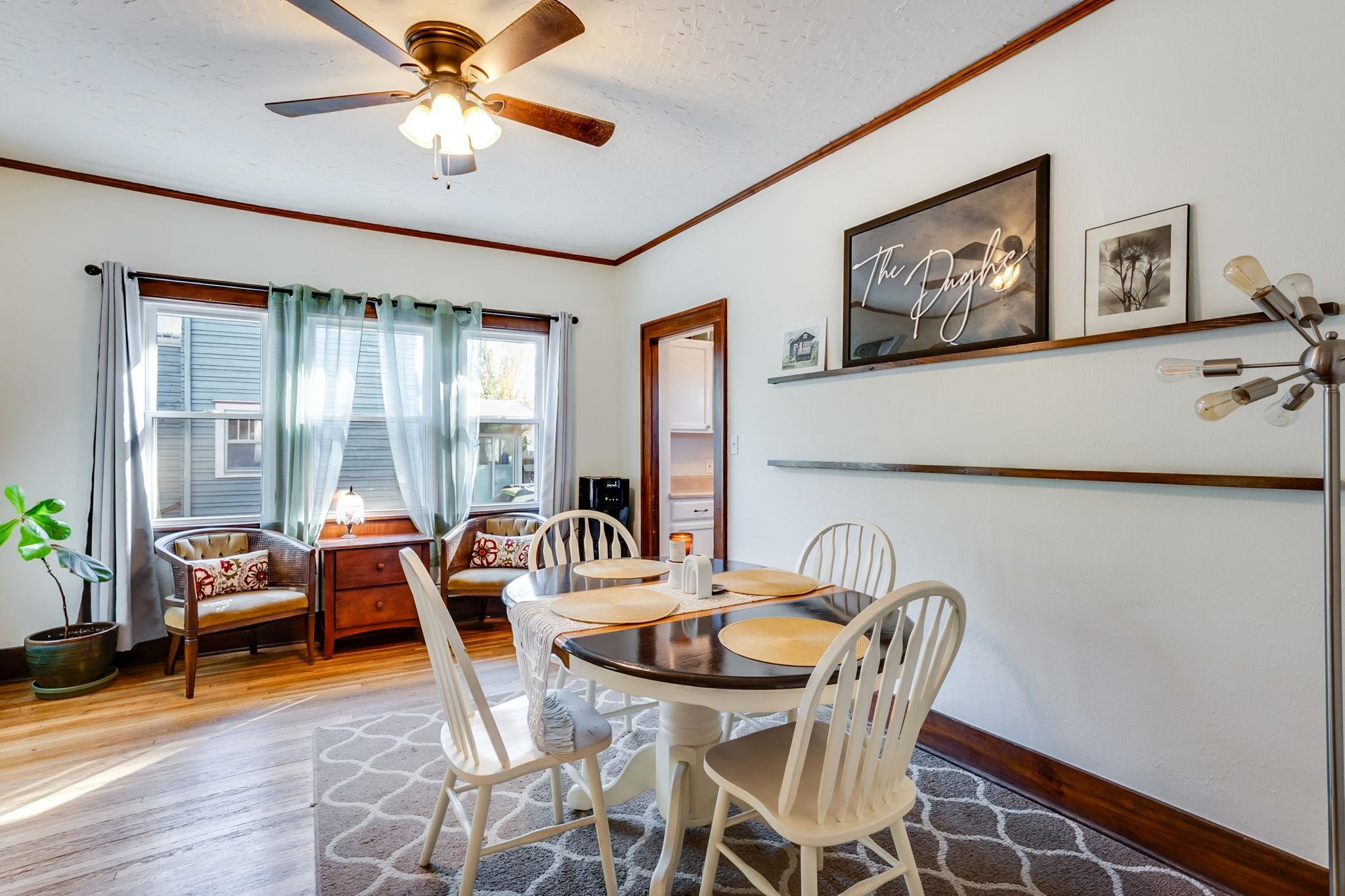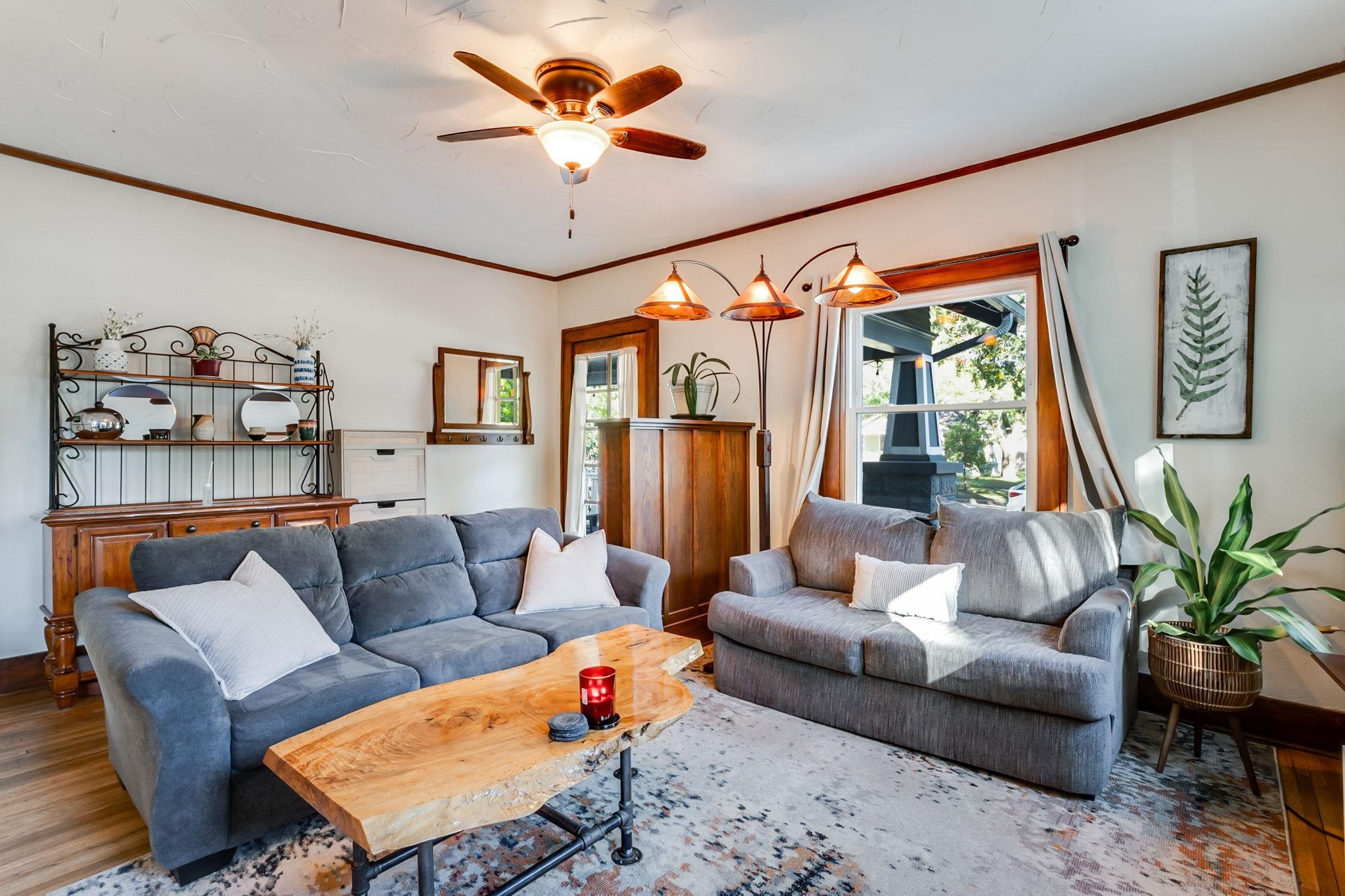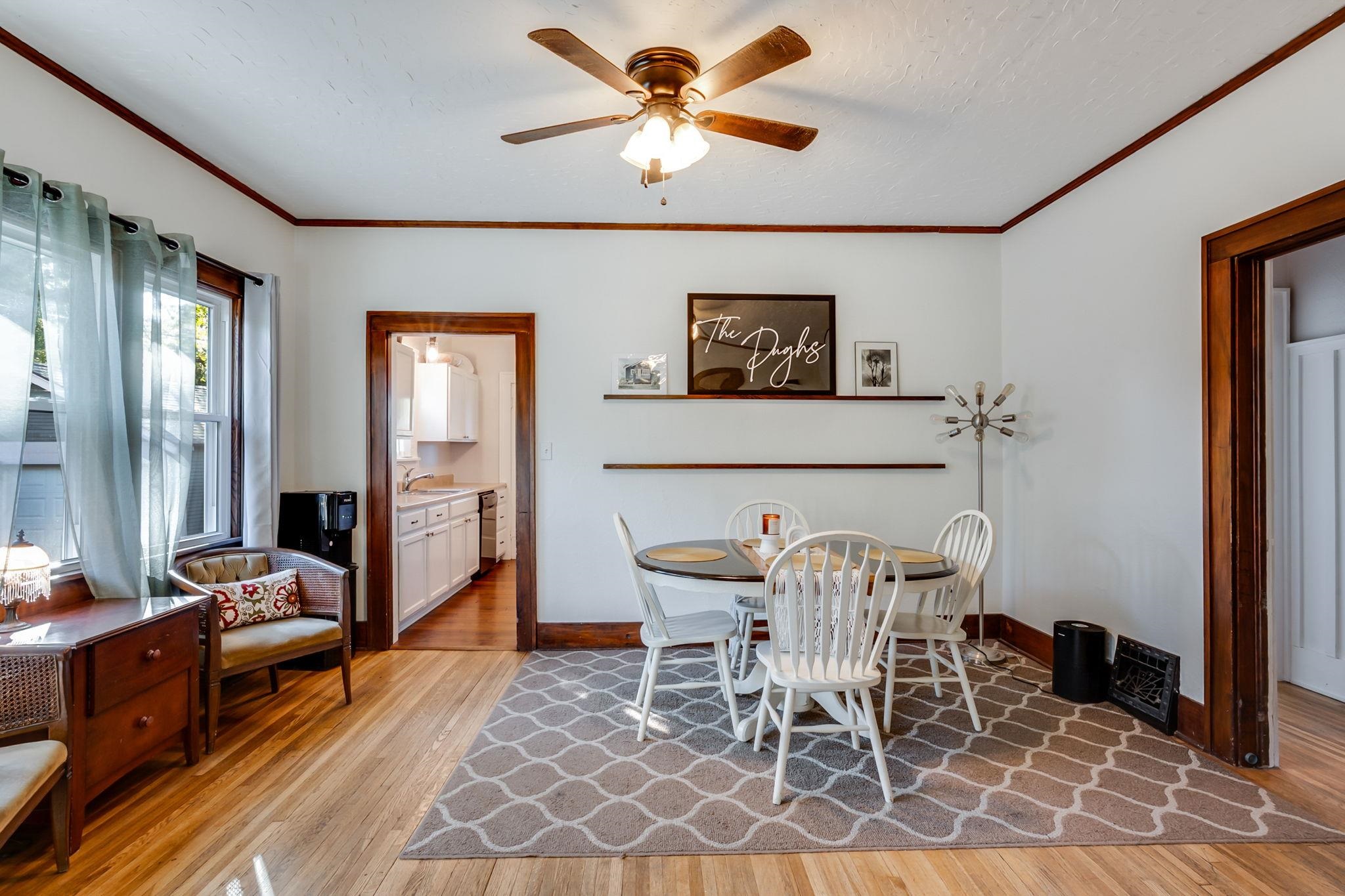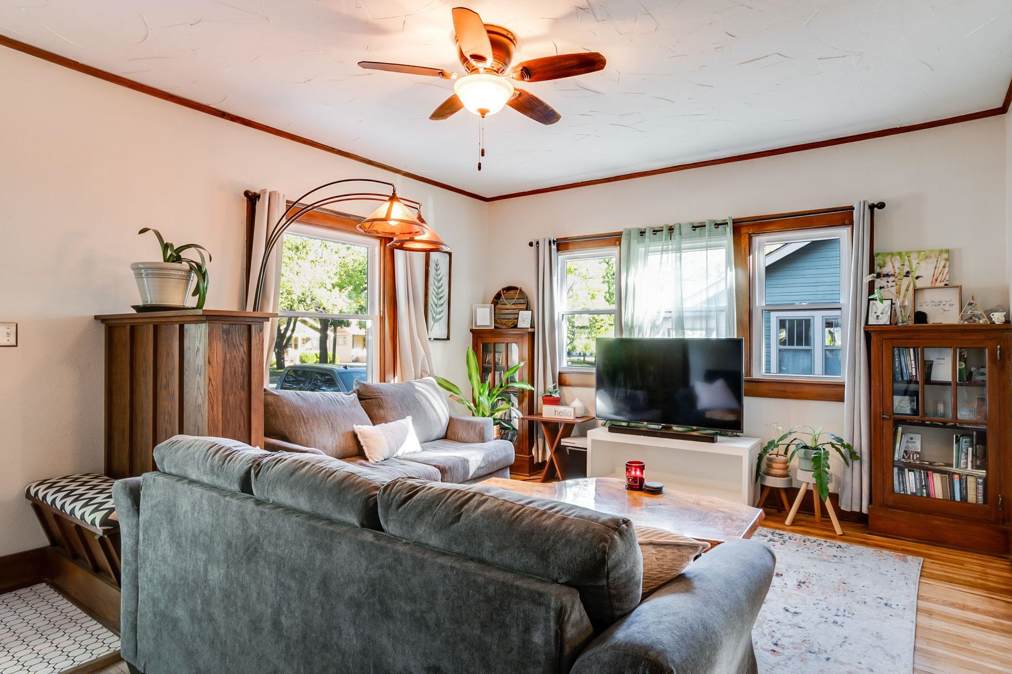 - Description: Welcome to this adorable Craftsman style- Bungalow home tucked away in the most sought out Riverside neighborhood. This home offers such character and cozy design, with all that Riverside has to offer. Notice the large concrete front porch with large decorative pillars, and detailed landscaping beds. As you enter the home admire the wood flooring running through out the main living dining and bedroom areas. The living room offers such character with wooden built-ins, tall baseboards and trim, with a great open floor plan. The space is nice and welcoming, and very spacious for guests. New insulated energy efficient Argon windows were installed in the living room The living room opens to a large dining that offers enough room for a large extended table and is perfect for entertaining through the Holidays. There is so much natural light flowing through the space, and all windows in the dining room are also brand new, and a new fan with a light was also installed. The kitchen sets to the back of the home with new 100% hickory flooring with plenty of storage and lots of counter top working space. The kitchen also offers a built-in island and unique floating shelves that's perfect for a coffee or wine bar. All the kitchen lighting is new. The refrigerator with stay will the home. There is new paint in the Living, Dining, Kitchen areas, and through out the home. The main floor offers two bedrooms that are spacious. The larger bedroom offers a beautiful white wainscoting and has that traditional character. The bathroom offers tiled walls and a tub/ shower combo with a full subway style tile surround. The sink in the vanity is raised with a unique butcher block counter top. All the hardware is new in the shower as well as the faucet for the sink. There is great built-in storage in the bathroom for towels and accessories, and lower storage for the laundry items. The bathroom also offers a beautiful shiplap ceiling design, and sconce lighting- truly a lovely design. There is also new paint on the vanity. Enjoy the extra built-ins in the hallway for storage as well. The back yard offers a wonderful place to entertain as it is large, and has a privacy fence. The deck is newer as of 2020, and there is a large concrete patio area extending at 14x20 feet. The home and garage has a newer roof of 2020. Enjoy the large shade trees and privacy while entertaining in the backyard. There is also a detached garage for extra storage and perfect for a one car stall. The basement offers more great storage and washer and dryer area. The washer and dryer will stay with home. New PVC plumbing pipes were installed in the home for better function and the sellers have an annual insect spray. There is also a transferable warranty on all the new window that are energy efficient. Don't miss the opportunity to see this home, it is move in ready. Show all description