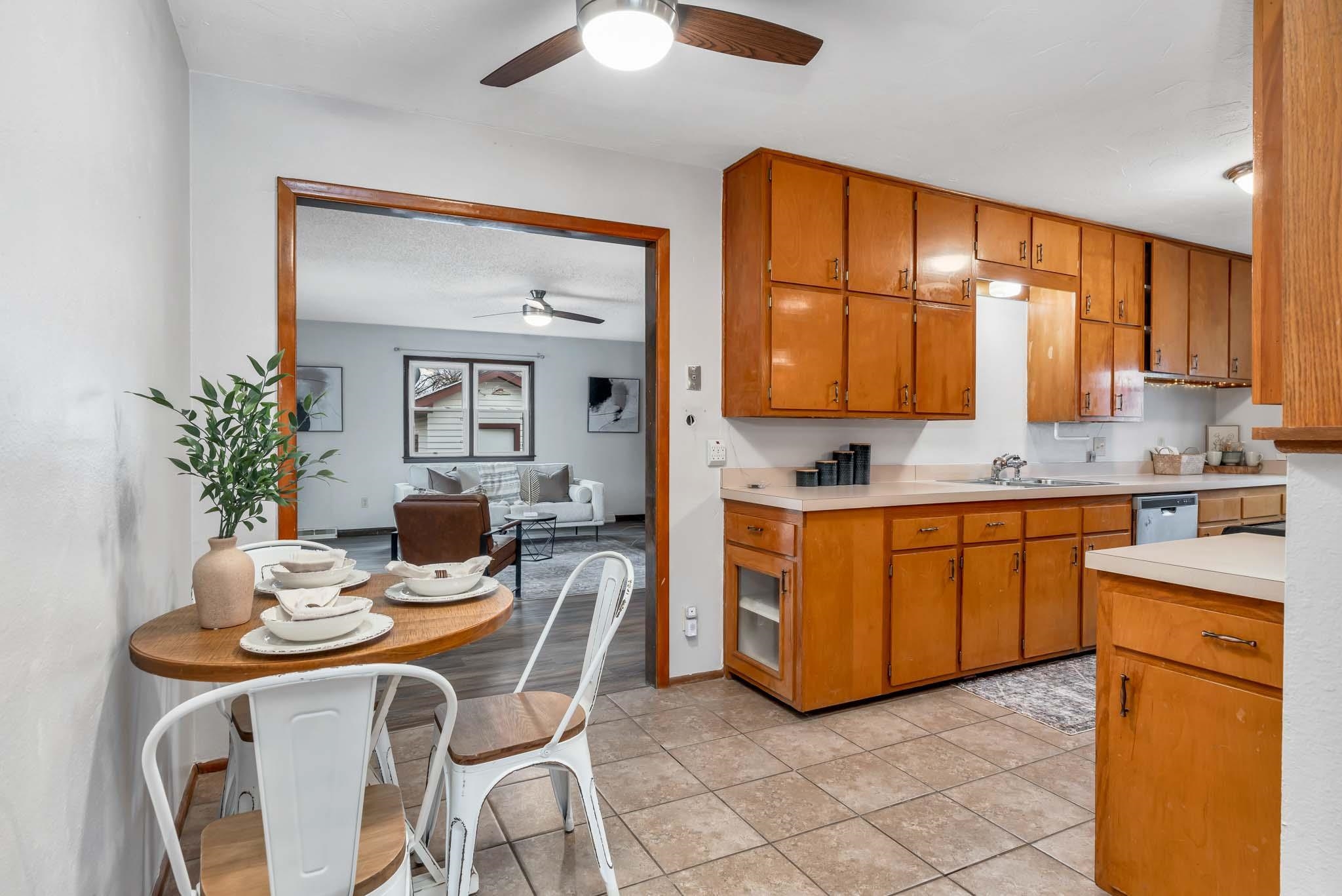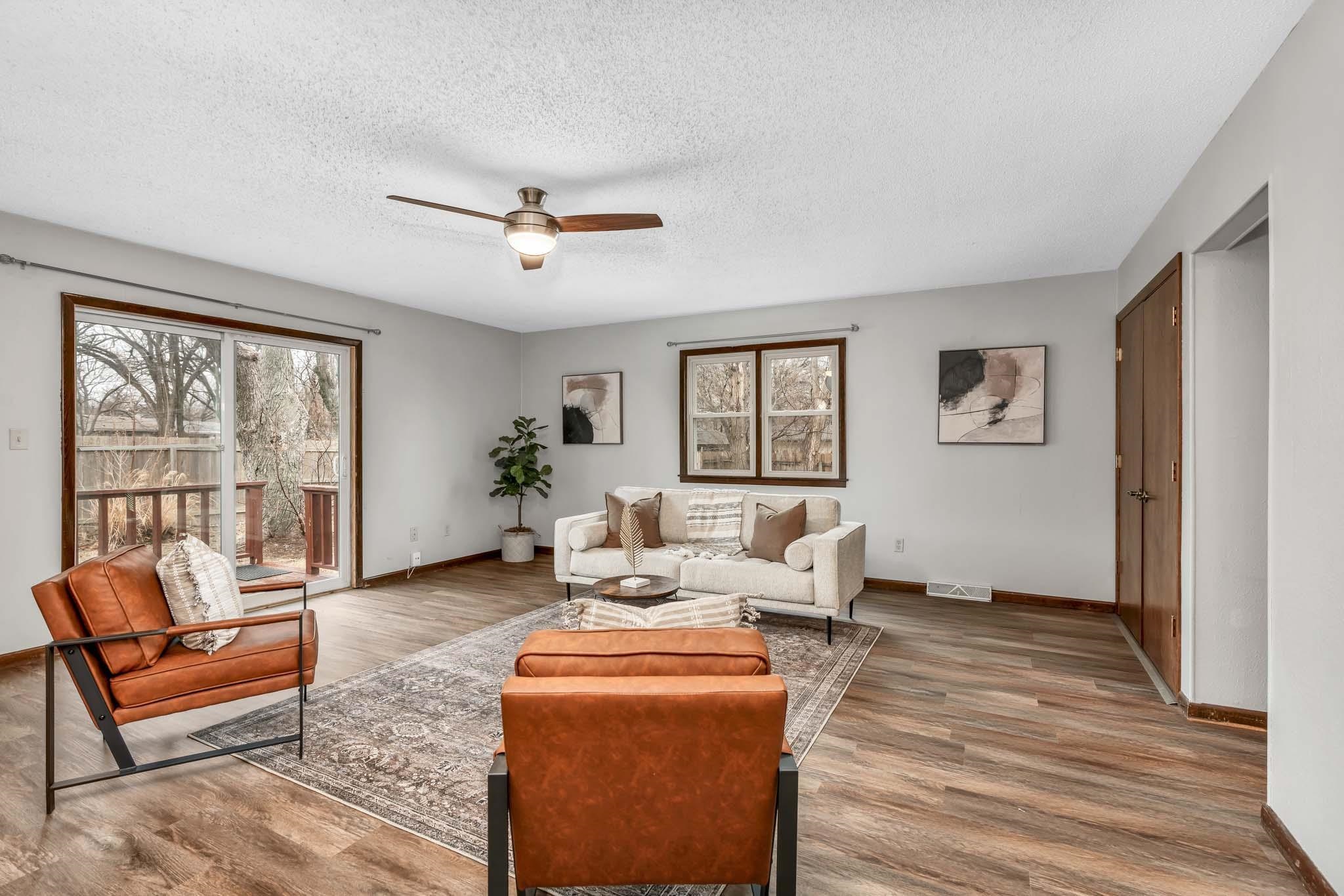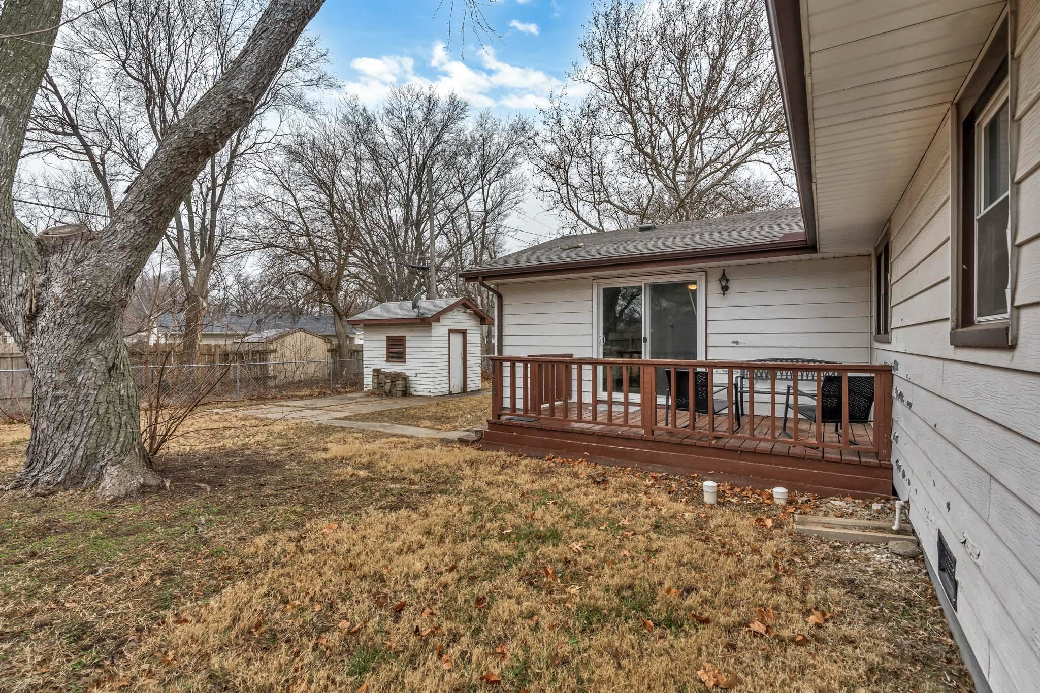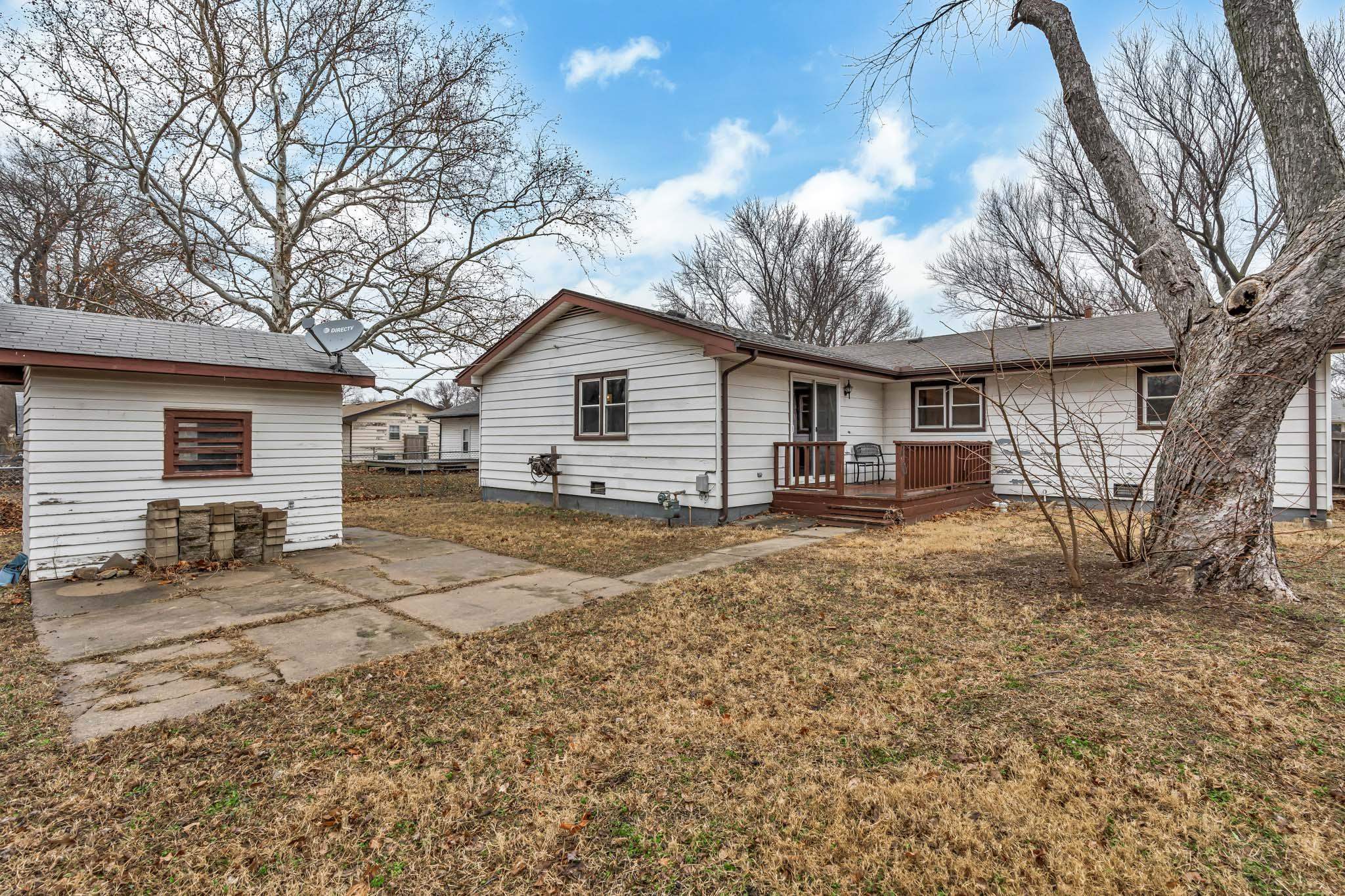 - Description: Welcome to this charming 3-bedroom, 2-bathroom home with nearly 1400 sq ft. of spacious living! Upon entering, you'll be greeted by an inviting living room with large windows. It seamlessly flows into the dining and kitchen areas, which boast an abundance of wood cabinetry, ample storage, and included appliances. The 20x18 family room is perfect for everyone! The main level also includes a convenient laundry area. Outside, the property continues to impress with a treed lot that features a covered patio, deck, a secure chain and wood fence, and a practical storage building. This home is packed with fantastic updates and features, including newer windows, guttering, and doors (installed between 2017 & 2018). HVAC is new in 2025, wood floors were also refinished in 2025! As an added bonus, the attached 1-car garage has a hidden storm shelter in the floor, offering peace of mind during severe weather. With plenty of room to spread out and all the thoughtful details throughout, this home is perfect for creating lasting memories. Don't miss the opportunity to make it yours! Show all description