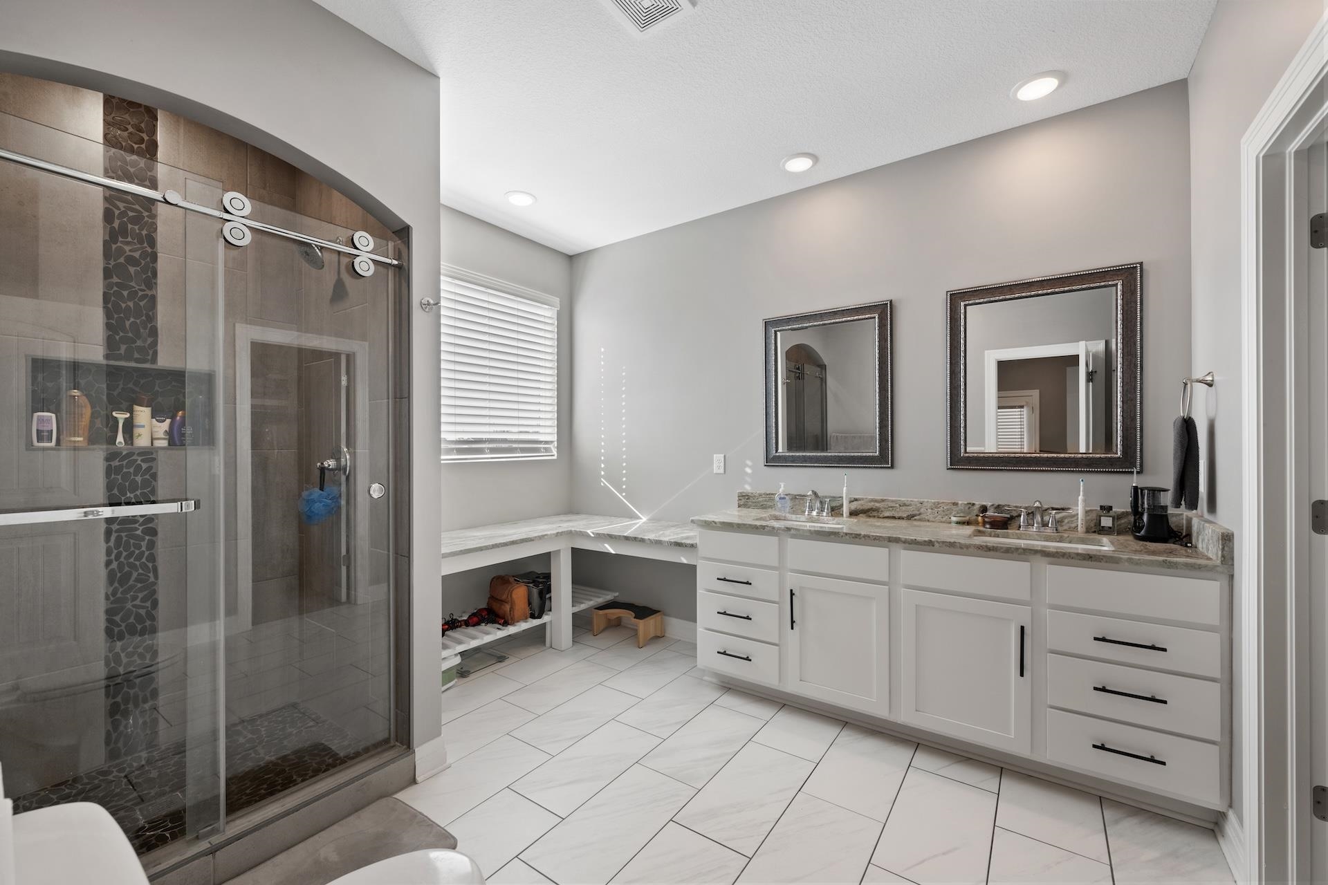 - Master Bedroom: Master Bdrm on Main Level, Split Bedroom Plan, Master Bedroom Bath, Shower/Master Bedroom, Two Sinks, Granite Counters