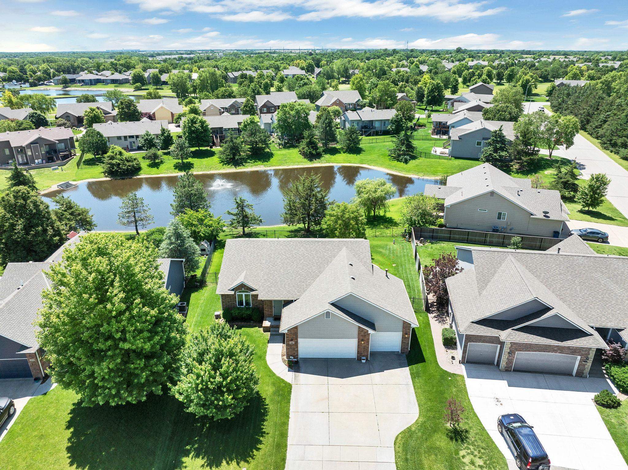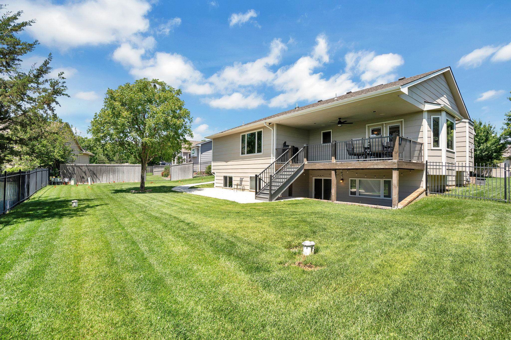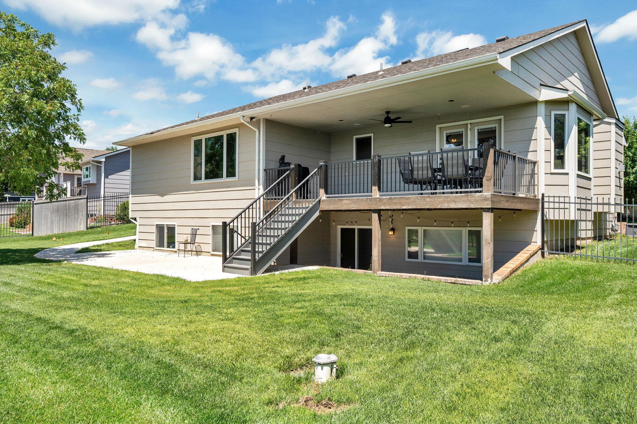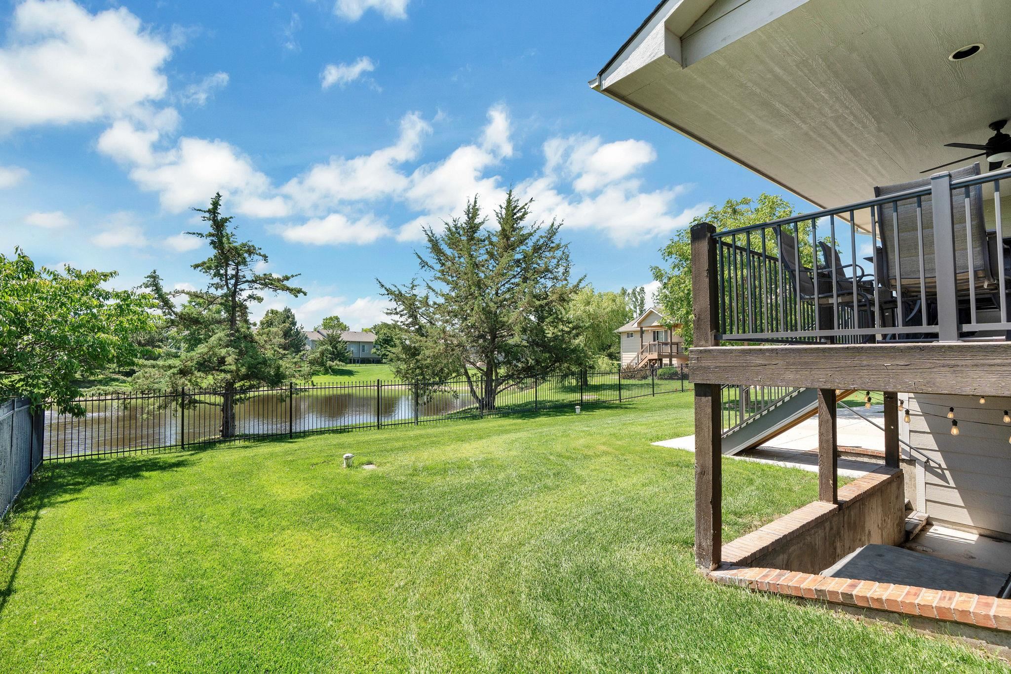 - Description: Welcome to this beautifully crafted 5-bedroom, 3-bath home featuring rich wood finishes and floors throughout. The open-concept kitchen with eating bar flows into the dining area, leading to a Timber Tech deck overlooking the water—perfect for relaxing or entertaining. Enjoy surround sound throughout the home, including in the spacious primary suite, which offers serene water views, an inviting bathroom with dual sinks, jetted tub, and a beautifully tiled shower. The finished basement is ideal for entertaining, complete with custom built-ins, included TV and speakers, wet bar, walk-out access to the hot tub, and even a hidden room! A rare find with exceptional design and comfort throughout! Located in the sought-after Goddard School District, this home offers convenient access to grocery stores, restaurants, swimming pools, scenic walking paths, and peaceful neighborhood ponds—a perfect blend of comfort, community, and convenience. Show all description