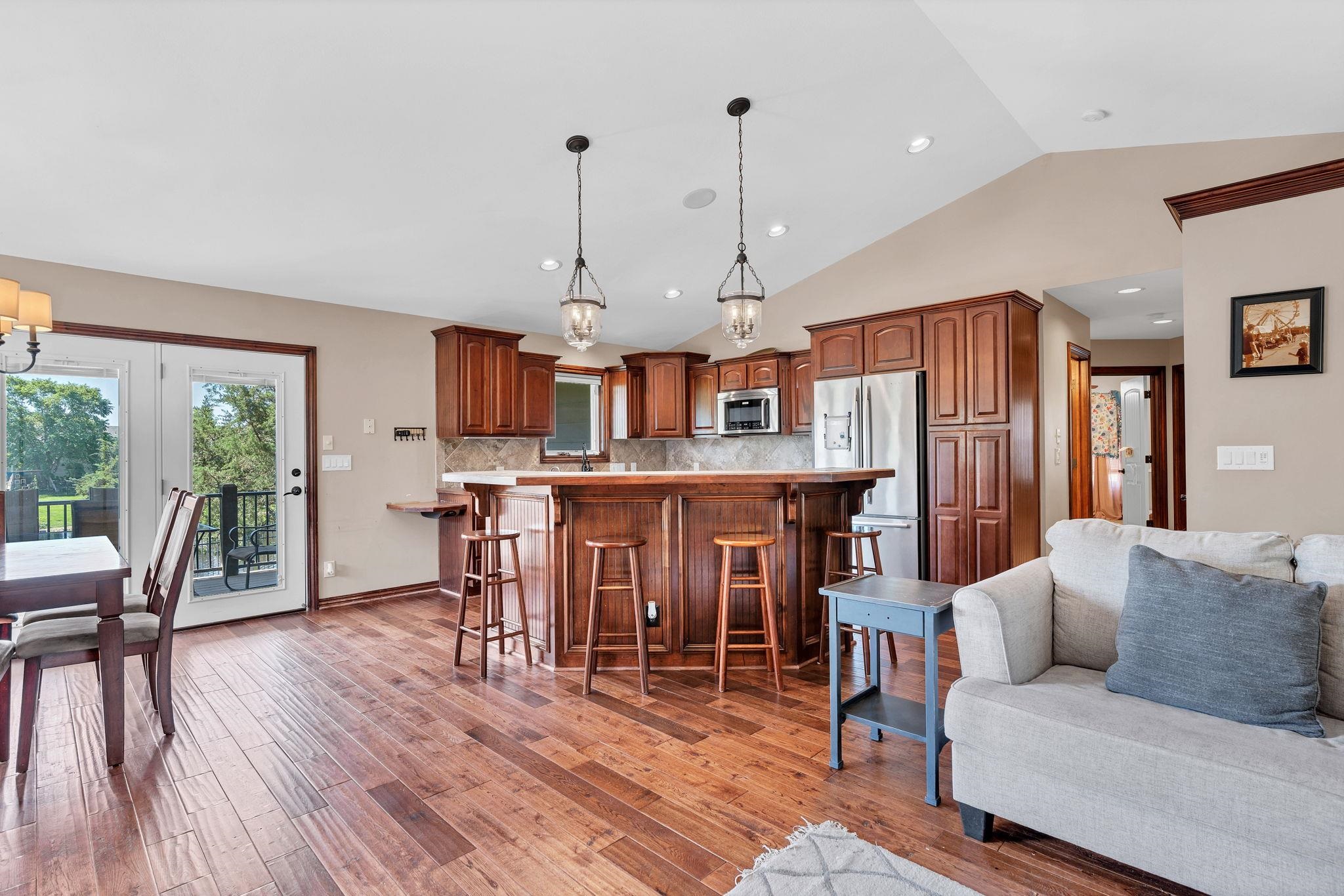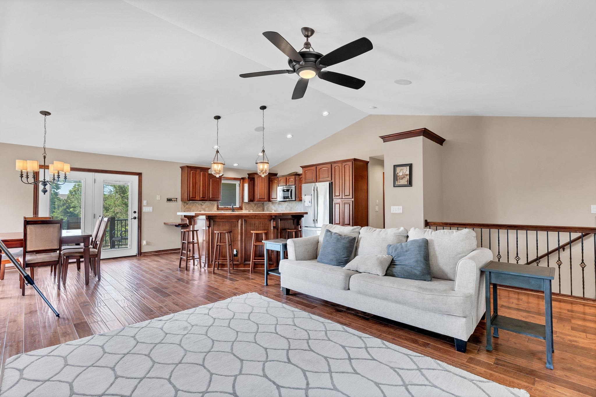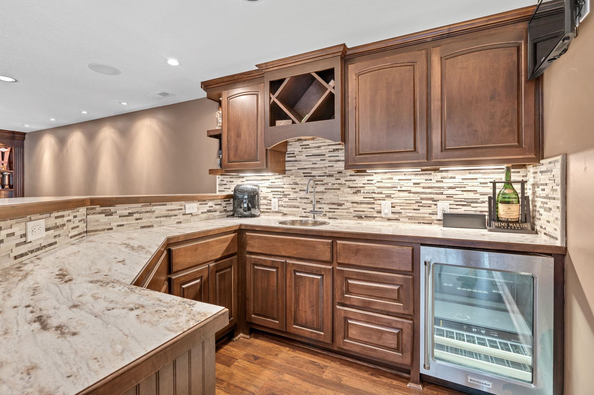 - Description: Welcome to this beautifully crafted 5-bedroom, 3-bath home featuring rich wood finishes and floors throughout. The open-concept kitchen with eating bar flows into the dining area, leading to a Timber Tech deck overlooking the water—perfect for relaxing or entertaining. Enjoy surround sound throughout the home, including in the spacious primary suite, which offers serene water views, an inviting bathroom with dual sinks, jetted tub, and a beautifully tiled shower. The finished basement is ideal for entertaining, complete with custom built-ins, included TV and speakers, wet bar, walk-out access to the hot tub, and even a hidden room! A rare find with exceptional design and comfort throughout! Located in the sought-after Goddard School District, this home offers convenient access to grocery stores, restaurants, swimming pools, scenic walking paths, and peaceful neighborhood ponds—a perfect blend of comfort, community, and convenience. Show all description