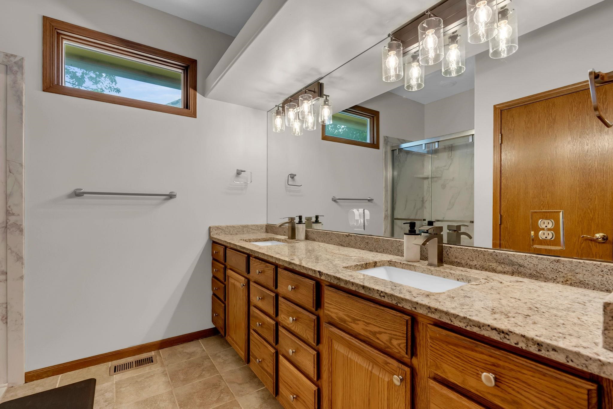 - Master Bedroom: Master Bdrm on Main Level, Split Bedroom Plan, Master Bedroom Bath, Shower/Master Bedroom, Two Sinks, Granite Counters
