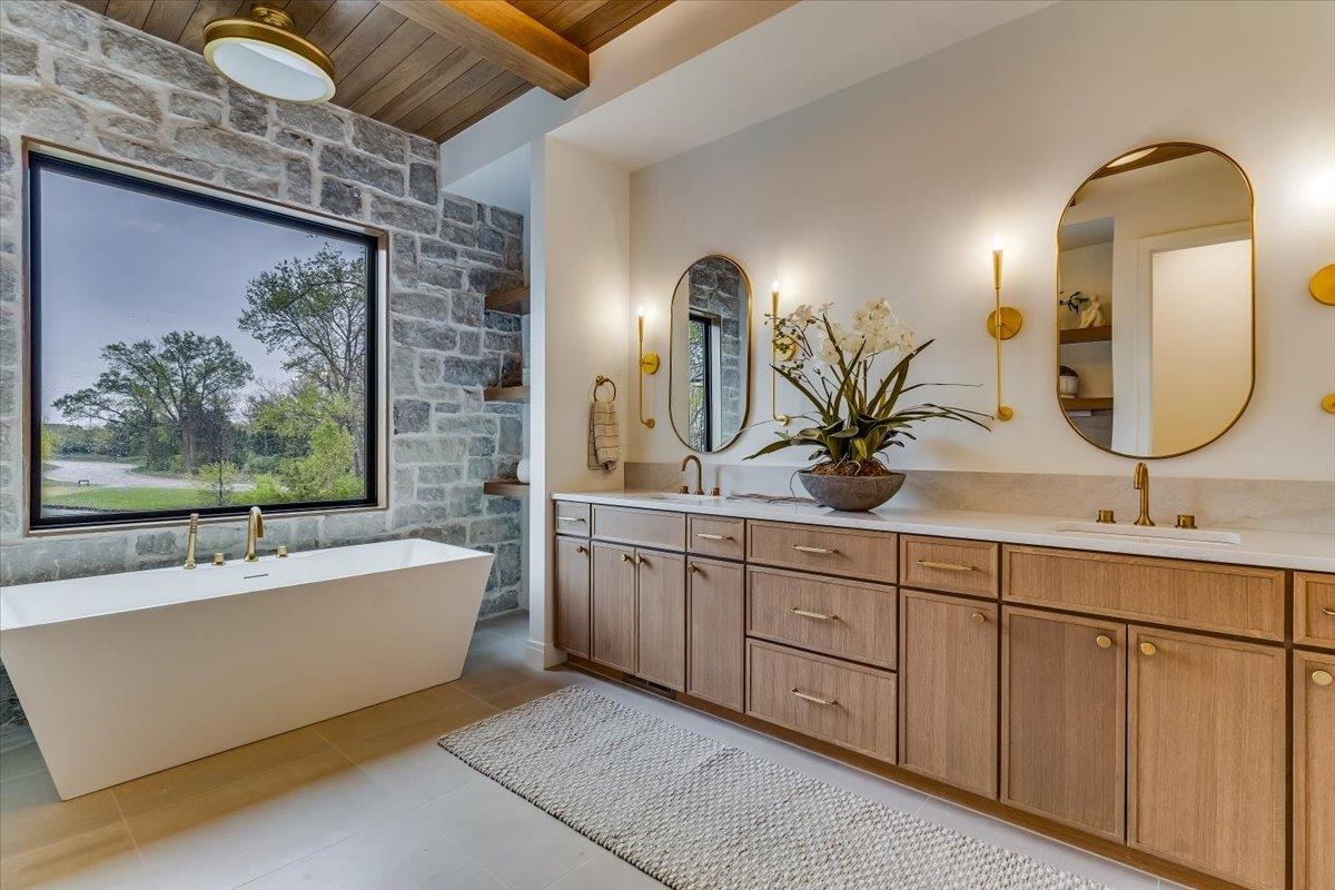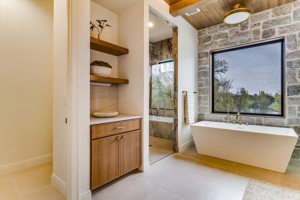 - Master Bedroom: Master Bdrm on Main Level, Split Bedroom Plan, Master Bedroom Bath, Shower/Master Bedroom, Tub/Master Bedroom, Sep. Tub/Shower/Mstr Bdrm, Two Sinks, Quartz Counters, Water Closet