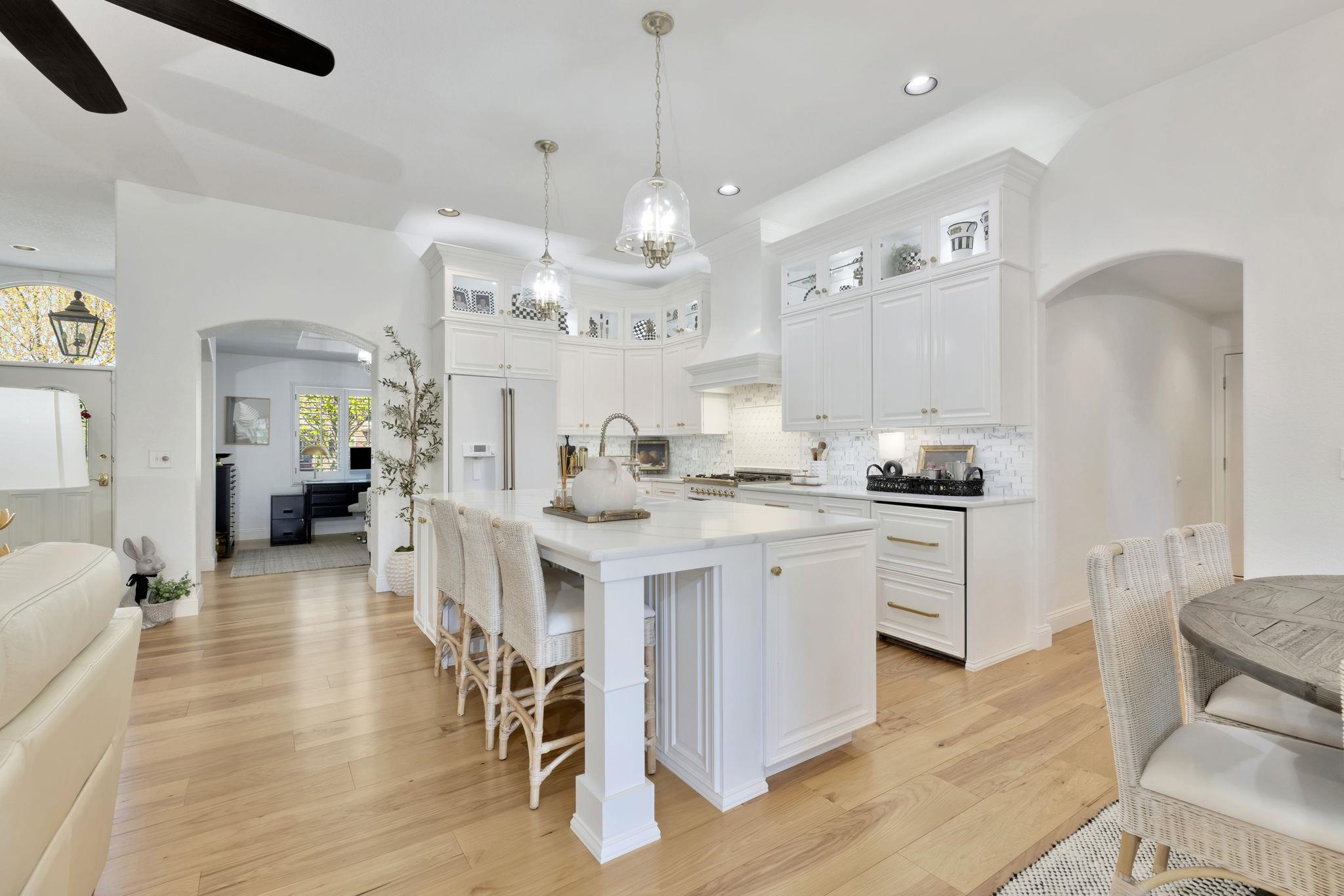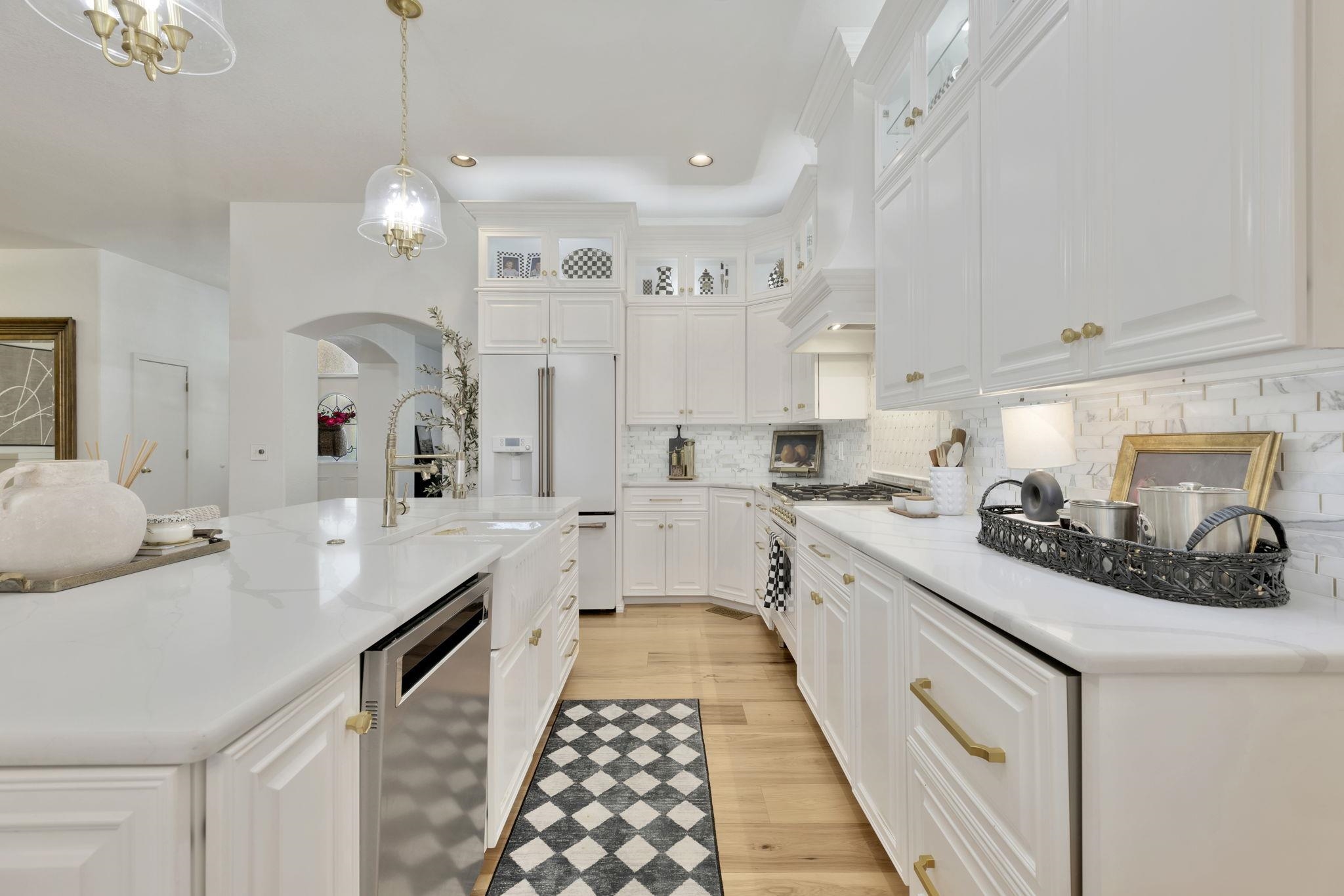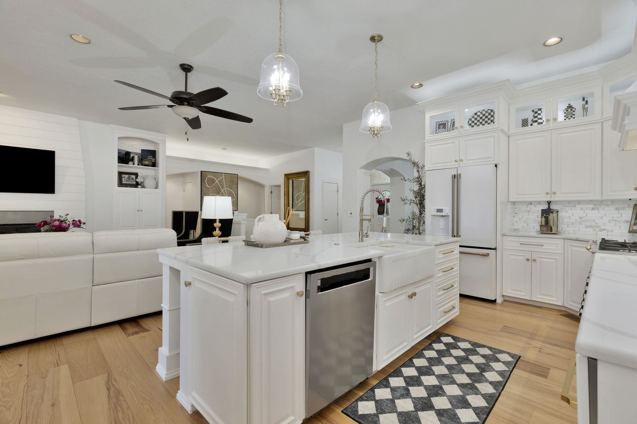 - Description: Welcome to 1700 N. Sagebrush – a rare gem that combines elegant design, top-tier finishes, and an unbeatable location with panoramic water views from nearly every window. This beautifully updated ranch home boasts 3 spacious bedrooms, a versatile 4th bonus room (perfect as a bedroom, office, or media room), and 3 full bathrooms. Step inside to discover a flowing open-concept layout ideal for entertaining. The welcoming living room features a gas log insert fireplace with striking tile and shiplap detailing, custom entertainment cabinetry, plantation shutters, and recessed lighting for a sophisticated touch. Gorgeous flooring runs seamlessly throughout the living, dining, kitchen and bedroom areas, creating a cohesive and stylish space. The heart of the home is the fully remodeled kitchen, thoughtfully designed with an oversized island offering built-in storage and USB outlets, lighted glass display cabinets, under/over cabinet lighting, white stainless-steel appliances, refrigerated drawers, and soft-close cabinetry—all accented with tasteful gold hardware and backsplash elements. Retreat to the serene primary suite, complete with trayed ceilings, updated and heated flooring, motorized blackout shade, and direct access to the screened-in covered deck. The spa-like master bath offers a clawfoot tub, quartz double vanities, a private water closet, tiled walk-in shower, and expansive storage including a walk-in closet. Downstairs, the finished walk-out basement offers a second fireplace, wet bar, built-ins, ample space for entertaining or gaming, and large windows that flood the space with natural light. You'll also find a bedroom, full bath, generous storage, and a bonus room with a cedar walk-in closet. Enjoy three distinct outdoor living spaces: a screened-in covered deck, screened-in patio, and an open patio – all overlooking serene water views. Additional highlights include wrought-iron fencing, irrigation well, and a sprinkler system. Located in a beautiful neighborhood within sought-after Andover Schools, this stunning home blends comfort, functionality, and refined style. Don’t miss your opportunity to own this waterfront dream! Show all description