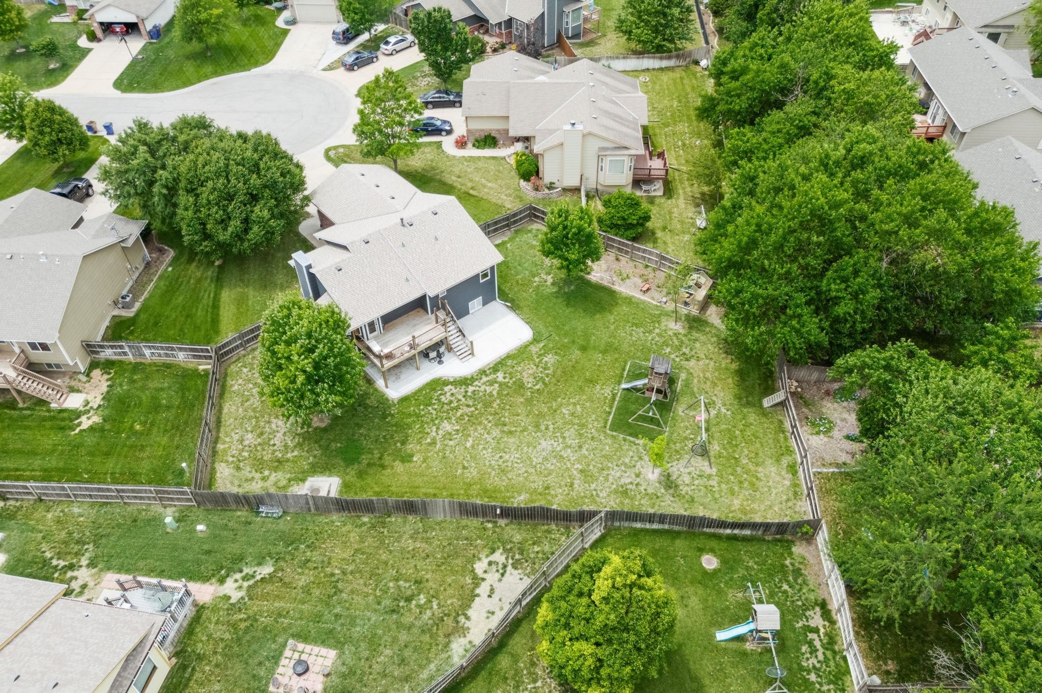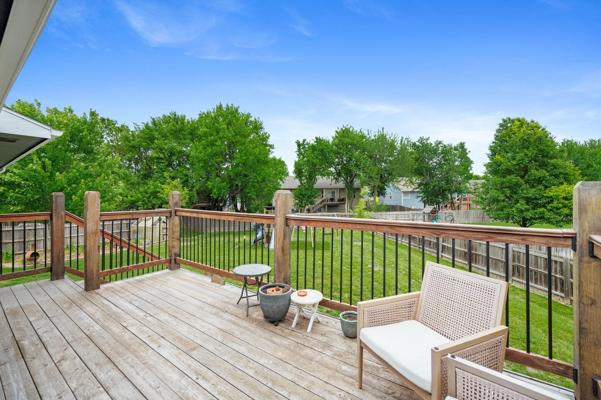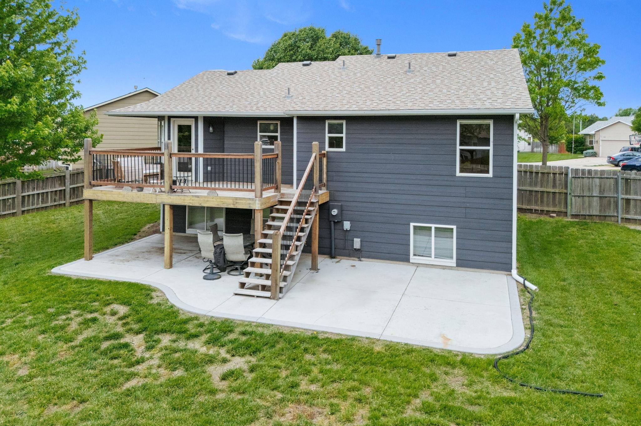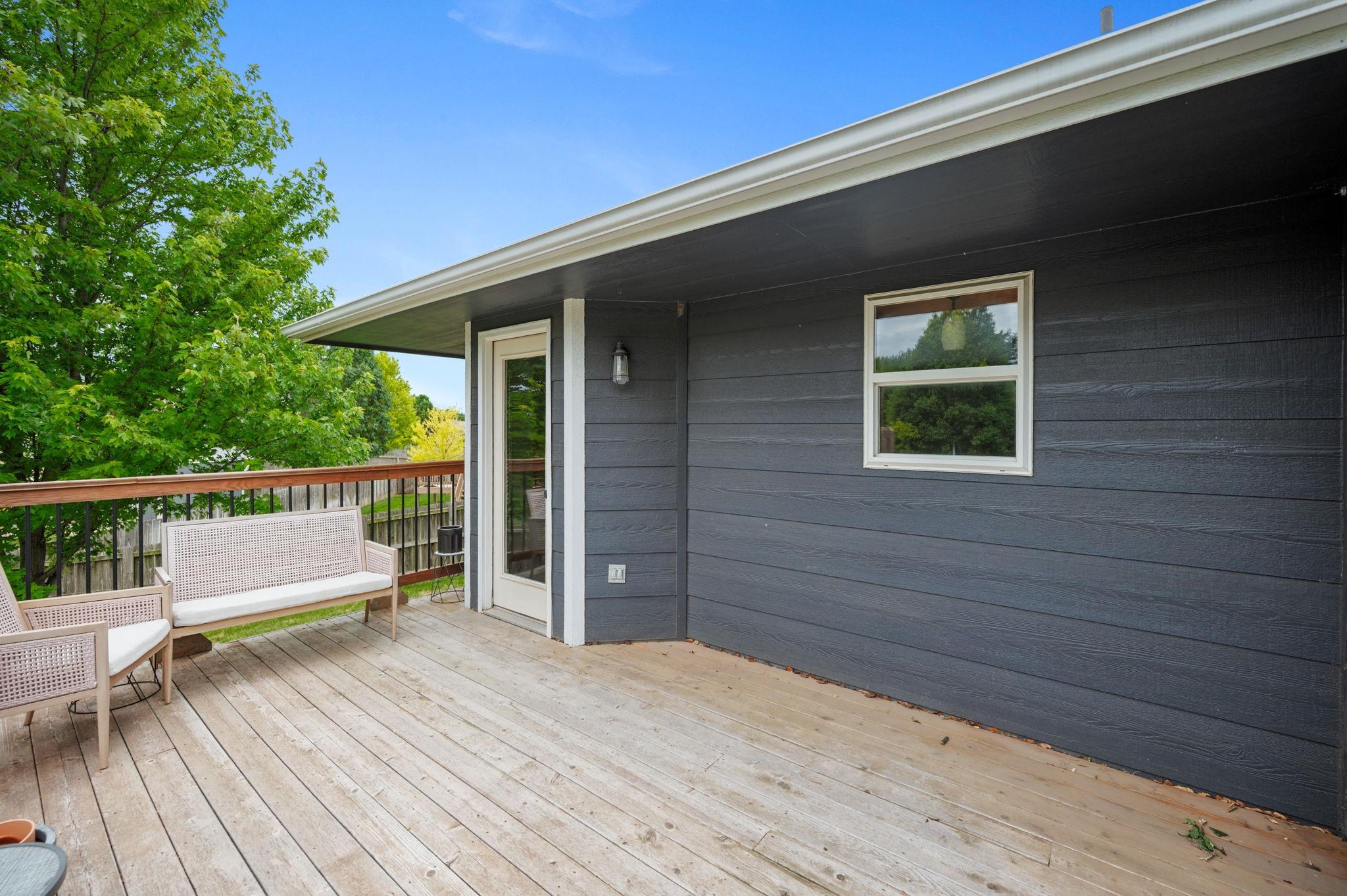 - Description: Tucked away in a quiet neighborhood at the end of a peaceful cul-de-sac, this beautifully maintained home offers both privacy and charm, situated on nearly half an acre of land. With outstanding curb appeal, you’ll immediately notice the welcoming covered front porch, stylish farm-style exterior sconces, and the attractive freshly painted exterior complemented by new siding where needed (2025) and a new roof (2024). Step inside to discover an open-concept living space with engineered hardwood flooring throughout, soaring vaulted ceilings, and large windows adorned with custom blinds that flood the space with natural light. The heart of the home features a bright kitchen with sleek new stainless steel appliances (2023), and a convenient door leading to the expansive rebuilt deck (2020), now double its original size and finished with aluminum balusters—perfect for outdoor entertaining or relaxing with a view of the spacious, fully fenced backyard. This outdoor haven includes a large concrete patio, a playset on turf, a greenhouse, raised garden beds, and plenty of lush green space—all enclosed by a wood privacy fence with two gates. The main floor hosts a spacious primary ensuite complete with two closets and a private bathroom, a second bedroom and full bathroom, as well as a laundry room with new tile flooring, also installed in the bathrooms for a fresh, updated look. Downstairs, the fully finished basement offers even more living space with the bedroom— featuring a built-in dresser and shelving in the closet—a full bathroom, and a large family room with big view-out windows that fill the space with light. Additional highlights include a two-car garage with a new MyQ smart garage door opener (2023), and all new interior paint (2025), making this home truly move-in ready. Don't miss it! Show all description