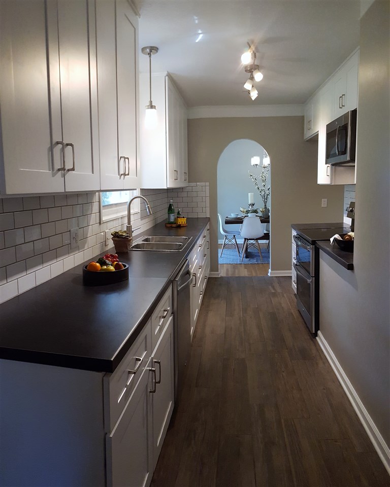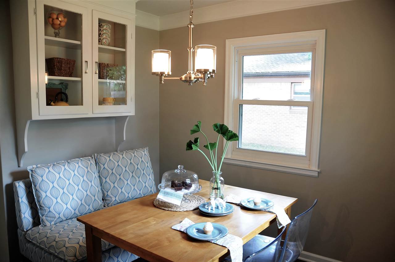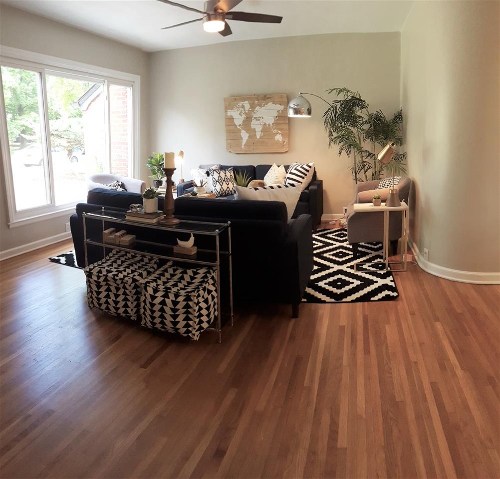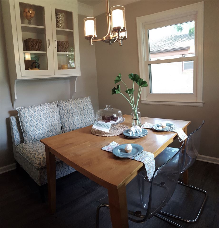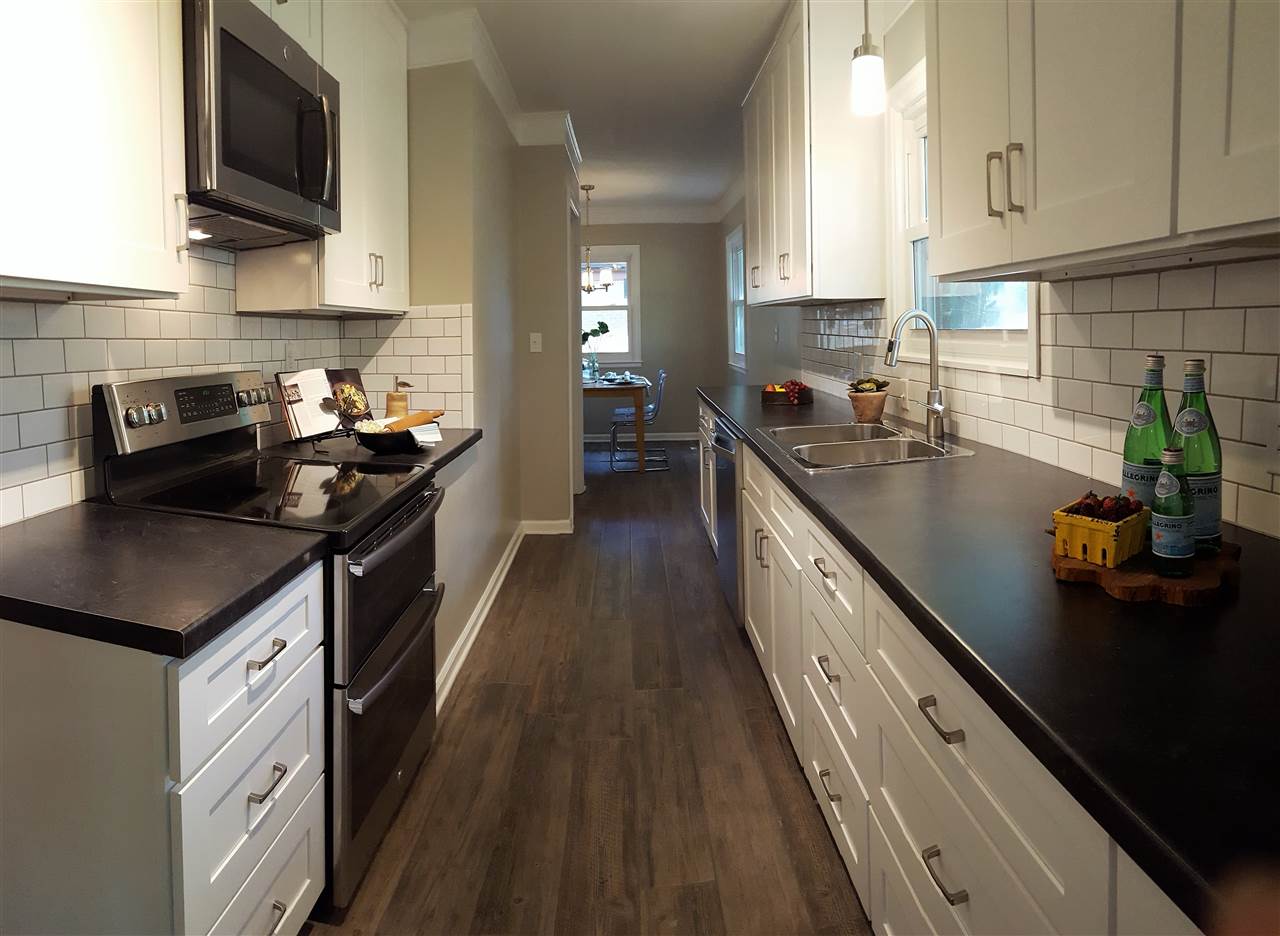 - Description: BEAUTIFULLY updated all brick ranch with unique original touches. Check out the rounded wall in the living room, the arched doorways and the bay window area with door to the backyard. This house started with some fantastic, unique features that have only been enhanced by the tastefully timeless updates. New shaker style, all white cabinets go to the ceiling just as they would have in the original design but have adjustable shelves, soft close hinges and dove tailed drawers. Stylish wood-look tile in the kitchen and breakfast nook is a 21st century upgrade with a nod to the past. The new kitchen floor plan allows for a microwave and dishwasher while still leaving plenty of cabinet and counter top space. The double-in-a-single oven will be appreciated not only for special occasions but for everyday use as the smaller upper oven preheats faster and is of sufficient size for casseroles, cakes and cookie sheets. The bathroom has also been updated with a freestanding vanity from Ikea, over-sized tub and a tile shower. Another nod to the past can be found in the white octagon floor tiles. It all comes together for a functional, attractive bath. Original hardwood floors have been refinished and are spectacular. New windows add to the energy efficiency of the all brick exterior. In the back yard, you'll find a deck surrounded by a nice sized yard with a mixture of new and established landscaping, mature trees and a chain link fence. The basement is waiting to be finished into a spacious living space for the new family. The two car attached garage completes the package. All new gutters are protected by a gutter guard. Show all description