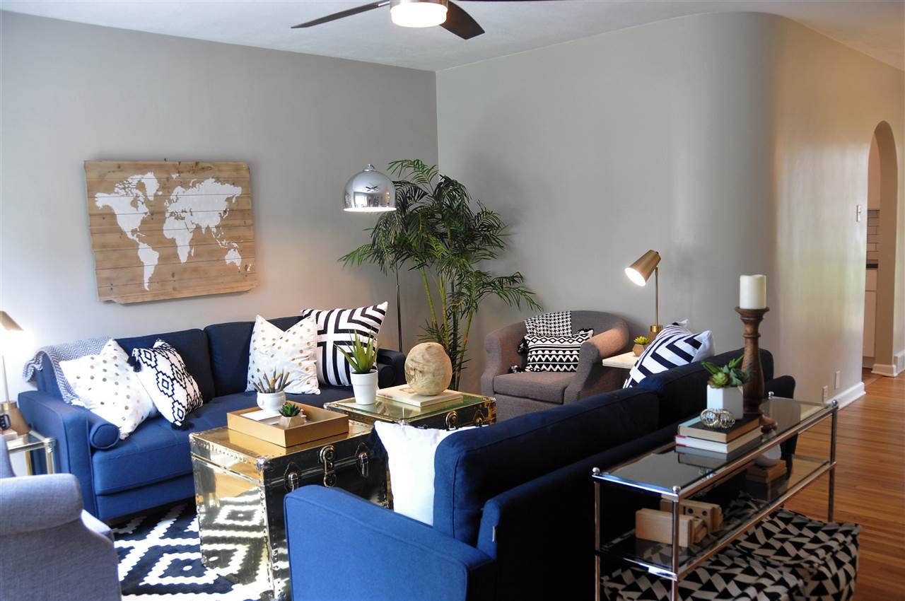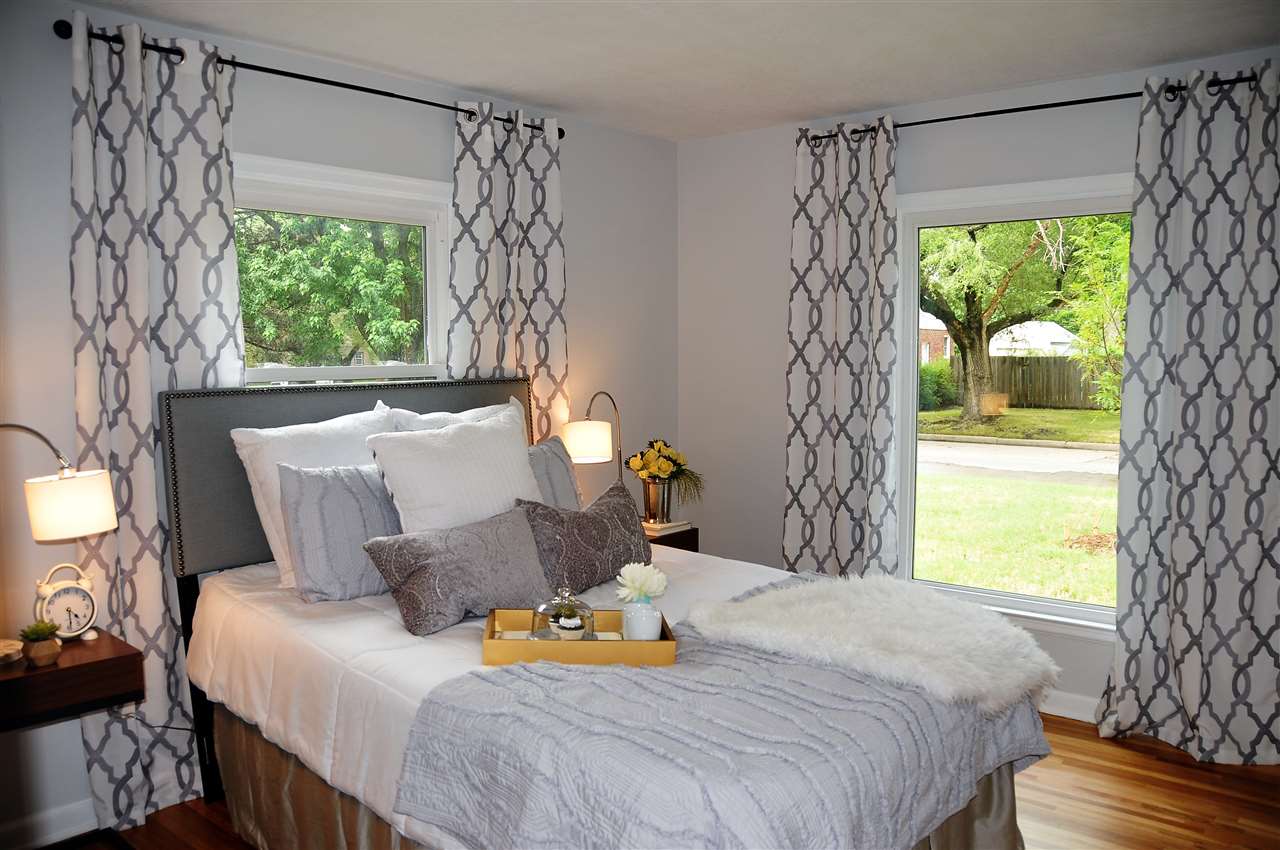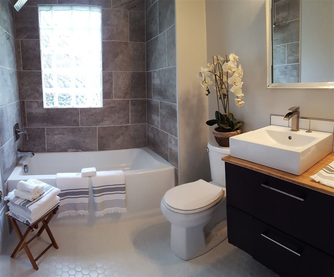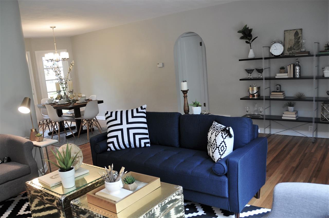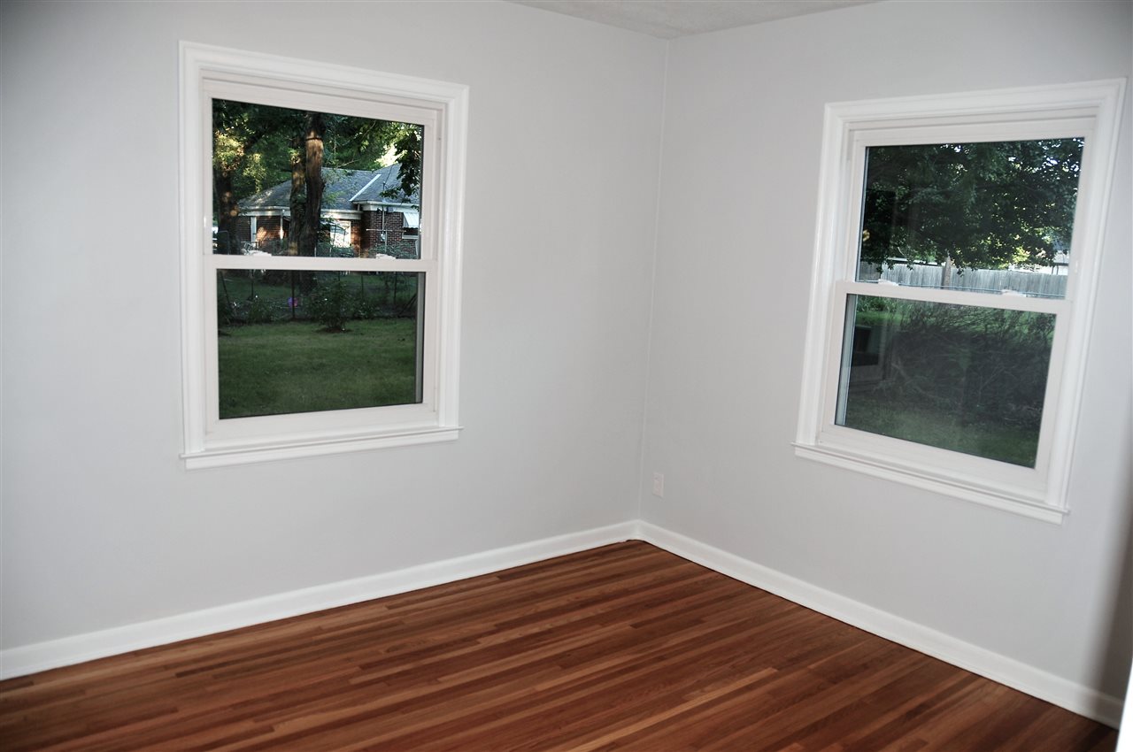 - Description: BEAUTIFULLY updated all brick ranch with unique original touches. Check out the rounded wall in the living room, the arched doorways and the bay window area with door to the backyard. This house started with some fantastic, unique features that have only been enhanced by the tastefully timeless updates. New shaker style, all white cabinets go to the ceiling just as they would have in the original design but have adjustable shelves, soft close hinges and dove tailed drawers. Stylish wood-look tile in the kitchen and breakfast nook is a 21st century upgrade with a nod to the past. The new kitchen floor plan allows for a microwave and dishwasher while still leaving plenty of cabinet and counter top space. The double-in-a-single oven will be appreciated not only for special occasions but for everyday use as the smaller upper oven preheats faster and is of sufficient size for casseroles, cakes and cookie sheets. The bathroom has also been updated with a freestanding vanity from Ikea, over-sized tub and a tile shower. Another nod to the past can be found in the white octagon floor tiles. It all comes together for a functional, attractive bath. Original hardwood floors have been refinished and are spectacular. New windows add to the energy efficiency of the all brick exterior. In the back yard, you'll find a deck surrounded by a nice sized yard with a mixture of new and established landscaping, mature trees and a chain link fence. The basement is waiting to be finished into a spacious living space for the new family. The two car attached garage completes the package. All new gutters are protected by a gutter guard. Show all description