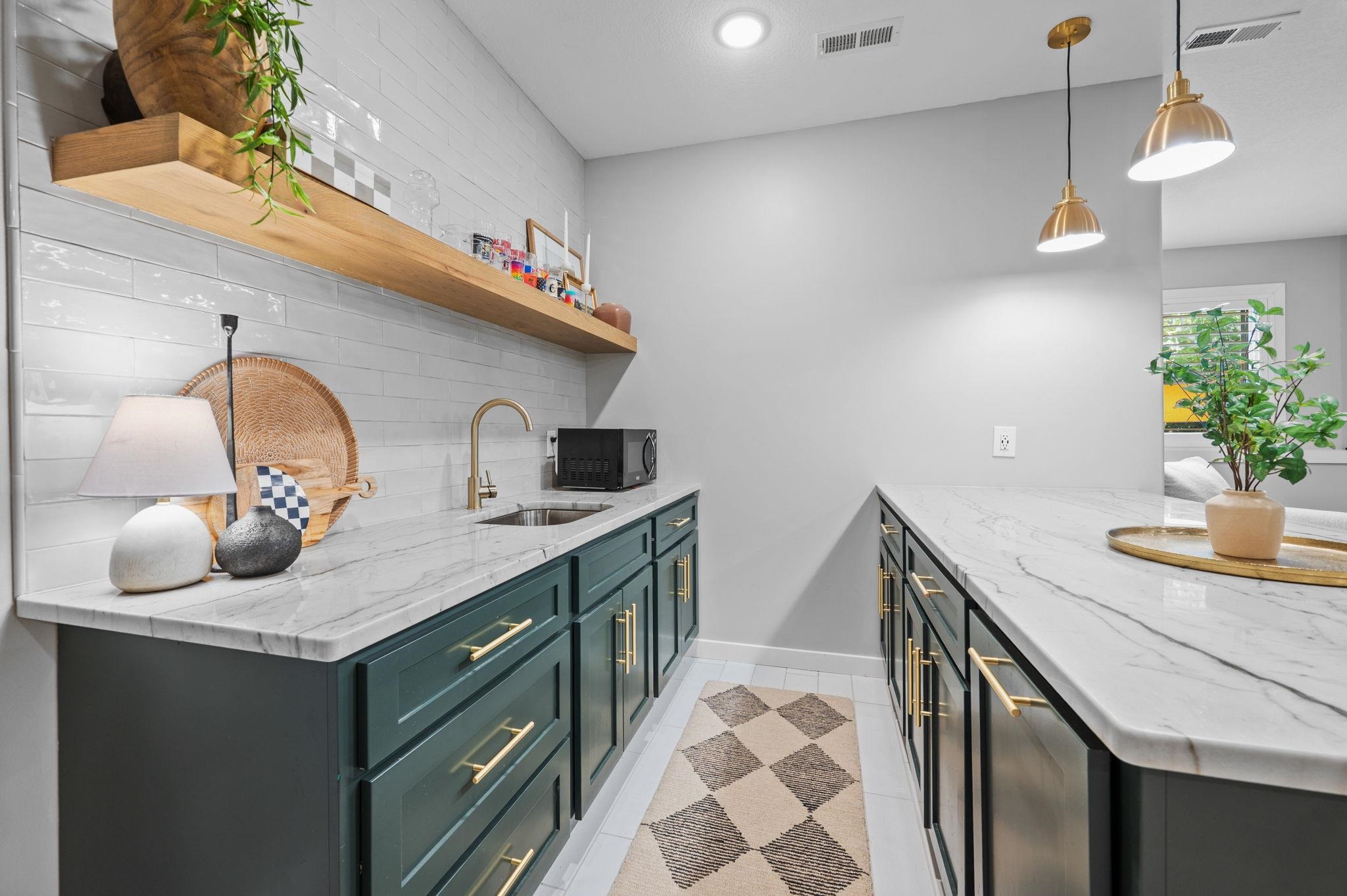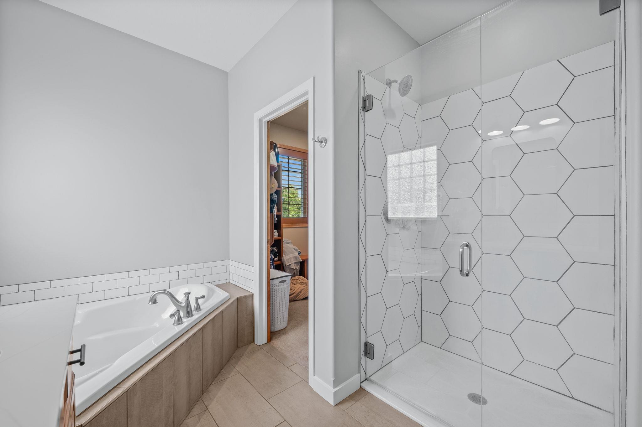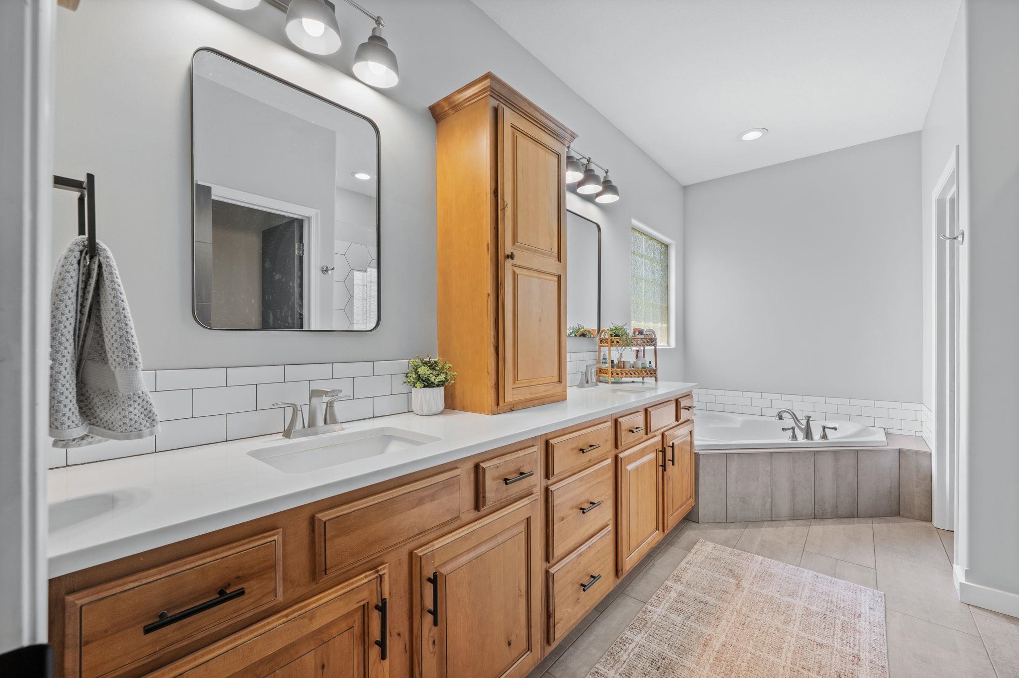 - Master Bedroom: Master Bdrm on Main Level, Split Bedroom Plan, Tub/Shower/Master Bdrm, Two Sinks, Quartz Counters