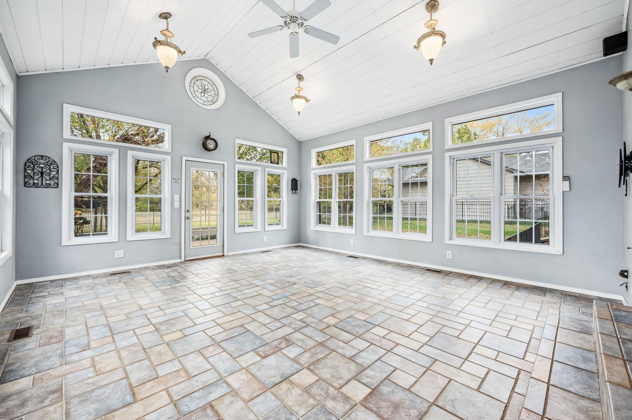 - Description: Pristine condition, move right in. Many updates including kitchen with lots of pull out shelves and newer appliances, ceramic tile flooring in kitchen, walkways and hallway. This house has LOTS of extra storage space, the kitchen is huge and has more storage than you will find in most kitchens, PLUS TWO storage rooms in the basement! Oversized garage and extra parking pad on side of house. A terrific, must see, SUNROOM with windows galore. Neighborhood swimming pool, close to lots of good shopping and dining. Show all description