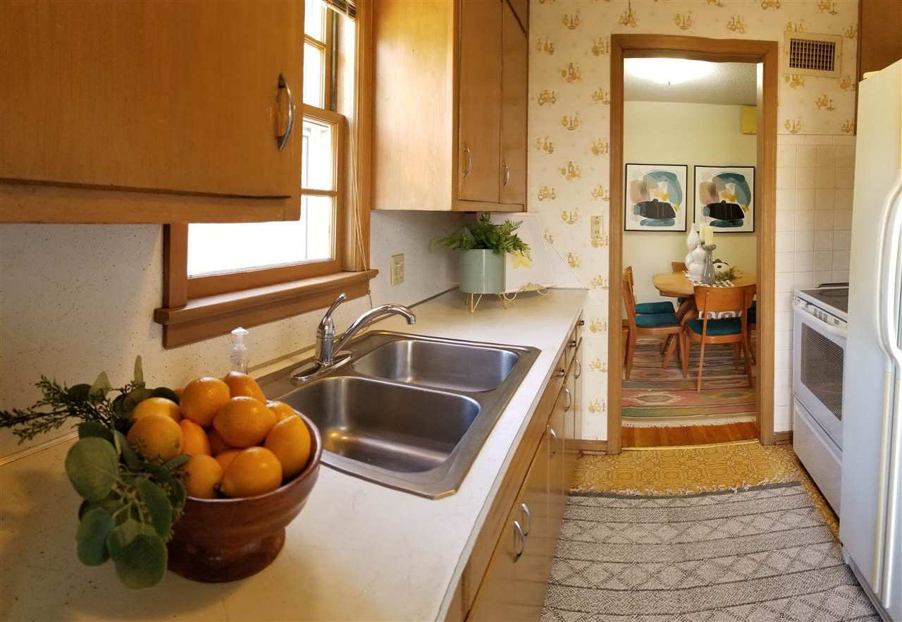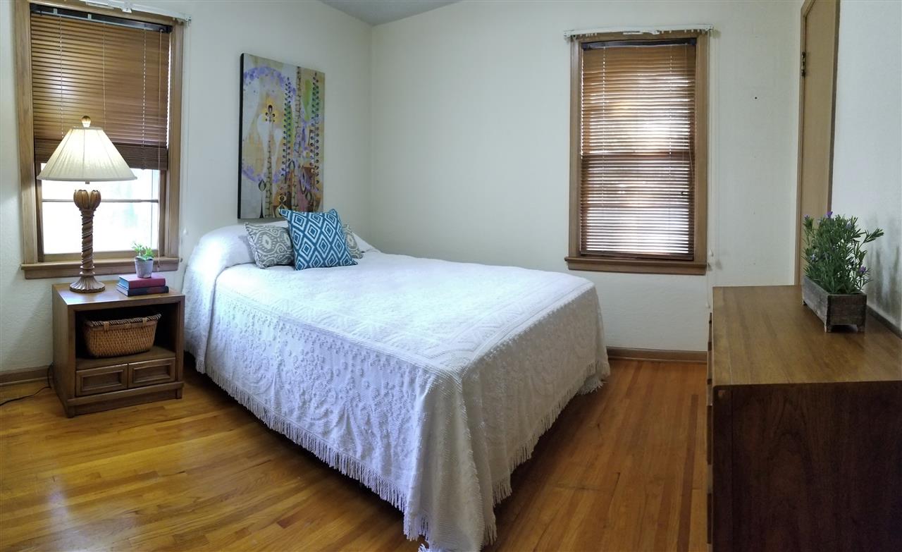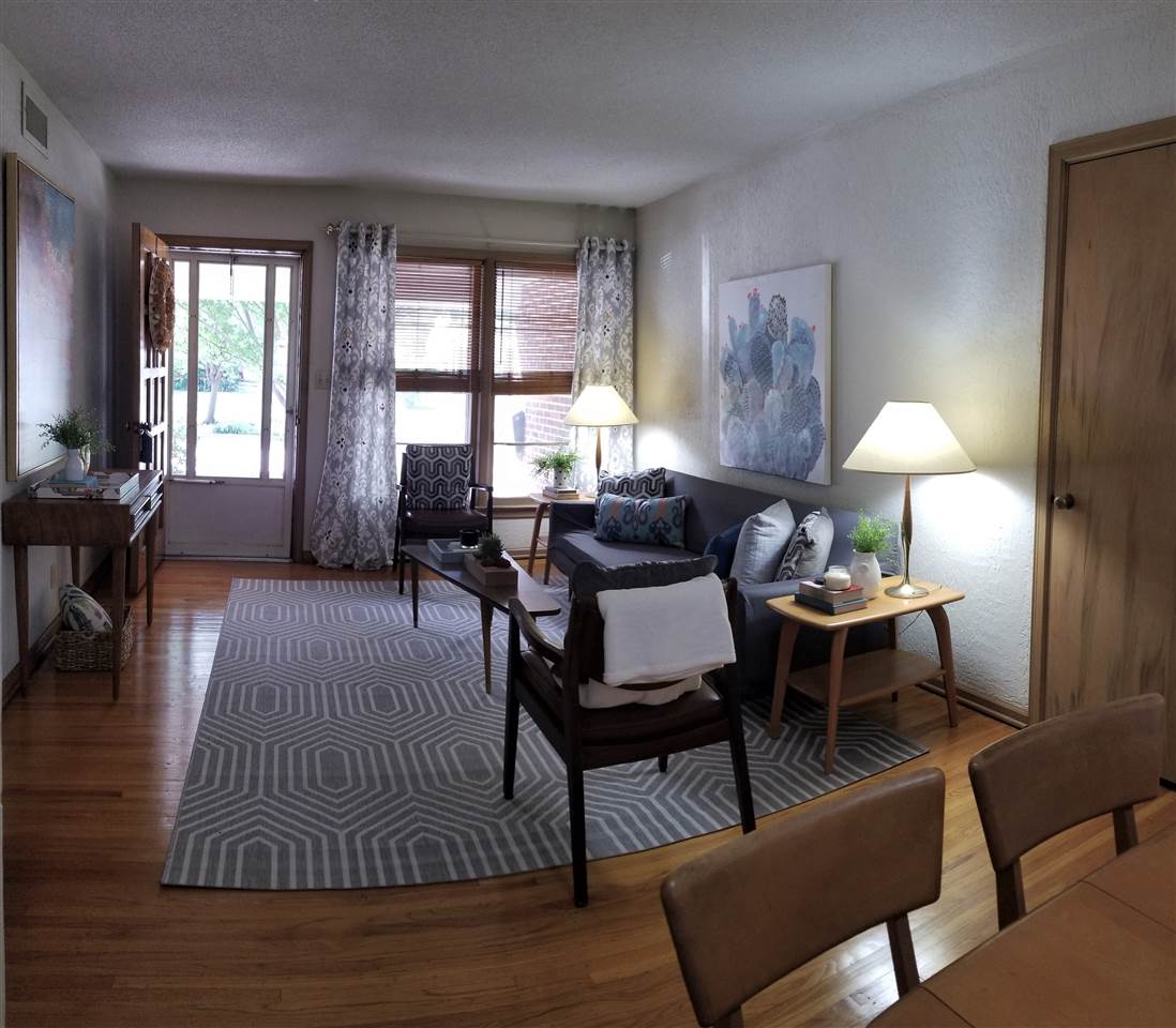 - Description: Adorable, move in ready, two bedroom, one bath, one car attached garage, all brick ranch home on a corner lot. Pretty much sums it up but there is more. Covered front porch, screened in back patio, a work shop style shed plus a gardening shed in the back yard with a potting bench on the south side. Mature landscaping with new Bermuda sod in most of the backyard. Hardwood floors in the living room, dining room and bedrooms. Full basement with built in bar, and book shelves in the finished family room. Additional finished room. Laundry is in the basement with a chute from the bathroom. Washer, dryer, refrigerator, stove and microwave all stay with the house. Curtains do not transfer but the blinds do. Show all description