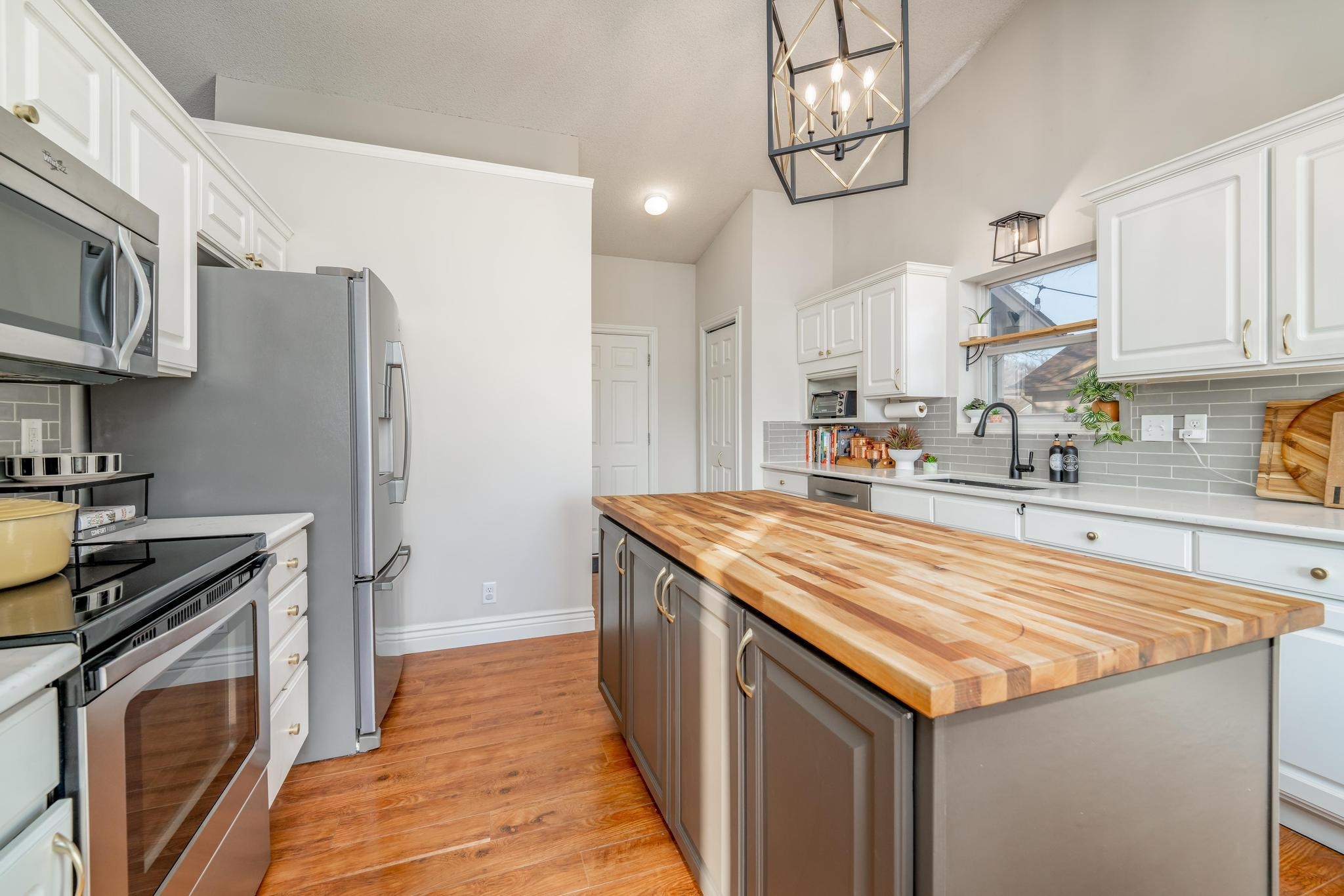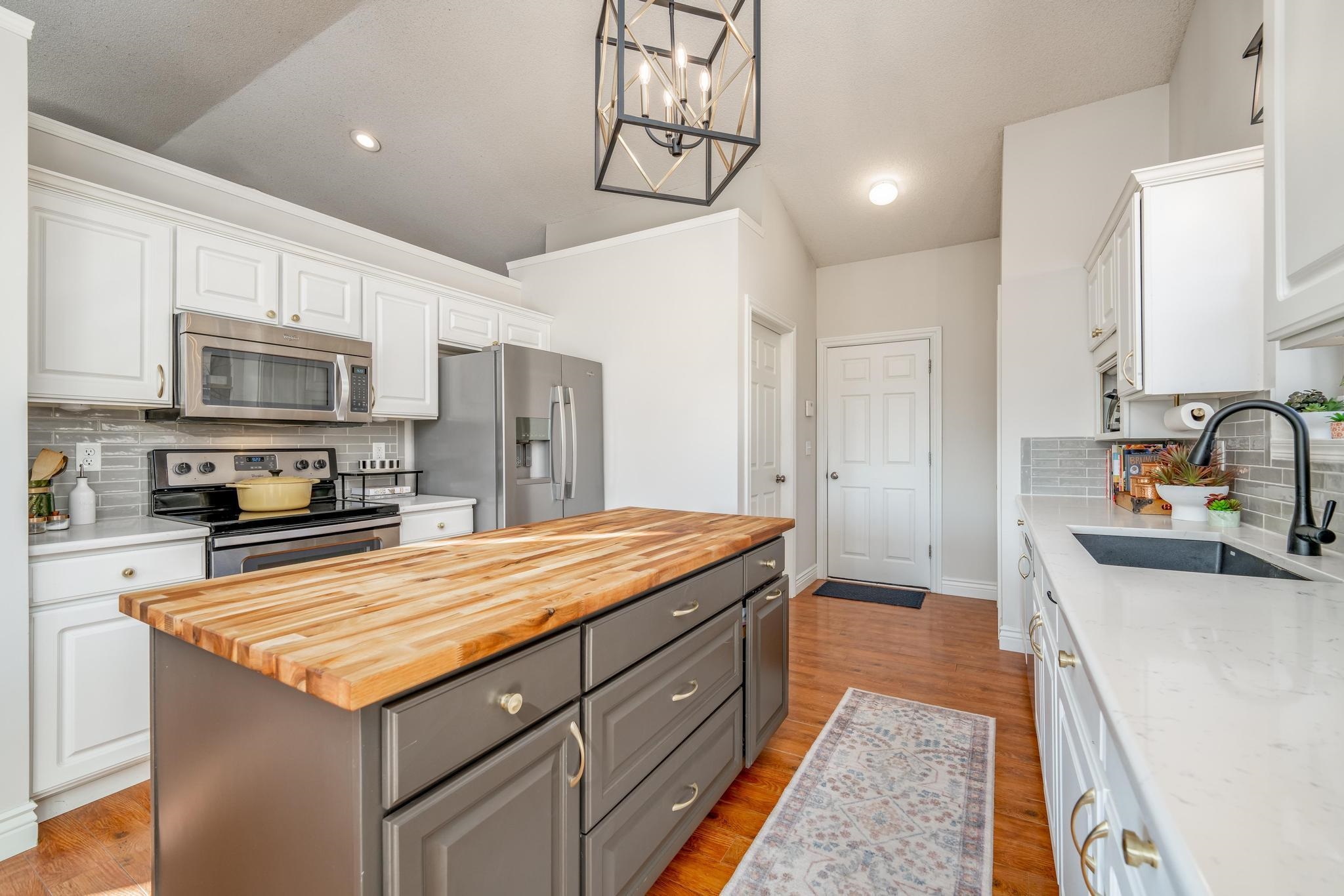 - Description: Location, location, location! This beautiful move-in ready home is located on 21st street between Greenwich and Webb. The location is prime as convenience is minutes away in every direction: shopping, dining, grocery stores, private & parochial schools, K-96 highway, jogging paths, and more! The home is located at the end of a cul-de-sac creating a quiet and private street. The house has been completely remodeled both interior and exterior with a long list of upgrades: roof was replaced in 2018, exterior freshly repainted, new air conditioning unit, and new hot water heater! As you enter the foyer you’ll be greeted with new interior paint, updated lighting, new trim work, a beautiful gas fireplace, and large living room. The floorplan is fantastic offering three bedrooms, two full bathrooms, a separate room for laundry all on the main level! The kitchen has been remodeled with quartz countertops, tile backsplash, stainless steel appliances including a new dishwasher (all appliances convey), a custom island with a wood countertop, and a large dining area that has ample space for a coffee bar and buffet table. The primary suite is large and offers an excellent primary bath that has new quartz countertops with two sinks, a bathtub, shower, and separate water closet for toilet. The basement is A+ with a huge kitchen that creates a secondary living space in the basement for family members, roommates, older children, or fantastic hosting! The basement has one bedroom, one full bathroom, an additional room that could be a fifth non-conforming bedroom, and ample storage space! The three-car garage is partially insulated and functions as both a garage space and partial gym. Enjoy summer evenings with an east face irrigated backyard and huge wrap around deck! This beautiful home is move-in ready offering ease and convenience in both living and location! Hurry and schedule your showing today as this house will not last long on the market! Show all description