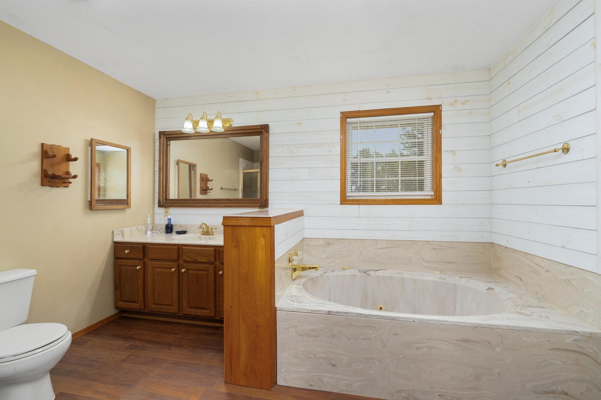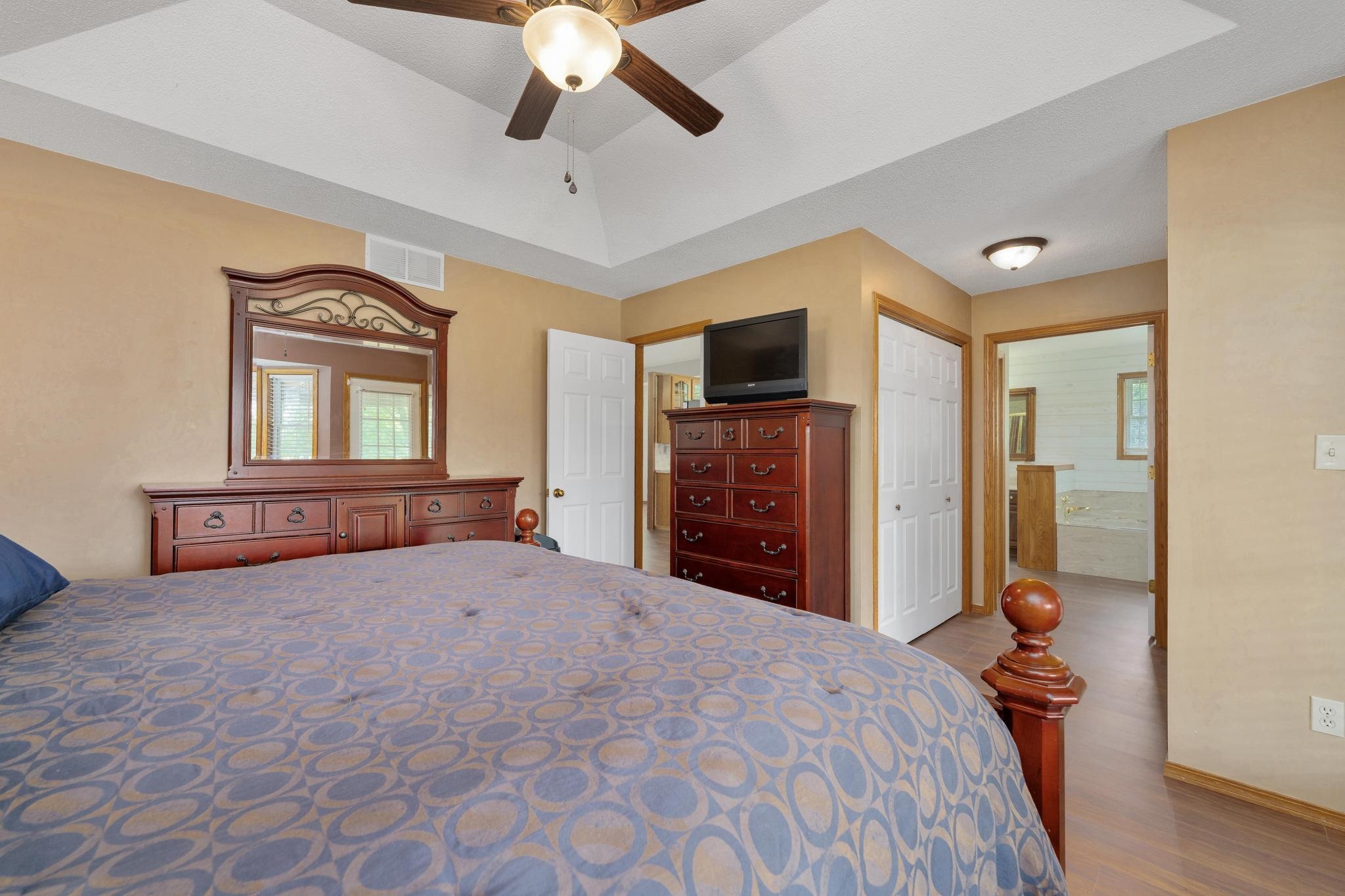 - Master Bedroom: Master Bdrm on Main Level, Split Bedroom Plan, Tub/Shower/Master Bdrm, Two Sinks, Laminate Counters, Jetted Tub