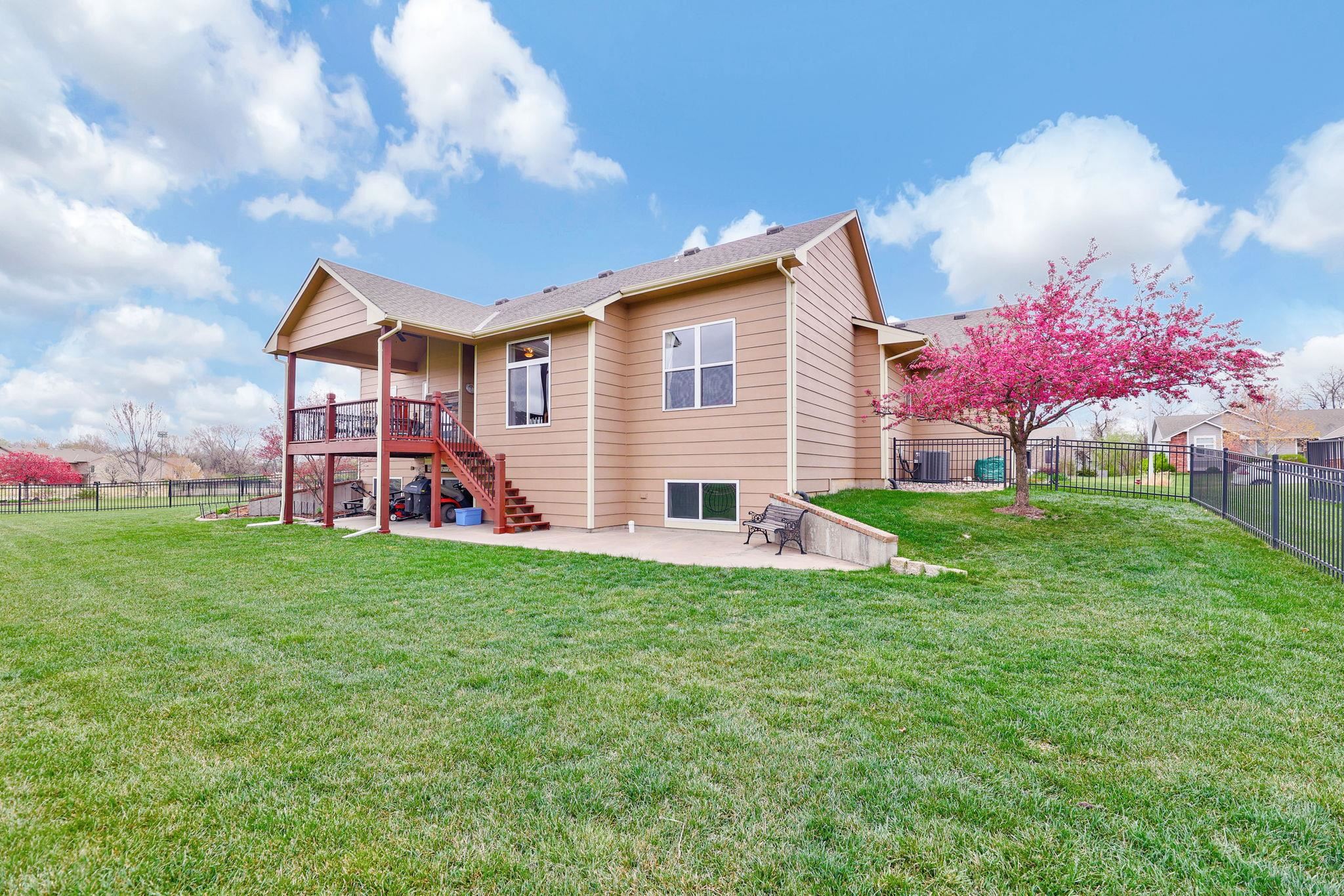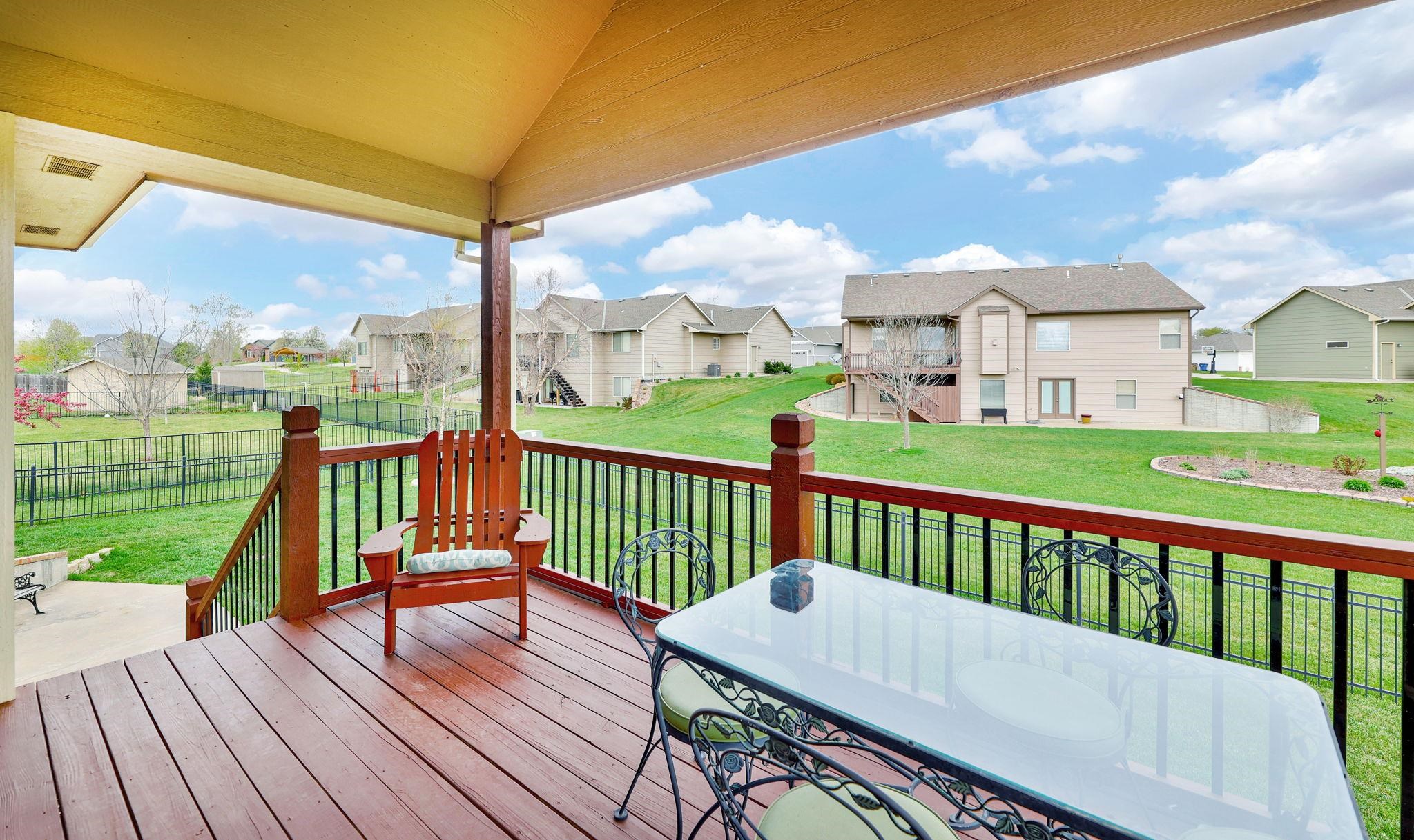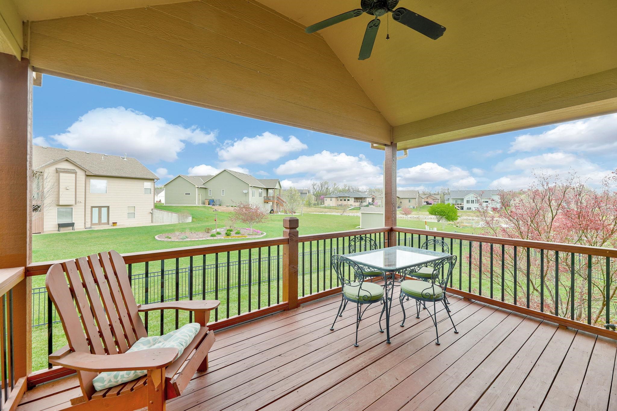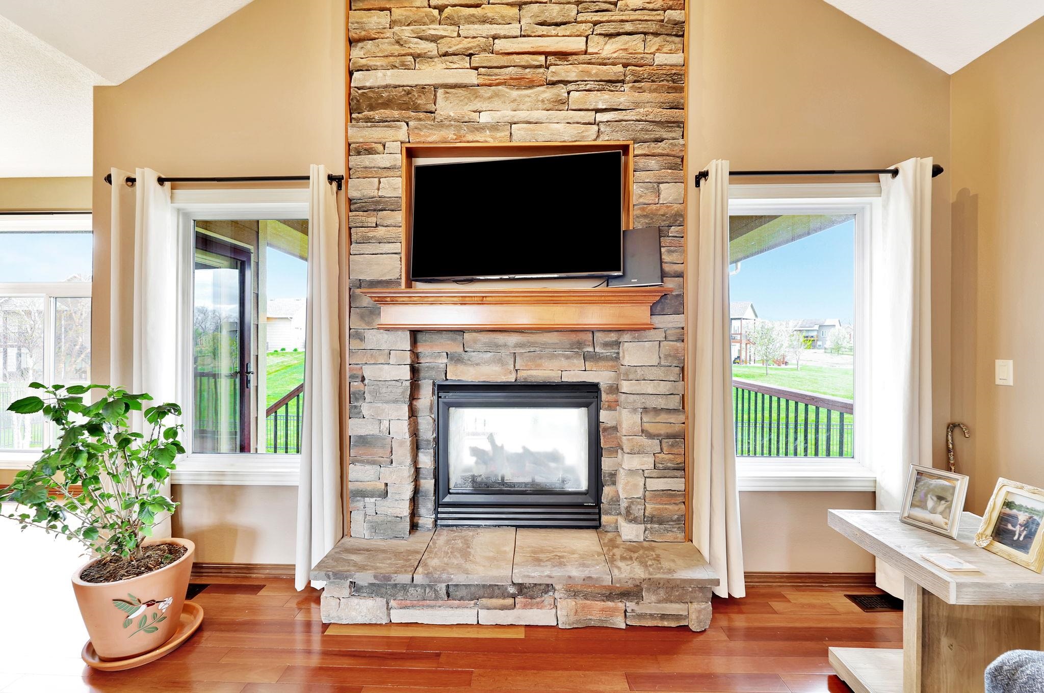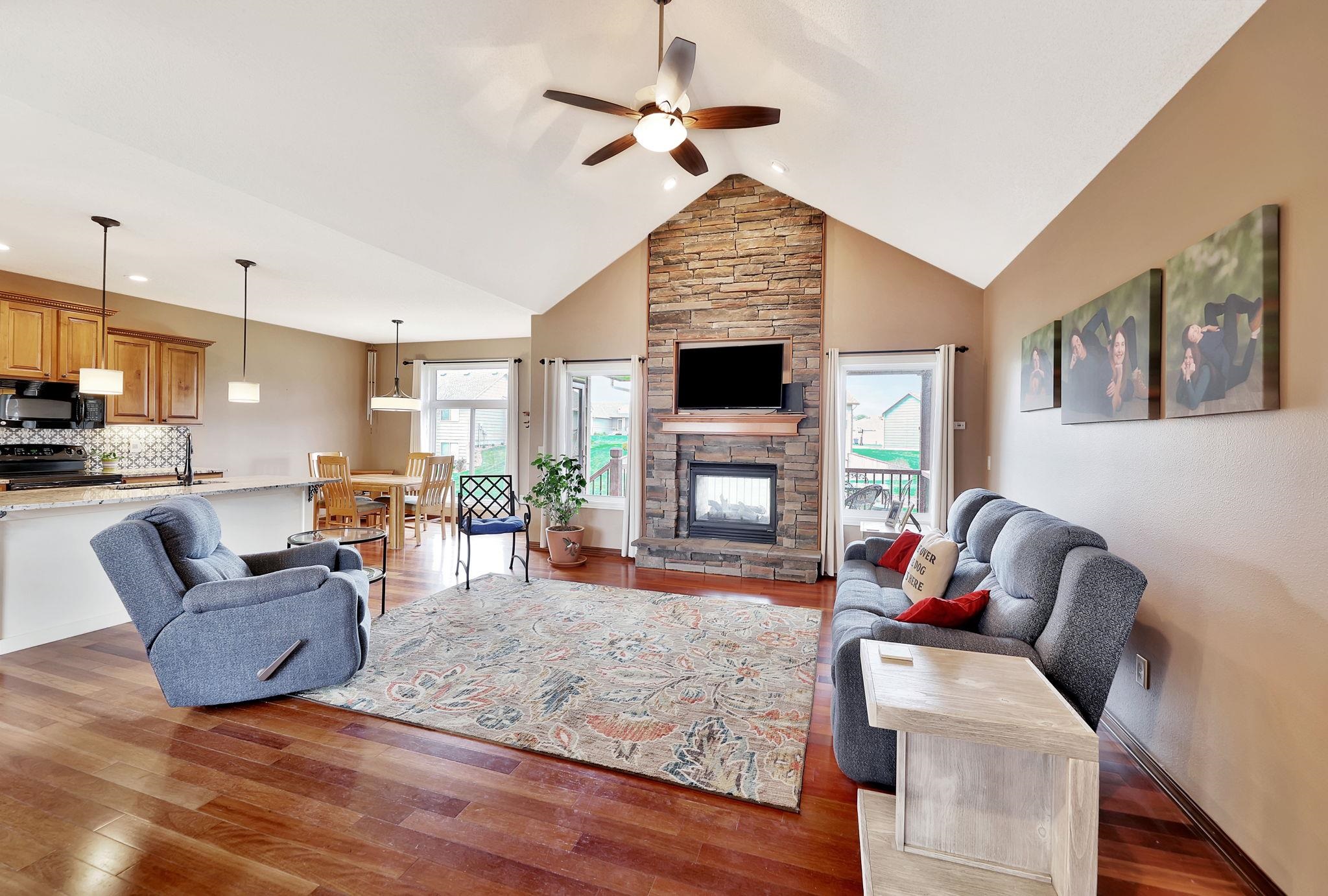 - Description: Walk into your new home and into an incredible open floor plan with SIX bedrooms! The large living room features a super high vaulted ceiling, wood floors and a two-sided fireplace with stone to the ceiling! The open kitchen features maple cabinetry, a large island with granite, appliances which will stay with the home and a walk-in pantry! The dining room has large windows to take in the outdoor view. The entertaining space continues onto the covered deck with the second side of the fireplace! The primary bedroom features a tray ceiling with wood trim and lighting, plus oversized windows. The en-suite bath features double sinks with granite, bathtub, a large walk-in tile shower and a huge walk-in closet! There are two more bedrooms and another bath on the main floor of this split bedroom plan. Down the stairs to the lower level is a great rec room with view-out windows and a wet-bar rough in. There are 3 more finished bedrooms in the lower level providing options for sleeping or working or whatever you need! The backyard is fully fenced with wrought iron and continues past the fence and has a view of the lake! New HVAC in 2024. Show all description