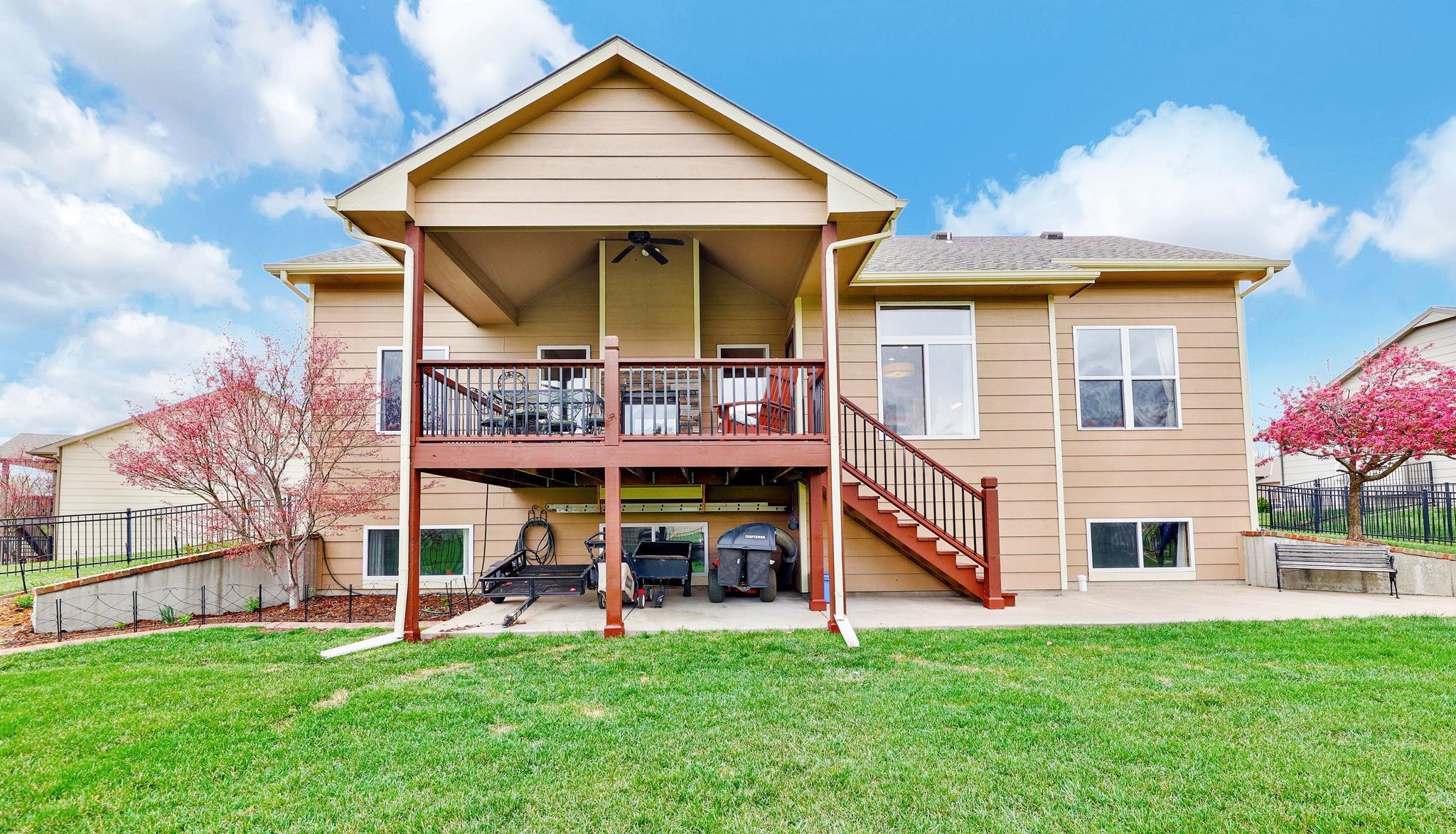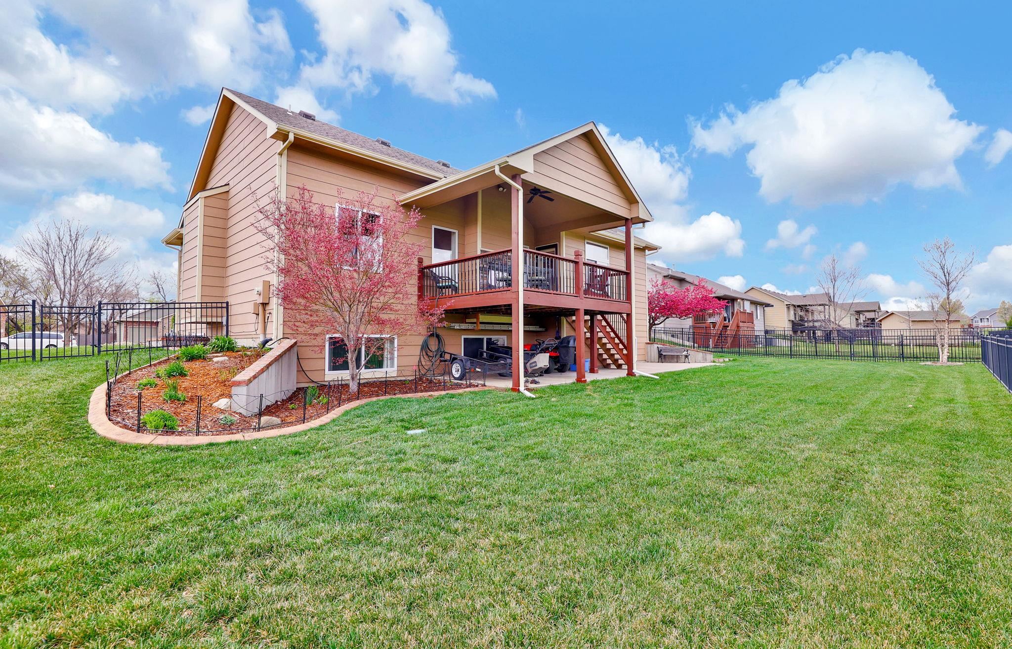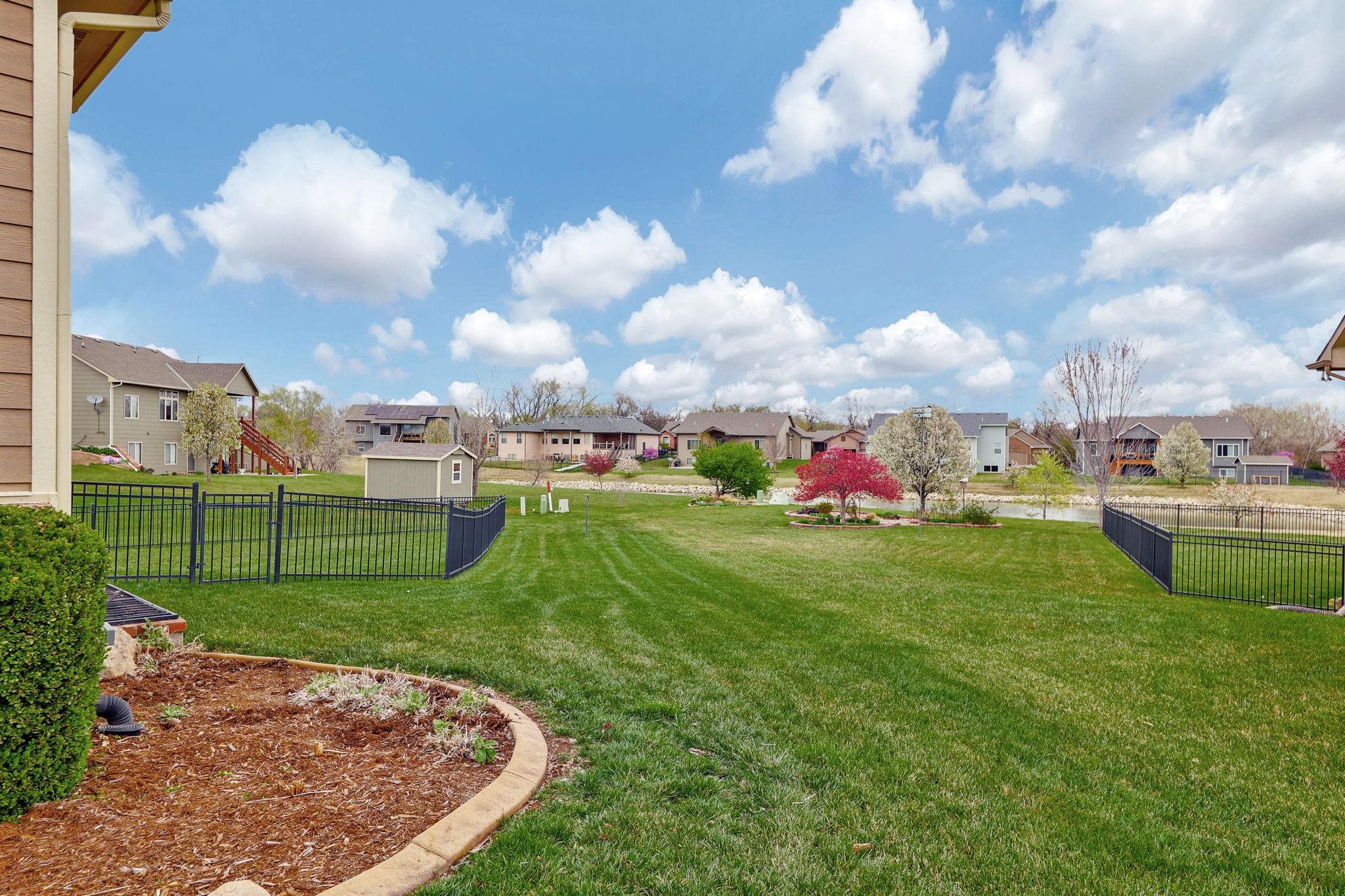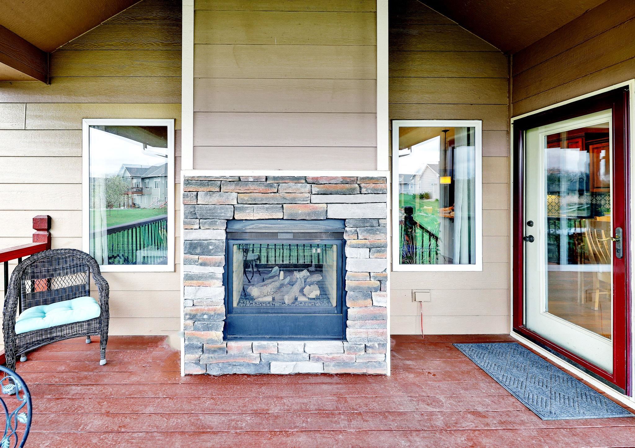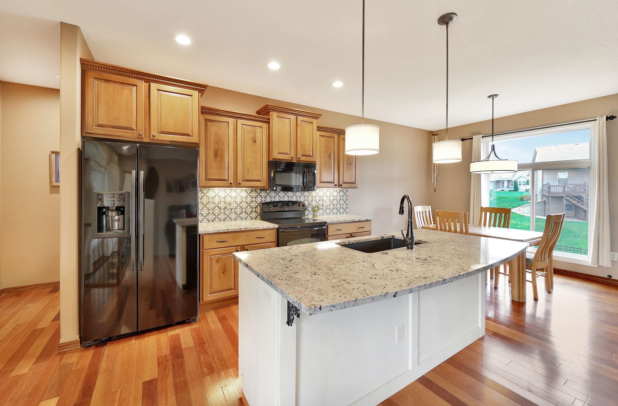 - Description: Walk into your new home and into an incredible open floor plan with SIX bedrooms! The large living room features a super high vaulted ceiling, wood floors and a two-sided fireplace with stone to the ceiling! The open kitchen features maple cabinetry, a large island with granite, appliances which will stay with the home and a walk-in pantry! The dining room has large windows to take in the outdoor view. The entertaining space continues onto the covered deck with the second side of the fireplace! The primary bedroom features a tray ceiling with wood trim and lighting, plus oversized windows. The en-suite bath features double sinks with granite, bathtub, a large walk-in tile shower and a huge walk-in closet! There are two more bedrooms and another bath on the main floor of this split bedroom plan. Down the stairs to the lower level is a great rec room with view-out windows and a wet-bar rough in. There are 3 more finished bedrooms in the lower level providing options for sleeping or working or whatever you need! The backyard is fully fenced with wrought iron and continues past the fence and has a view of the lake! New HVAC in 2024. Show all description