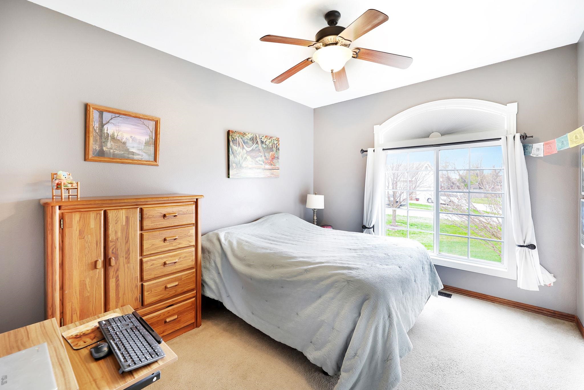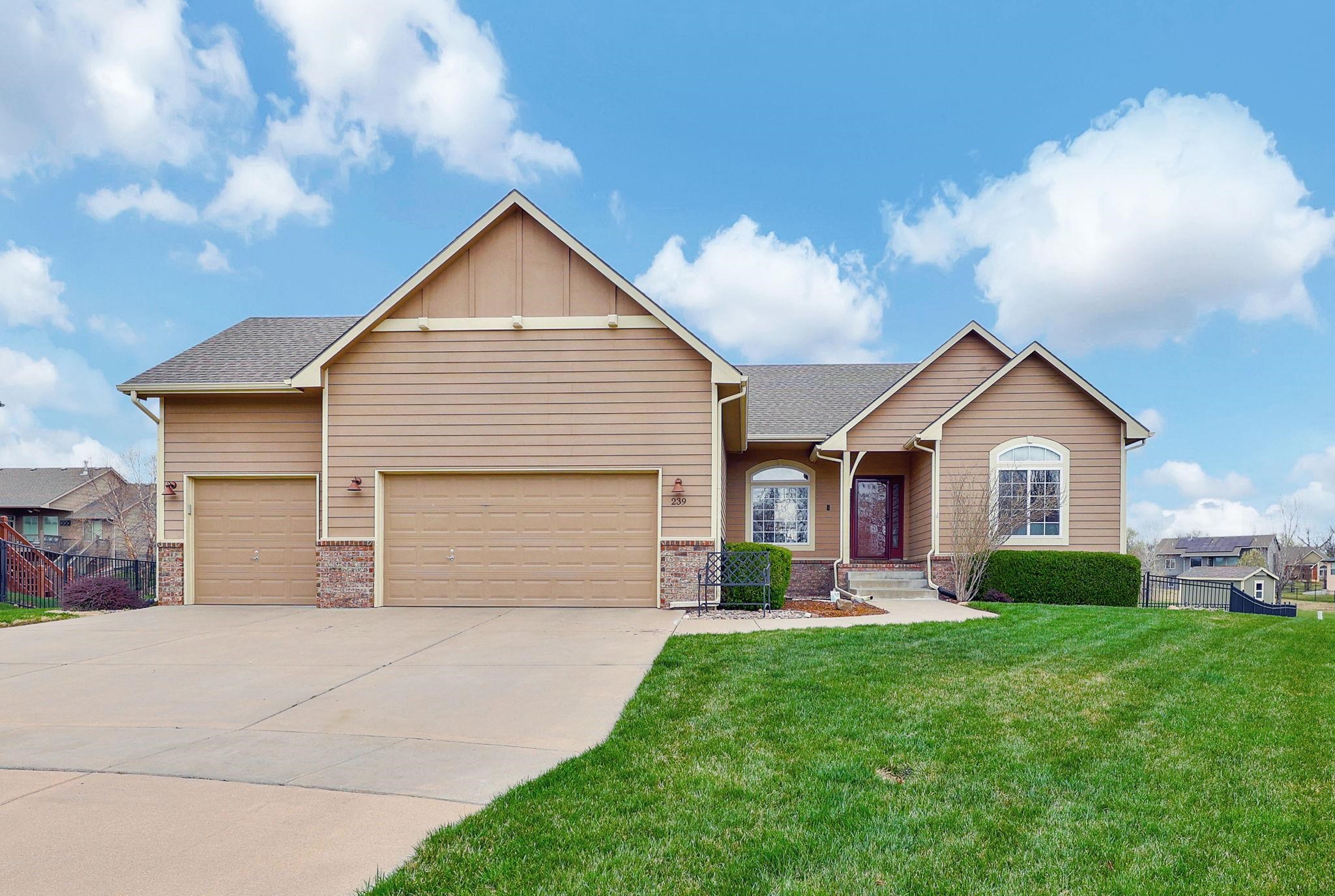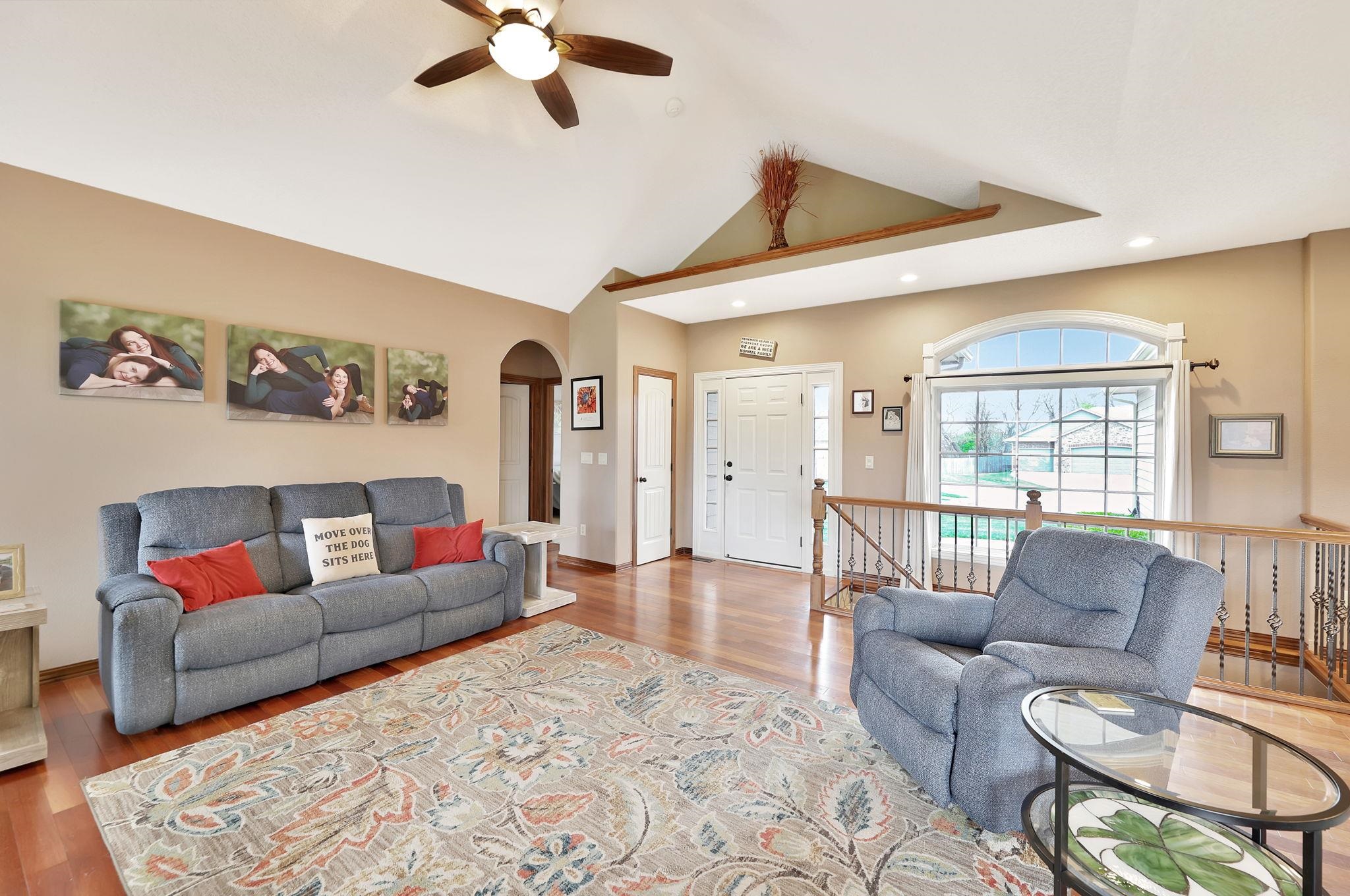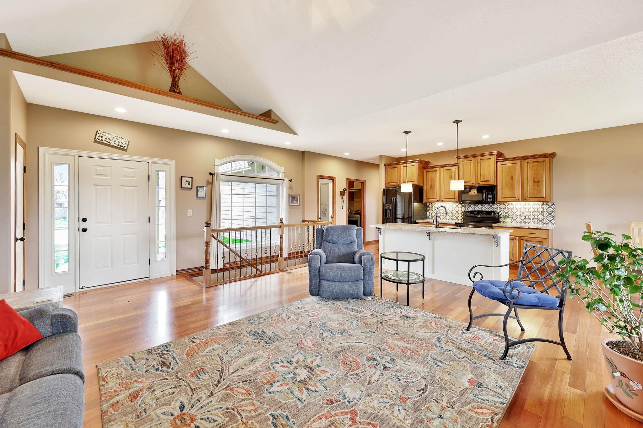 - Description: Walk into your new home and into an incredible open floor plan with SIX bedrooms! The large living room features a super high vaulted ceiling, wood floors and a two-sided fireplace with stone to the ceiling! The open kitchen features maple cabinetry, a large island with granite, appliances which will stay with the home and a walk-in pantry! The dining room has large windows to take in the outdoor view. The entertaining space continues onto the covered deck with the second side of the fireplace! The primary bedroom features a tray ceiling with wood trim and lighting, plus oversized windows. The en-suite bath features double sinks with granite, bathtub, a large walk-in tile shower and a huge walk-in closet! There are two more bedrooms and another bath on the main floor of this split bedroom plan. Down the stairs to the lower level is a great rec room with view-out windows and a wet-bar rough in. There are 3 more finished bedrooms in the lower level providing options for sleeping or working or whatever you need! The backyard is fully fenced with wrought iron and continues past the fence and has a view of the lake! New HVAC in 2024. Show all description