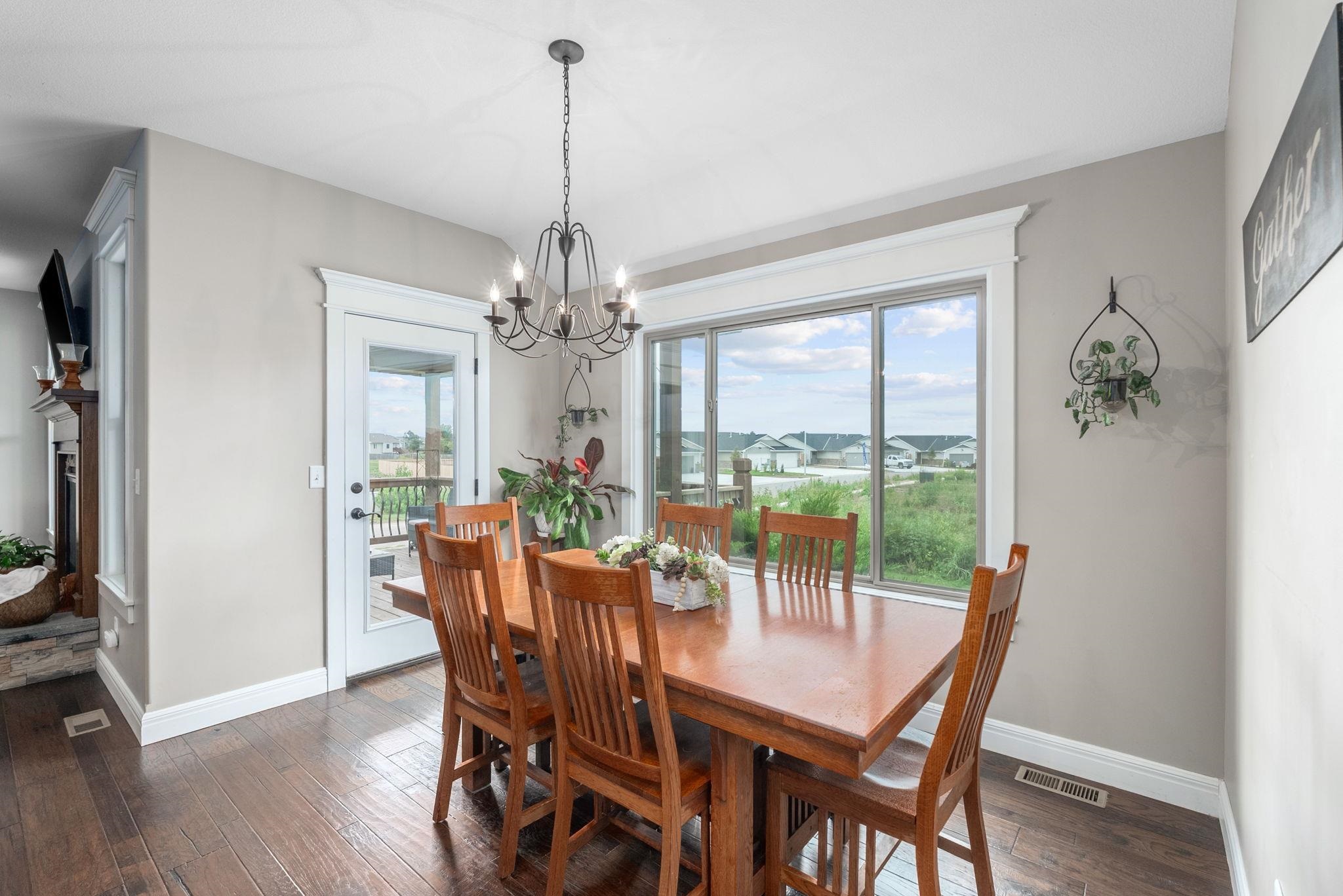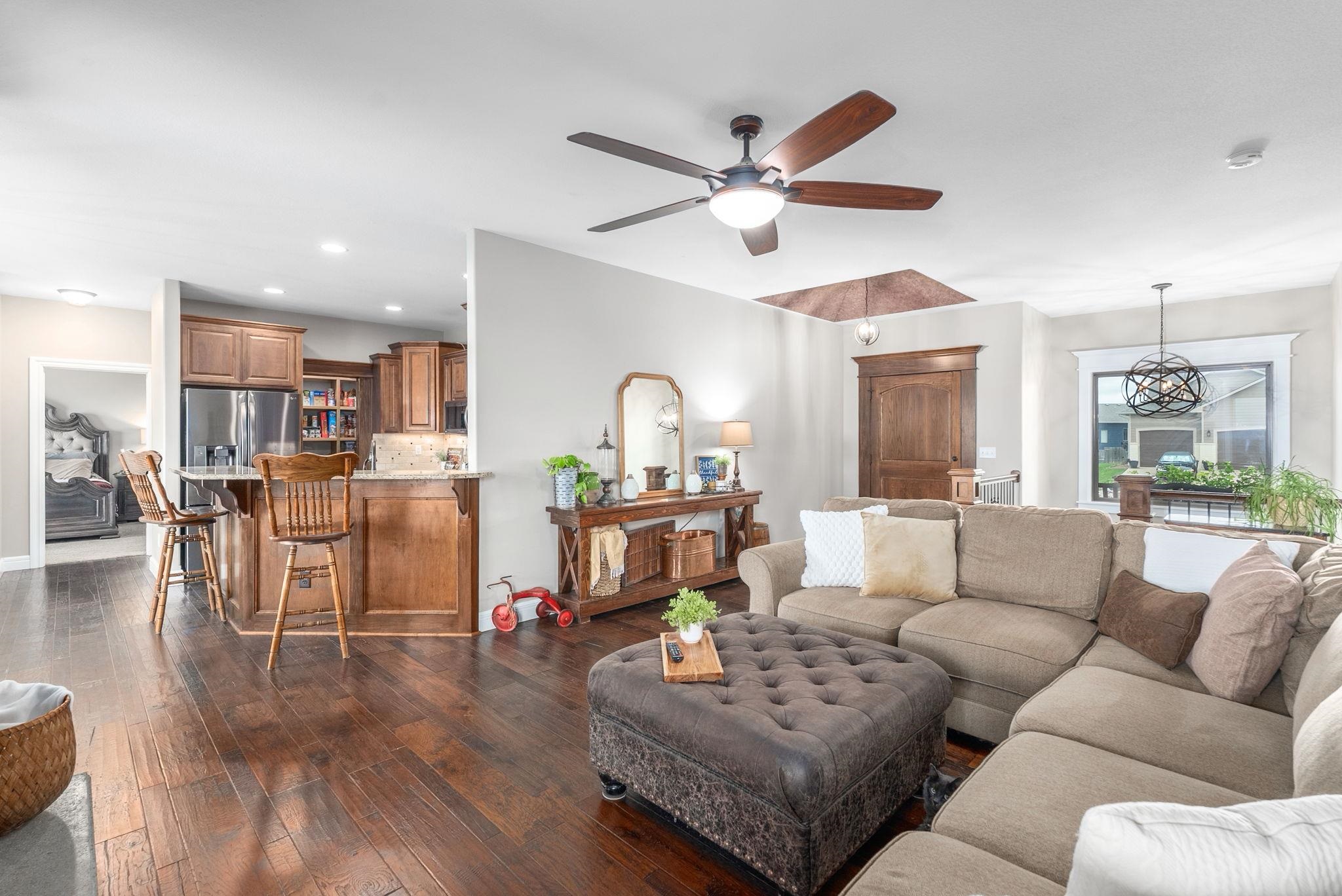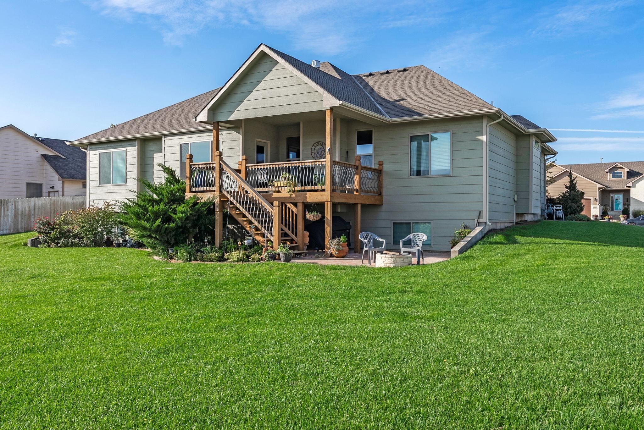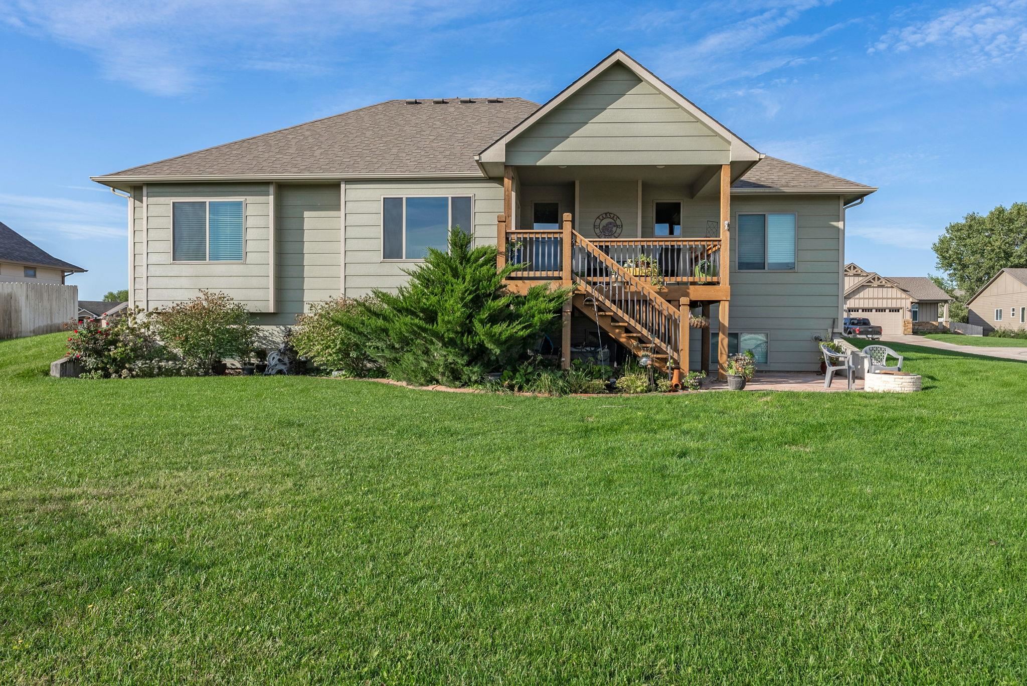 - Description: Welcome to this immaculate 5 bedroom/3 bath/3 car custom ranch situated on a spacious corner lot in the desirable Goddard school district. Pride of ownership shows throughout this beautifully maintained home, inside and out. From the moment you arrive, you’ll appreciate the gorgeous landscaping, curbed flower beds, inviting covered front porch, and overall curb appeal. Step inside to find an open floor plan filled with thoughtful details, including hardwood flooring, bullnose corners, paneled doors, oversized window casings, and upgraded finishes. The living room offers a stone-faced electric fireplace, large windows that flood the space with natural light, and a coffered entry ceiling for a touch of elegance. The kitchen impresses with granite countertops, stainless steel appliances, an under-mount sink, and a generous walk-in pantry, while the adjoining dining area overlooks the backyard and large covered deck. The primary suite is a retreat, featuring two closets, a coffered ceiling, and a spa-like bath with dual vanities, granite counters, tiled flooring, and a walk-in shower with a granite seat. Just off the suite, the laundry room provides a wash sink and convenient access to both the primary closet and the drop zone from the garage. The oversized garage - with its extra-tall doors - offers ample storage and workspace. Two additional main floor bedrooms and a full hall bath with upgraded finishes complete the main level. The view-out basement expands your living space with a large family and rec room, high-end wet bar with leathered granite countertops, pellet stove, and space for a pool table or game area. Also downstairs are two more bedrooms with walk-in closets, another full bath with dual vanities and quality finishes, under-stairs storage, and a dedicated storage room. Mechanical upgrades include a tankless water heater, Delta faucets throughout, and a high-efficiency HVAC system. Outside, enjoy a lush partially fenced yard with an irrigation well, sprinkler system, firepit, curved rear patio, and a large covered deck for relaxing or entertaining. Tucked in a quiet neighborhood with quick access to Kellogg, Goddard, and all that west Wichita has to offer, this home is move-in ready and waiting for you. Schedule your showing today - and don’t miss the promo video for additional views! Show all description