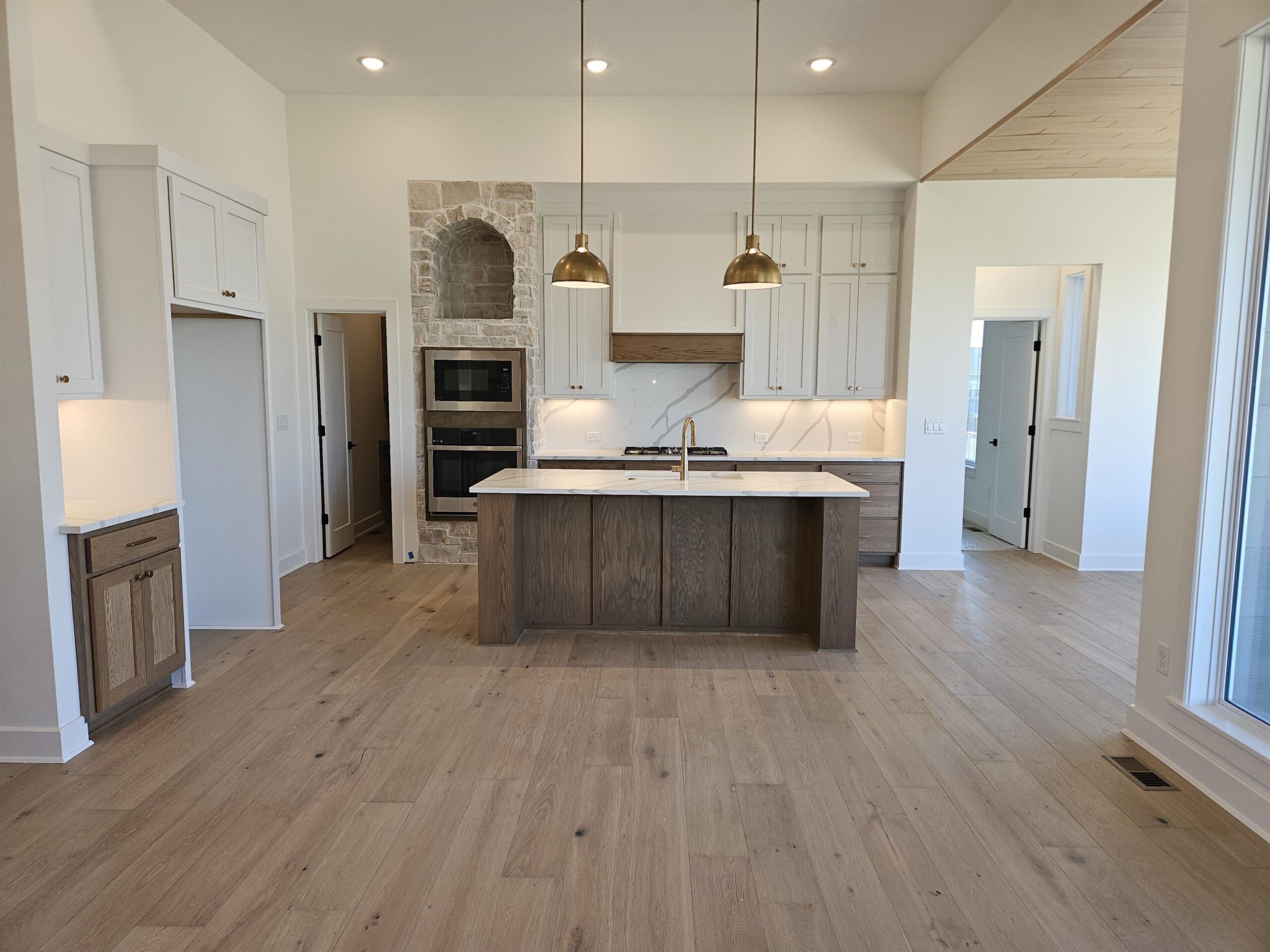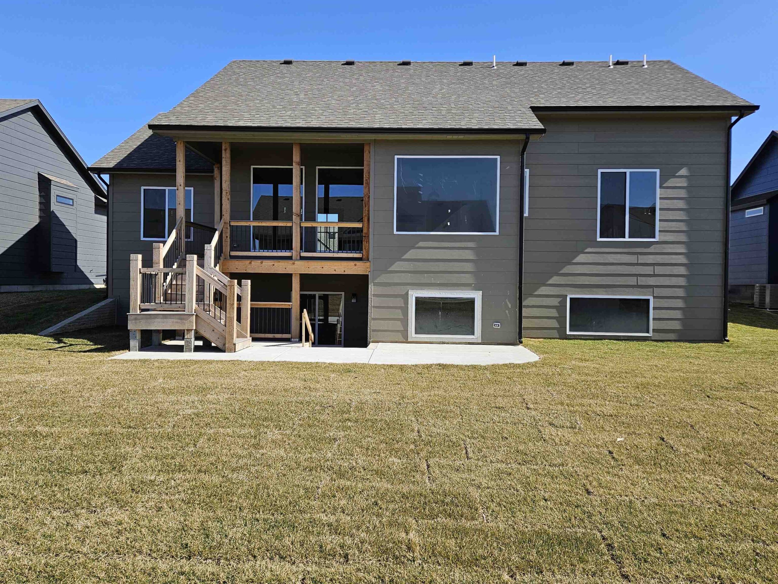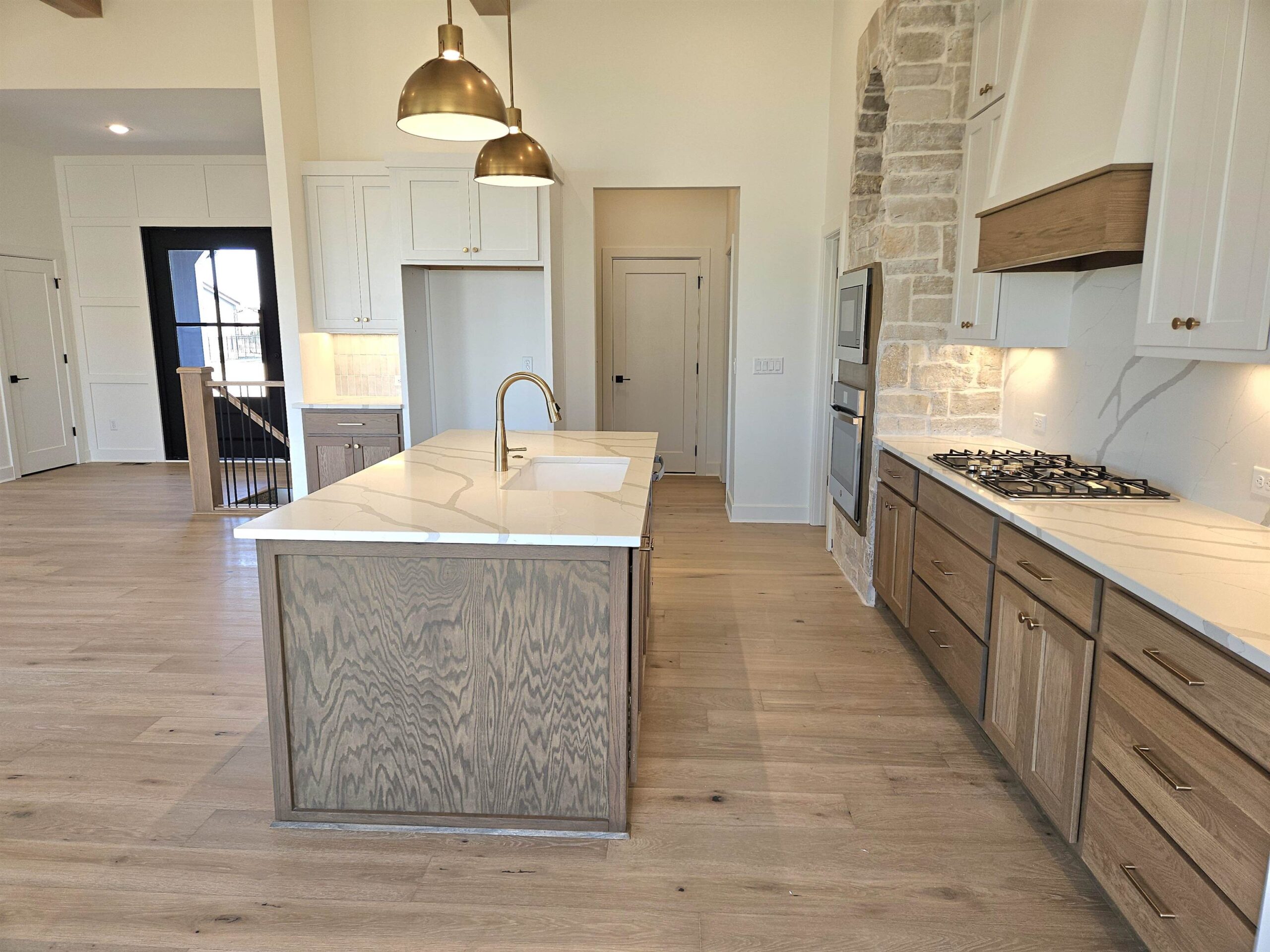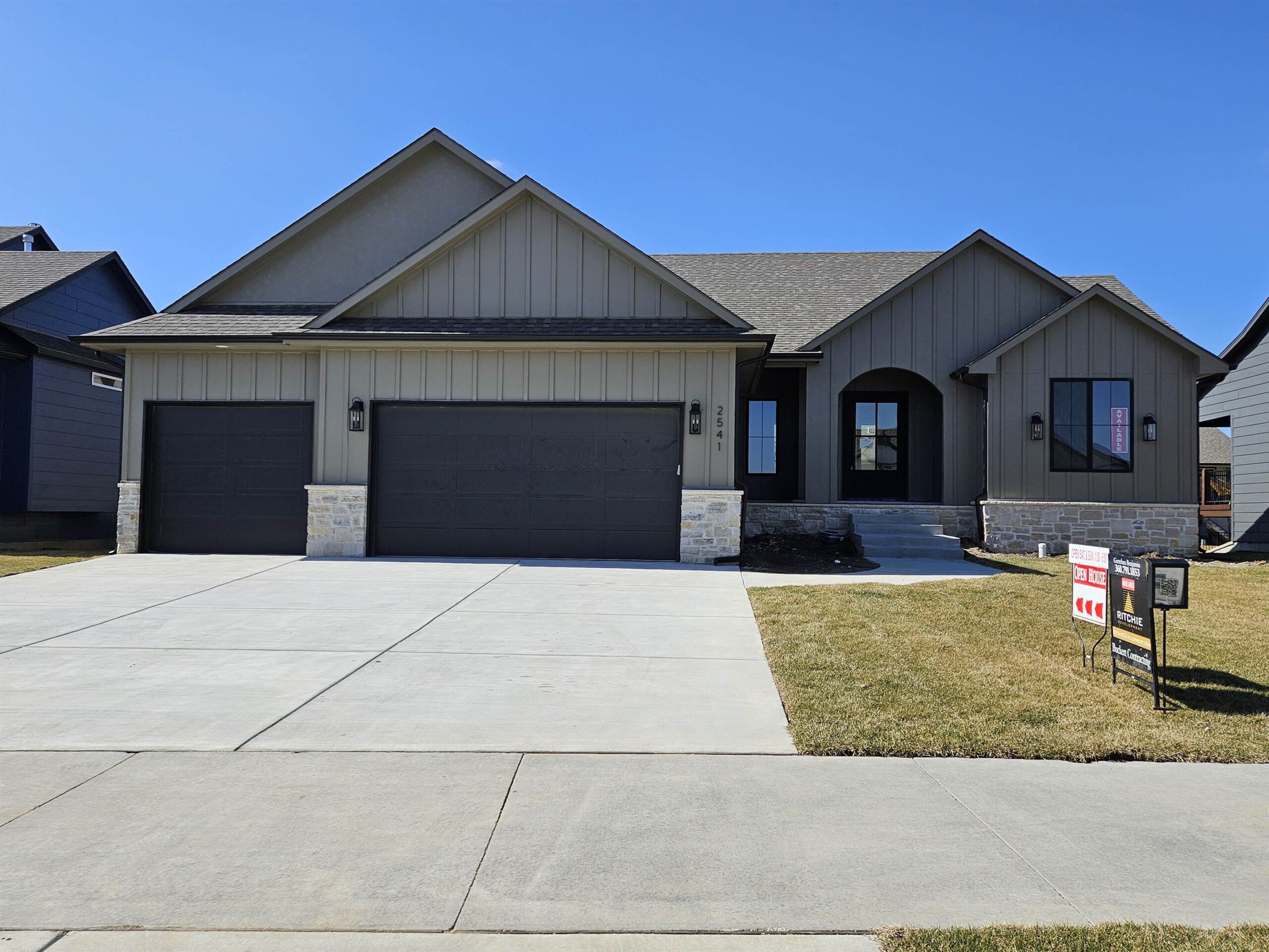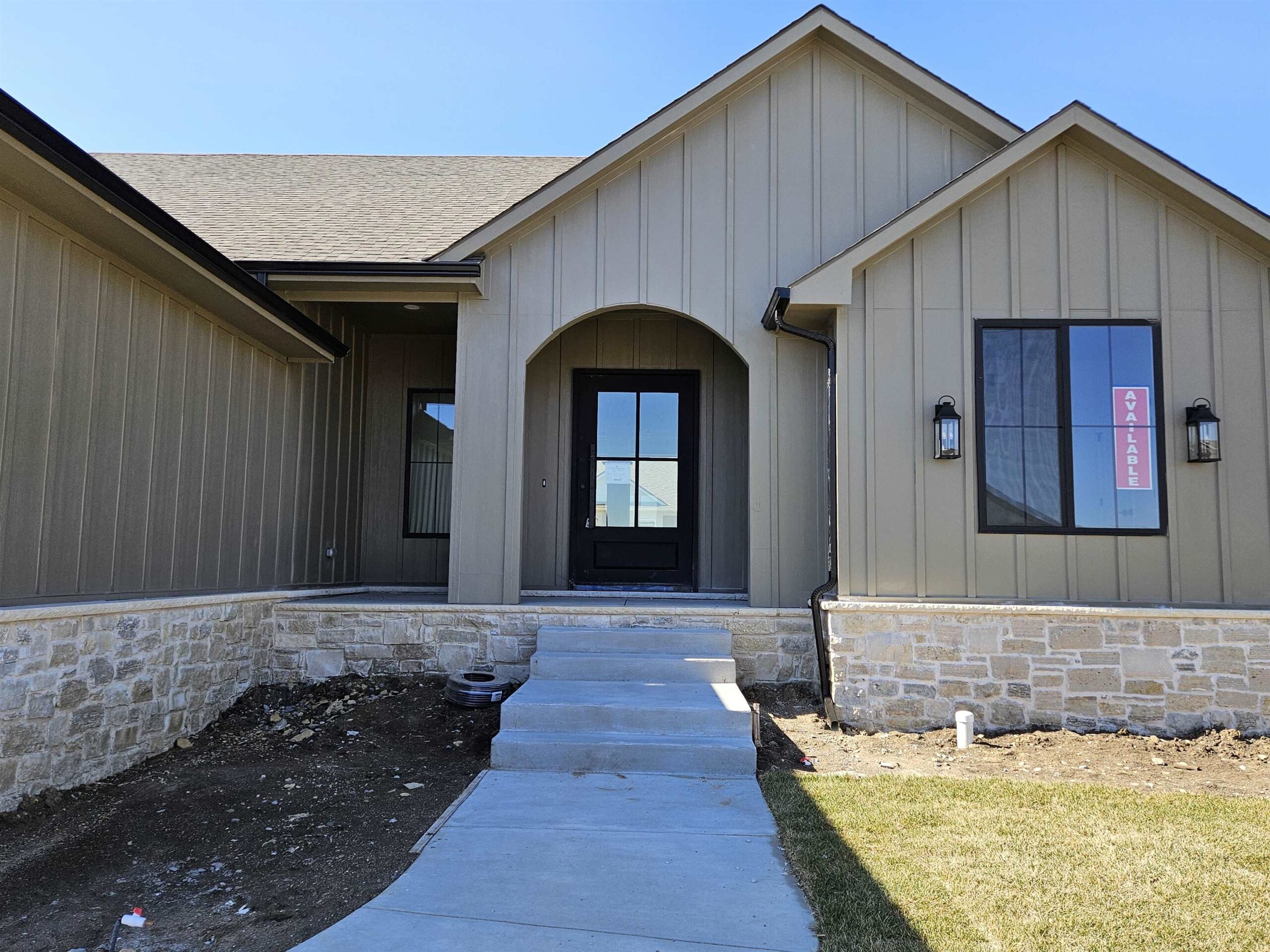 - Description: This brand new Stonegate floorplan built by Buckert Construction is almost finished and ready for move-in. 5 beds, 3 baths, 2975 sq ft with a 3-car garage. 10ft ceilings on main floor with wood beams in living room. Stone and wood accent walls around fireplace and oven in kitchen. Dining room has tongue & groove wood ceiling. Stunning front entry with oversized metal pivot door and wood accent wall. Quartz countertops throughout home. Large kitchen with side coffee bar and walk-in pantry. Sliding glass door from dining room opens onto a covered deck. Nice drop zone area off of garage entry with plenty of storage. Laundry room is accessible from both mudroom and master closet for ease of putting laundry away. Also has a folding table with additional cabinets above and below. The master bath has double sinks in vanity with window above to let in natural light. Full tiled shower with bench at one end. Master bedroom has floor to ceiling wood accent wall with trey ceiling above. Full finished basement with a walk-out pit to the backyard. Wet bar looks out into family room. There are 2 bedrooms & 1 bathroom down the hallway that meet in a cute cove. Kid zone or storage under the stairs. Well, irrigation and sod included in price. Comes with 1 year builder warranty. Andover school district! 3 community swimming pools with a park complete with basketball and pickleball courts. HOA dues are just $35/month and specials are only $190/month. Show all description