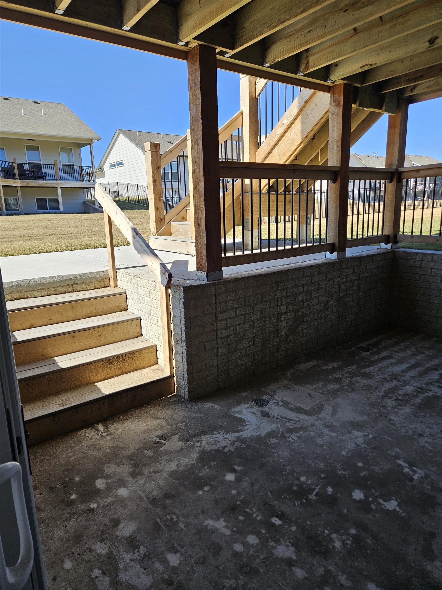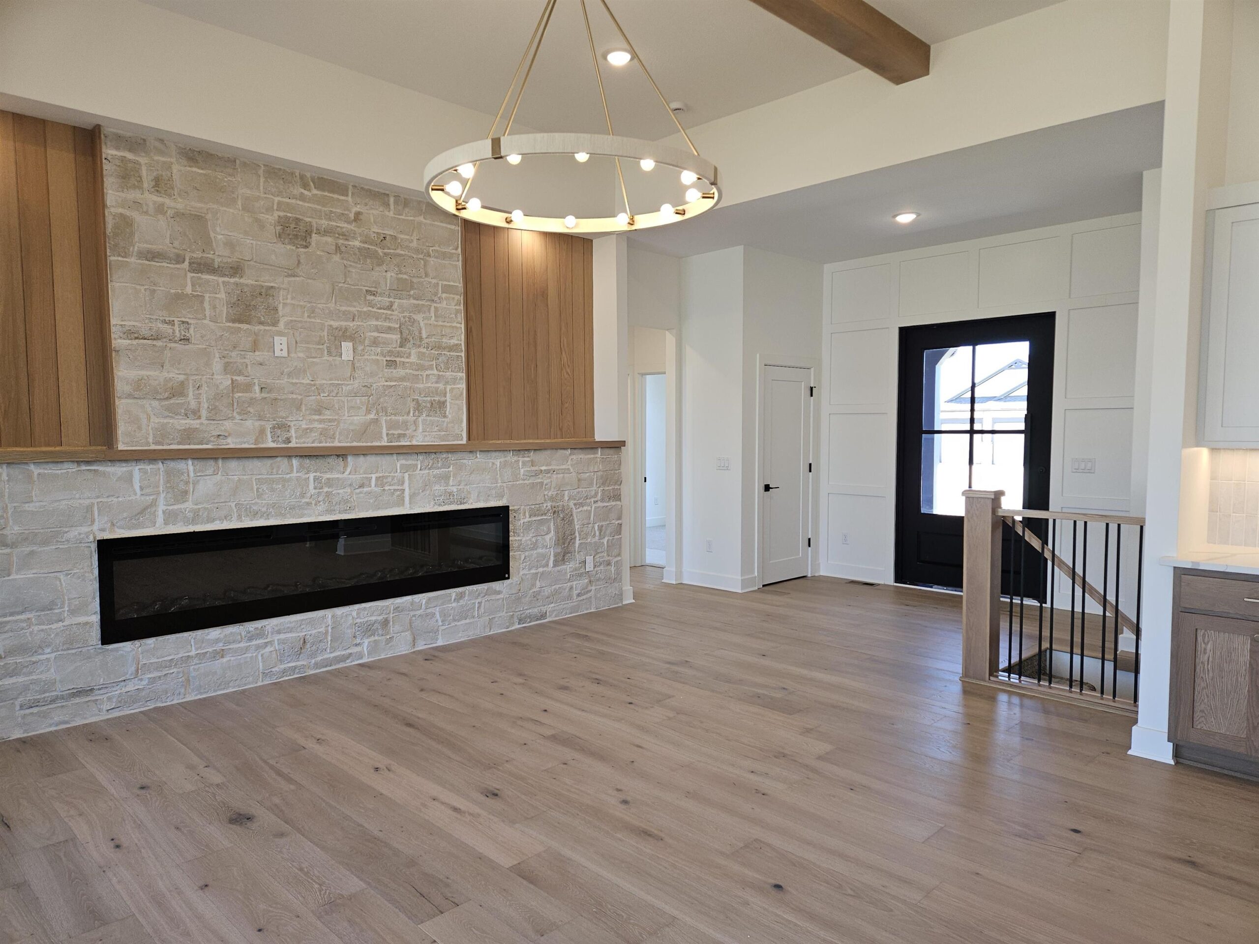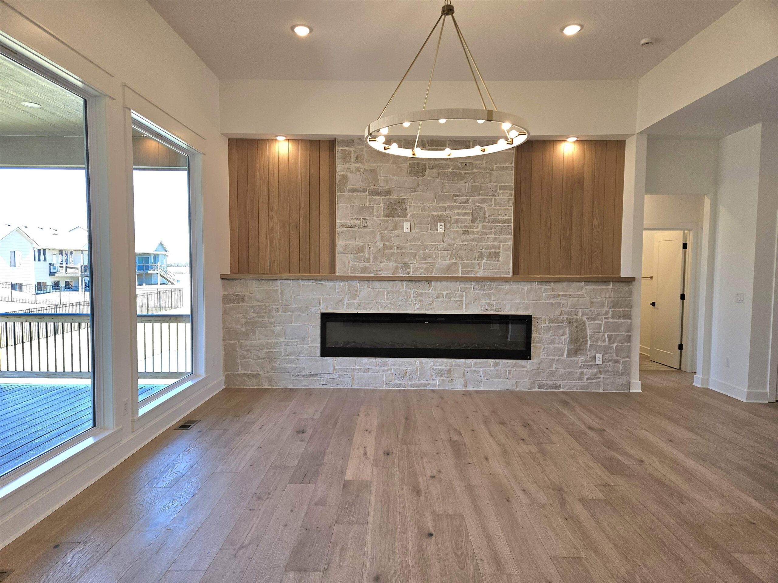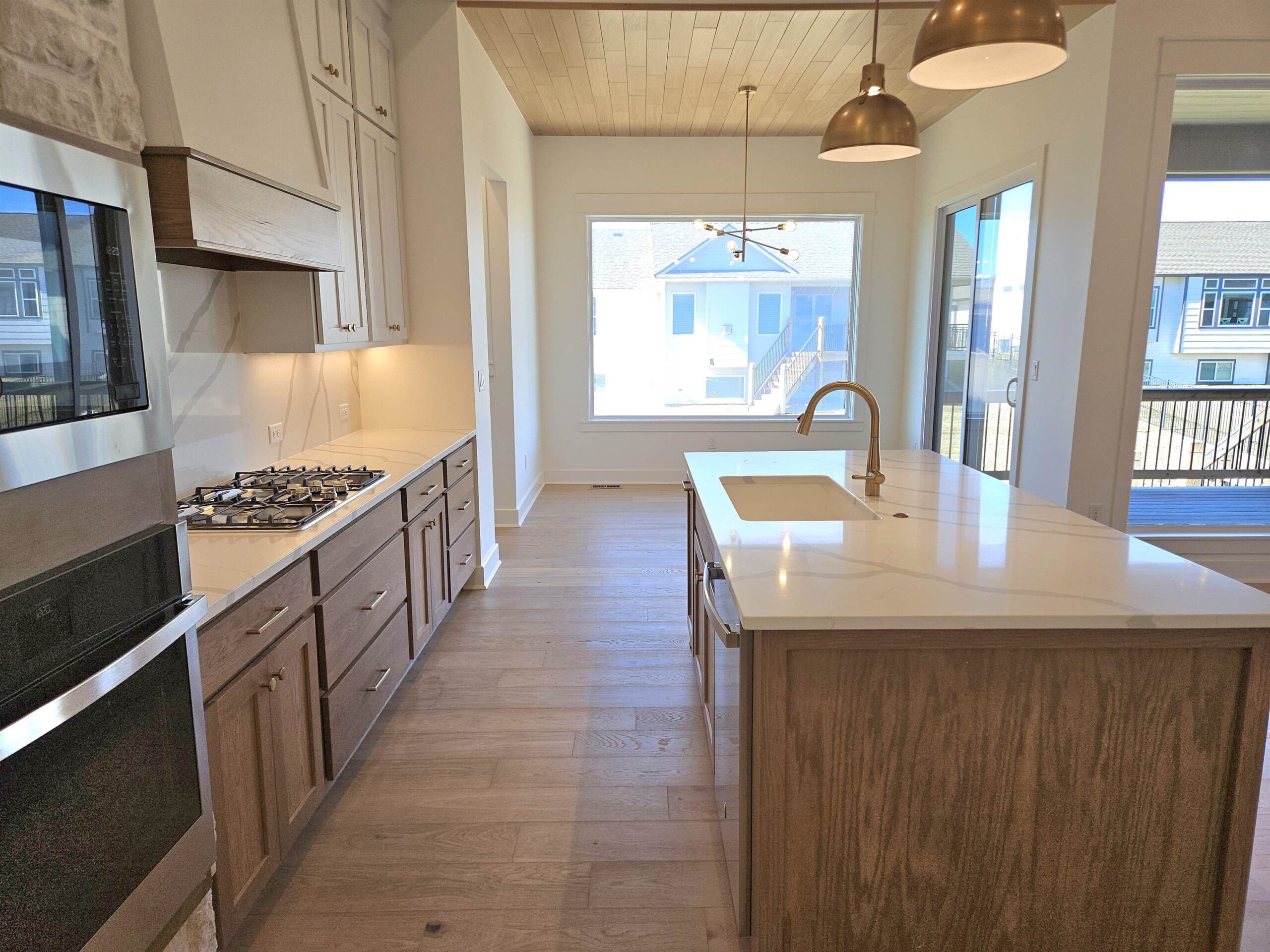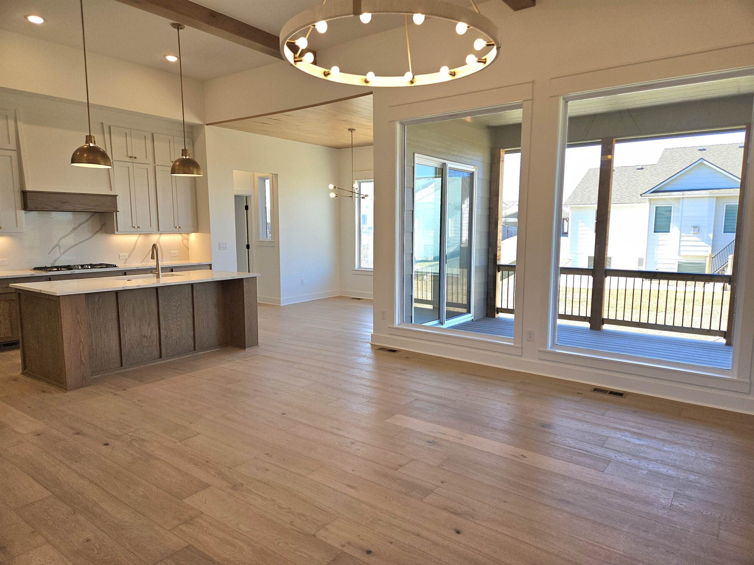 - Description: This brand new Stonegate floorplan built by Buckert Construction is almost finished and ready for move-in. 5 beds, 3 baths, 2975 sq ft with a 3-car garage. 10ft ceilings on main floor with wood beams in living room. Stone and wood accent walls around fireplace and oven in kitchen. Dining room has tongue & groove wood ceiling. Stunning front entry with oversized metal pivot door and wood accent wall. Quartz countertops throughout home. Large kitchen with side coffee bar and walk-in pantry. Sliding glass door from dining room opens onto a covered deck. Nice drop zone area off of garage entry with plenty of storage. Laundry room is accessible from both mudroom and master closet for ease of putting laundry away. Also has a folding table with additional cabinets above and below. The master bath has double sinks in vanity with window above to let in natural light. Full tiled shower with bench at one end. Master bedroom has floor to ceiling wood accent wall with trey ceiling above. Full finished basement with a walk-out pit to the backyard. Wet bar looks out into family room. There are 2 bedrooms & 1 bathroom down the hallway that meet in a cute cove. Kid zone or storage under the stairs. Well, irrigation and sod included in price. Comes with 1 year builder warranty. Andover school district! 3 community swimming pools with a park complete with basketball and pickleball courts. HOA dues are just $35/month and specials are only $190/month. Show all description