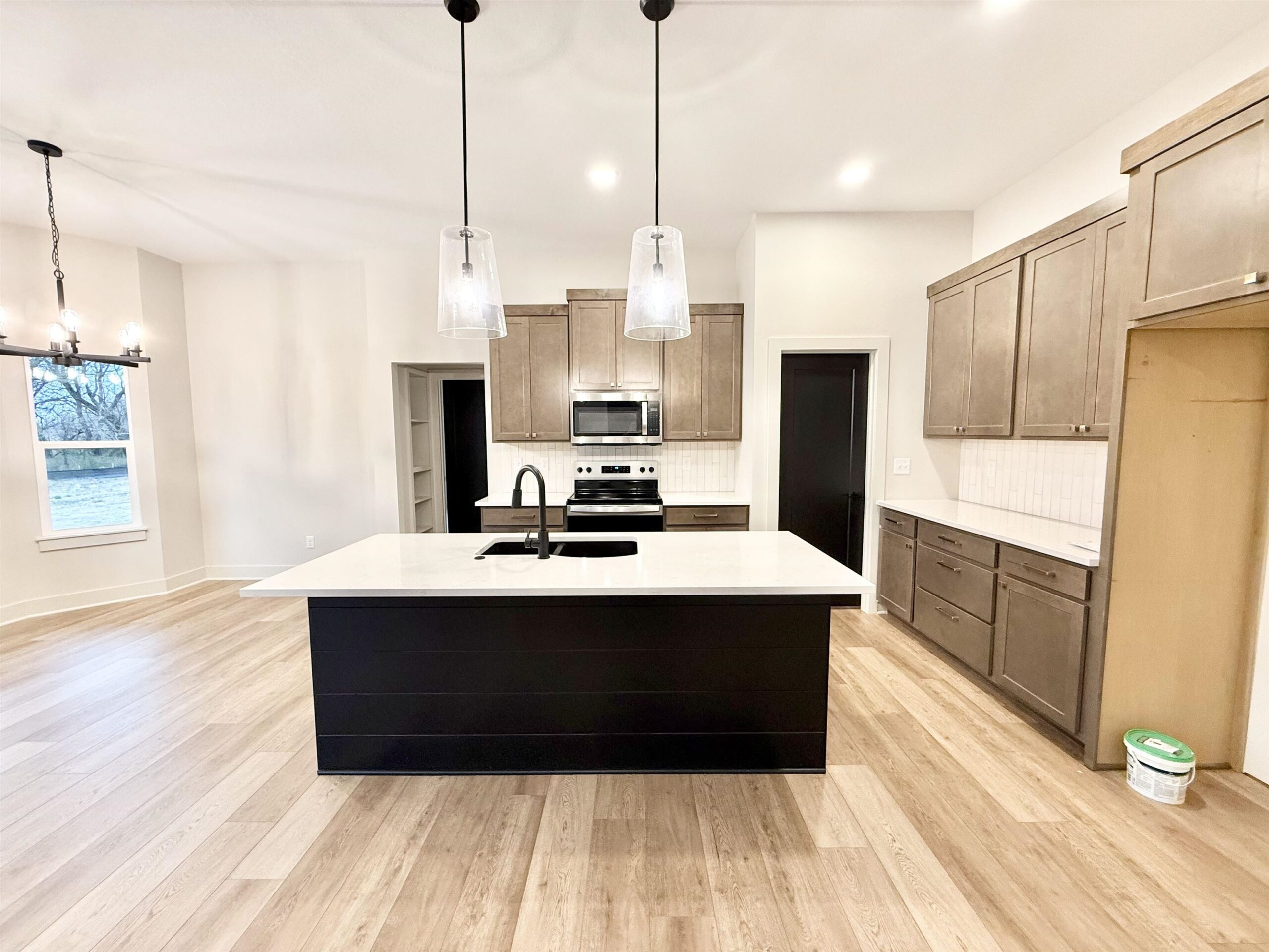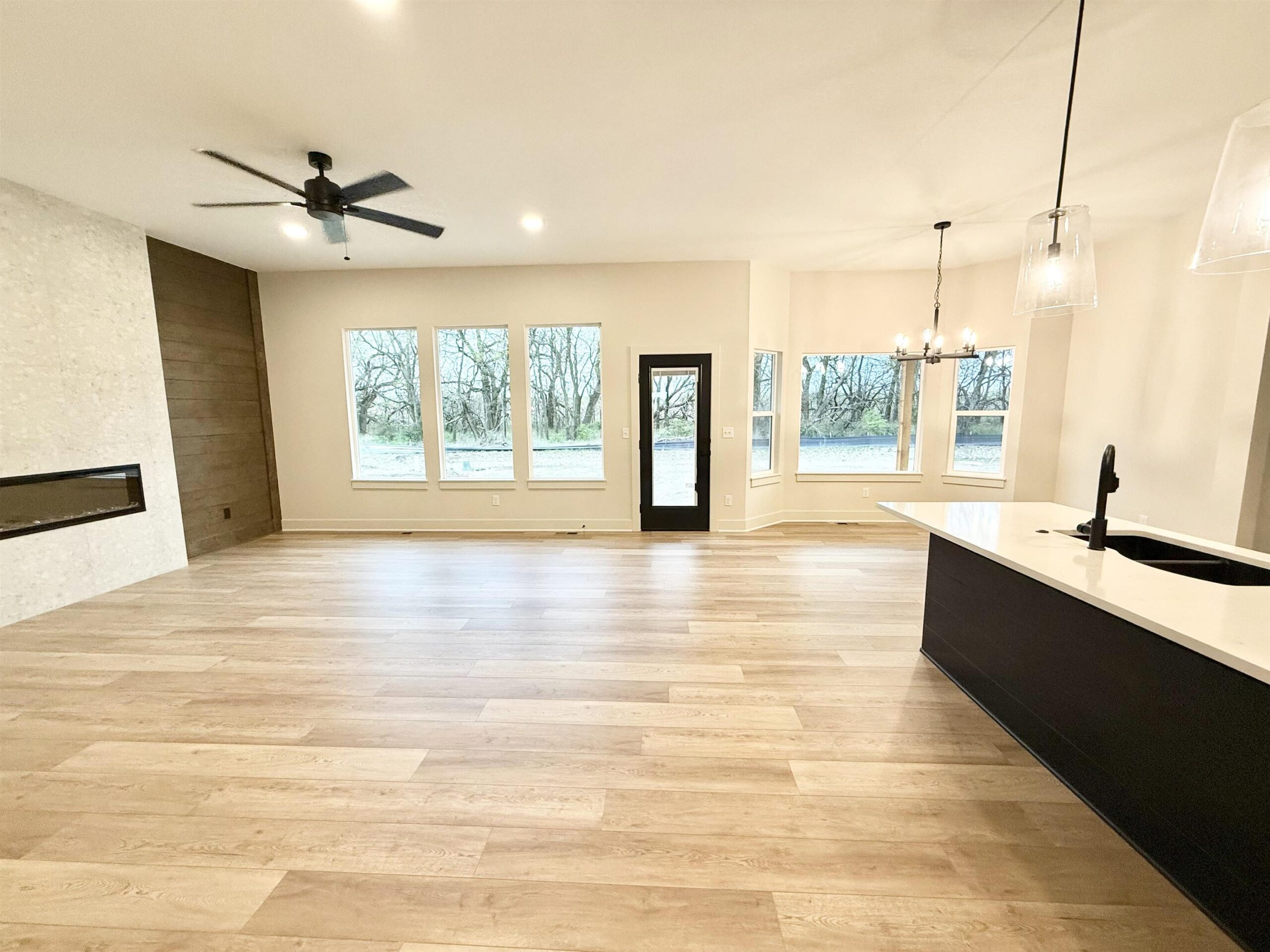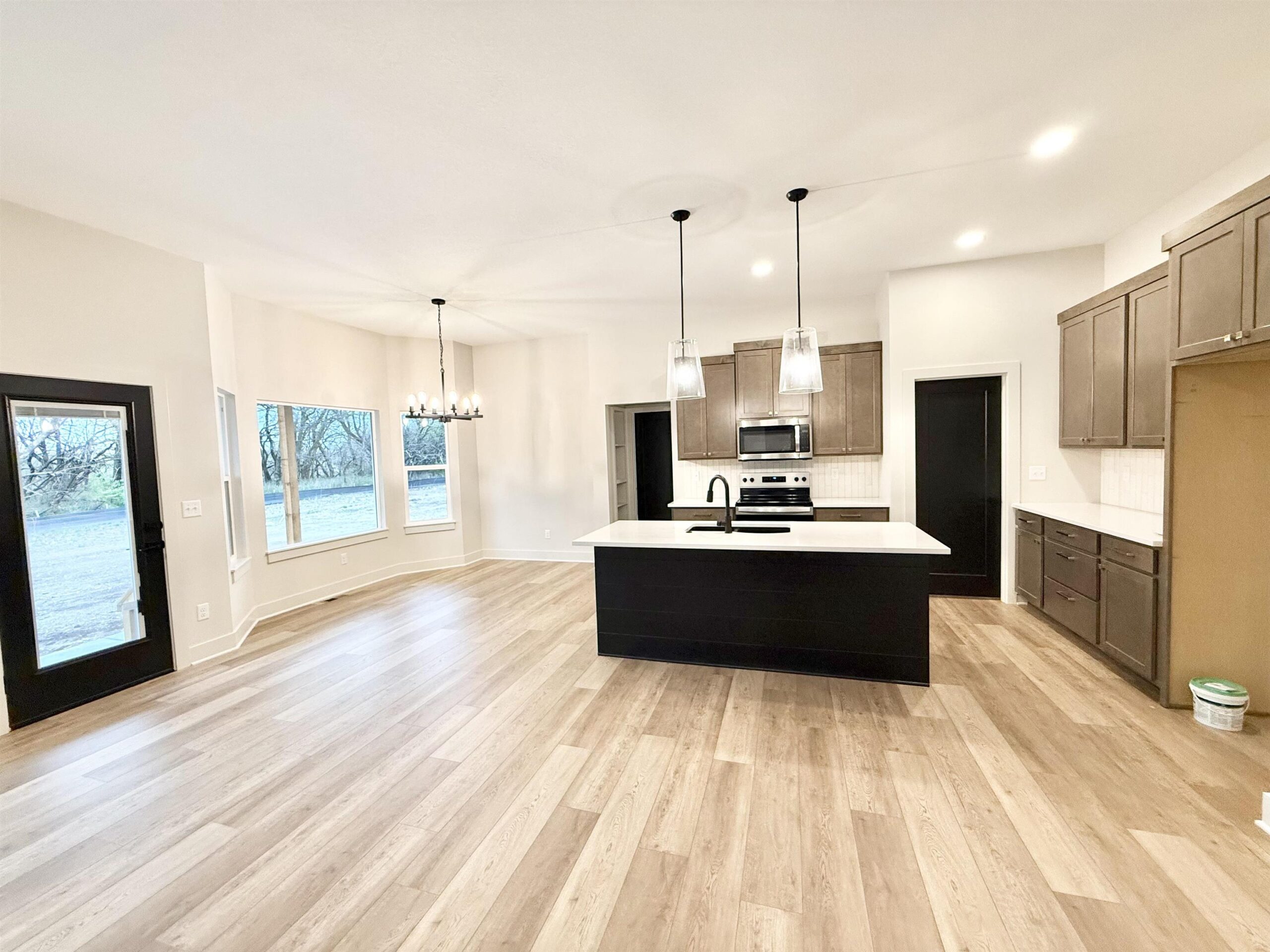 - Description: This brand-new, contemporary home offers a perfect blend of elegance and functionality with its thoughtfully designed five-bedroom, three-bathroom layout. Nestled on the tree line, this property promises a lifestyle of tranquility and natural beauty. As you step inside, you'll be greeted by an abundance of natural light that enhances the modern aesthetic of the open floor plan. The spacious living area seamlessly connects to the kitchen and dining space, creating a perfect environment for entertaining guests or enjoying quality family time. The home features lvp flooring throughout, providing both durability and a stylish touch. Modern lighting fixtures accentuate the space, creating an inviting atmosphere for culinary adventures. The view out basement offers a large entertainment area, two additional bedrooms and one bathroom. Experience the perfect blend of modern living and natural beauty in this idyllic setting. Schedule a showing today! Show all description