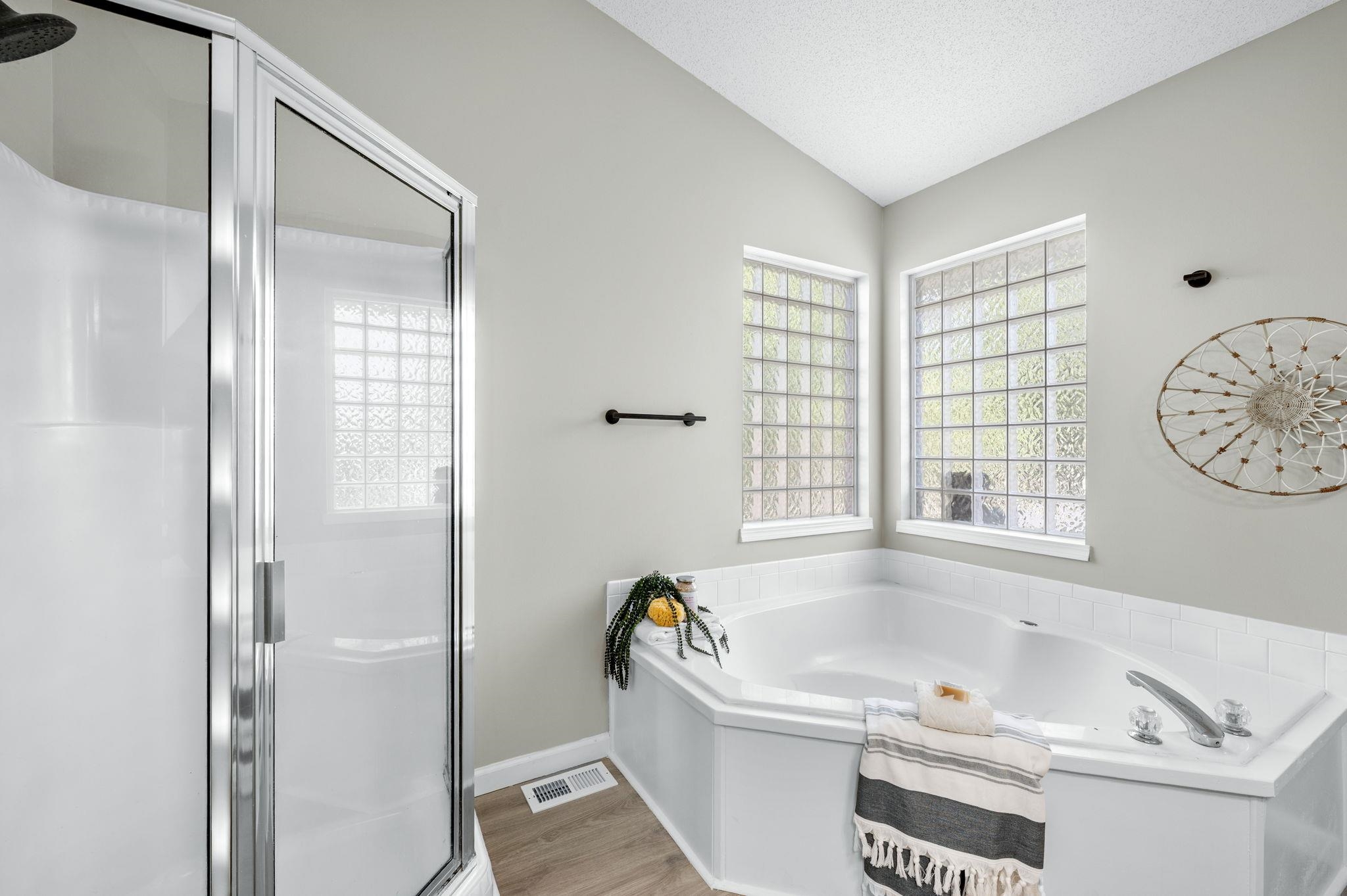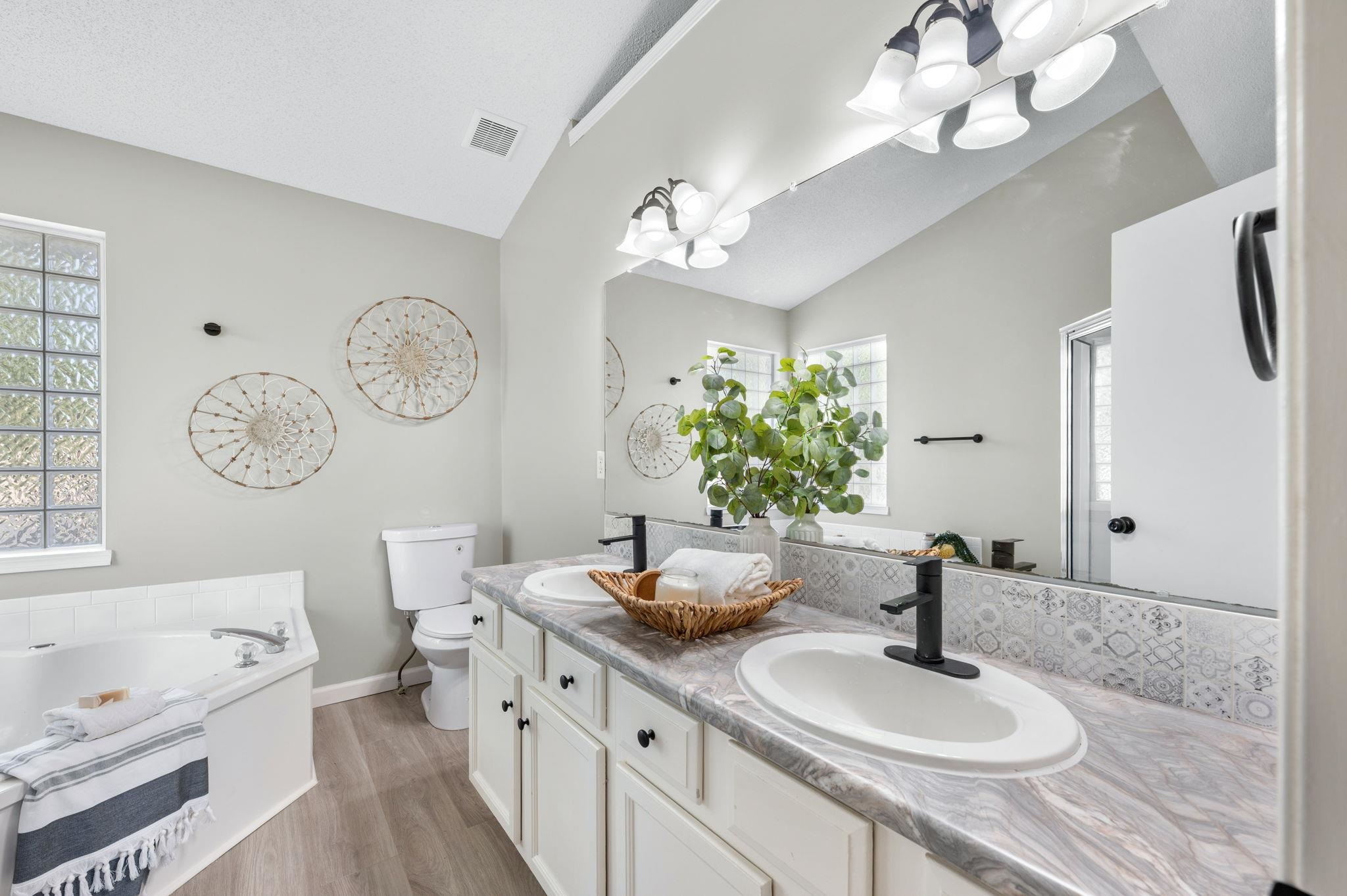 - Master Bedroom: Master Bdrm on Main Level, Split Bedroom Plan, Sep. Tub/Shower/Mstr Bdrm, Two Sinks, Laminate Counters