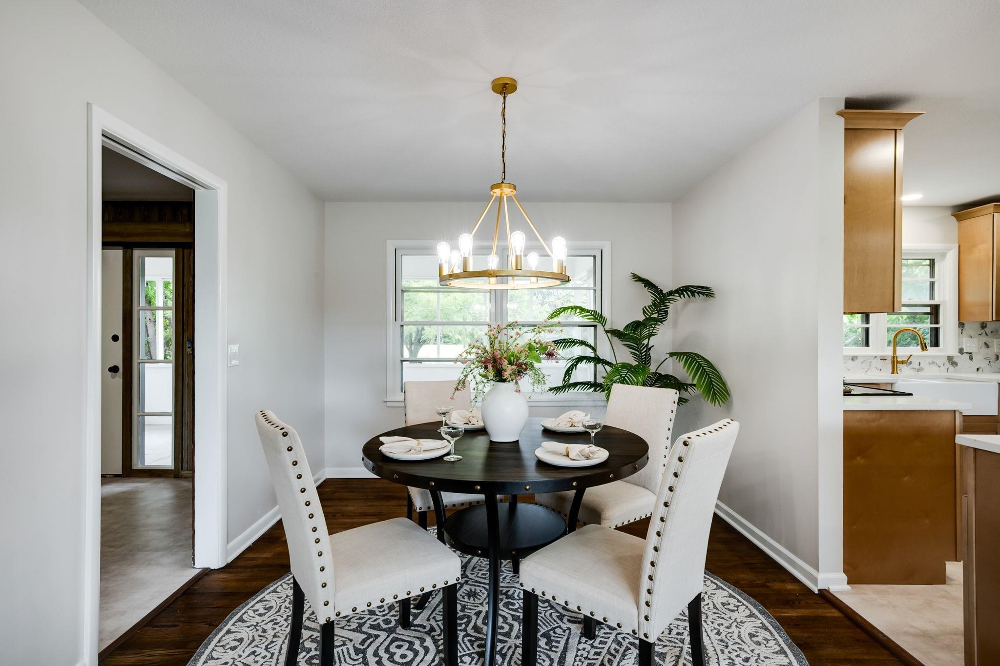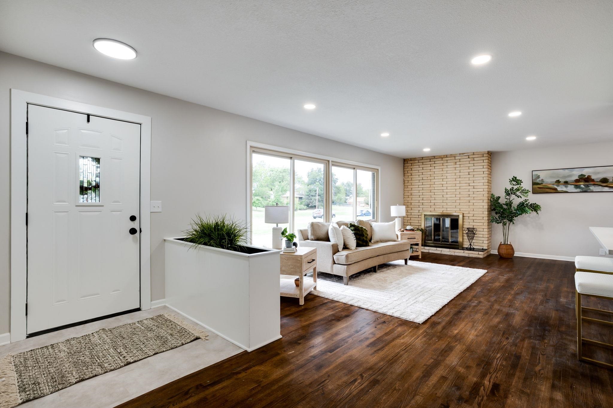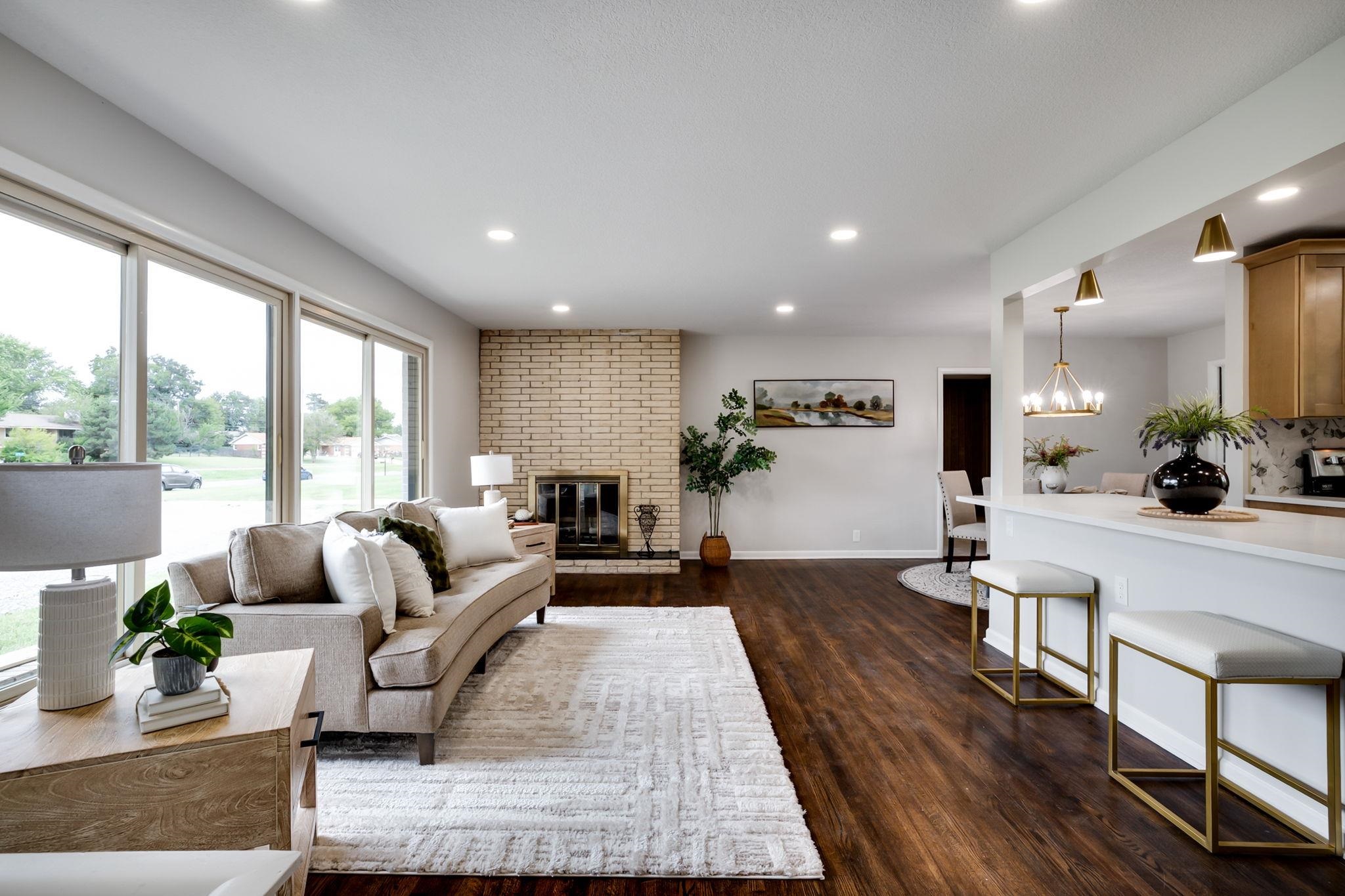 - Description: Opportunities for an estate like this do not come often! This 4000+sqft sprawling brick ranch has had every surface updated and improved. All new interior finishes, new roof, new water heater, new electrical, new plumbing, and newer HVAC means easy country living right here in the city! The open living area has beautiful hardwood floors, big sunny windows overlooking the circle drive out front, and a limestone wood-burning fireplace. The dining options are many with island seating, kitchen table area, and a formal dining room. The huge quartz island is the center of this home with new maple cabinets accented with trendy satin brass pulls. New appliances include a stainless dishwasher, microwave, and range with built in air-fryer oven. The south wing is where you find the primary bedroom with ensuite bathroom. The custom tile shower has a wand as well as a rainfall shower-head. Two more large bedrooms, a full bath, and the laundry conveniently located just outside the bedrooms complete the south wing. The north wing has the entry from the backyard. A covered patio leads to a large mudroom. A fourth main floor bedroom that works well as an office has a 2 sided limestone fireplace, warm wall paneling, and a hidden closet. A powder bath is just outside near the garage entry and basement stairway. The basement has an endless rec room with cushy new carpet, a 3-sided limestone wood-burning fireplace, and wet bar with granite counters and one of those new faucets that alternates between rain mode, waterfall mode, or sweep mode with a turn of the nozzle or click of a button. A large bonus room with concrete storm shelter leads to the 5th bedroom with egress window. A full bathroom and 2 storage rooms round out the lower level. Outside... oh the possibilities with 1.6 private acres are endless! The 2 car attached garage doors are on the back of the home for ultimate curb appeal. There is a gravel area for additional parking. Pets? A large section of the yard is already fenced! The back half of the property is a wide open field of dreams. Shop? Pool? Playground? mother-in-law quarters? This is a special property with land, a huge fully remodeled home, and located just minutes from k-96 and the best shopping and dining the east side has to offer. Come tour today! Show all description