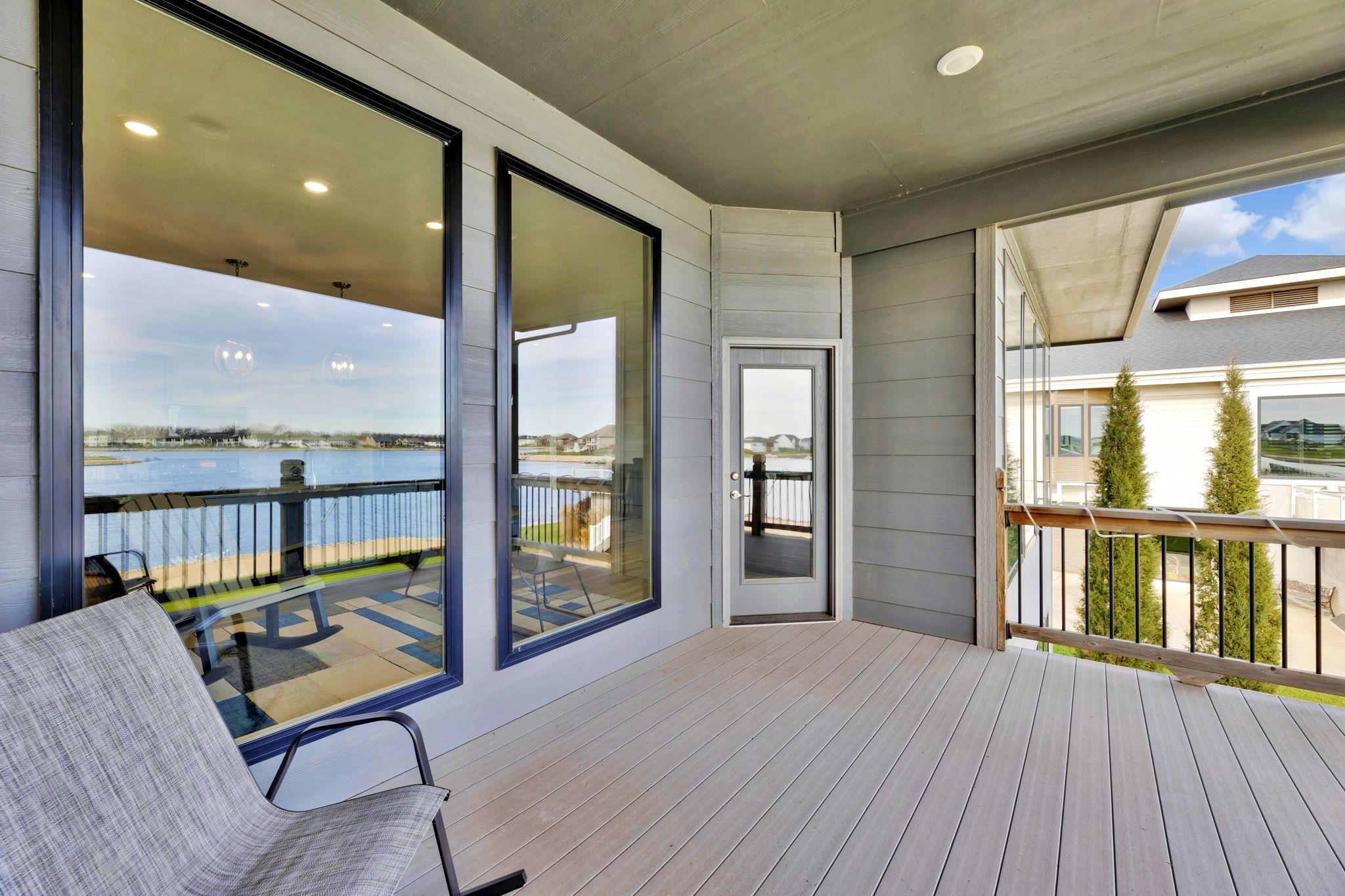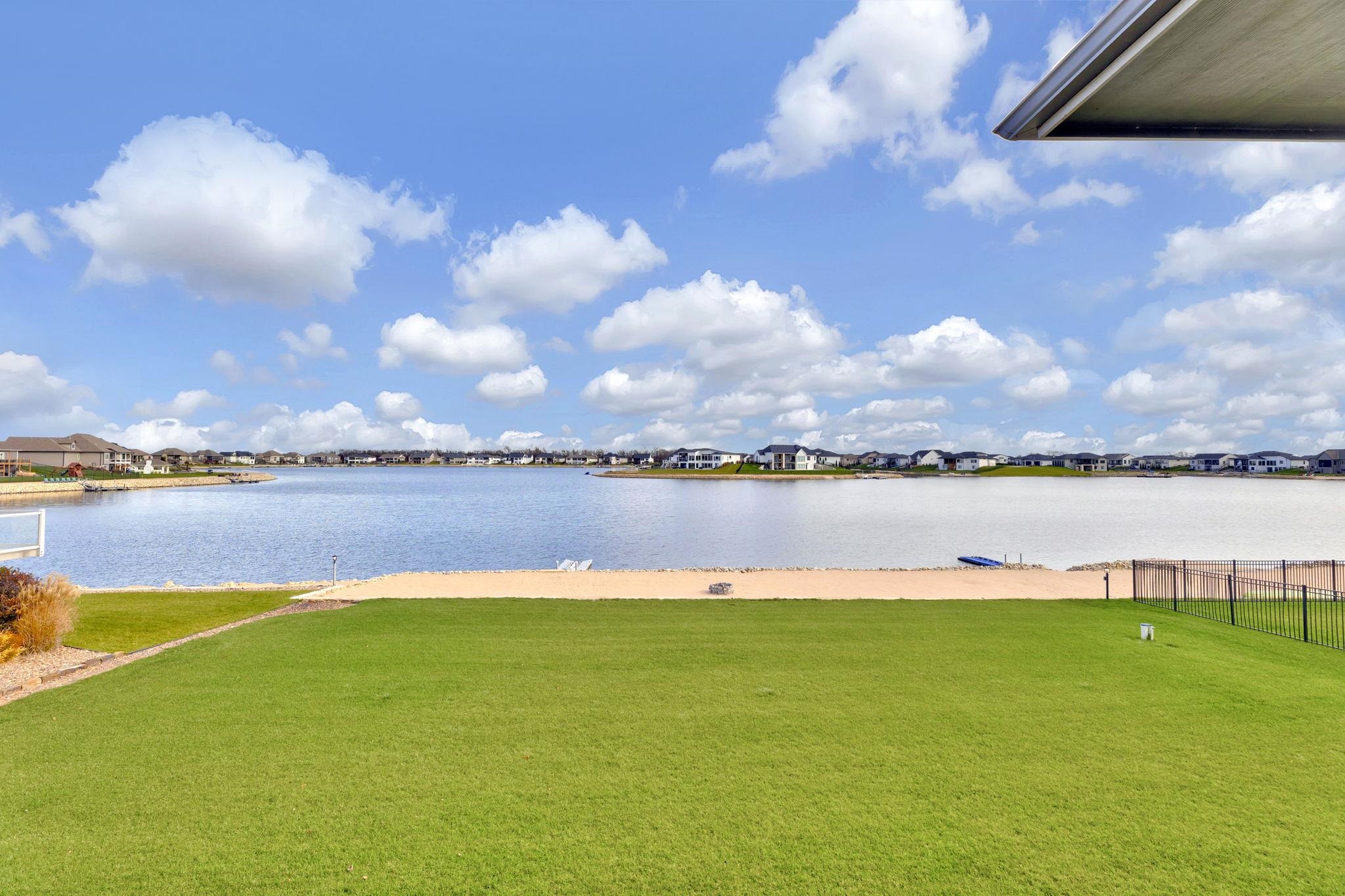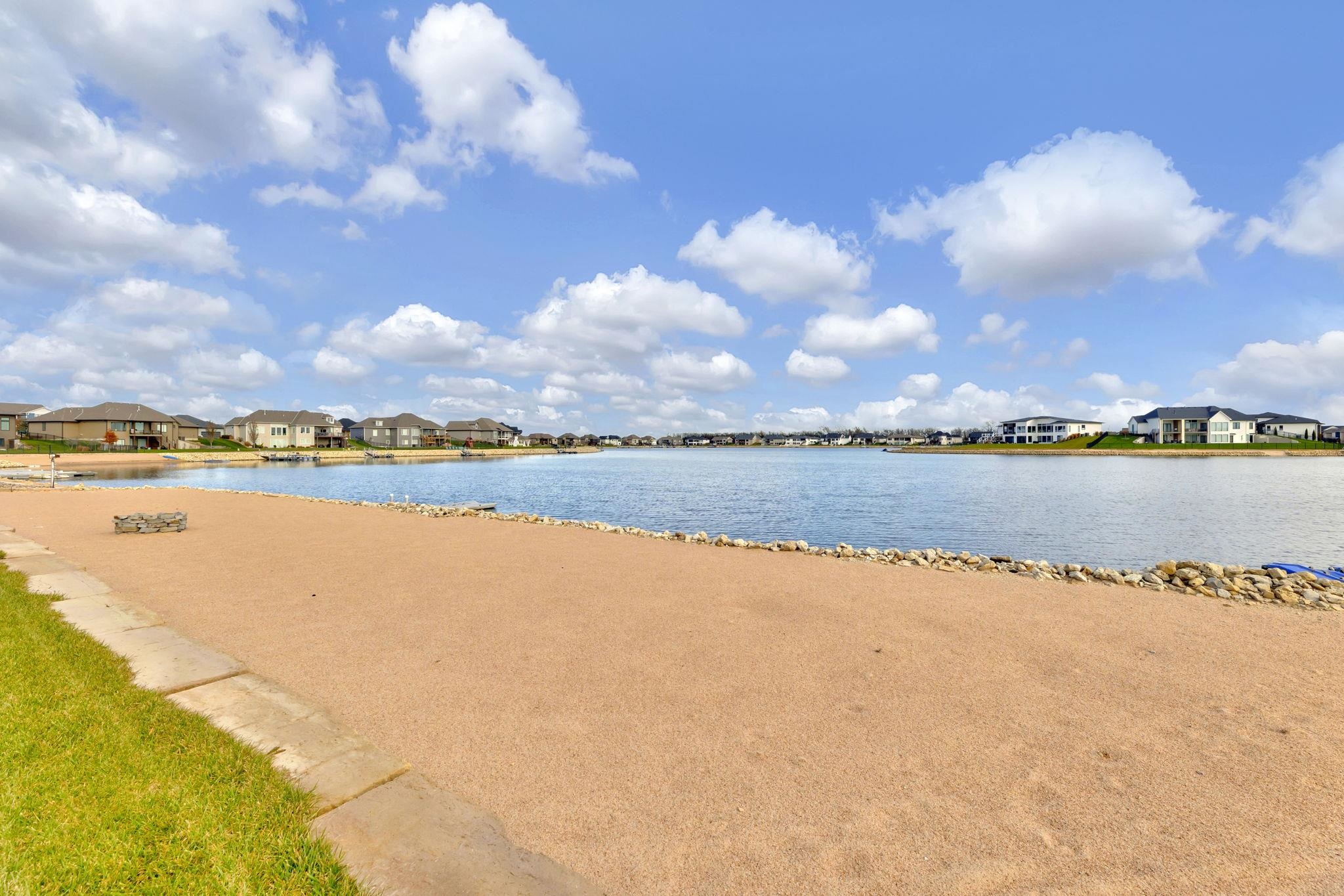 - Description: Experience luxury lakeside living at its finest in this meticulously maintained home on an extraordinary lake lot in Sandcrest. Perfectly positioned just a short walk from the lakefront clubhouse, resort-style pool, playground, soccer field, and pickleball court, this home blends incredible amenities with true modern elegance. A stunning mid-century modern elevation welcomes you inside, where the spacious living room features dramatic picture windows showcasing panoramic lake views and a gorgeous stone-surround gas fireplace. The rear-facing kitchen is a chef’s delight, offering granite countertops, abundant cabinetry, and a generous walk-in pantry. The adjoining dining room—also framed by expansive windows—opens directly to the covered deck, delivering some of the best vantage points in the neighborhood. Retreat to the luxurious master suite with a spacious bedroom, spa-inspired bath featuring dual granite-topped vanities and a full tile shower, and an impressive walk-in closet with direct access to the laundry room. A second main-floor bedroom, full hall bath, and a convenient front office complete the main level. The fully finished walk-out lower level continues to impress with a large family room highlighted by LVP flooring, a walk-out to the covered patio, and a stylish pub-style wet bar—ideal for entertaining. Three additional bedrooms and a full bath offer plenty of space for family and guests. Outside, the expansive backyard is your own private lakeside sanctuary. Enjoy a large beach area, included jet-ski dock, and ample room for a future pool. You can even add your own private boat dock along your beach frontage. Don’t miss this rare opportunity to own one of the prime lots in Sandcrest—one of Wichita’s premier lakeside communities and located within the Maize South school district. This home is the perfect blend of luxury, lifestyle, and breathtaking views. Come see it today! Some information may be estimated and is not guarnteed. Please verify schools with USD 266. Show all description