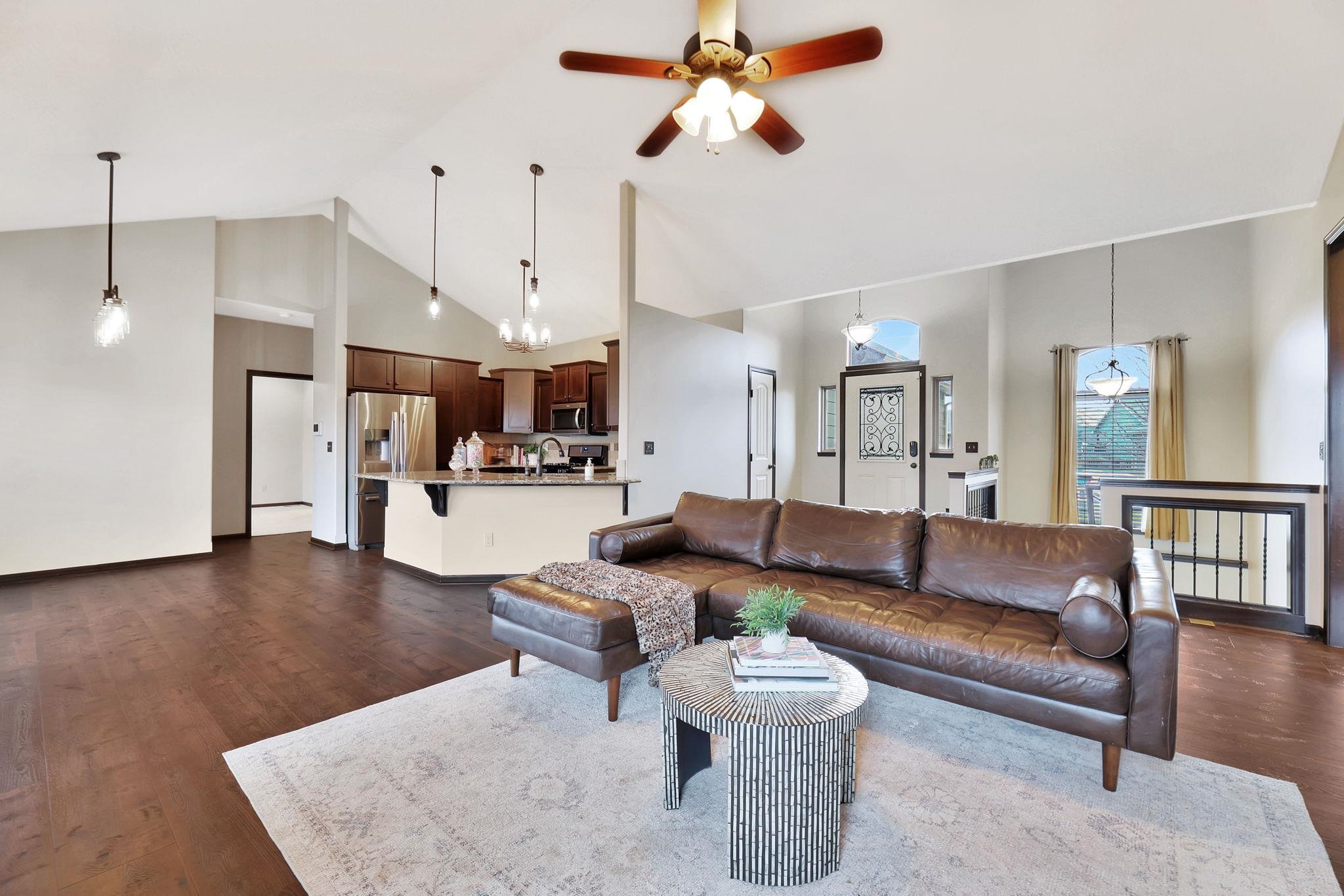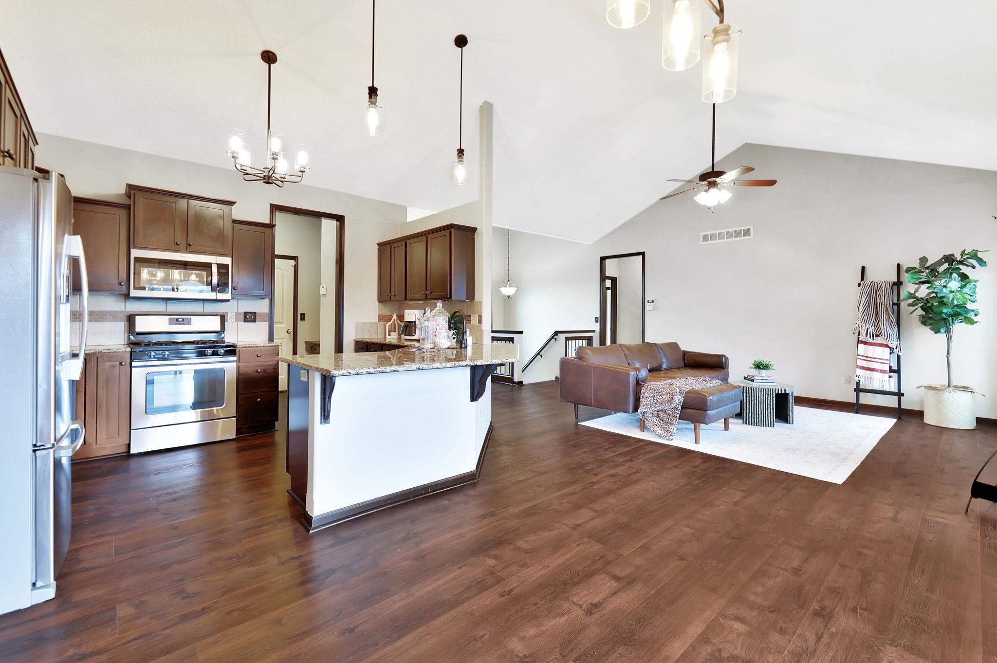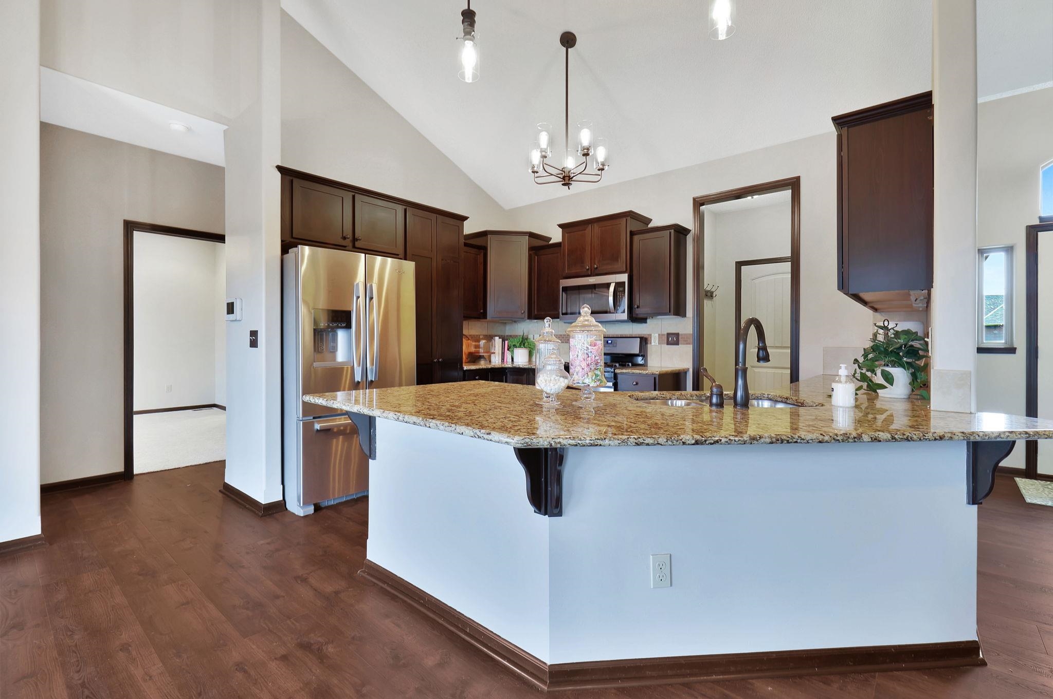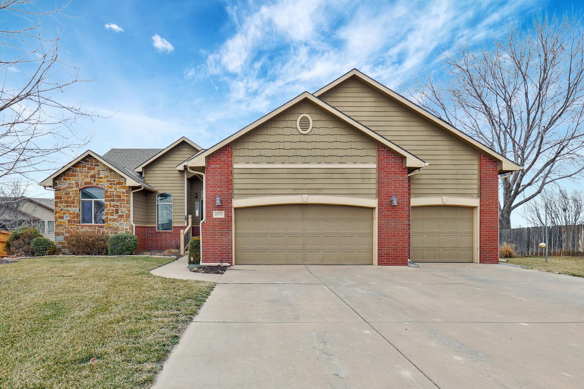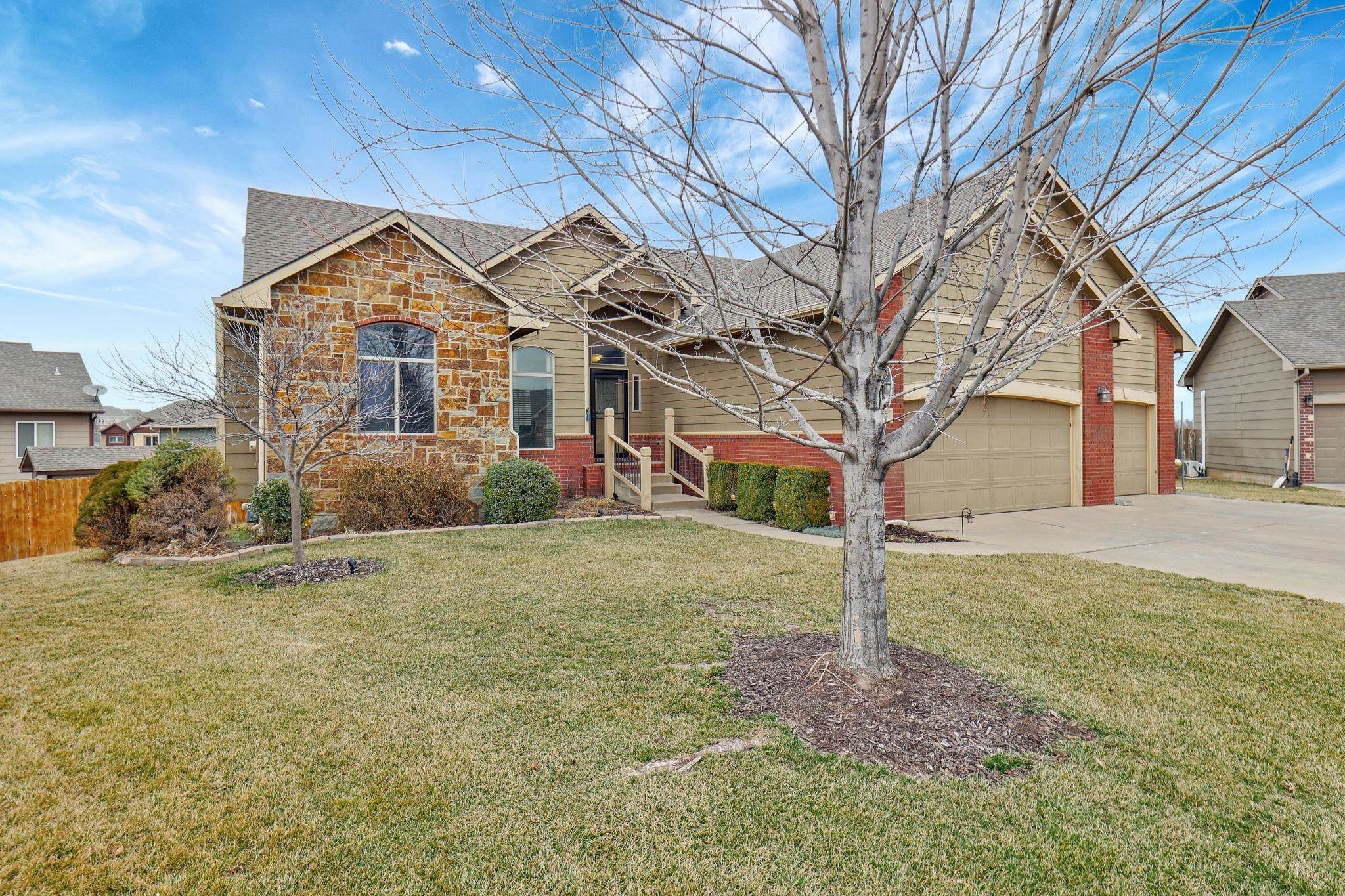 - Description: Beautifully Maintained Ranch Home in Maize School District This stunning 5-bedroom, 3-bath, 3-car garage ranch-style home offers a spacious and functional layout with no special taxes! The main floor features a desirable split-bedroom design, an open-concept kitchen with granite countertops, a walk-in pantry, and a convenient main-floor laundry room that connects to the master bath. The master suite includes a luxurious soaker tub, a separate shower, and a private water closet. The walkout basement is fully finished and perfect for entertaining, boasting a huge family room with a cozy fireplace, a wet bar, two additional bedrooms, and another full bath. Fresh new carpet has been added, making this home truly move-in ready. Don't miss this incredible opportunity in the highly sought-after Maize School District! Show all description