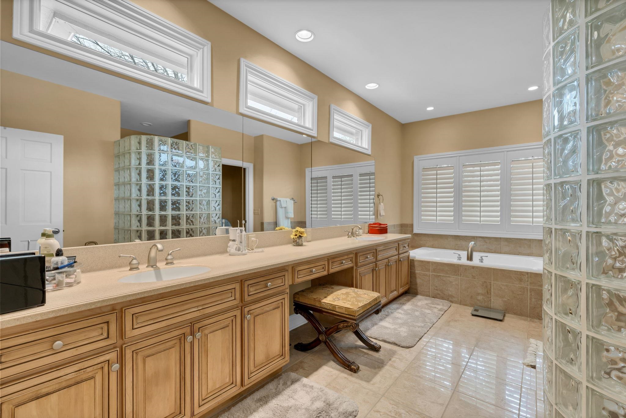 - Master Bedroom: Master Bdrm on Sep. Floor, Master Bdrm on Main Level, Split Bedroom Plan, Master Bedroom Bath, Sep. Tub/Shower/Mstr Bdrm, Two Sinks, Granite Counters