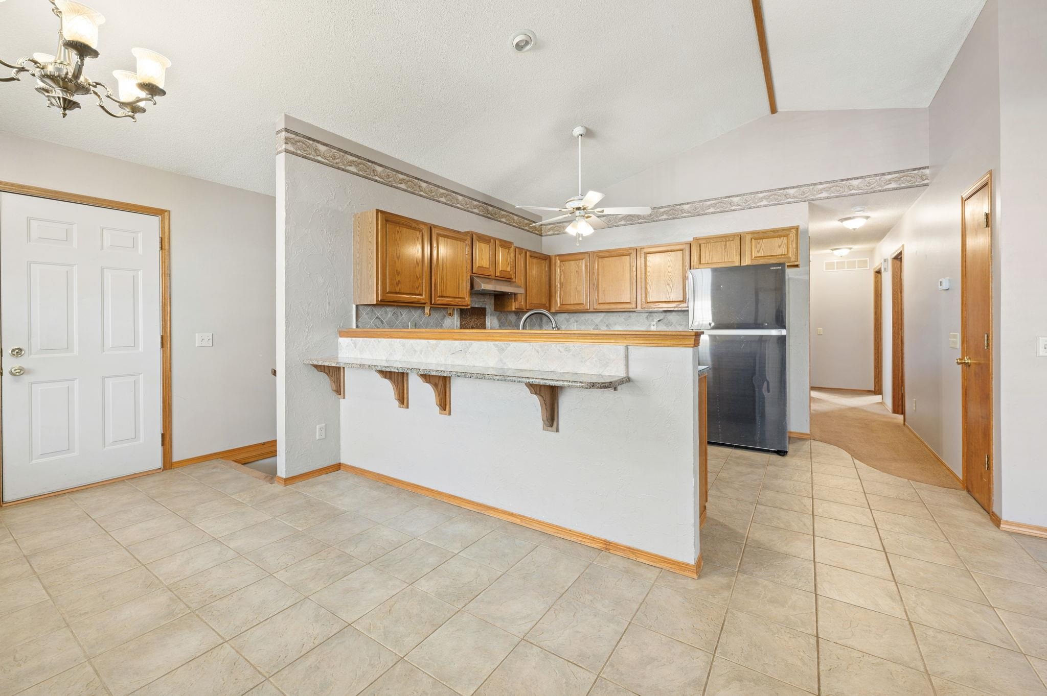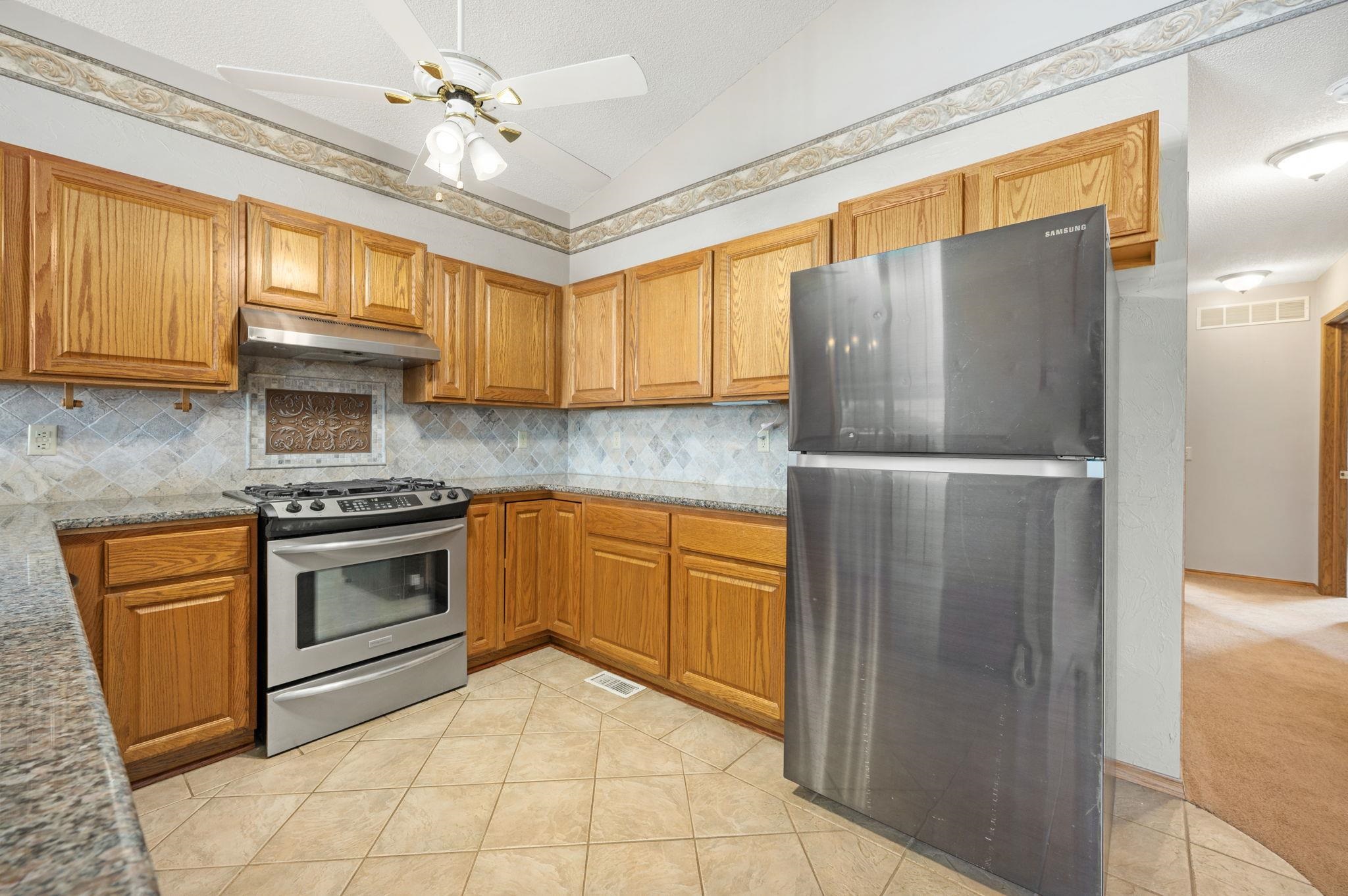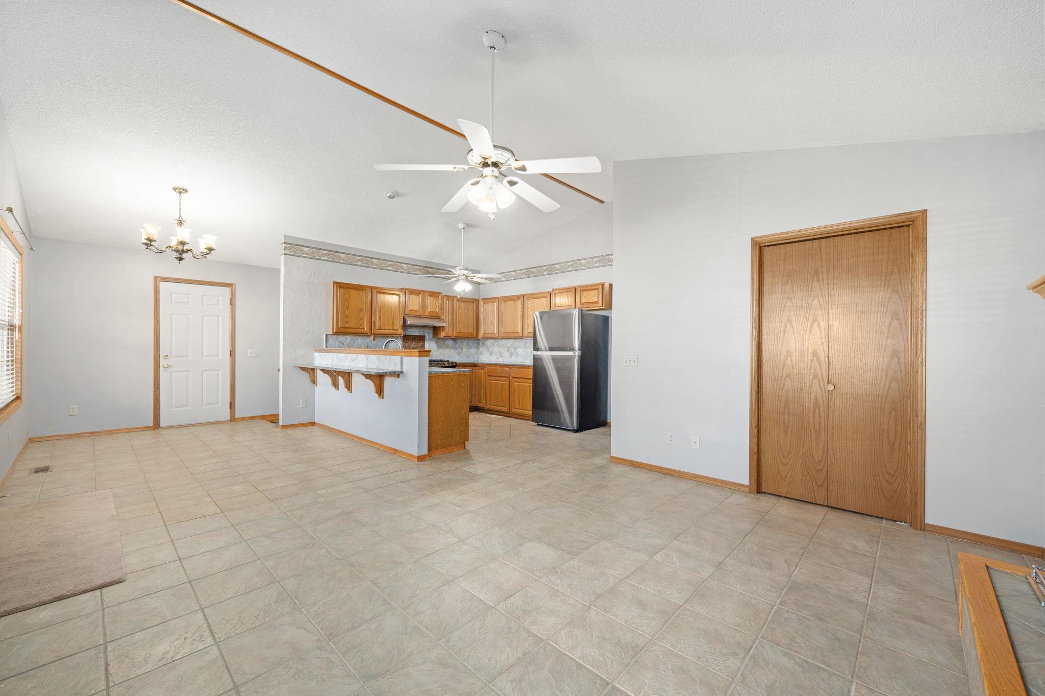 - Description: This beautiful home sits on an oversized lot in the highly desirable Andover School District, offering both space and comfort for your family. Featuring a fantastic open floor plan, this home provides a seamless flow between the kitchen, living room, and dining areas. The spacious kitchen boasts a large eating bar, granite countertops, a gas oven range, as well as a refrigerator and dishwasher. With plenty of cabinetry, this kitchen is perfect for meal prep and storage. Relax in the cozy living room, complete with a charming fireplace, or entertain guests in the adjoining dining space. The main floor also features a convenient laundry area with washer and dryer included. The master bedroom is a true retreat, featuring its own private bath and direct access to the covered patio in the back. Two additional bedrooms and a hall bath complete the main level, offering plenty of room for family or guests. Downstairs, the full basement is a standout, with two huge bedrooms, each with expansive 5x8 walk-in closets. The large bathroom includes a luxurious jacuzzi tub—perfect for unwinding after a long day. Outside, enjoy the large covered front porch—ideal for sipping your morning coffee or relaxing in the evening. The back offers a covered patio, perfect for entertaining, along with a garden area and a fenced-in space for pets. The roof is being replaced before closing. This home is ready for you to move in and make it your own—don’t miss out on this incredible opportunity! Show all description
