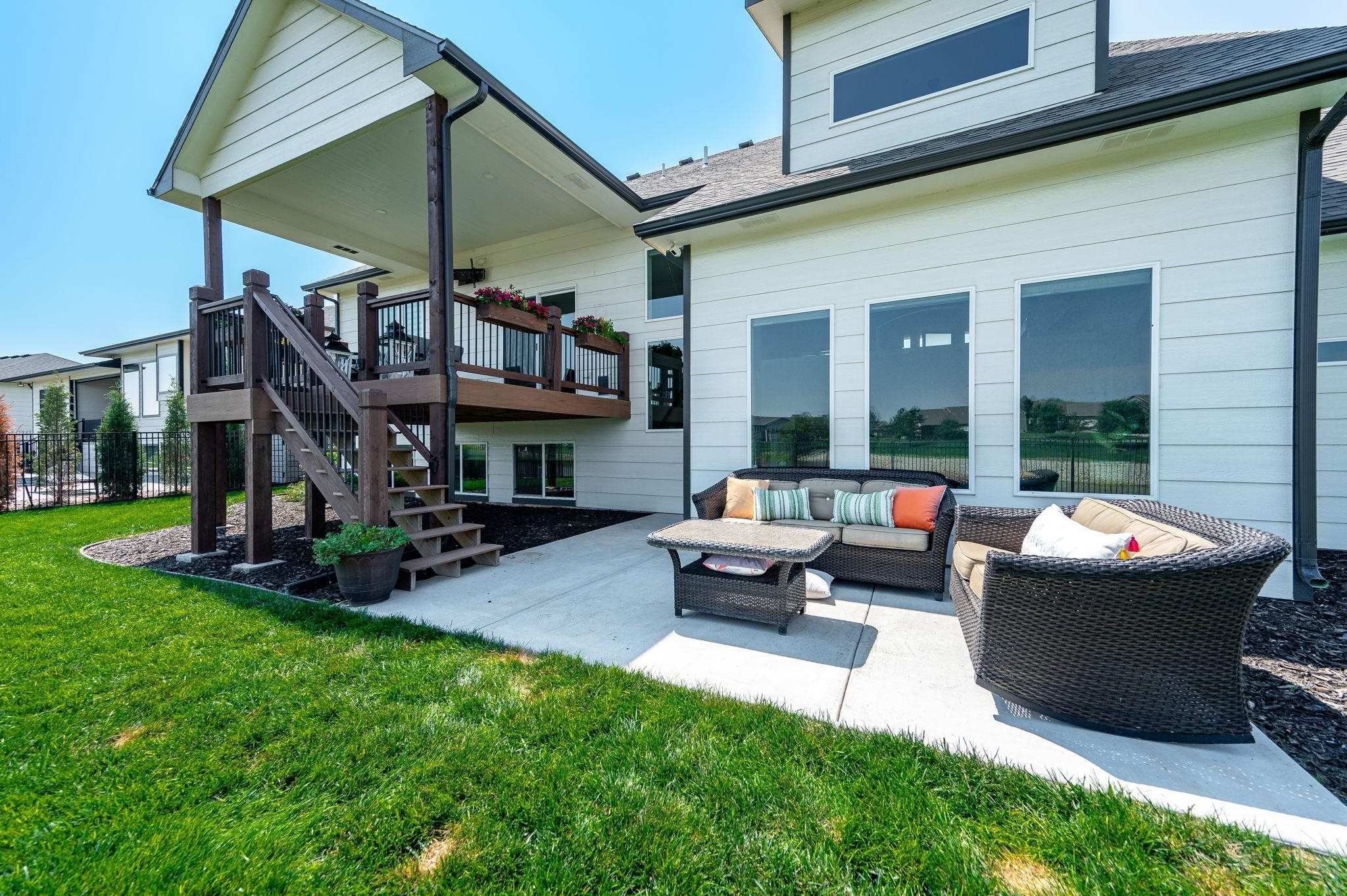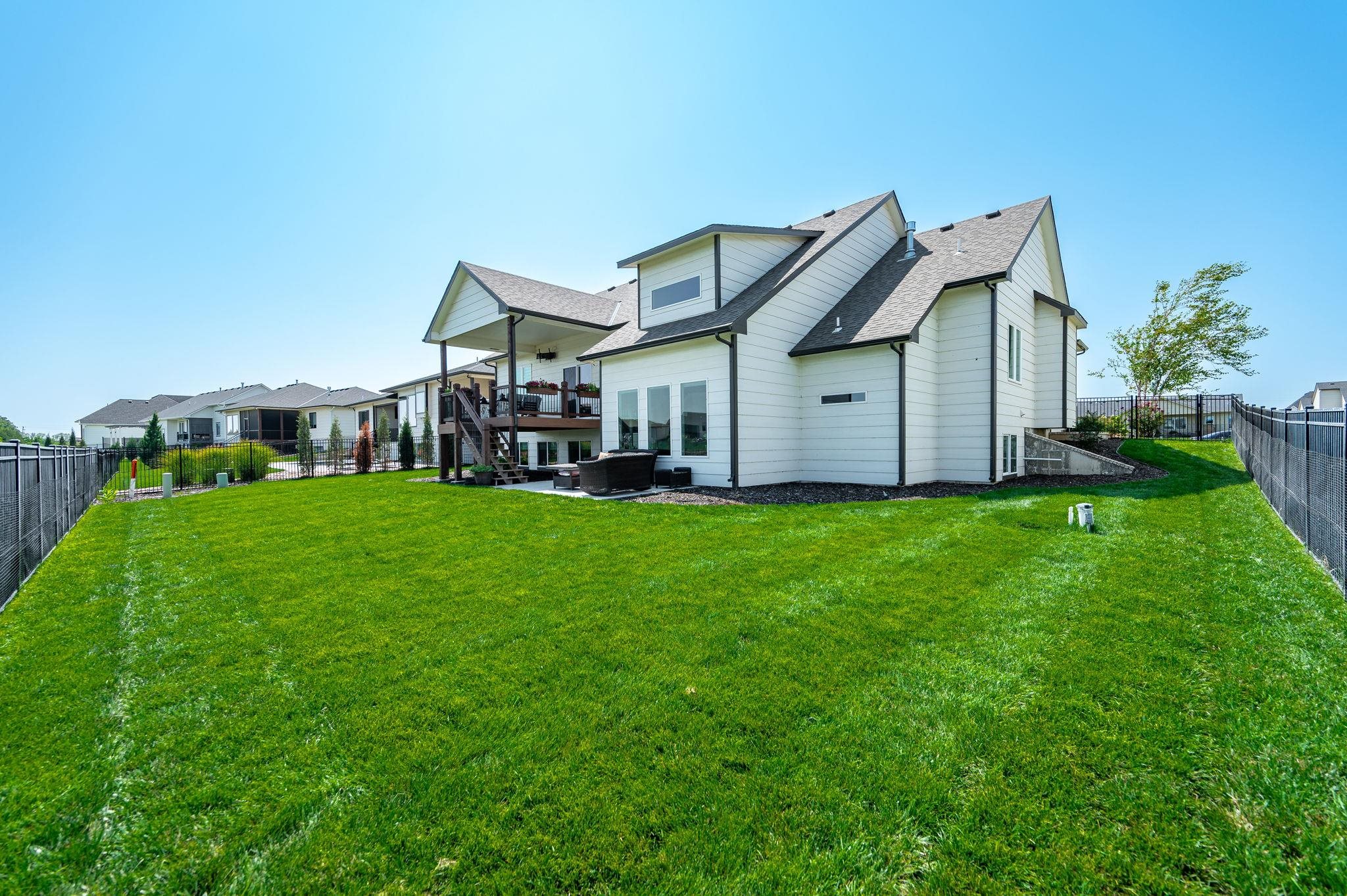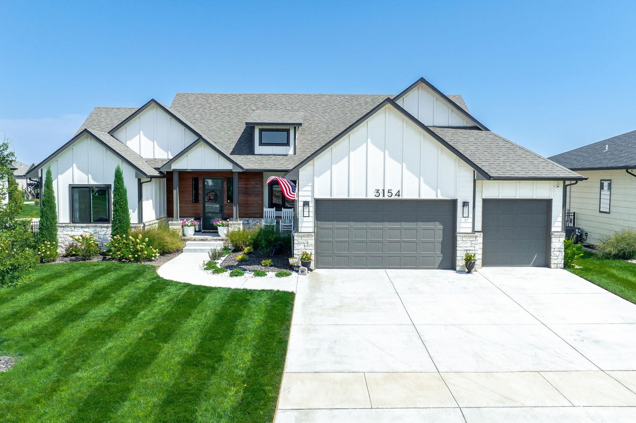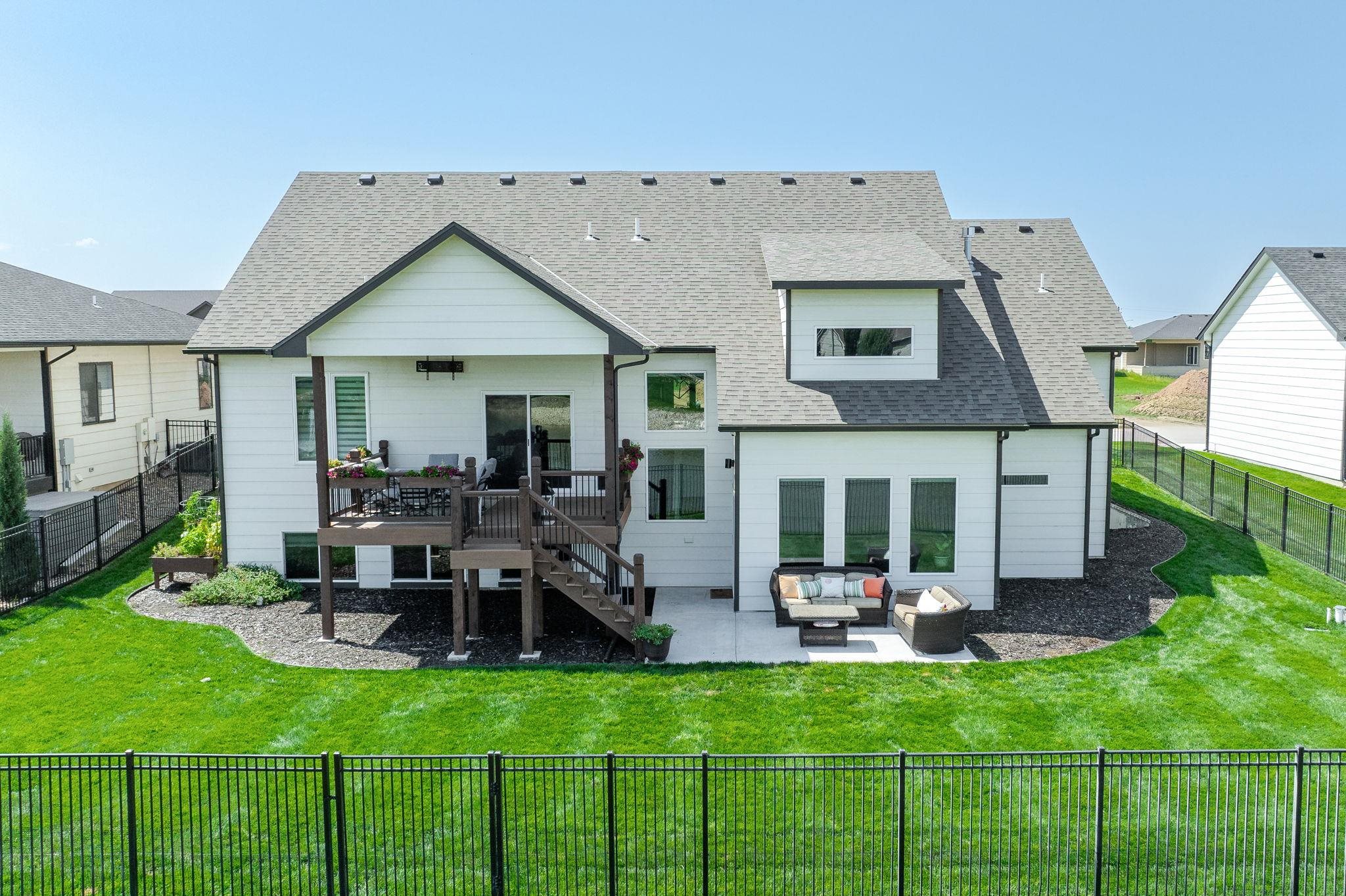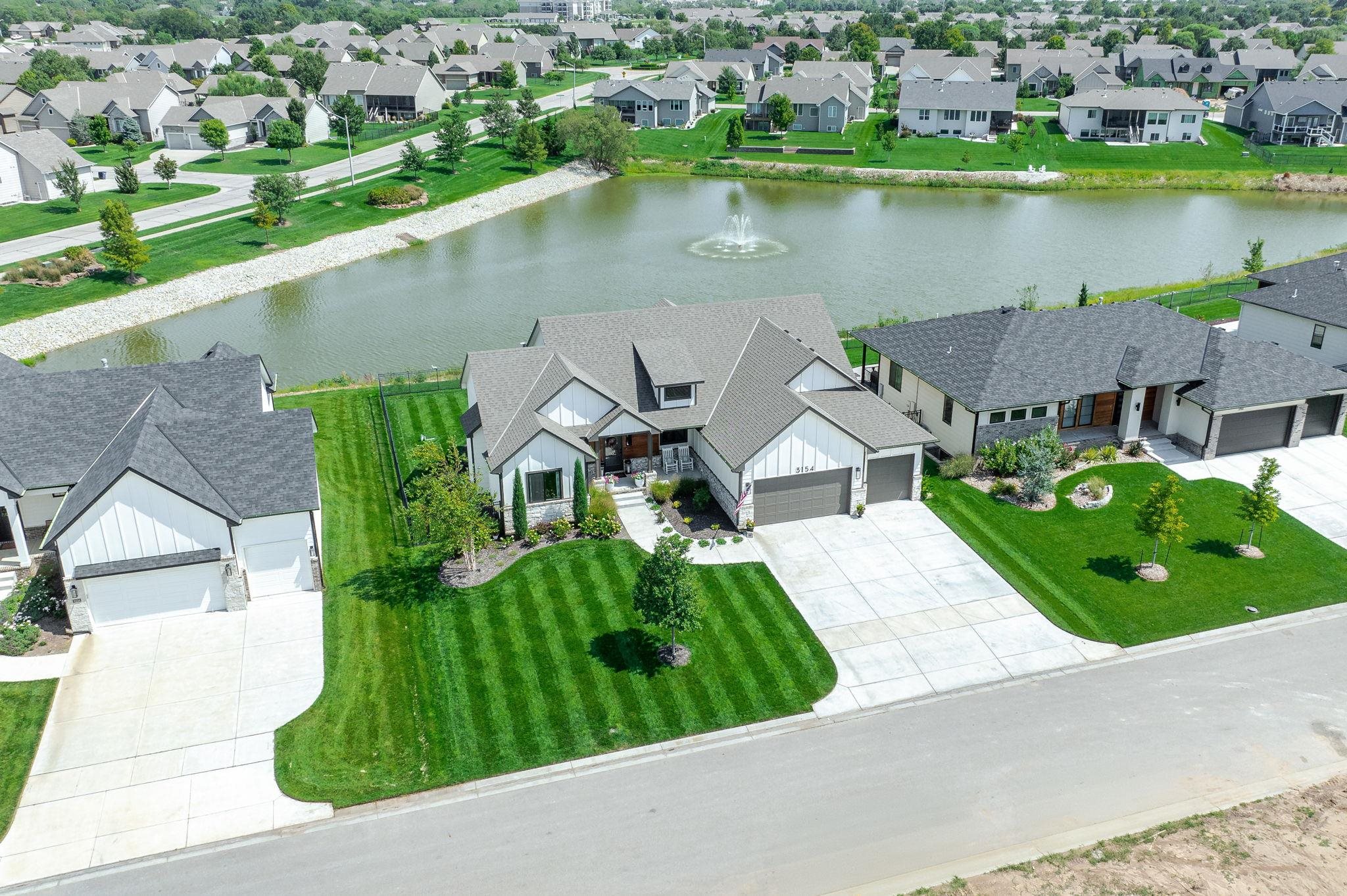 - Description: Welcome to this stunning home built in 2022, where modern luxury meets thoughtful design. This beautifully crafted home offers a spacious and inviting split-floor plan, featuring 3 generously sized bedrooms and 2 elegant baths on the main floor. As you step from the front porch and through the beautiful front door, you'll be greeted by soaring vaulted ceilings that create an open and airy atmosphere, complemented by the abundance of natural light that floods the living spaces.The heart of the home is the expansive living room, where a cozy fireplace adds warmth and charm, perfect for gathering with family and friends. Adjacent to the living area, the dining room seamlessly flows out to a covered wood deck, offering breathtaking views of a serene lake—ideal for enjoying morning coffee watching the sun rise.The chef's kitchen is a true delight, with a huge island with bar seating, granite counters, gas range, coffee bar, soft close cabinets/drawers and a large walk-in pantry. There is a convenient drop zone right off the garage, making everyday living effortless. The luxurious master suite is a private retreat, featuring a spa-like bathroom with a huge walk-in shower, double vanities with quartz counters, separate water closet with extra linen cabinets and an adjacent laundry room directly off the spacious master closet. The laundry room has a sink and extra cabinet storage. On the opposite side of the house from the master, you'll find two other bedrooms, a hall bathroom, a coat closet and 2 linen closets. A versatile flex room has limitless options for use - perfect for a home office, play room, or exercise room. The flex room has a powder bath with a linen closet. It has a walkout door to a large patio and the beautifully landscaped, fenced backyard. You will love that the yard has a sprinkler system on an irrigation well, and there is an oversized 3 car garage. Back inside, the viewout basement extends the living space, offering a cozy family room with a second fireplace, two additional bedrooms, a full bathroom, and a large wet bar. There is also a linen closet, closet under the stairs and large storage room in the basement. Fontana is conveniently located one mile from the restaurants and retail of New Market Square, but off 119th avoiding the busy traffic and noise. Fontana has a neighborhood pool and playground, and is located in the Maize School District. This property is the epitome of modern living, with every detail carefully considered for comfort, convenience, and style. Don’t miss the opportunity to make this wonderful house your forever home. Show all description