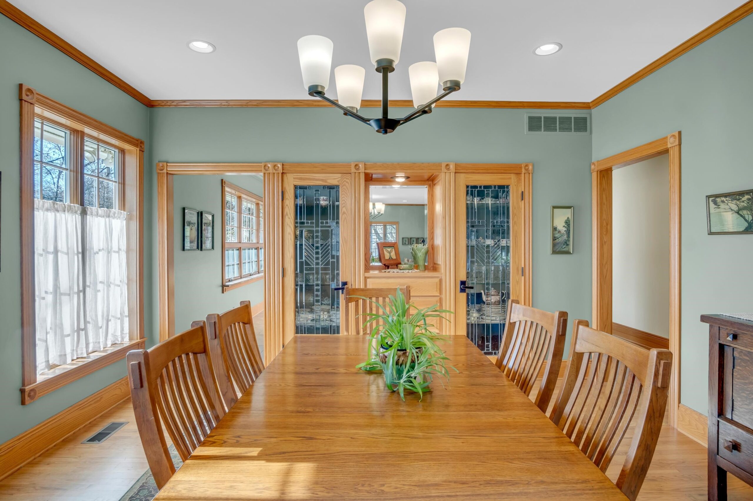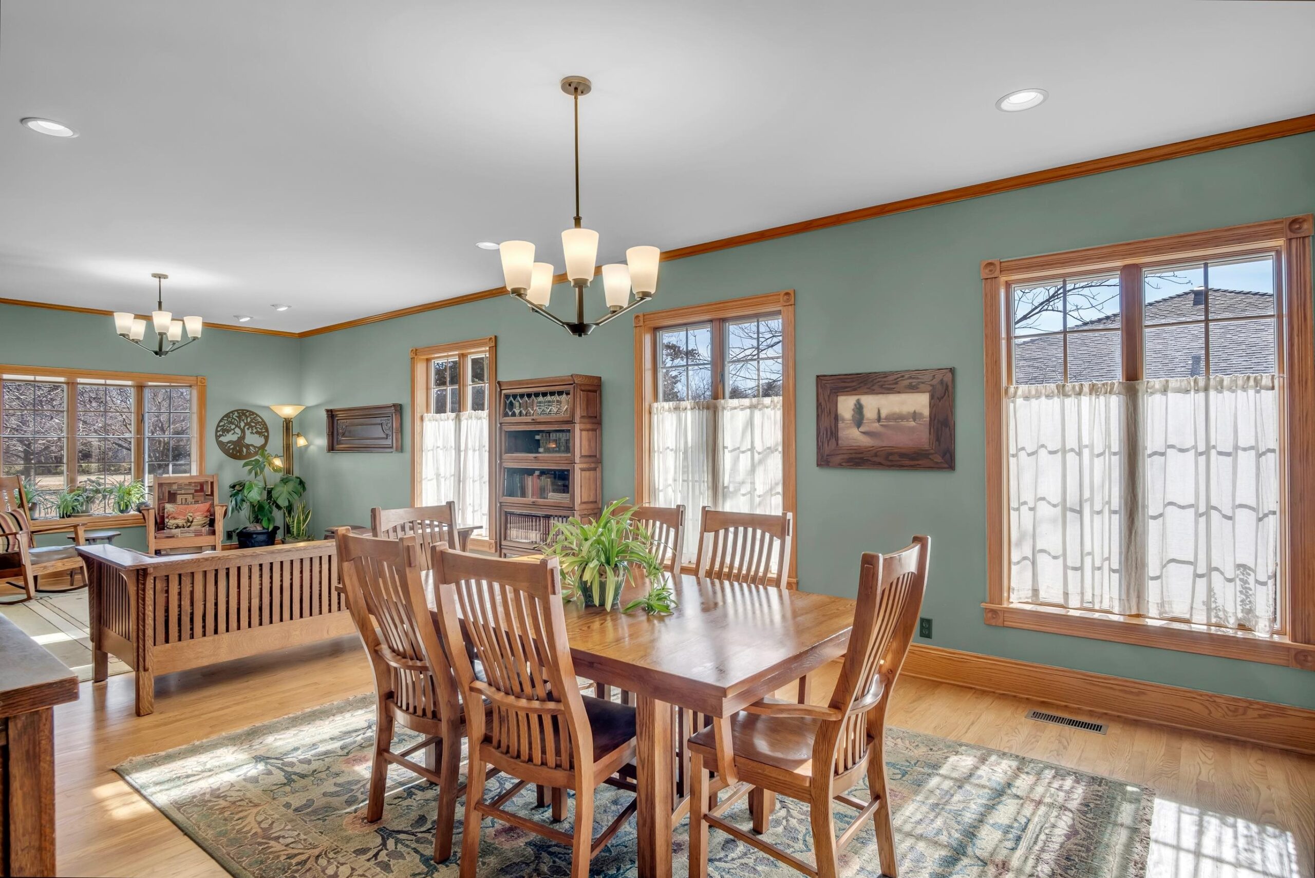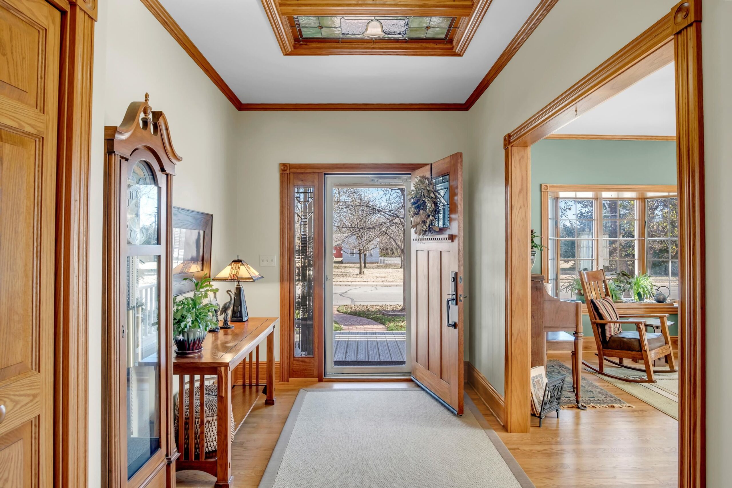 - Description: Stunning, iconic Craftsman-style home in North Newton—perfectly situated near the walking path and Bethel College campus. This beautiful property sits on a wooded lot and features raised garden beds, a brick patio, sprinkler system, and irrigation well. The garage includes a heated shop, and the charming covered wrap-around porch gives the home its storybook curb appeal. The sellers are only the second owners. Inside, you’ll find oak hardwood floors throughout the main level, pocket doors, and Anderson windows that bring in exceptional natural light. The welcoming foyer leads into the spacious living room with a bay window, perfect for entertaining. The gourmet kitchen is equipped with a commercial-size refrigerator, large island, granite countertops, coffee bar, artisan backsplash details, and a spacious walk-in pantry with a leaded-glass door. The breakfast nook opens directly to the brick patio. A formal dining room showcases a built-in china hutch with beautiful leaded-glass doors. The master suite offers private patio access, a gorgeous ensuite bath with quartz countertops, a very spacious walk-in shower, and a large walk-in closet. Two additional main-floor bedrooms feature built-in bookshelves surrounding oversized windows. The main-floor laundry room is exceptional—complete with storage, a utility sink, folding table, built-in iron and basket storage. The finished basement includes a striking family room and game room with a gas fireplace framed by built-in bookcases, plus a full kitchen and wet bar—ideal for entertaining or extended living. You’ll also find a fourth bedroom, a bonus room with closet, a full bath, and incredible storage space. With its timeless architecture, thoughtful details, and warm character, this is the storybook home you can’t help but admire every time you drive by. Show all description