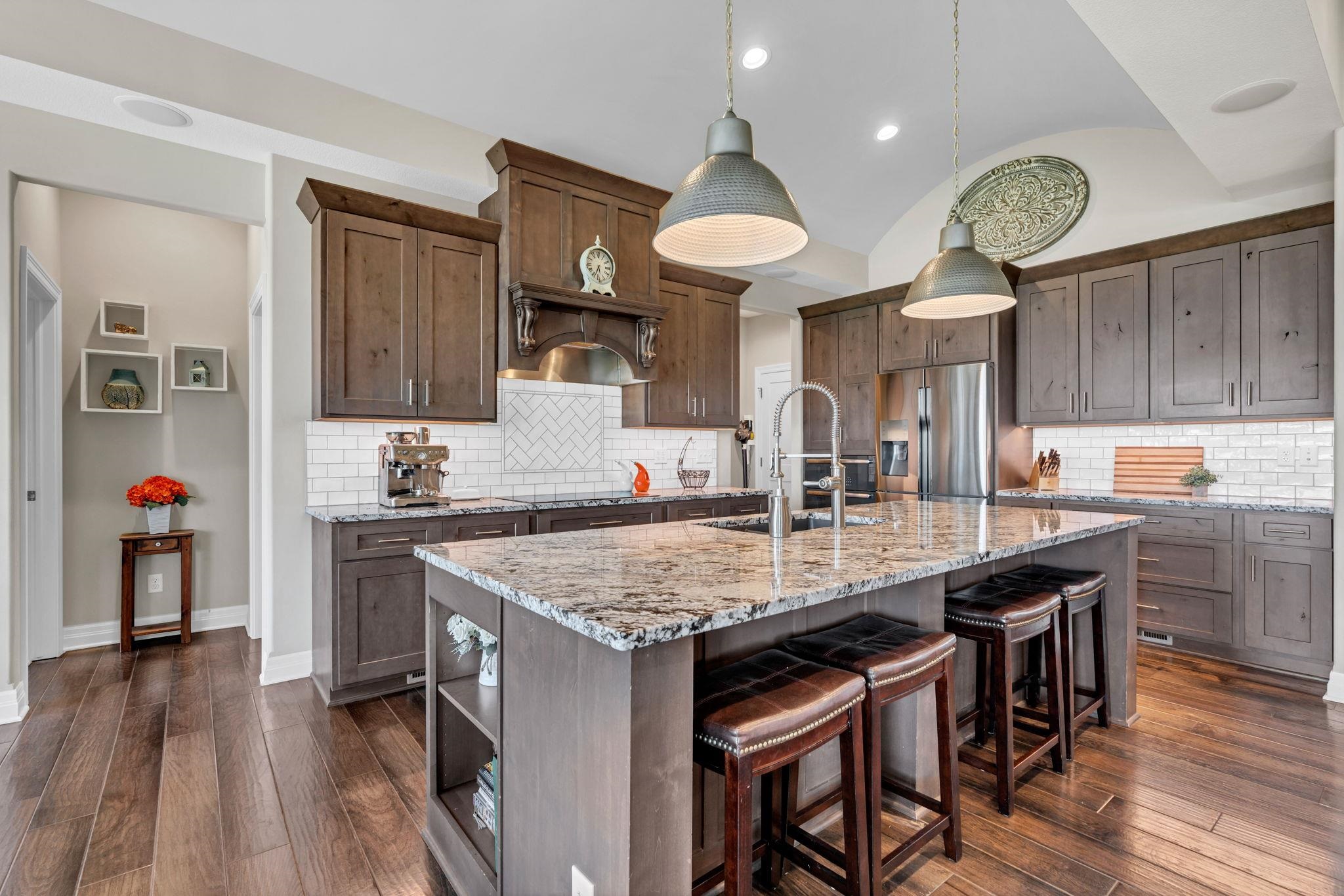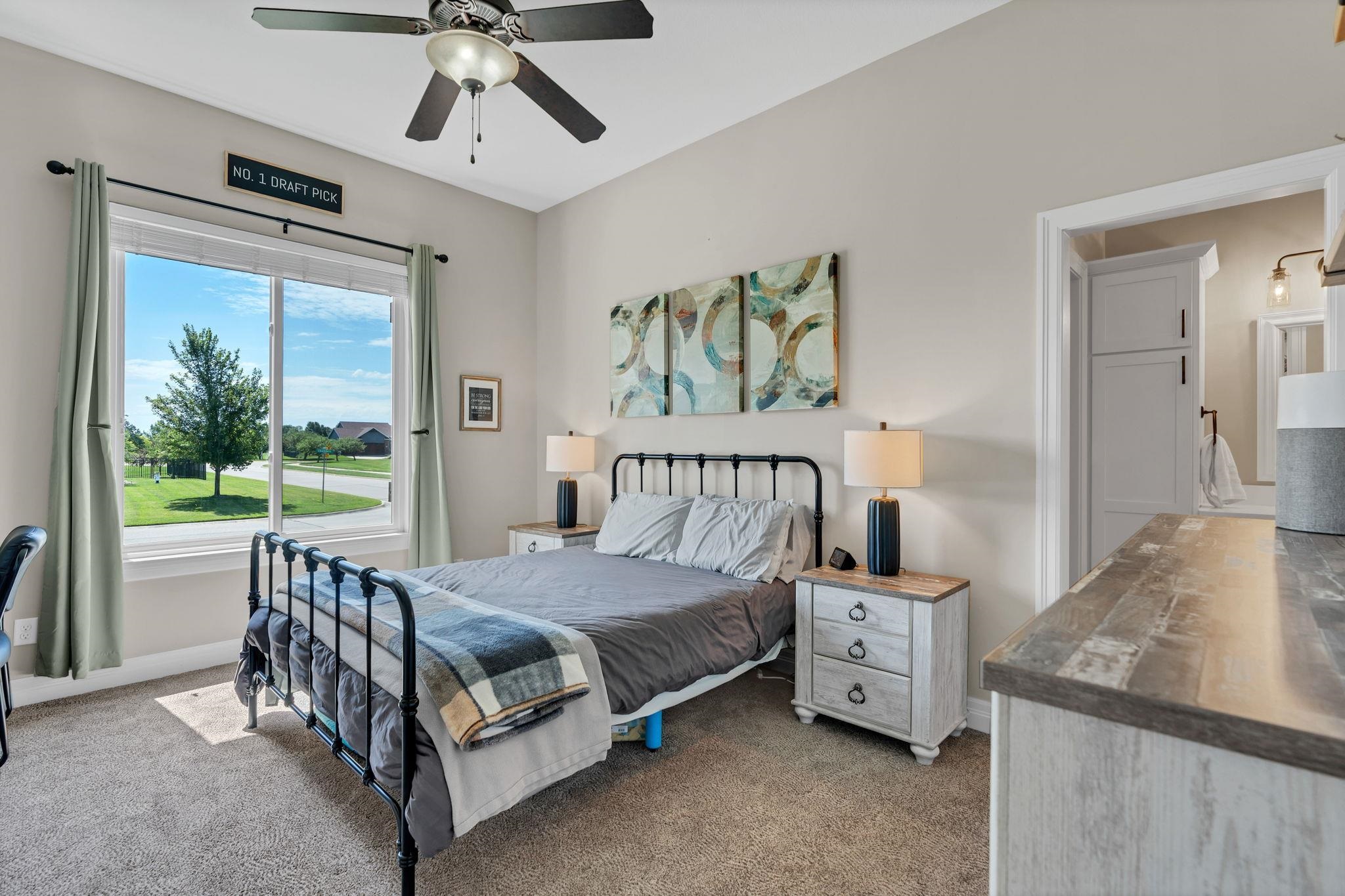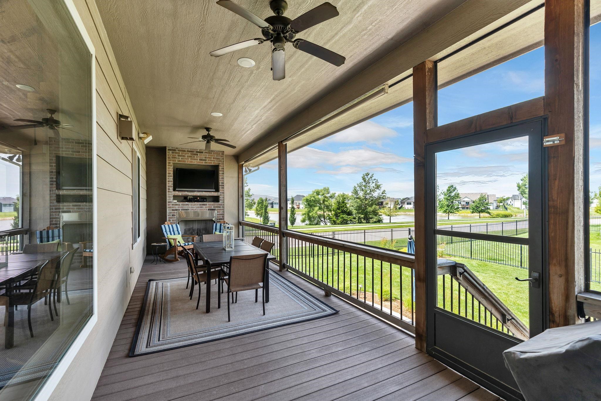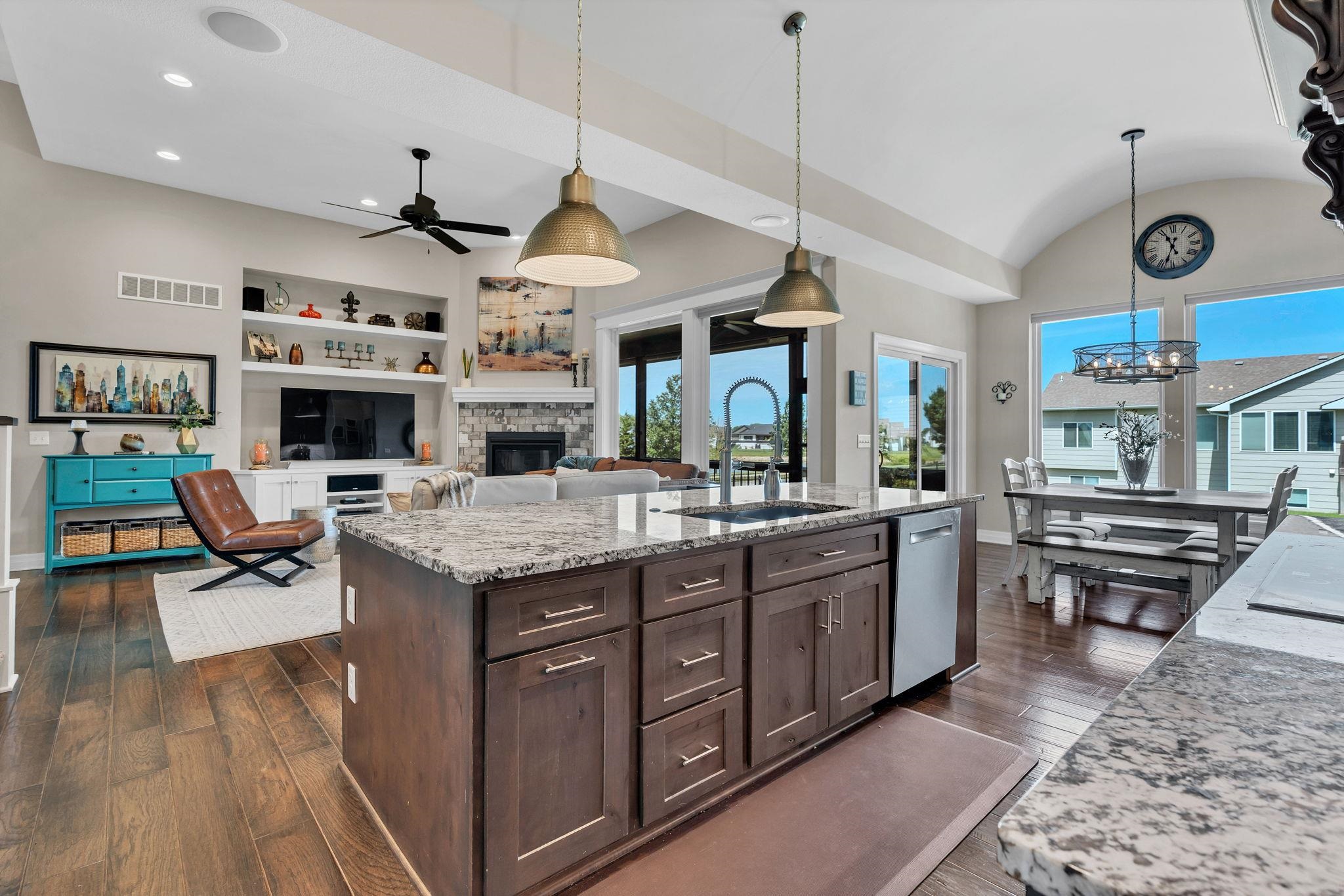 - Description: Welcome to 3203 N. Chambers, a stunning showplace in the highly sought-after Fontana neighborhood. Perfectly positioned on a premium corner lot with serene water views, this exquisite home offers the ultimate in luxury, comfort, and function—including a rare oversized 4-car attached garage. Step inside to discover an impressive open floor plan designed for effortless entertaining. The vaulted living room showcases elegant recessed lighting, expansive windows, a cozy gas fireplace with a stone surround, and a sleek built-in entertainment center. The gourmet kitchen is a dream, featuring an arched barrel ceiling, oversized granite island with breakfast bar, tile backsplash, professional-grade appliances, cushion-close cabinetry, and built-in speakers. A walk-through pantry with granite countertops adds function and storage, while the formal dining area—with its barrel ceiling, panoramic windows, and access to the screened-in deck—is the perfect place to gather. The main floor primary suite is a peaceful retreat, offering plush carpet, large windows, trayed ceiling with fan, and a spa-inspired en suite bath. Enjoy a luxurious walk-in tile shower with dual shower heads, a relaxing soaker tub, quartz double vanity, and a spacious California-style walk-in closet with custom built-ins and direct access to the laundry room with folding counter and extra storage. A rare find—this home features two guest suites on the main floor, each with its own private bath and spacious walk-in closet, offering comfort and privacy for family or guests. A versatile upstairs bonus room offers endless possibilities—think home office, playroom, gym, or guest bedroom. The finished basement was built for entertaining, complete with stained concrete floors, a spacious rec area, view-out windows, patio access, a stylish wet bar with dishwasher and beverage fridge, plus two generous bedrooms, a full bath, and ample storage. Outdoors, enjoy peaceful mornings and vibrant evenings on the screened-in deck with fireplace, TV area, and dual ceiling fans—or relax on the spacious patio overlooking the wrought-iron fenced yard and tranquil water view. This home truly has it all—space, style, and stunning scenery! Show all description