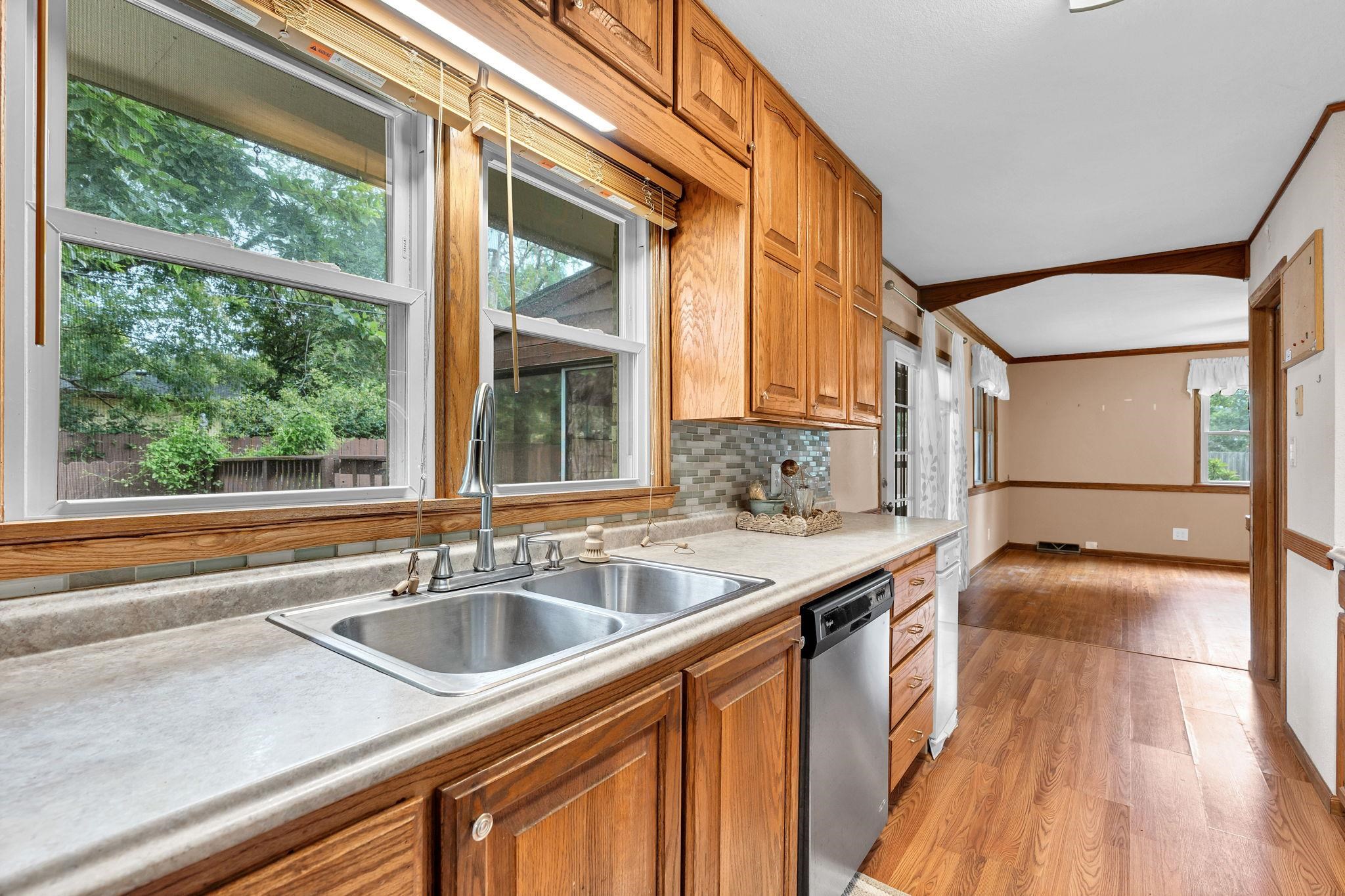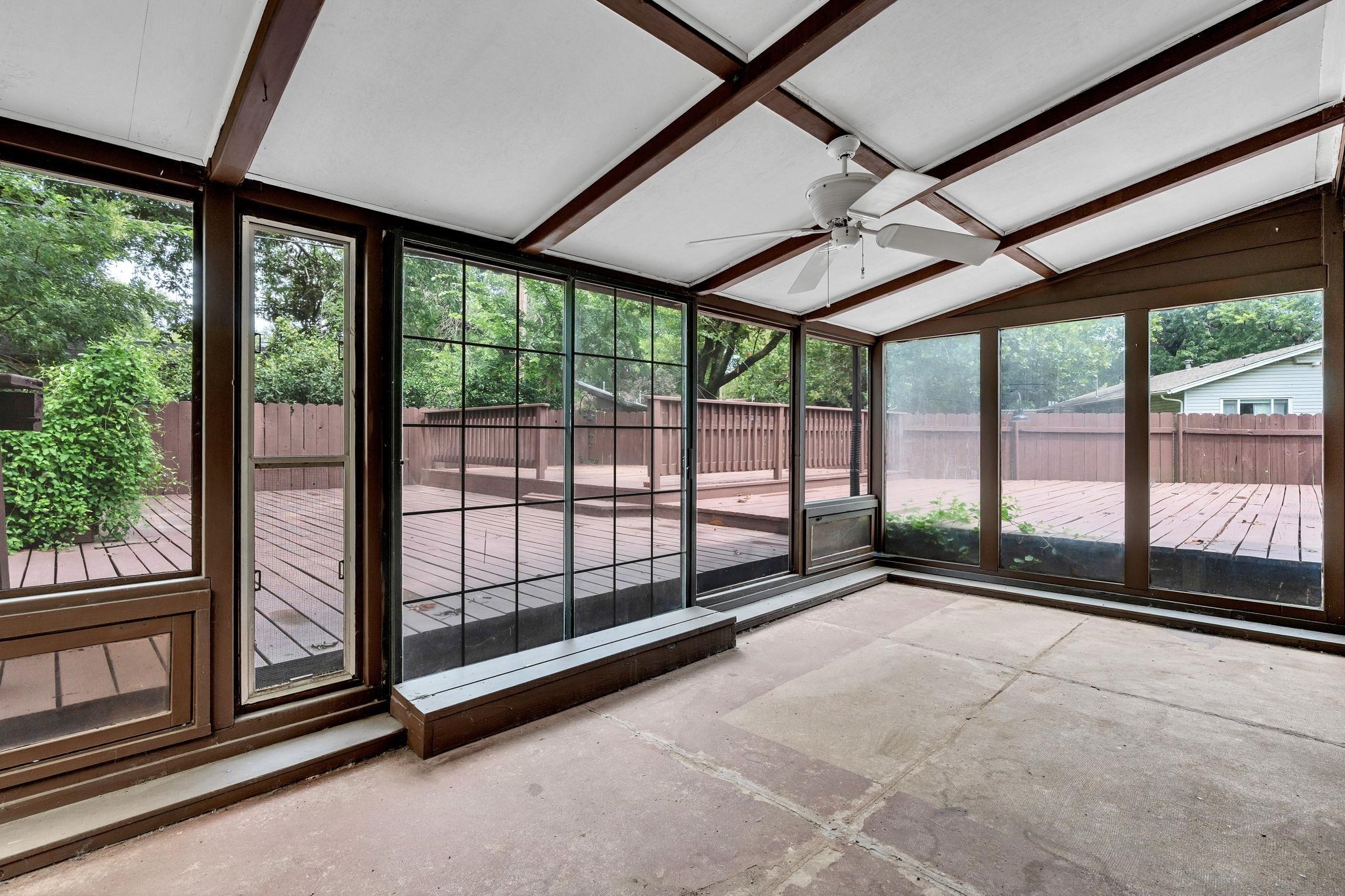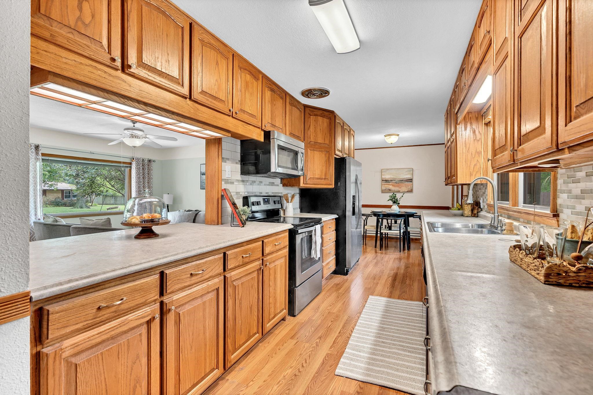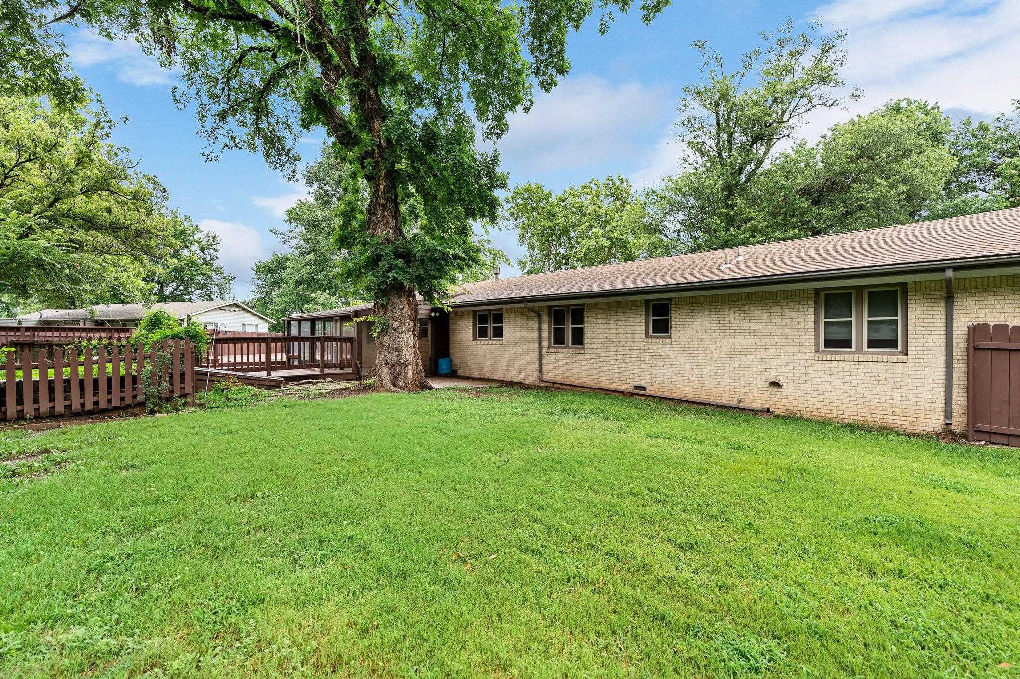- Description: Welcome home to this spacious 2bed/2bath/2car ranch on nearly a half acre in a quiet neighborhood in west Wichita. As you arrive, you'll be greeted by beautiful mature trees and a low-maintenance brick exterior with vinyl trim. Step inside to discover timeless hardwood floors, replacement windows, and excellent natural lighting. The kitchen offers an abundance of storage, a full set of stainless appliances, a pass through window to the living room, and an updated glass back splash. Common space includes a sizable living room, a rec room/den with a wood burning free standing stove, and a dining area adjacent to the kitchen. The primary bedroom is large enough that it could be split into two rooms, should the buyer wish, and has access to its own full bath featuring a tile floor and new walk-in shower. The second bedroom is also generously sized with double closets, and the hall bath boasts a tile surround, new window, composite vanity, and tiled flooring. Exterior amenities include a sun patio/porch, privacy-fenced yard, huge wrap-around deck, garden, storm shelter, gutter guards, and storage shed. This home is in a peaceful neighborhood with friendly neighbors, and has no special taxes. Come see us today before it's gone! *See the promo video for additional views of this home.* Show all description