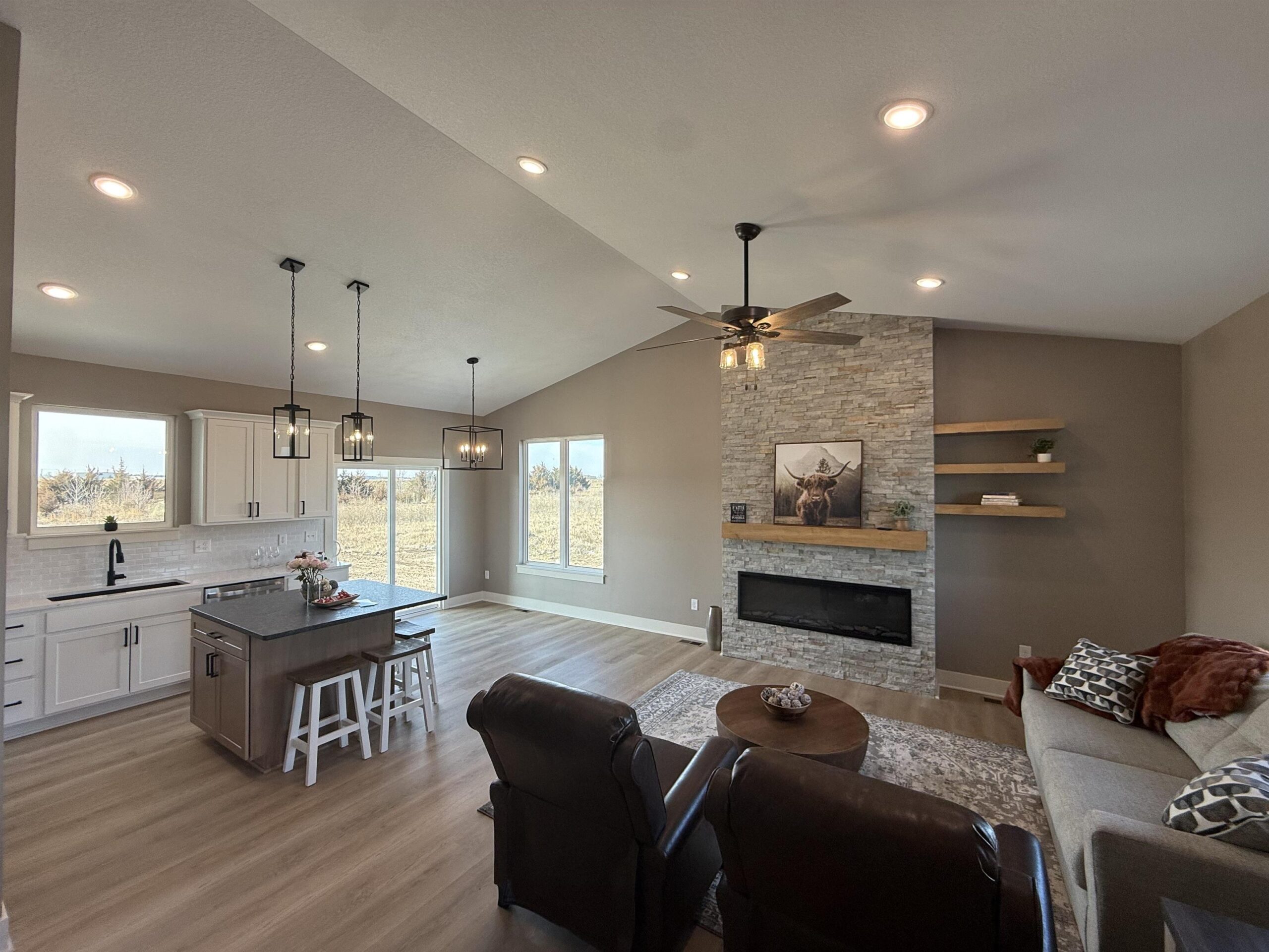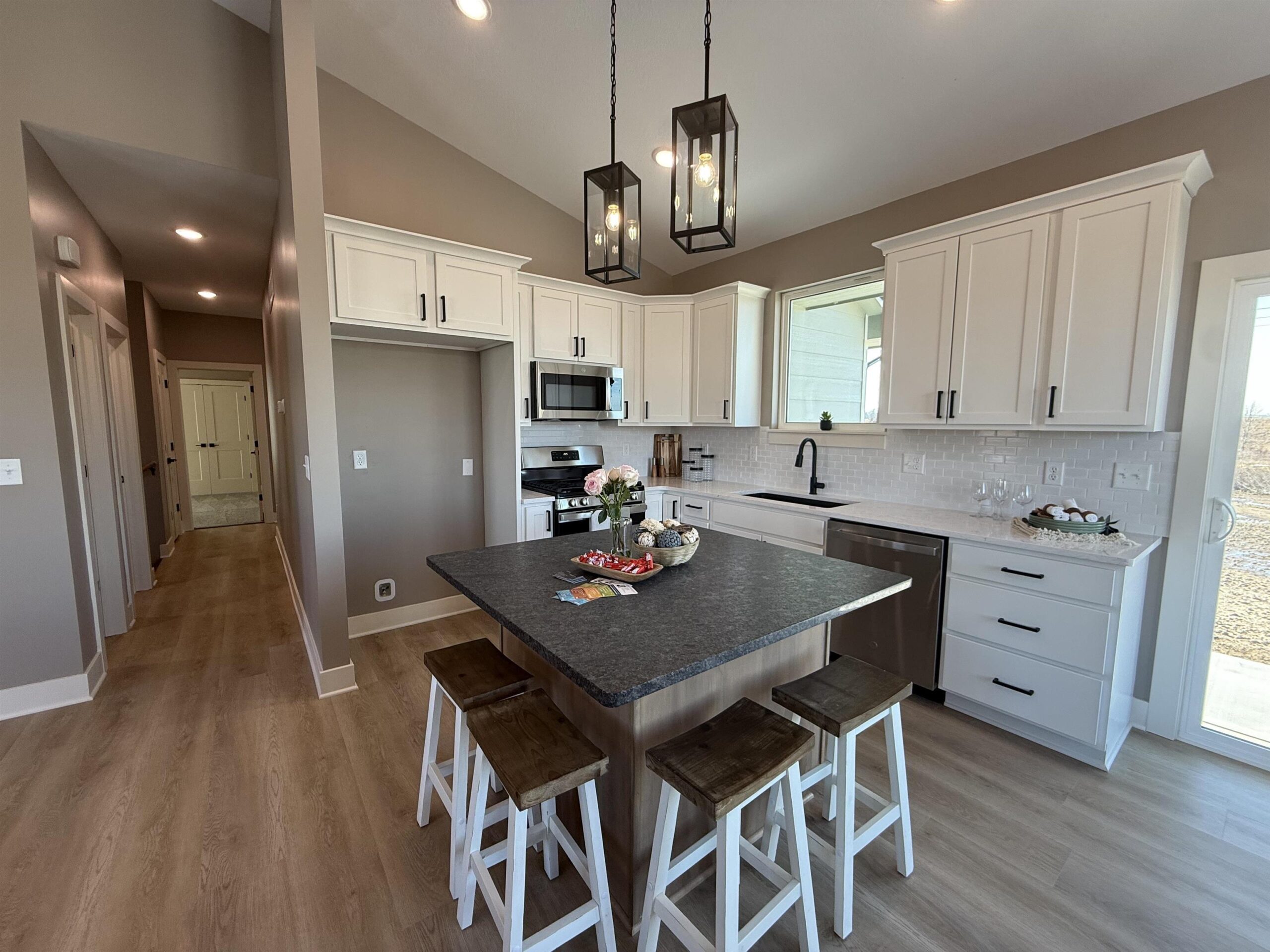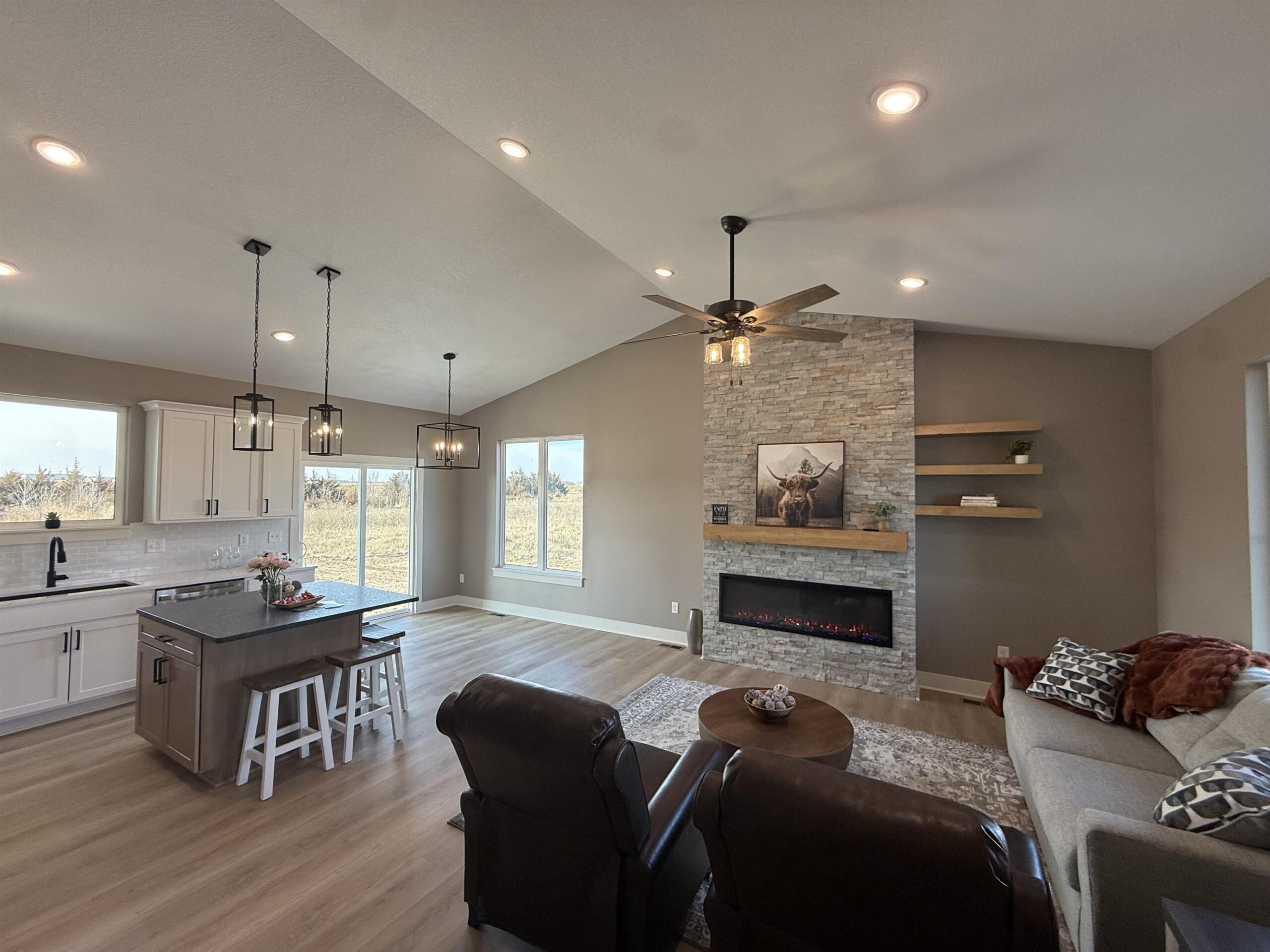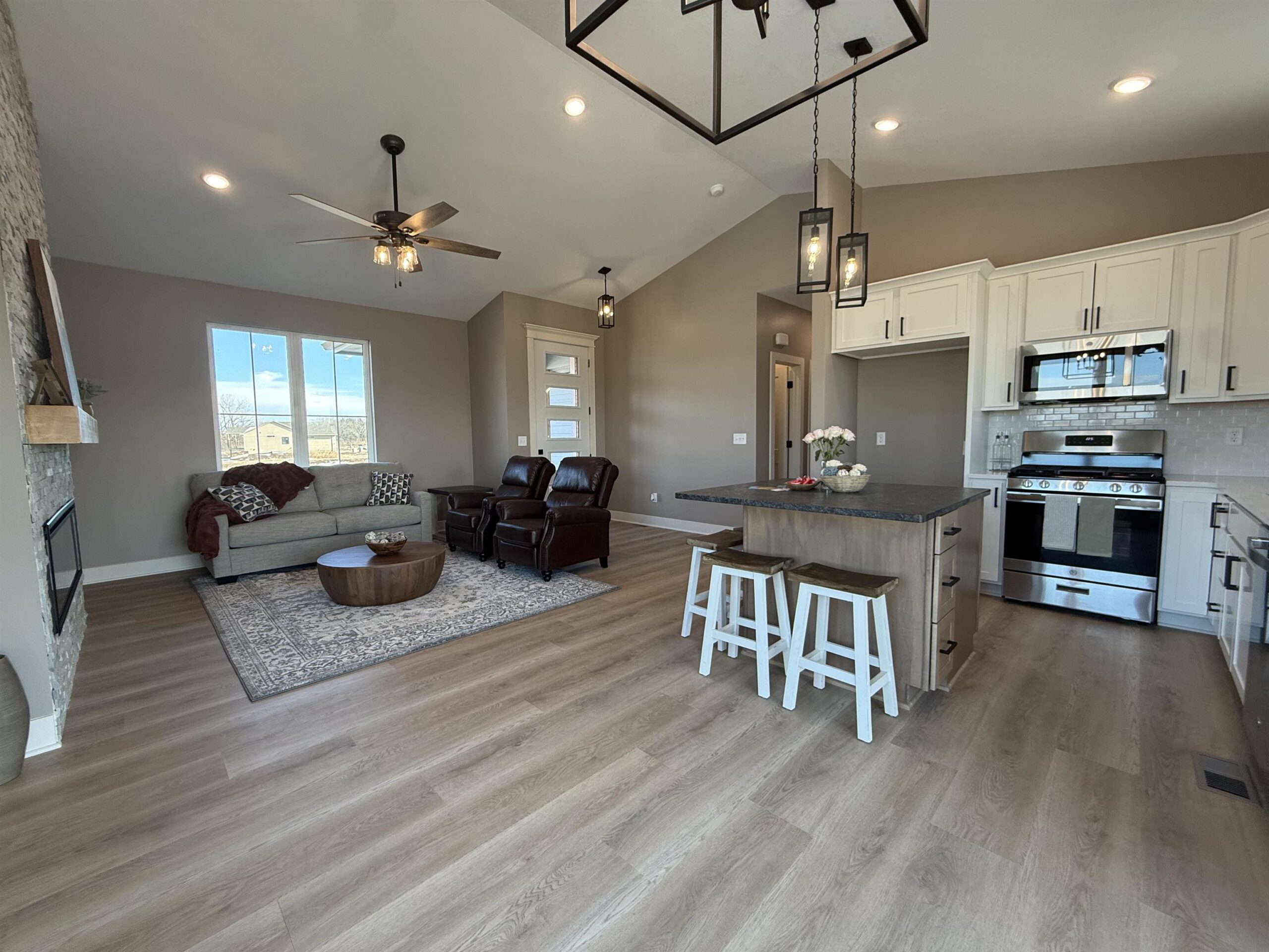 - Description: Builder incentive through the end of March for accepted contracts! Incentive to including matching GE stainless refrigerator. Must have contract in before end of March. Lake community in the heart of Wichita?! Yes!! This stunning custom offers 3-bedroom, 2 full bath and a 3-car garage with 12' ceilings for the car enthusiast with lifts or space driven homeowners. Vaulted ceilings in the living room with stone wall and built in 6' linier fireplace. Natural woods for mantle and floating shelves. High end luxury vinyl flooring throughout main level. All wood constructed cabinets with crown molding, granite island and quartz tops on surround with under mount composite sink. Fitted with stainless GE gas range, microwave and dishwasher. Main floor laundry and mud room. Master bedroom features massive his and hers walk in closets with makeup or dresser wall niche. Tray ceiling with ceiling fan and wired wall for tv mount. Granite tops with marble floor and custom walk-in shower paired with his and her sinks. You have 2 more main floor bedrooms with one that features a built-in dresser and the other having a walk-in closet. Main floor bathroom is very spacious with marble flooring and granite top. The basement is fitted with a full bathroom already has plumbing, electrical and tub/shower. This entire basement has HVAC, electrical, plumbing and wet bar. All very ready and easy to finish the basement and have a massive family room, 2 more bedrooms and a full bath with a full entertainment wall prewired and full wet bar. The home has a massive backyard with a covered patio ready for your relaxing sunset views and entertaining. This is your chance to get in this beautiful new build and settle in just in time for bringing in the new year! Seller is licensed REALTOR in the state of Kansas Show all description