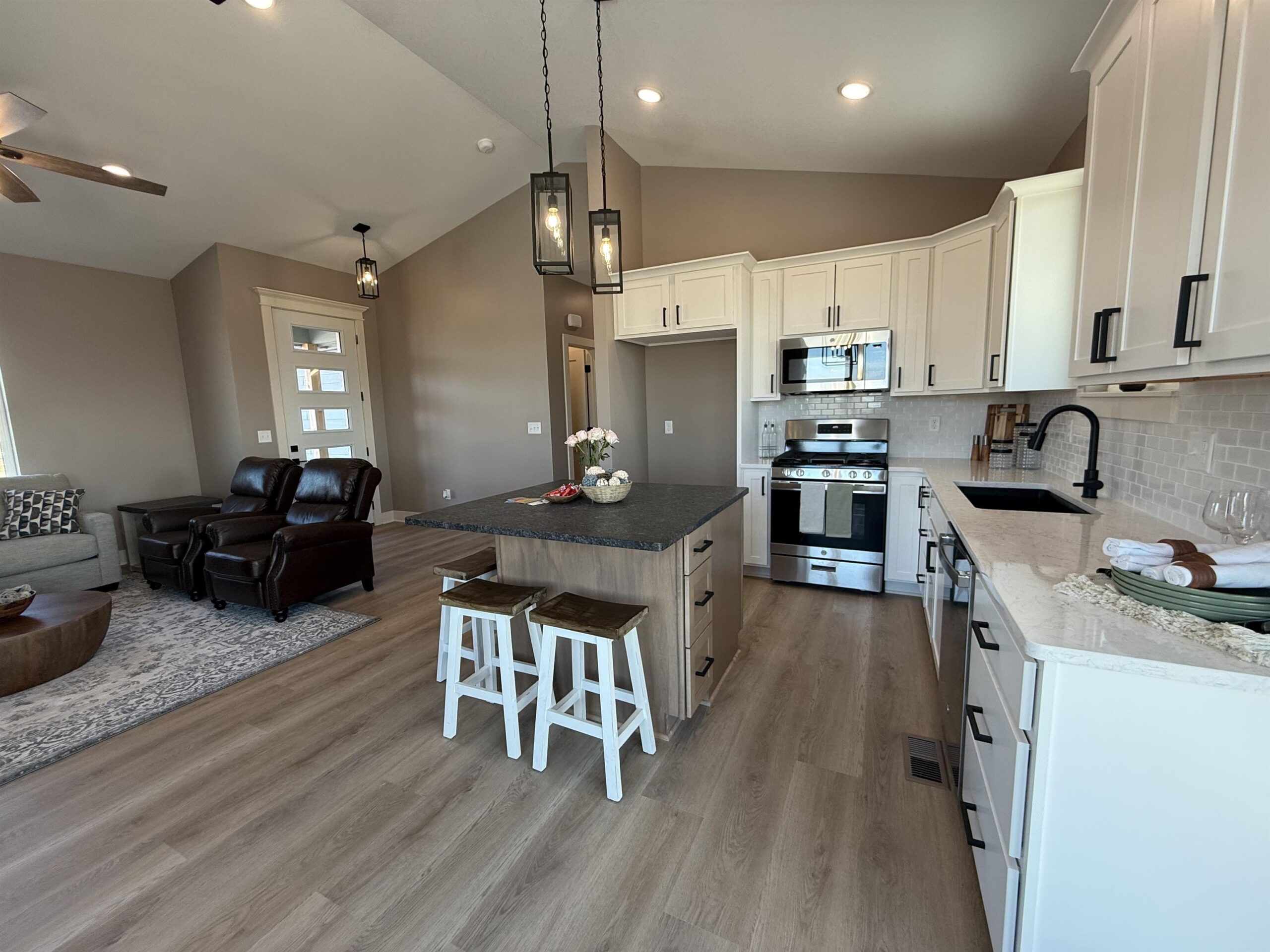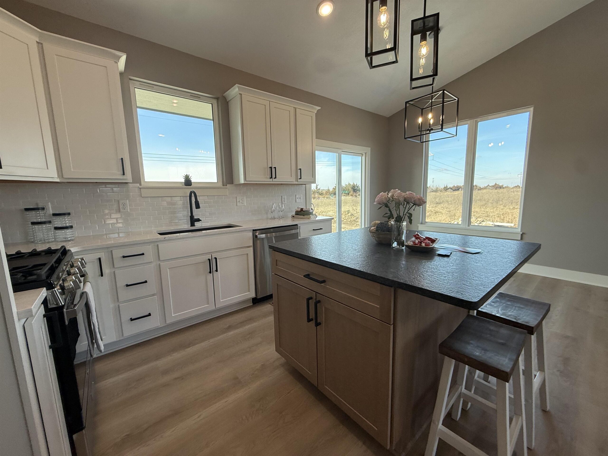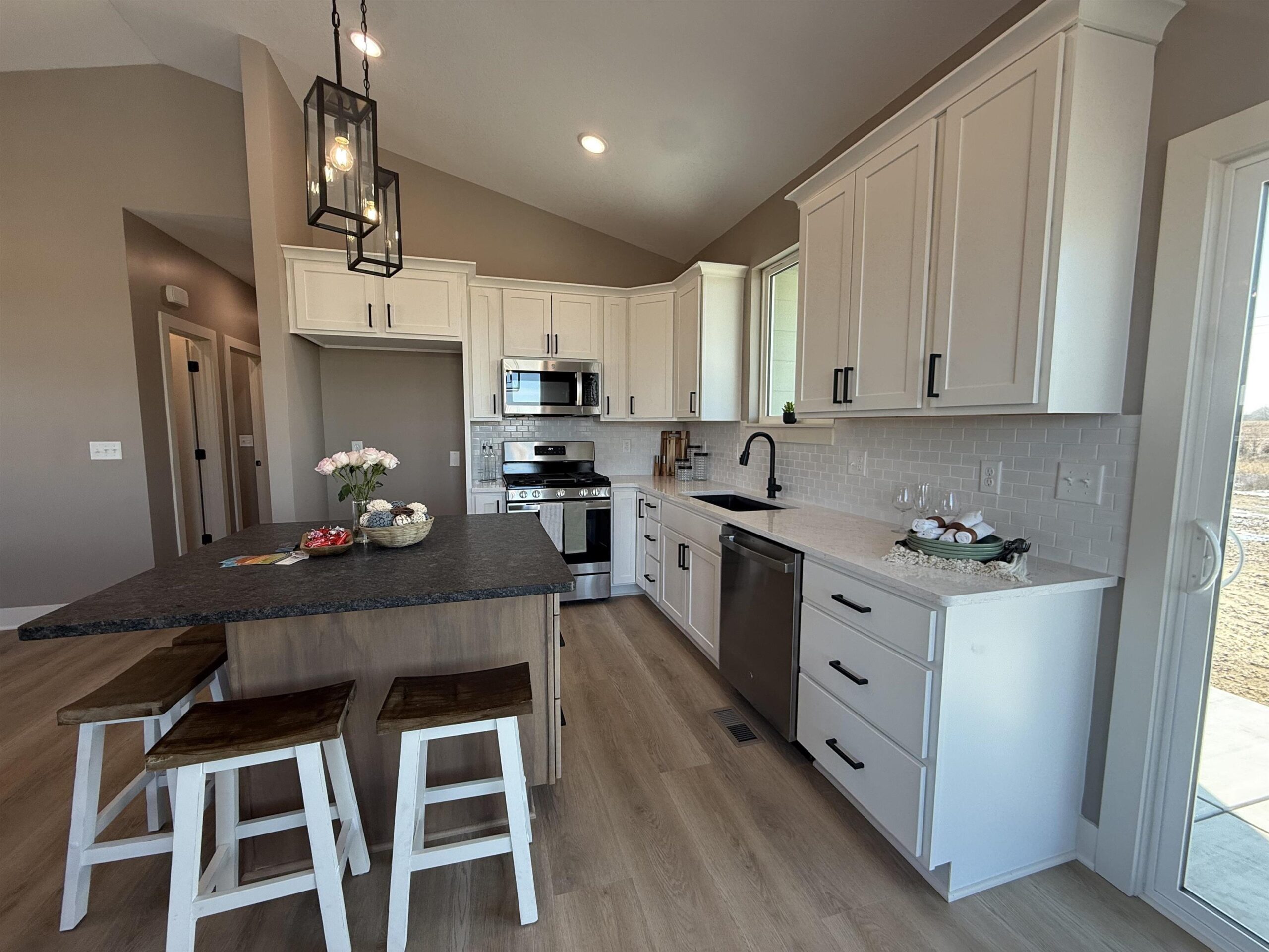 - Description: Builder incentive through the end of March for accepted contracts! Incentive to including matching GE stainless refrigerator. Must have contract in before end of March. Lake community in the heart of Wichita?! Yes!! This stunning custom offers 3-bedroom, 2 full bath and a 3-car garage with 12' ceilings for the car enthusiast with lifts or space driven homeowners. Vaulted ceilings in the living room with stone wall and built in 6' linier fireplace. Natural woods for mantle and floating shelves. High end luxury vinyl flooring throughout main level. All wood constructed cabinets with crown molding, granite island and quartz tops on surround with under mount composite sink. Fitted with stainless GE gas range, microwave and dishwasher. Main floor laundry and mud room. Master bedroom features massive his and hers walk in closets with makeup or dresser wall niche. Tray ceiling with ceiling fan and wired wall for tv mount. Granite tops with marble floor and custom walk-in shower paired with his and her sinks. You have 2 more main floor bedrooms with one that features a built-in dresser and the other having a walk-in closet. Main floor bathroom is very spacious with marble flooring and granite top. The basement is fitted with a full bathroom already has plumbing, electrical and tub/shower. This entire basement has HVAC, electrical, plumbing and wet bar. All very ready and easy to finish the basement and have a massive family room, 2 more bedrooms and a full bath with a full entertainment wall prewired and full wet bar. The home has a massive backyard with a covered patio ready for your relaxing sunset views and entertaining. This is your chance to get in this beautiful new build and settle in just in time for bringing in the new year! Seller is licensed REALTOR in the state of Kansas Show all description