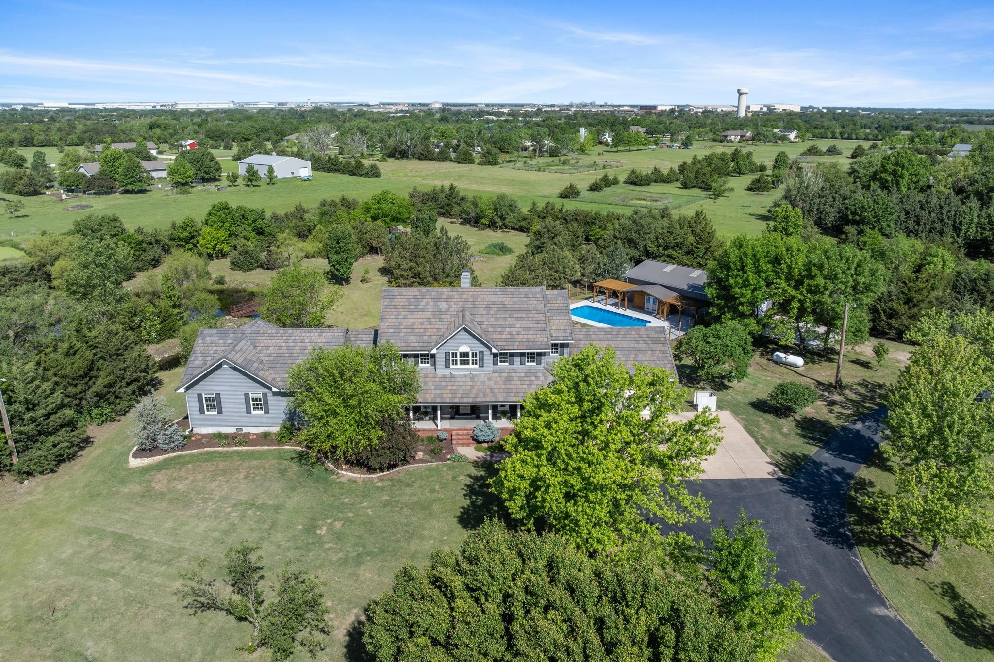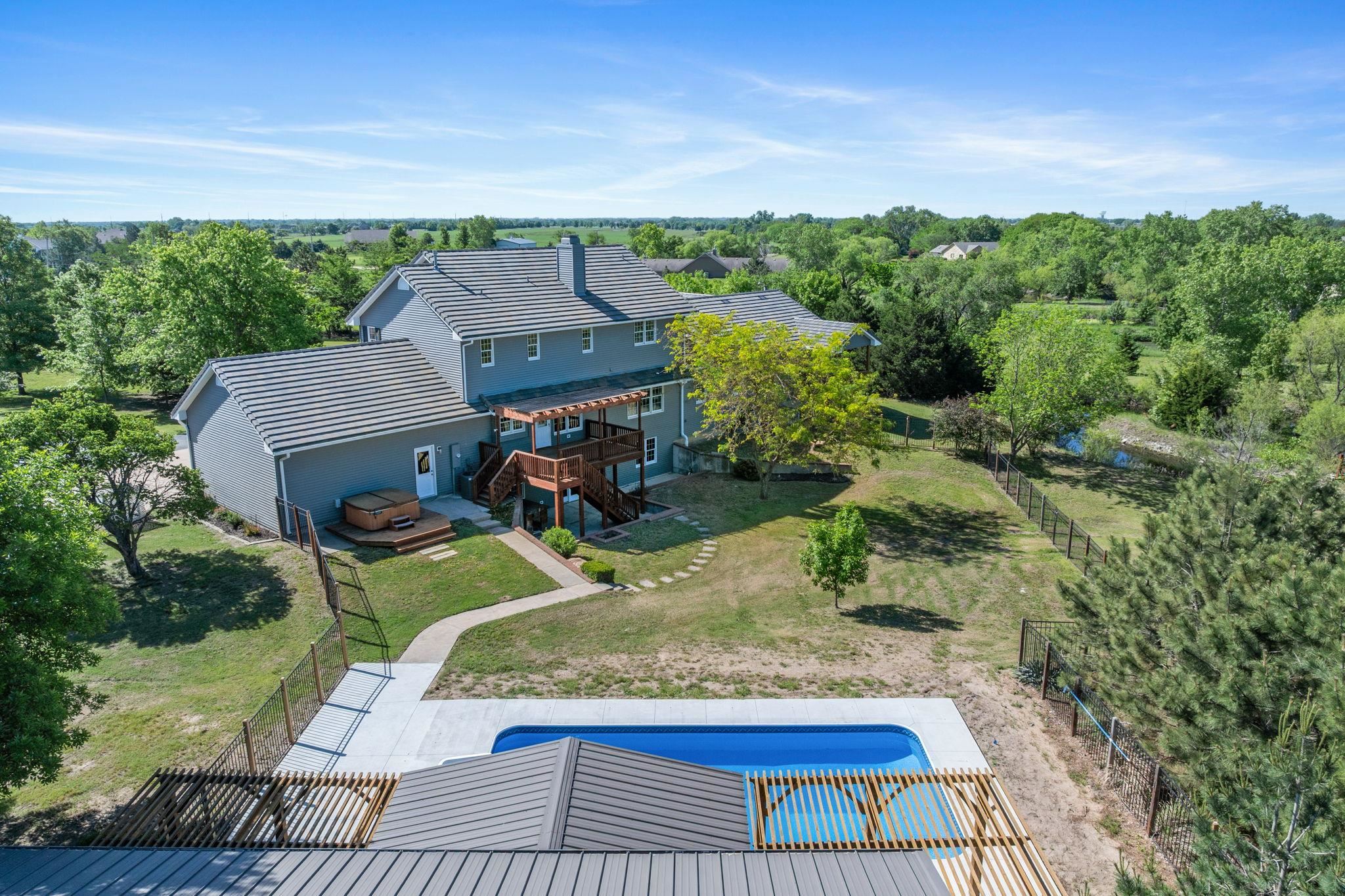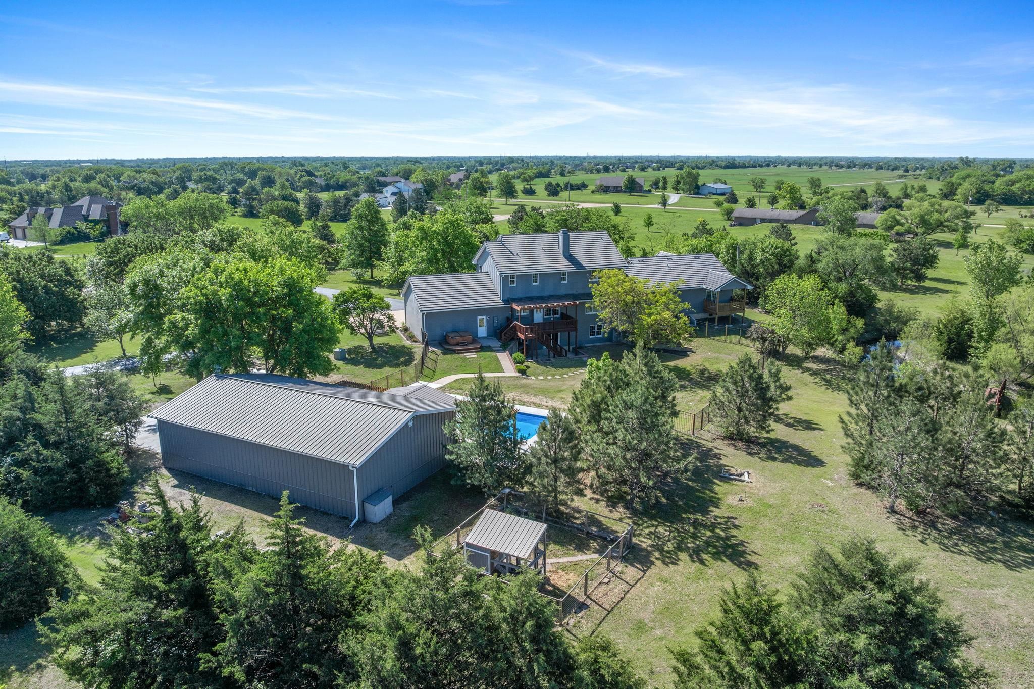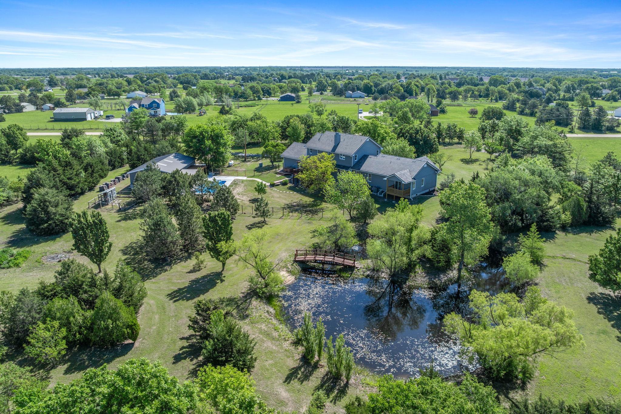 - Description: WOW! Don’t miss this incredible nearly 5-acre property in the award-winning Derby School District. Your very own luxurious retreat awaits, dotted with mature trees in a private setting. Just minutes from Derby and all the amenities Rock Road has to offer, this stately home features a recently completed primary suite addition that’s truly a showstopper. It boasts an enormous executive walk-in closet with laundry area, a spa-like ensuite with custom-tiled shower, and a private covered deck. SPACE is the keyword in this home with nearly 5200 sq feet of finished elegance for your family to enjoy. The rest of the main floor is thoughtfully designed with beautiful updates throughout, including a spacious kitchen with quartz countertops, two separate living areas, formal dining, dedicated office, half-bath, and a convenient drop zone off of the oversized garage. Upstairs, you'll find a second primary suite with a generous walk-in closet and elegant bathroom, along with two additional bedrooms that share another full bathroom. The finished walkout basement adds even more entertaining options, including a large family/rec room, additional bedroom and bathroom, second laundry area, and unfinished storage. Step outside to enjoy the updated swimming pool area (2024), 30x50 Morton Building, a pond with idyllic bridge to island, a children’s playground, and even a chicken coop—a true outdoor oasis! This home has been well maintained with newer concrete tile roof, newer HVAC, and all the features you'd expect in this price range. Schedule your showing today! Show all description