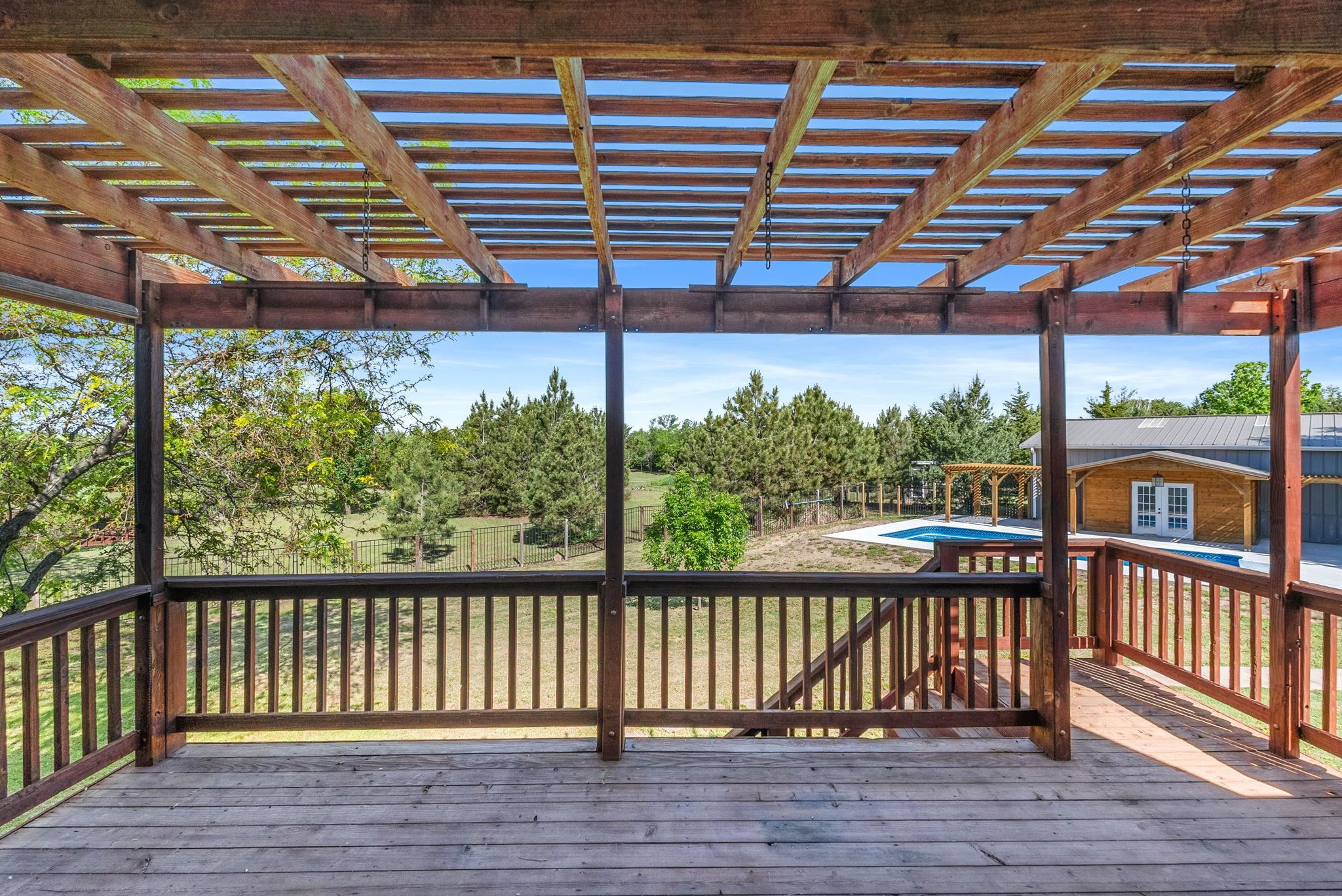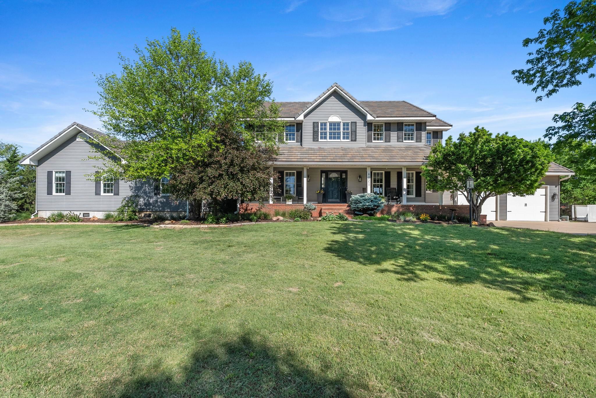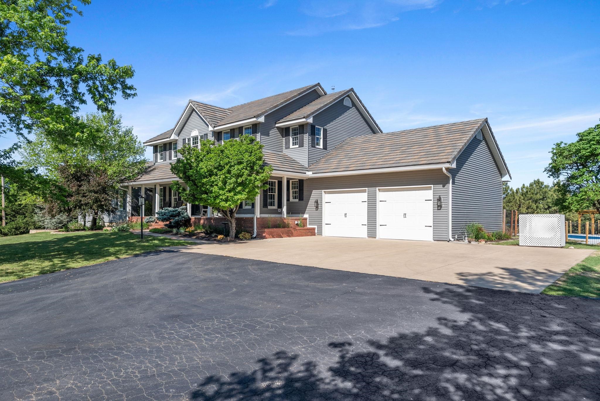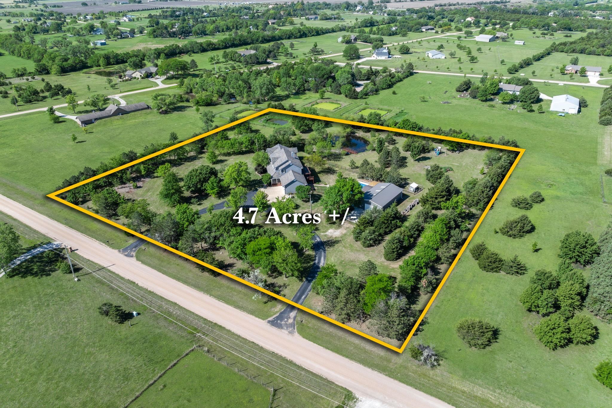 - Description: WOW! Don’t miss this incredible nearly 5-acre property in the award-winning Derby School District. Your very own luxurious retreat awaits, dotted with mature trees in a private setting. Just minutes from Derby and all the amenities Rock Road has to offer, this stately home features a recently completed primary suite addition that’s truly a showstopper. It boasts an enormous executive walk-in closet with laundry area, a spa-like ensuite with custom-tiled shower, and a private covered deck. SPACE is the keyword in this home with nearly 5200 sq feet of finished elegance for your family to enjoy. The rest of the main floor is thoughtfully designed with beautiful updates throughout, including a spacious kitchen with quartz countertops, two separate living areas, formal dining, dedicated office, half-bath, and a convenient drop zone off of the oversized garage. Upstairs, you'll find a second primary suite with a generous walk-in closet and elegant bathroom, along with two additional bedrooms that share another full bathroom. The finished walkout basement adds even more entertaining options, including a large family/rec room, additional bedroom and bathroom, second laundry area, and unfinished storage. Step outside to enjoy the updated swimming pool area (2024), 30x50 Morton Building, a pond with idyllic bridge to island, a children’s playground, and even a chicken coop—a true outdoor oasis! This home has been well maintained with newer concrete tile roof, newer HVAC, and all the features you'd expect in this price range. Schedule your showing today! Show all description