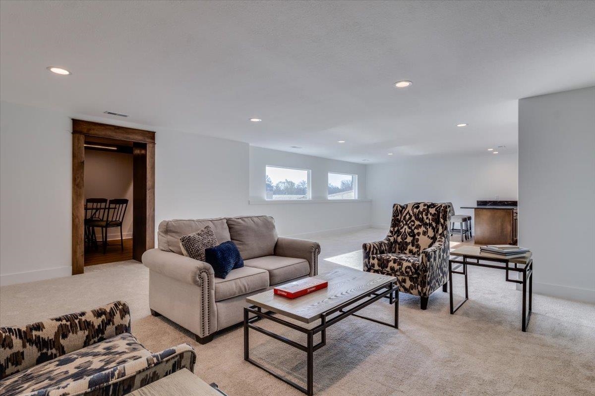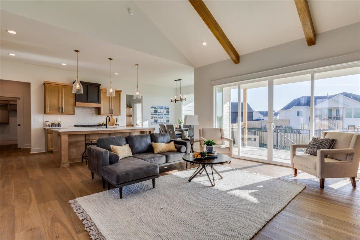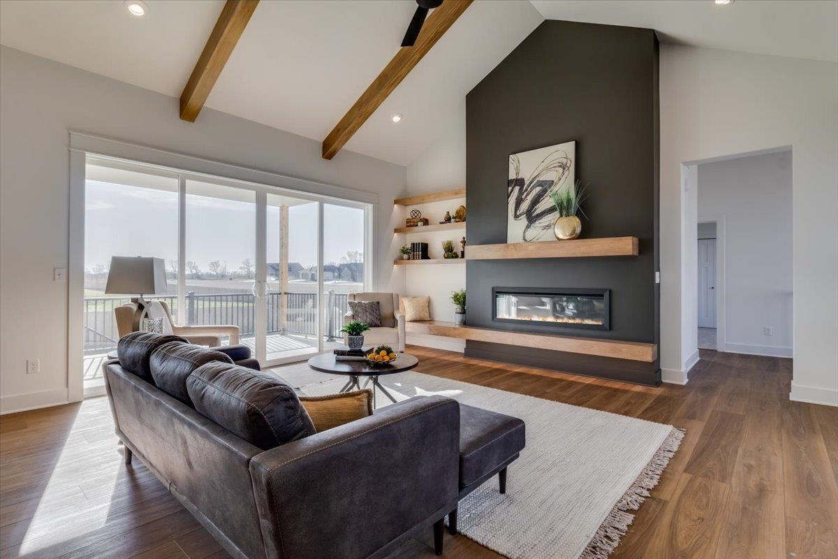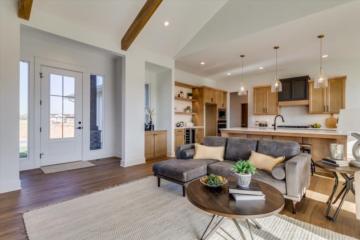 - Description: Introducing the Kenzie 2 by M&M Custom Construction in Henwick—an elevated take on a much-loved floor plan, designed with both luxury and livability in mind. This 5-bedroom, 3-bath home offers standout curb appeal with a stylish hip roof and an oversized 3-car garage featuring 8’ tall doors and a convenient side access man door. Just inside the inviting foyer entry you’ll experience a bright, open layout highlighted by a vaulted living room ceiling with stunning maple beams and a focal point electric fireplace paired by custom lit shelving. The kitchen is a true showpiece, complete with a gas cooktop, built-in oven and microwave, walk-in pantry, and an impressive side beverage countertop area featuring a wine cooler, shelving, and additional cabinetry. The primary suite delivers a high-end retreat with a 12’ ceiling accented by beams and a spa-like bath offering a separate soaking tub, walk-in shower with dual heads, and upgraded sconce lighting. Downstairs, the finished basement is built for entertaining—featuring a spacious family room, a full wet bar with island seating in front, and has room for a full-size refrigerator. Plus, don’t miss the bonus space tucked under the raised concrete patio—perfect for a unique game room, lounge, or speakeasy-style retreat. Outdoor living is just as impressive with both a raised covered concrete patio and an additional lower patio, creating the ideal setup for relaxing or hosting. Thoughtful details throughout include a floating bench/drop zone off the garage entry, custom built-ins with LED lighting, and a sidewalk connecting the driveway to the garage man door on the side of the home. This home is the perfect blend of function, style, and standout features. Don’t miss your chance to tour this home in Henwick! Information deemed reliable but not guaranteed and may change without notice. Specials and generals may not be entirely spread yet on this lot. There is a $250 mailbox fee collected at closing. This is a model home and not for sale at this time Show all description